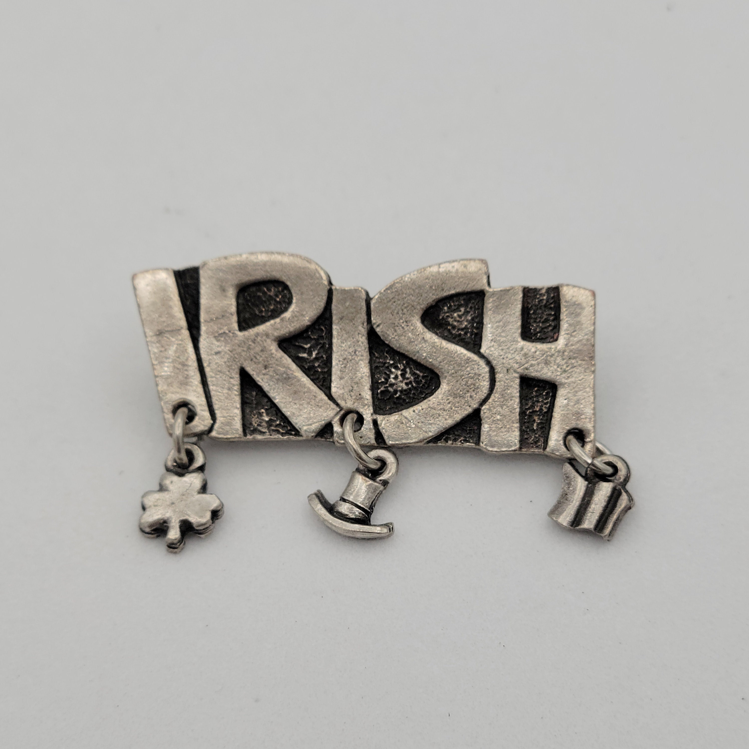 This festive brooch is perfect for St. Patrick's day. The silver-tone base forms a rectangular shape that is filled with the word "IRISH." Hanging at the bottom of the brooch are 3 small dangles in the shapes of a flag, hat & shamrock. This piece is in excellent condition with a small amount of wear.