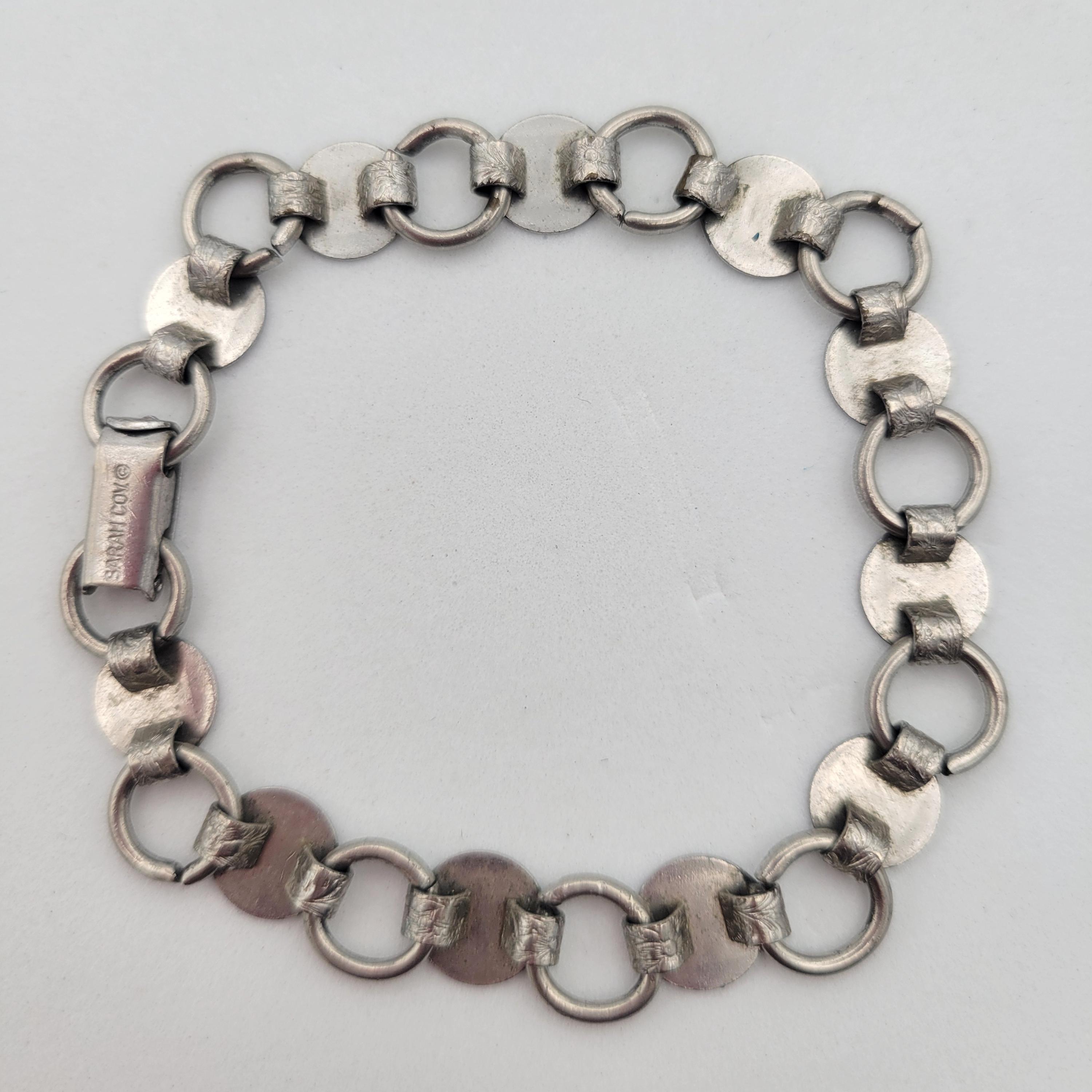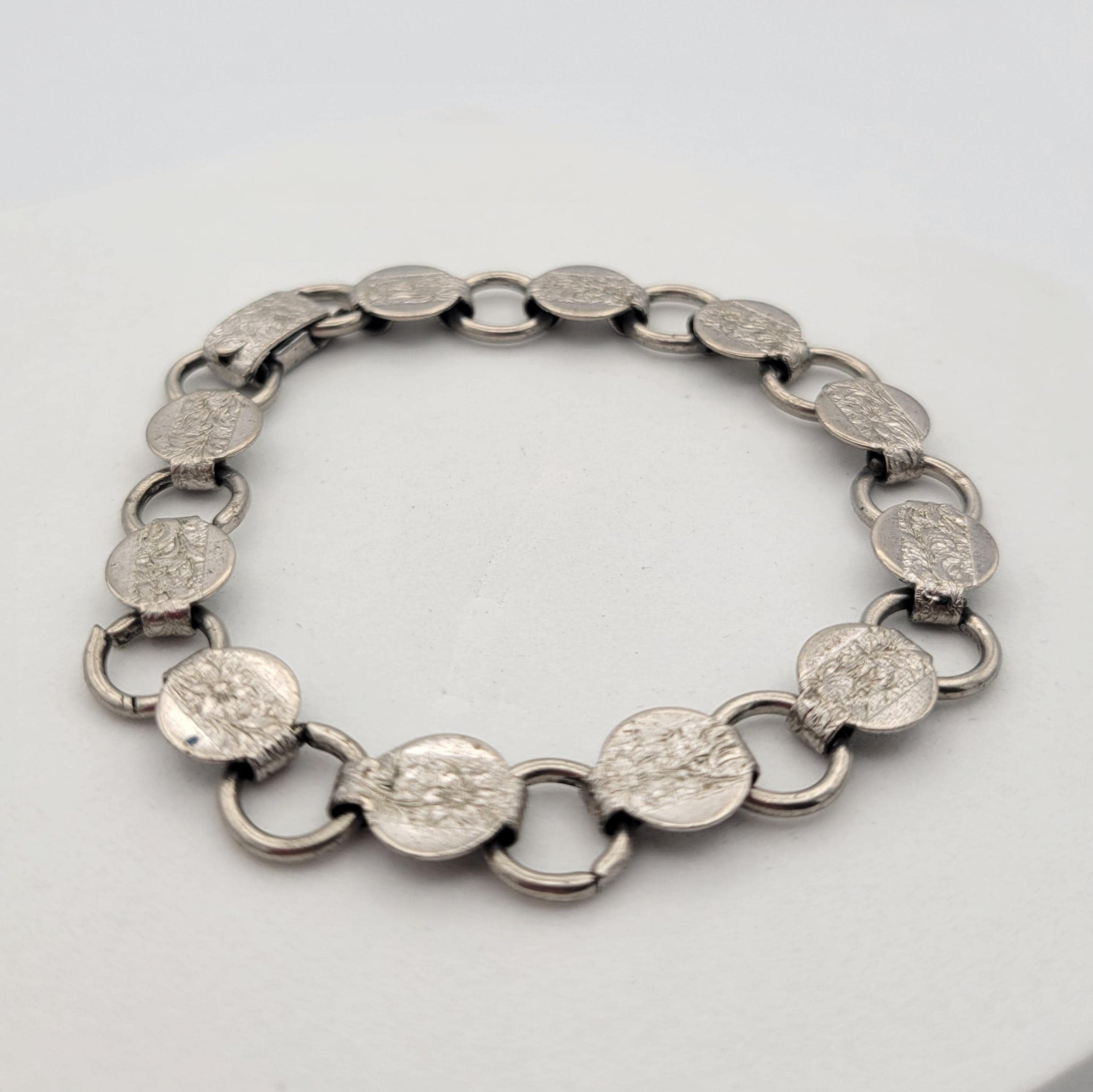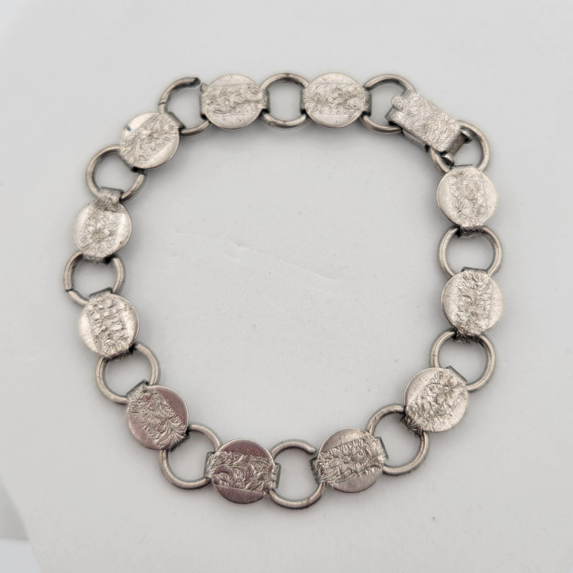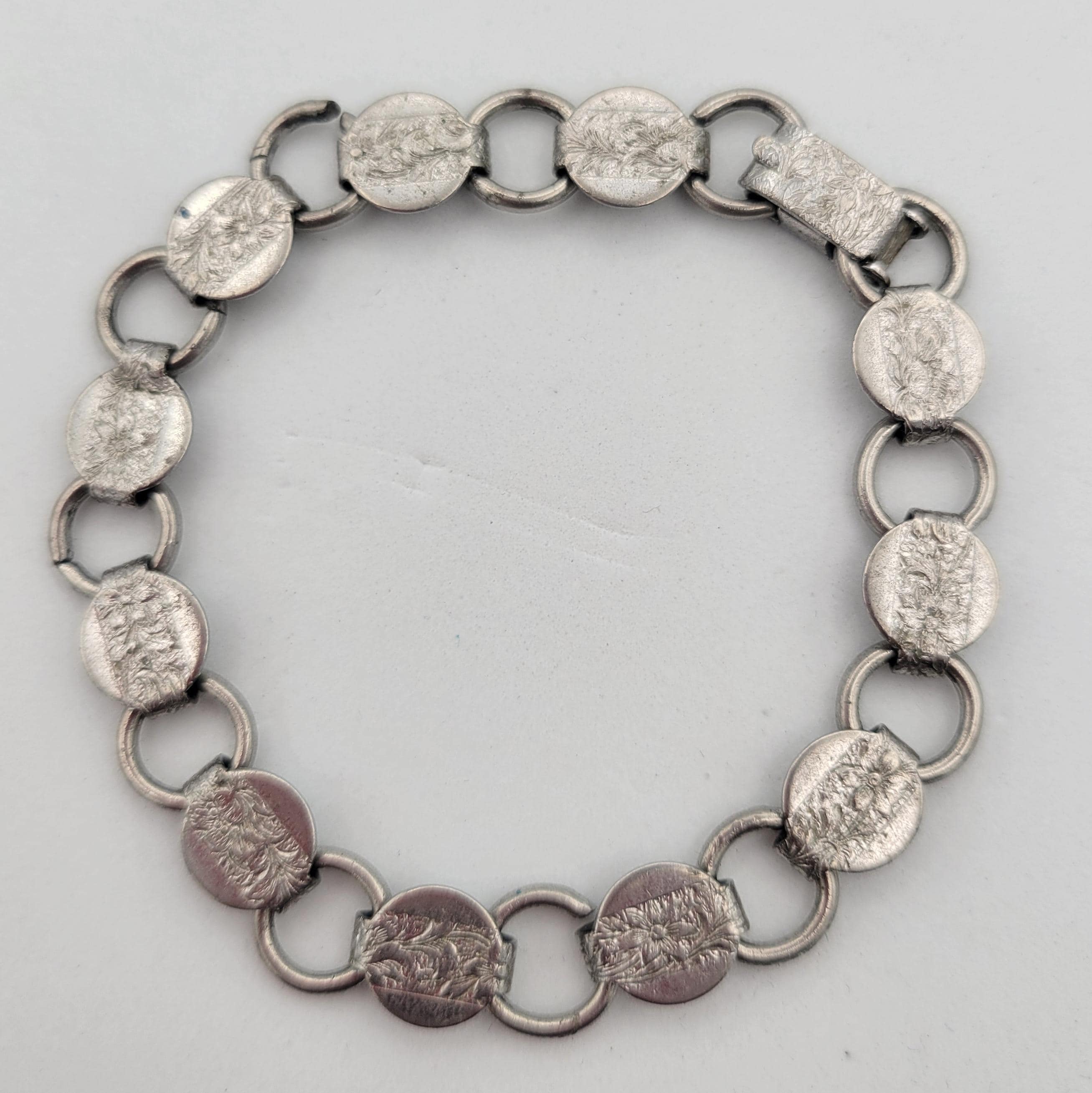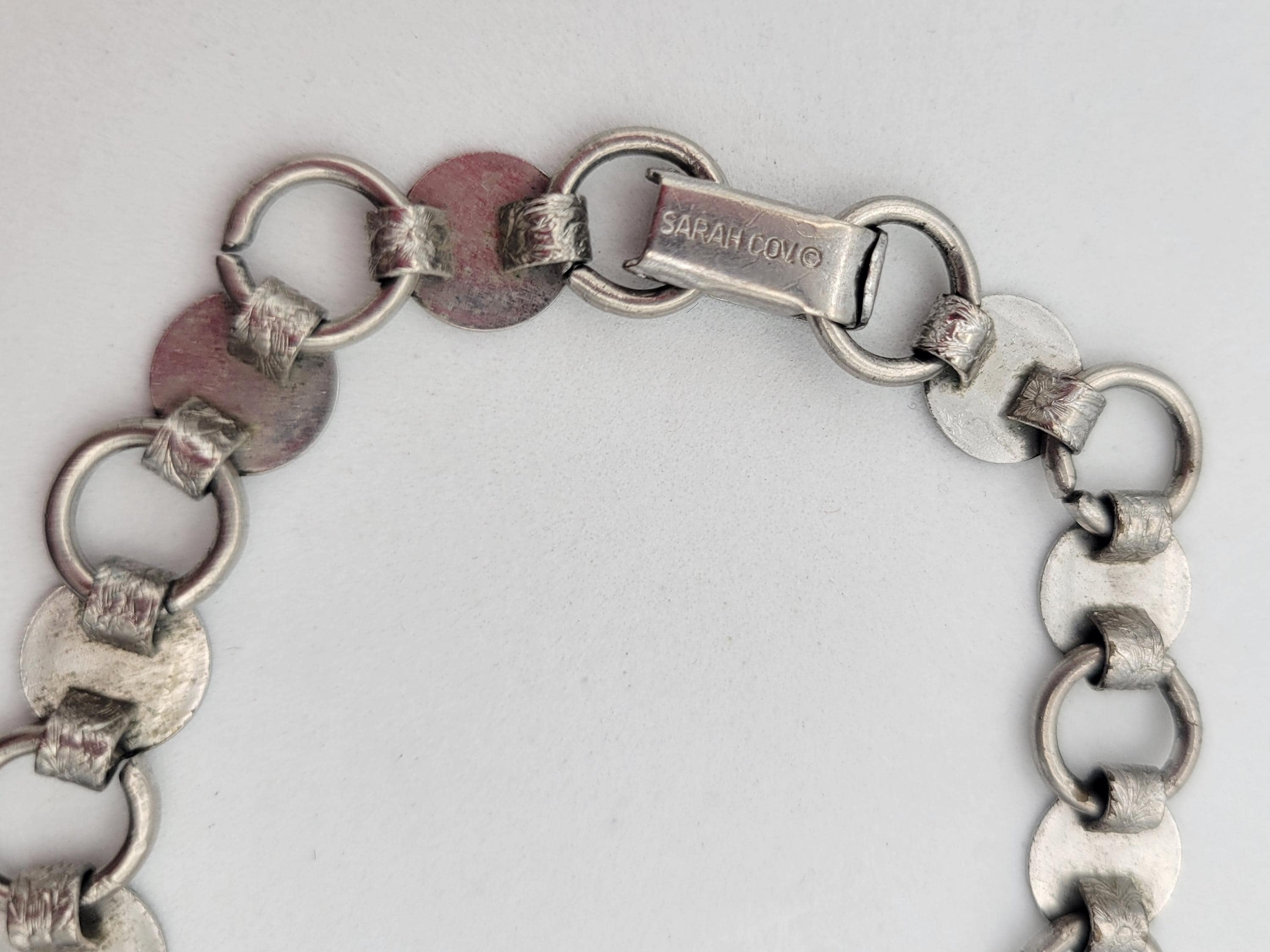This shining bracelet from Sarah Coventry makes a great accent piece. The bracelet is made up of silver-tone discs & openwork circular links. The discs have a floral pattern embossed in them. This bracelet is in excellent vintage condition with a small amount of wear. It needs cleaning & polishing.