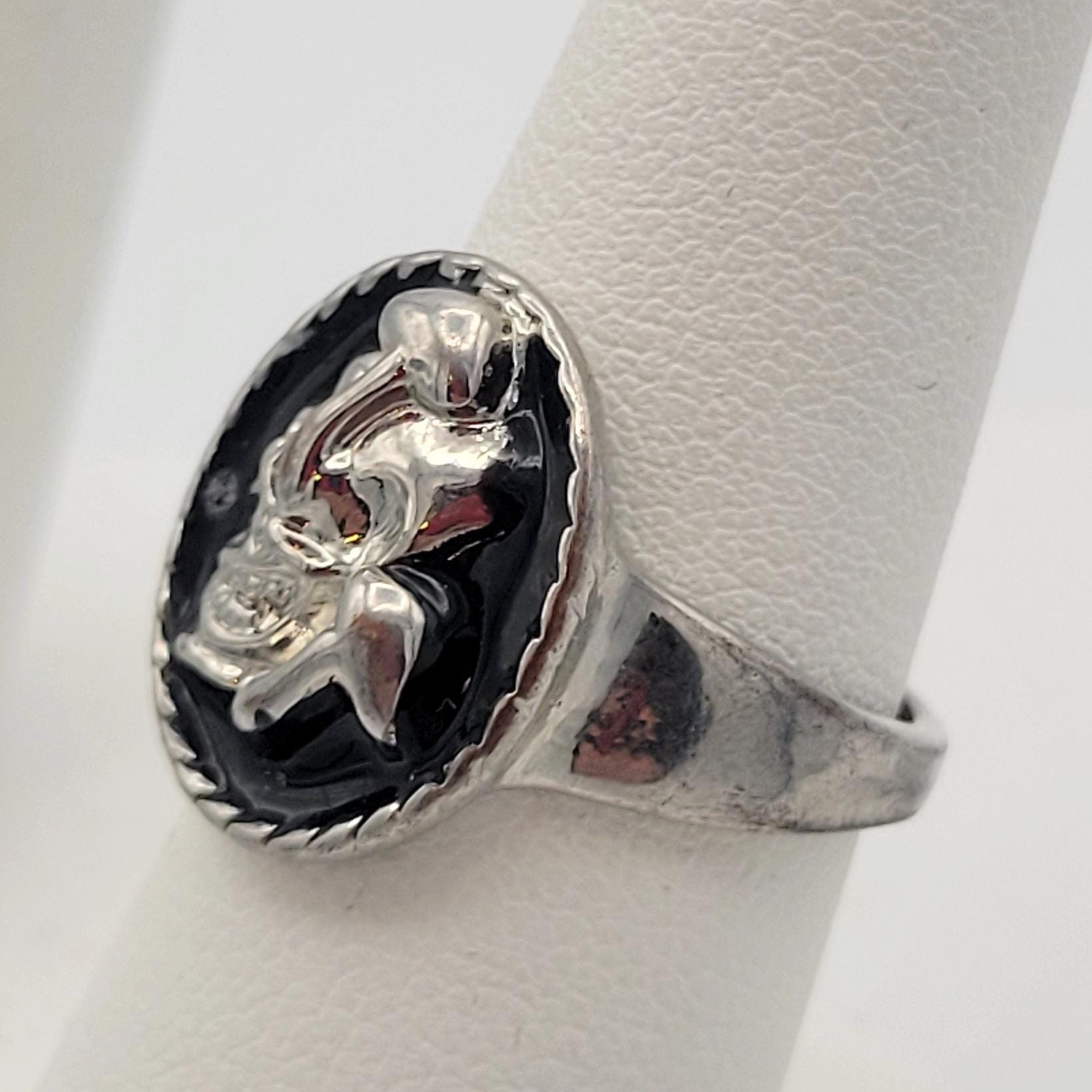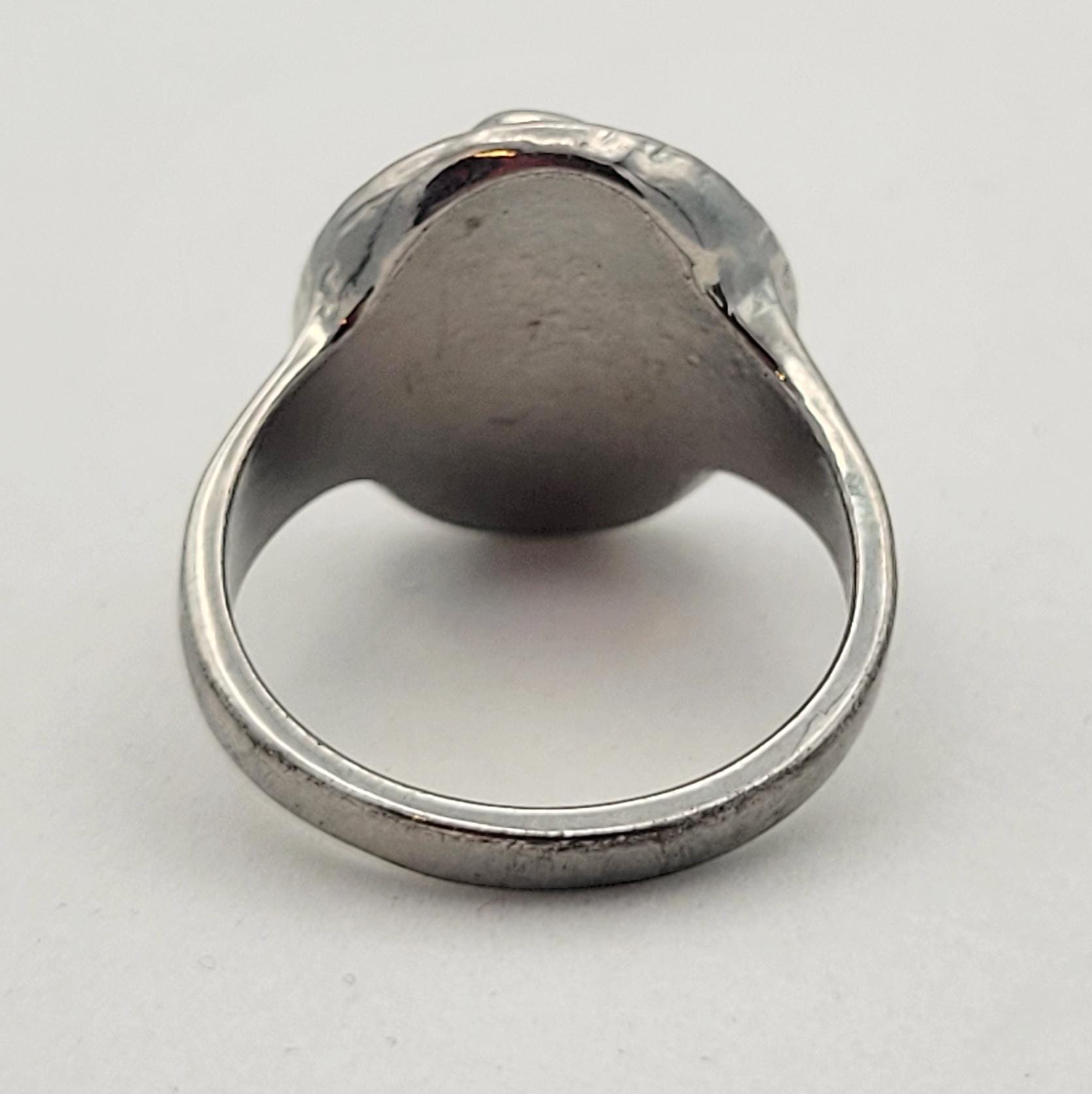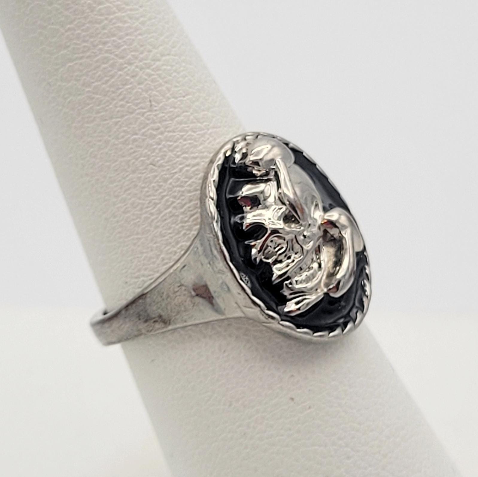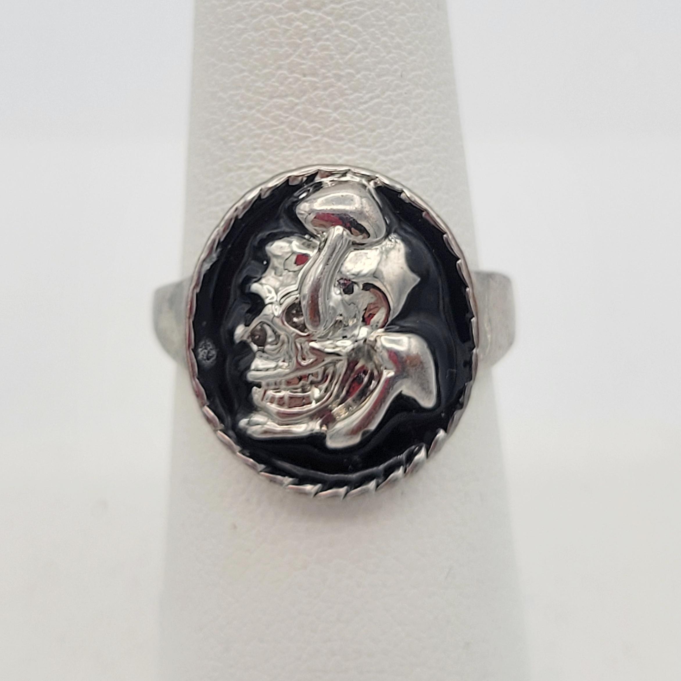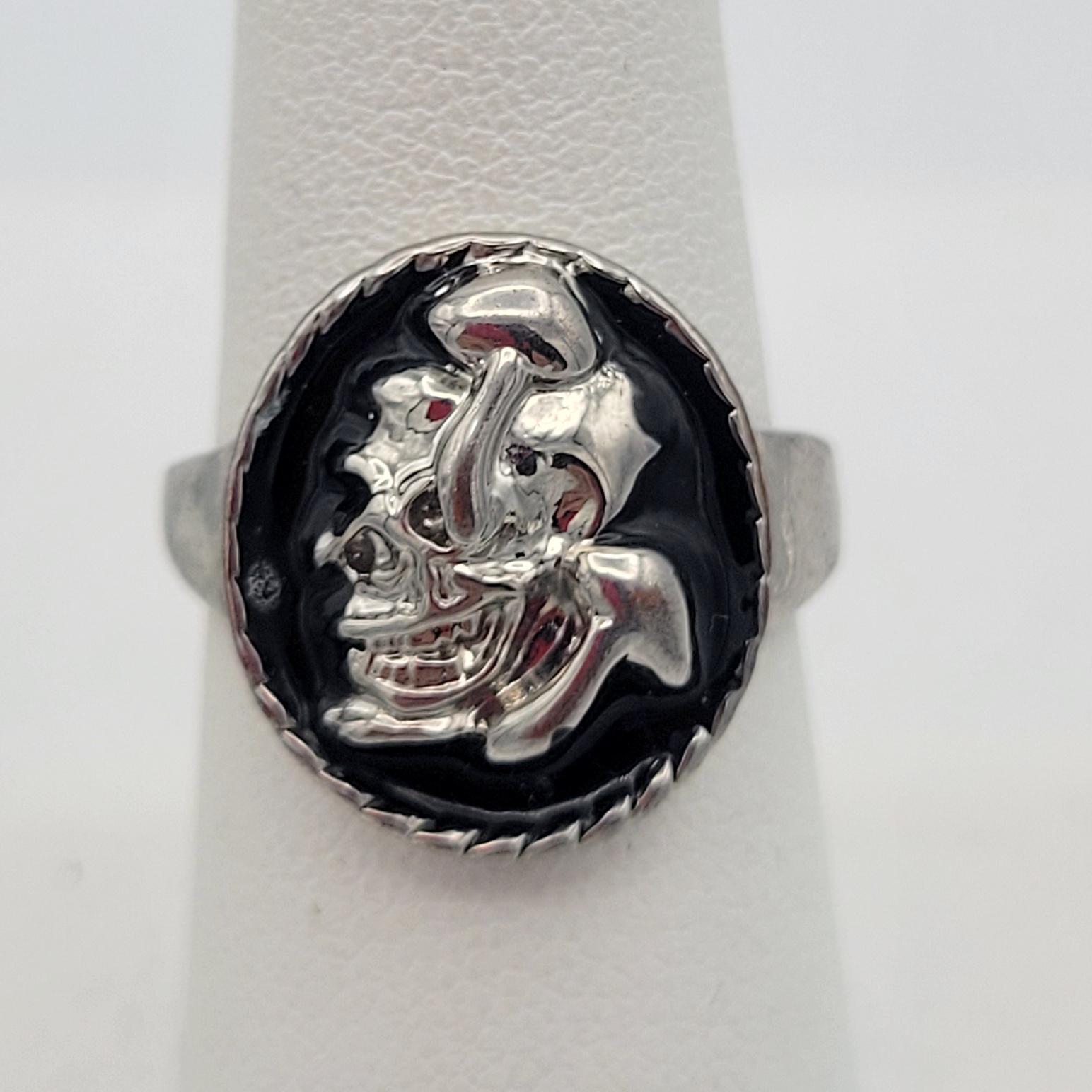 A great ring for the goth girl! The silver-tone band forms a circular setting that is filled with black enamel. In the center of the setting is a relief of a skull in profile with mushrooms growing through it. This piece is in excellent, nearly new condition.