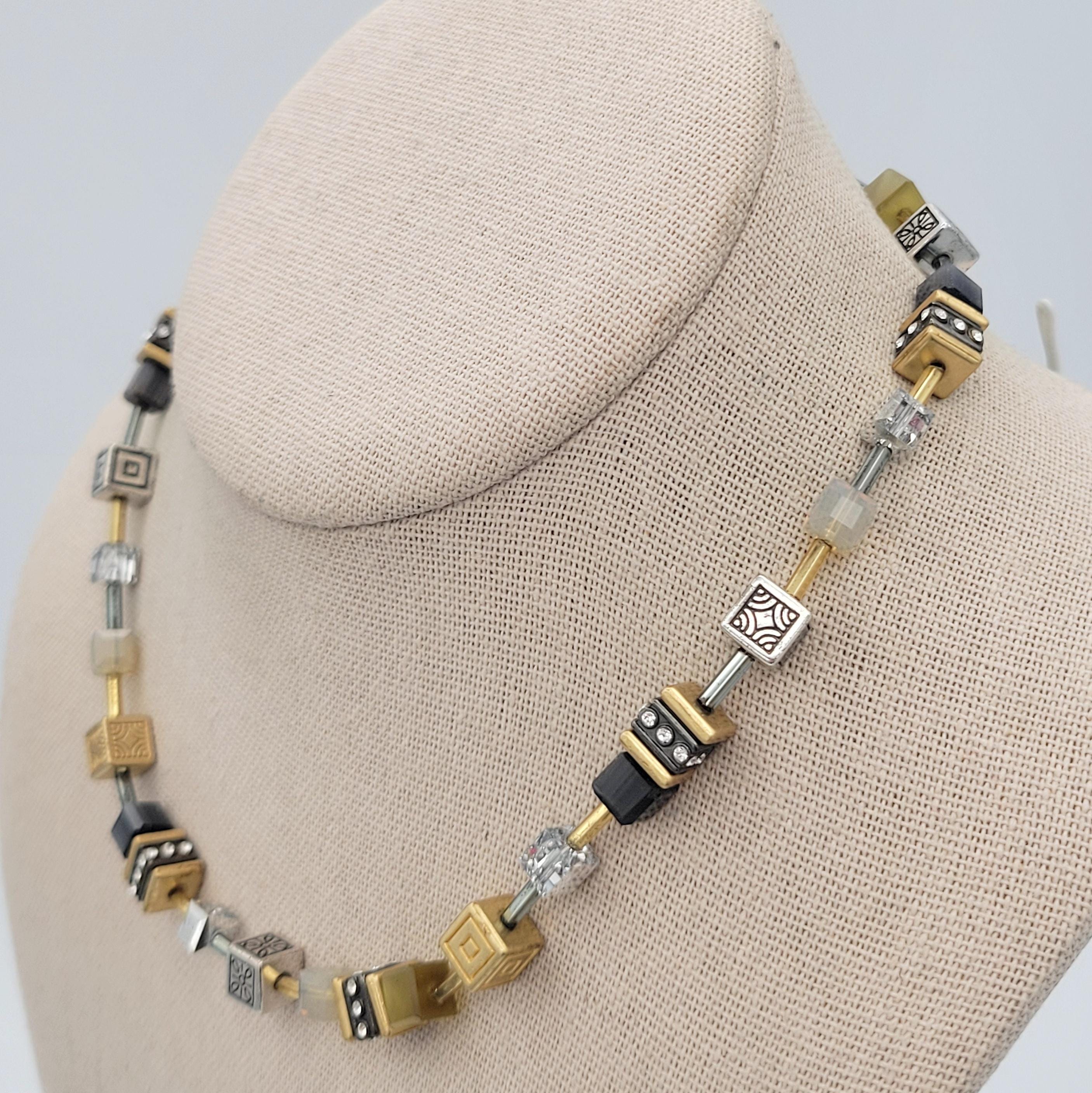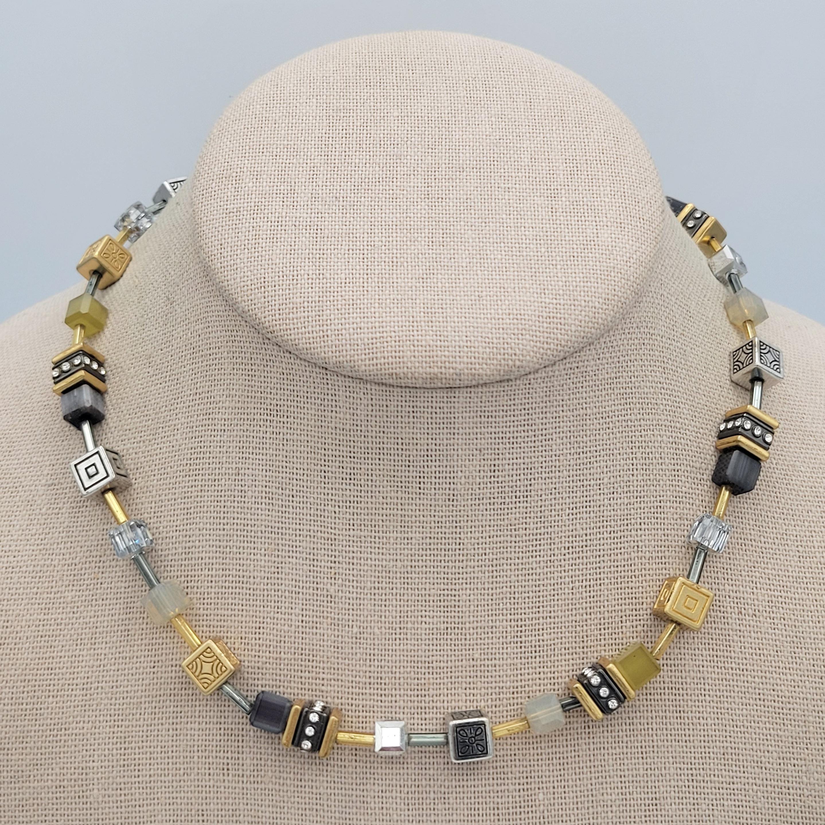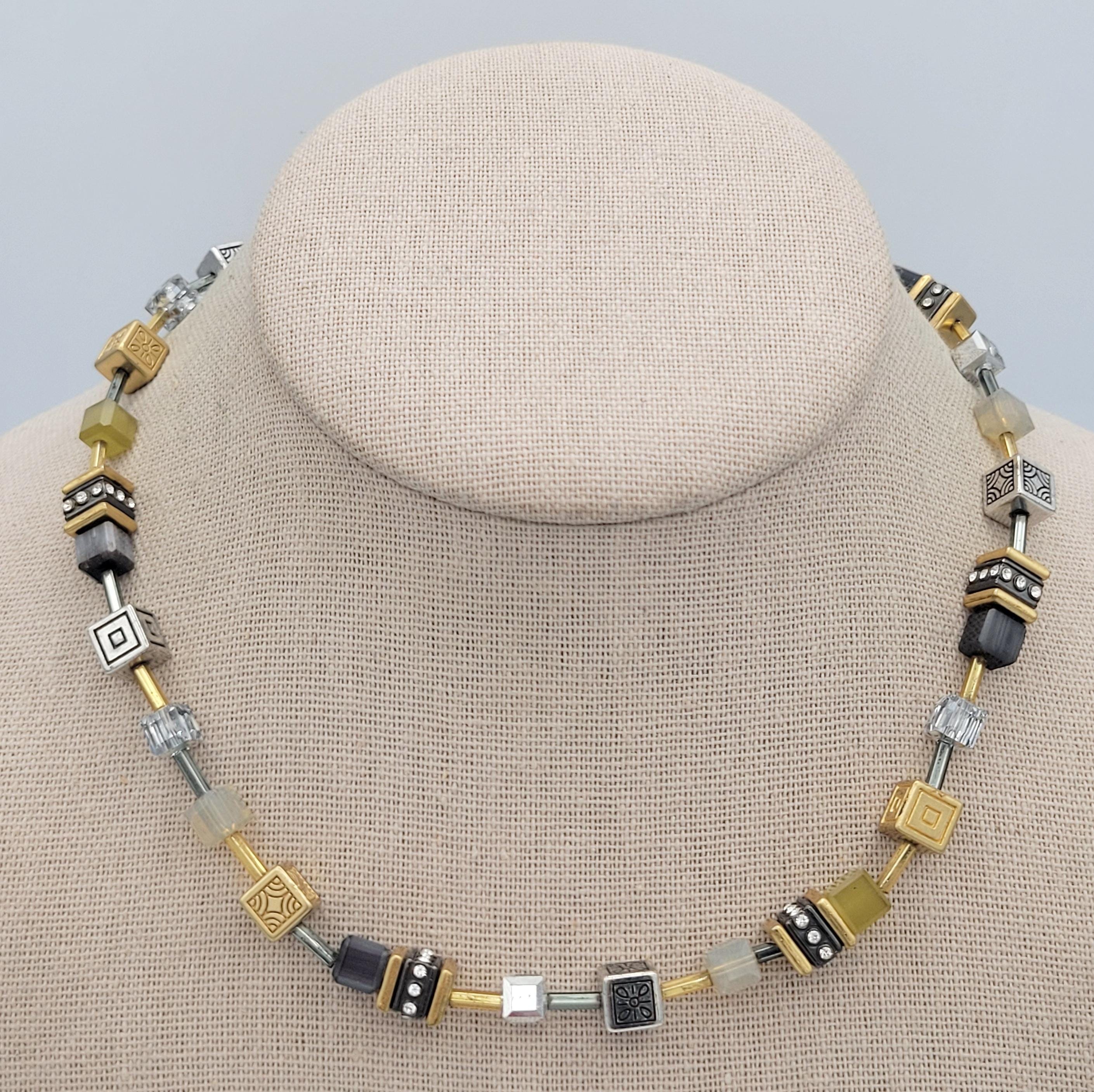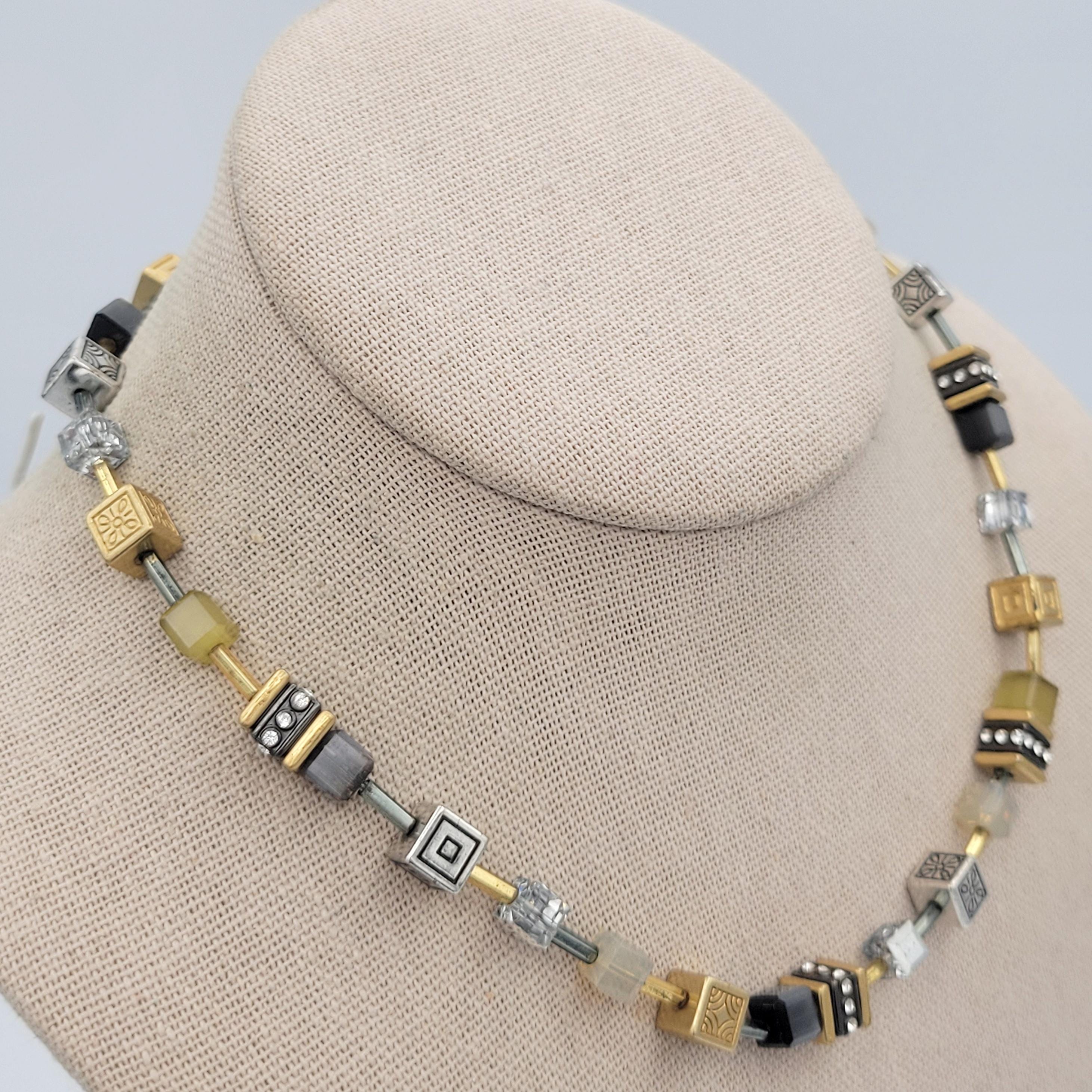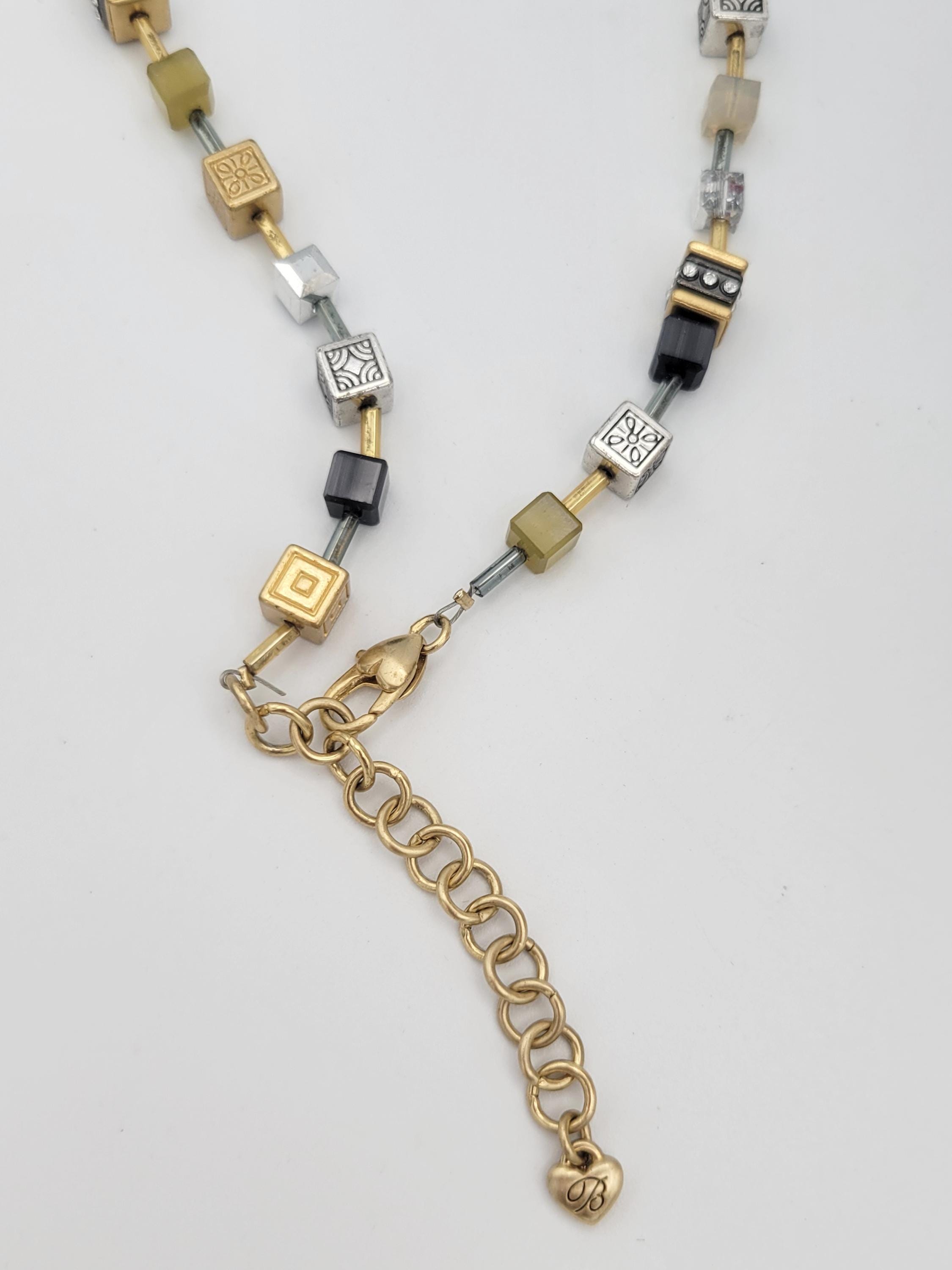 This shining piece from Brighton makes an eye-catching statement necklace. The gold-tone wire necklace secures with a lobster claw clasp & is adjustable for length. All along the wire are cube-shaped beads with various finishes, colors, engravings & accents. The beads are silver-tone, gold-tone, black, gray, & clear. A few of the black beads are dotted with rhinestone accents. This piece is in excellent, nearly new condition.