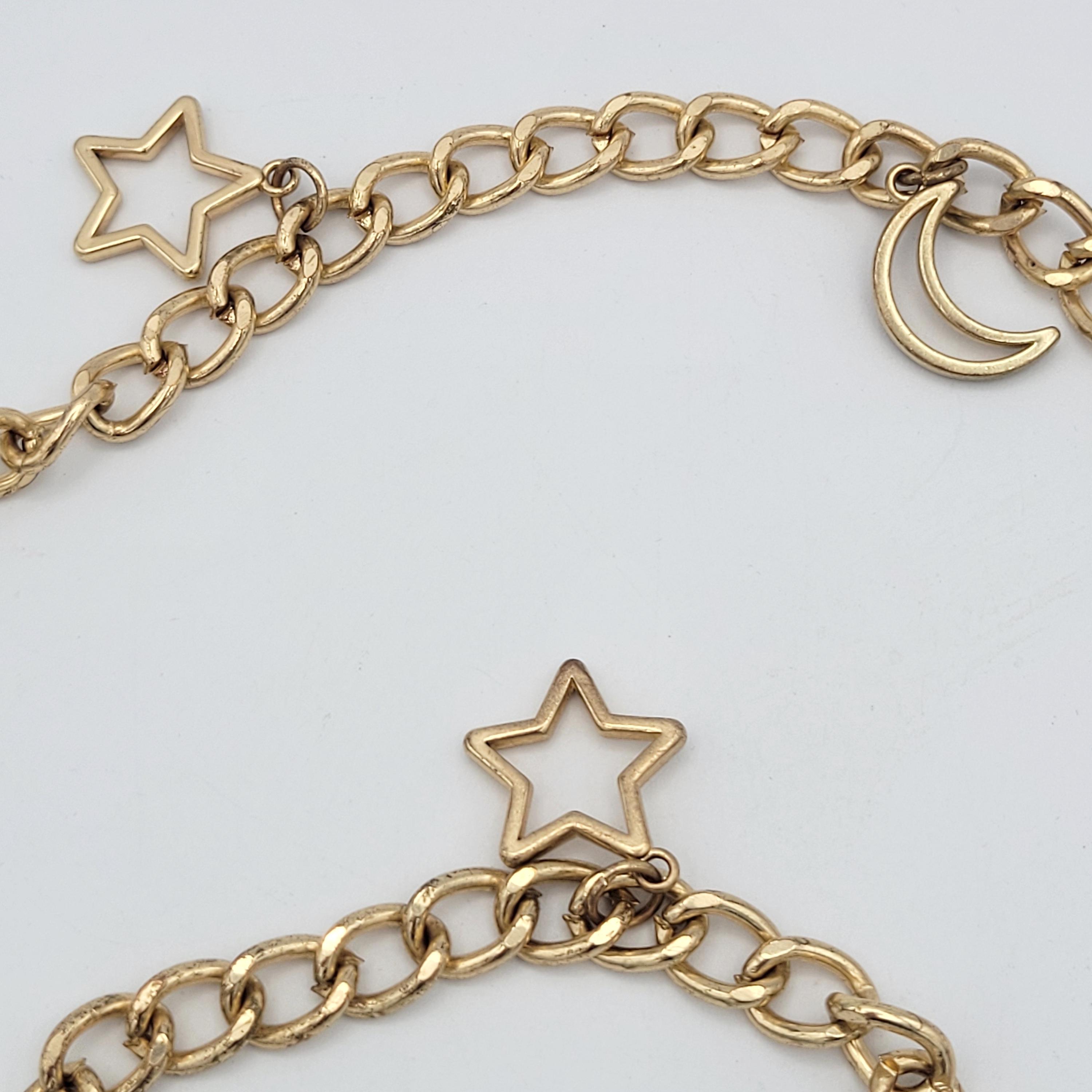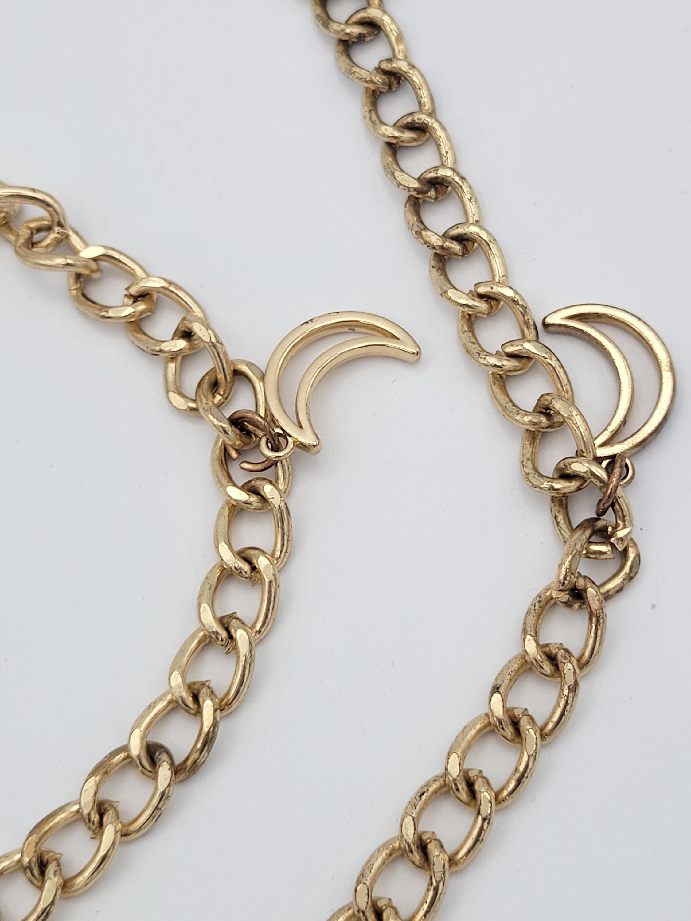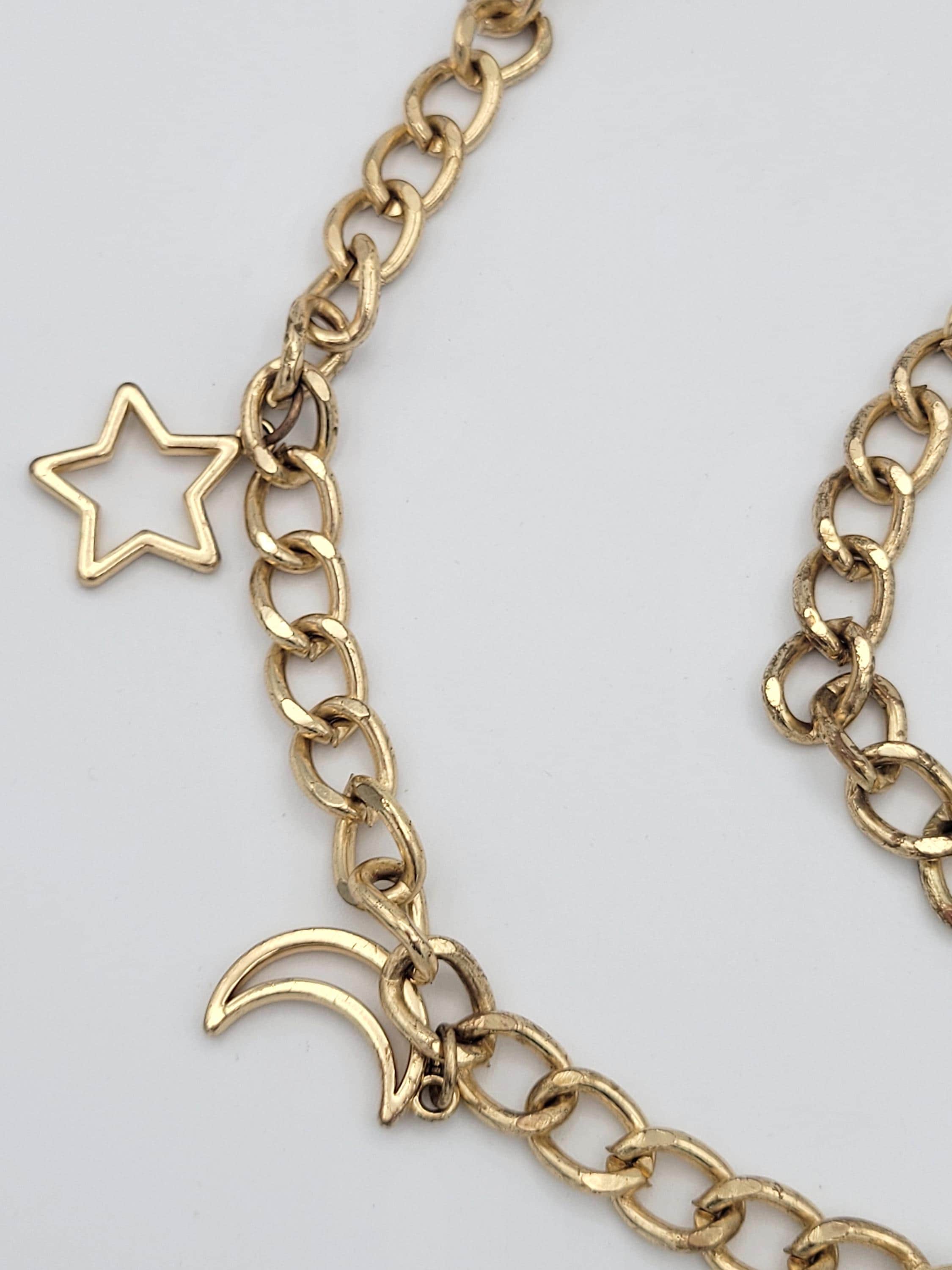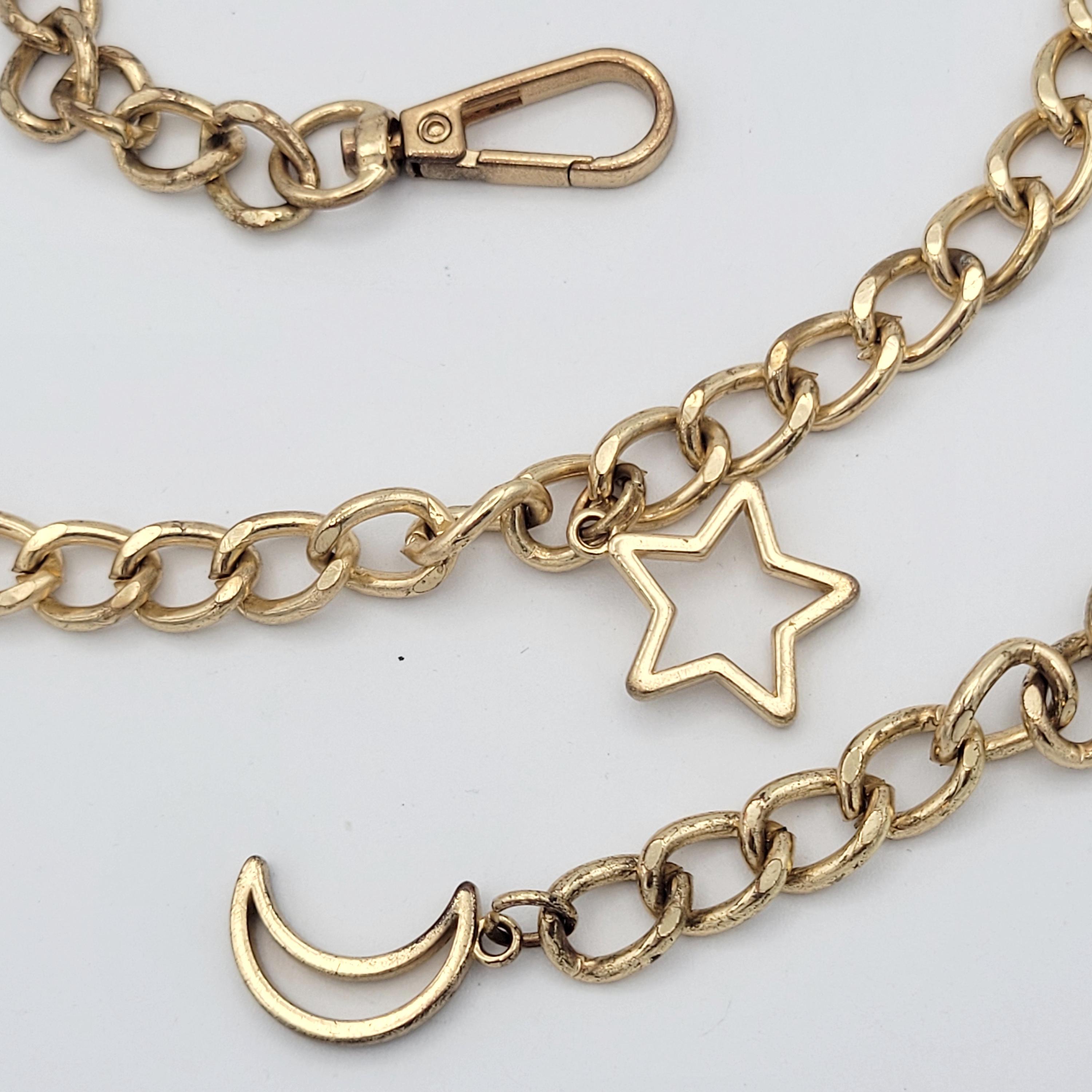 This vintage chain belt makes a great statement piece. The hefty piece is made of 1 strand of gold-tone curb chain. There are several dangling charms along the chain of openwork star & crescent moon shapes. The chain secures with a lobster claw clasp. This piece is in great vintage condition with a small amount of wear.
