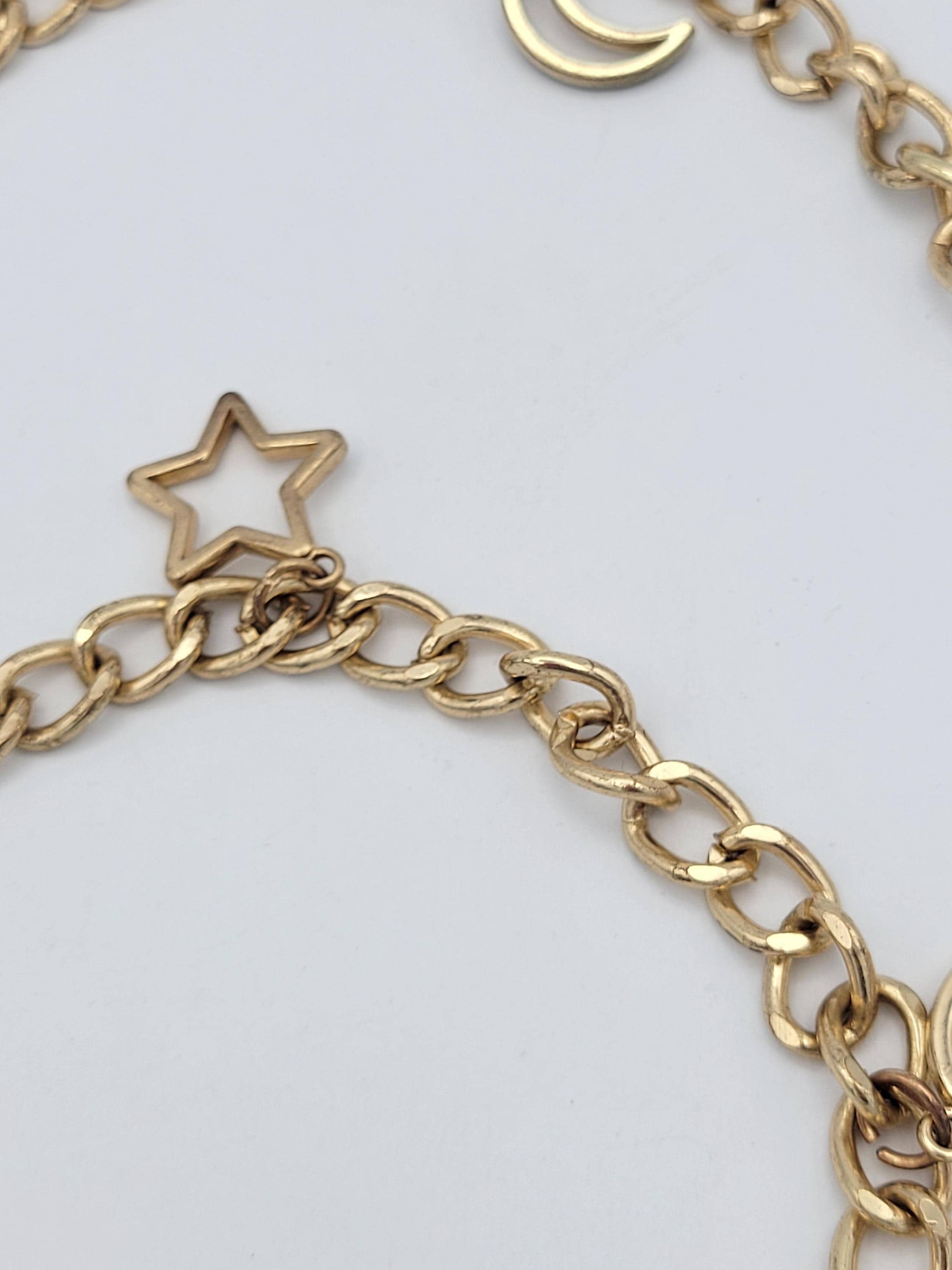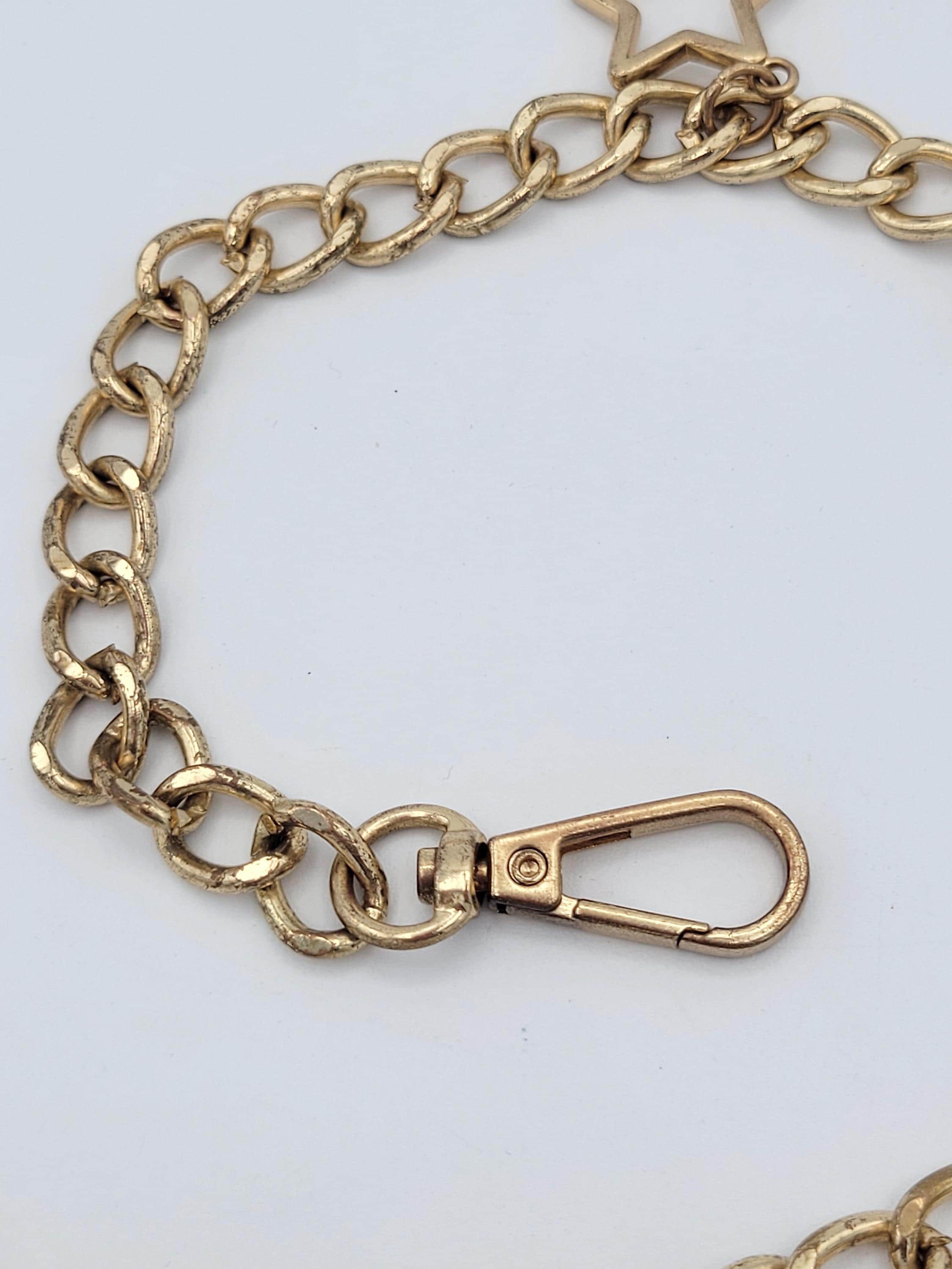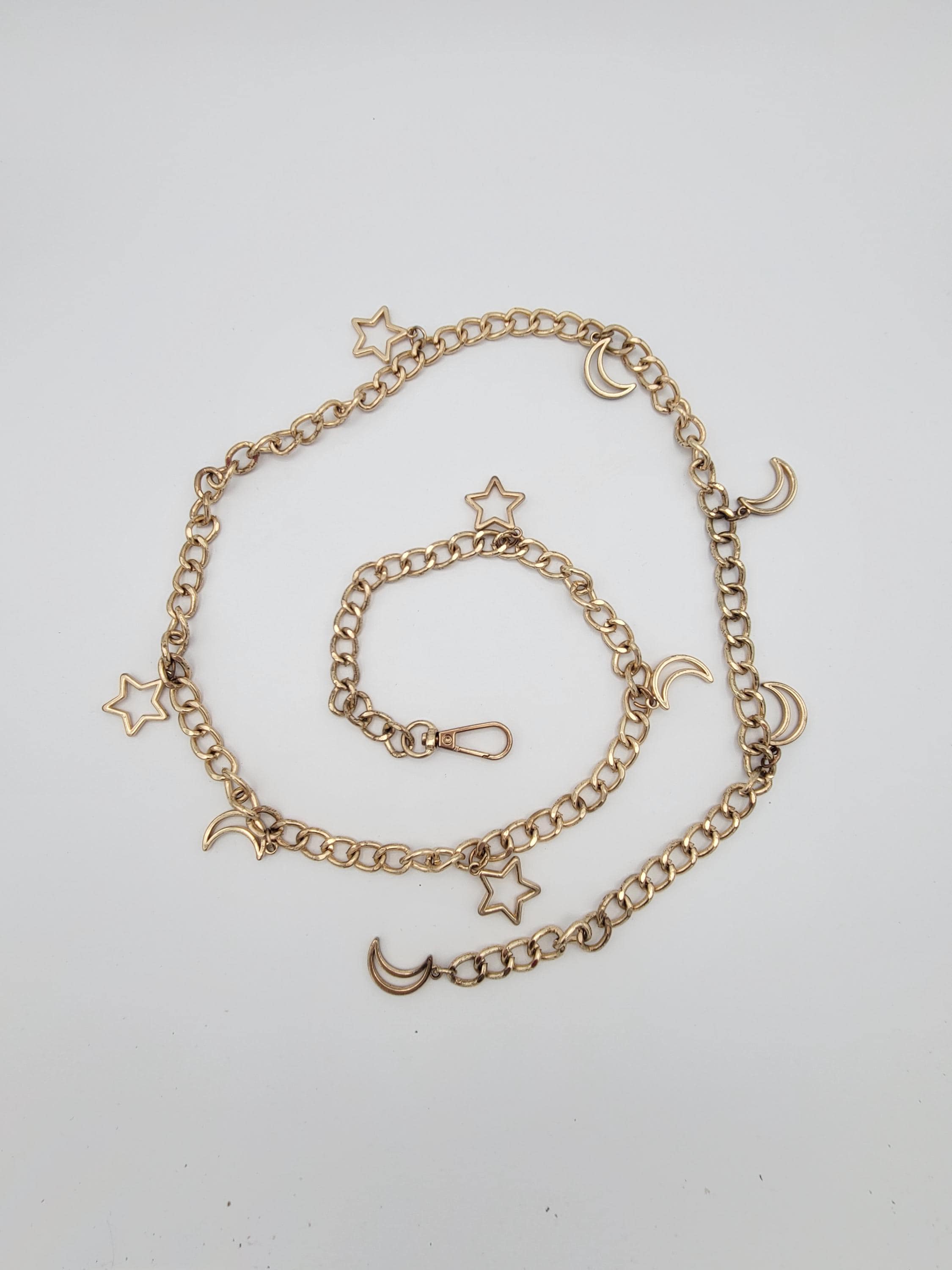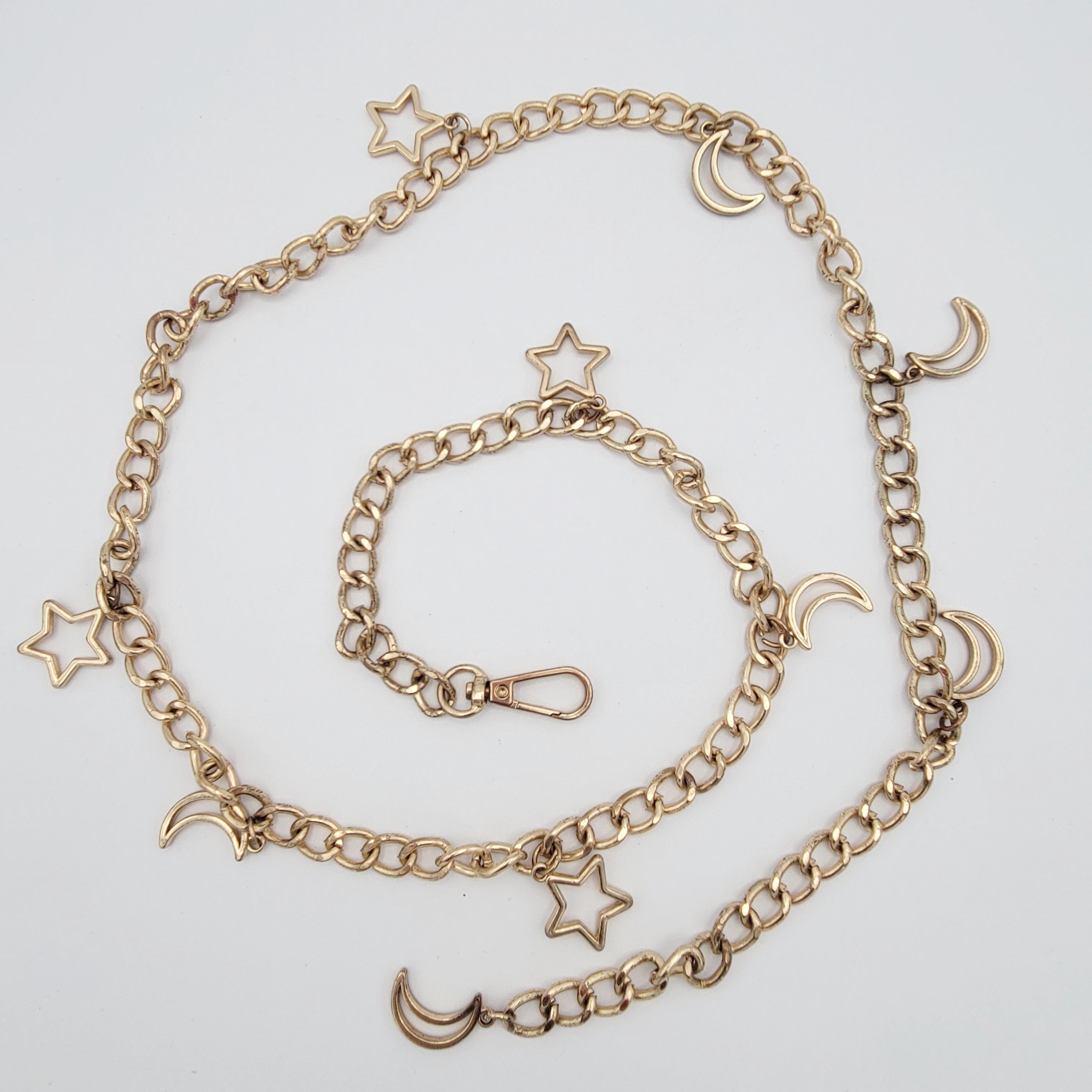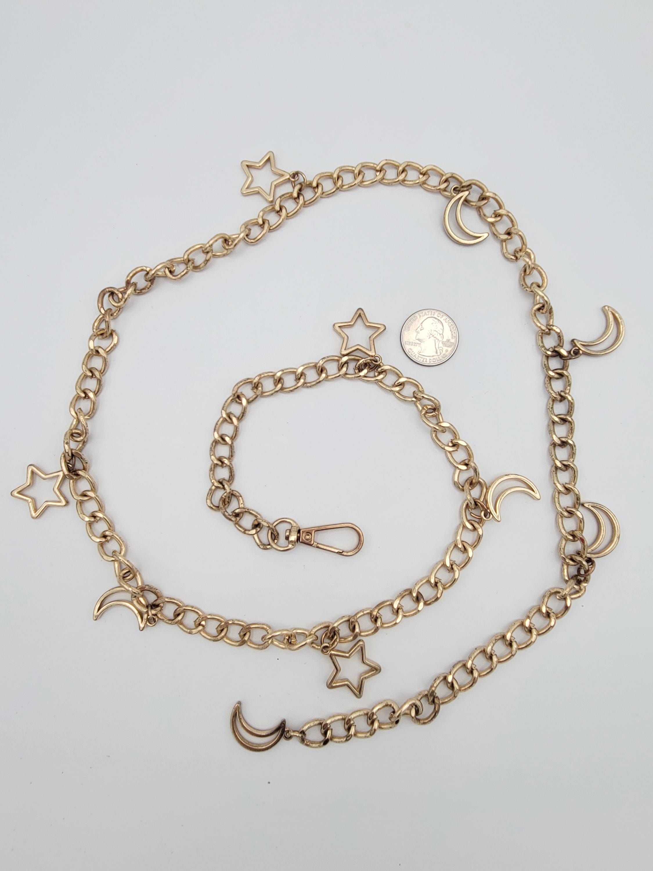 This vintage chain belt makes a great statement piece. The hefty piece is made of 1 strand of gold-tone curb chain. There are several dangling charms along the chain of openwork star & crescent moon shapes. The chain secures with a lobster claw clasp. This piece is in great vintage condition with a small amount of wear.