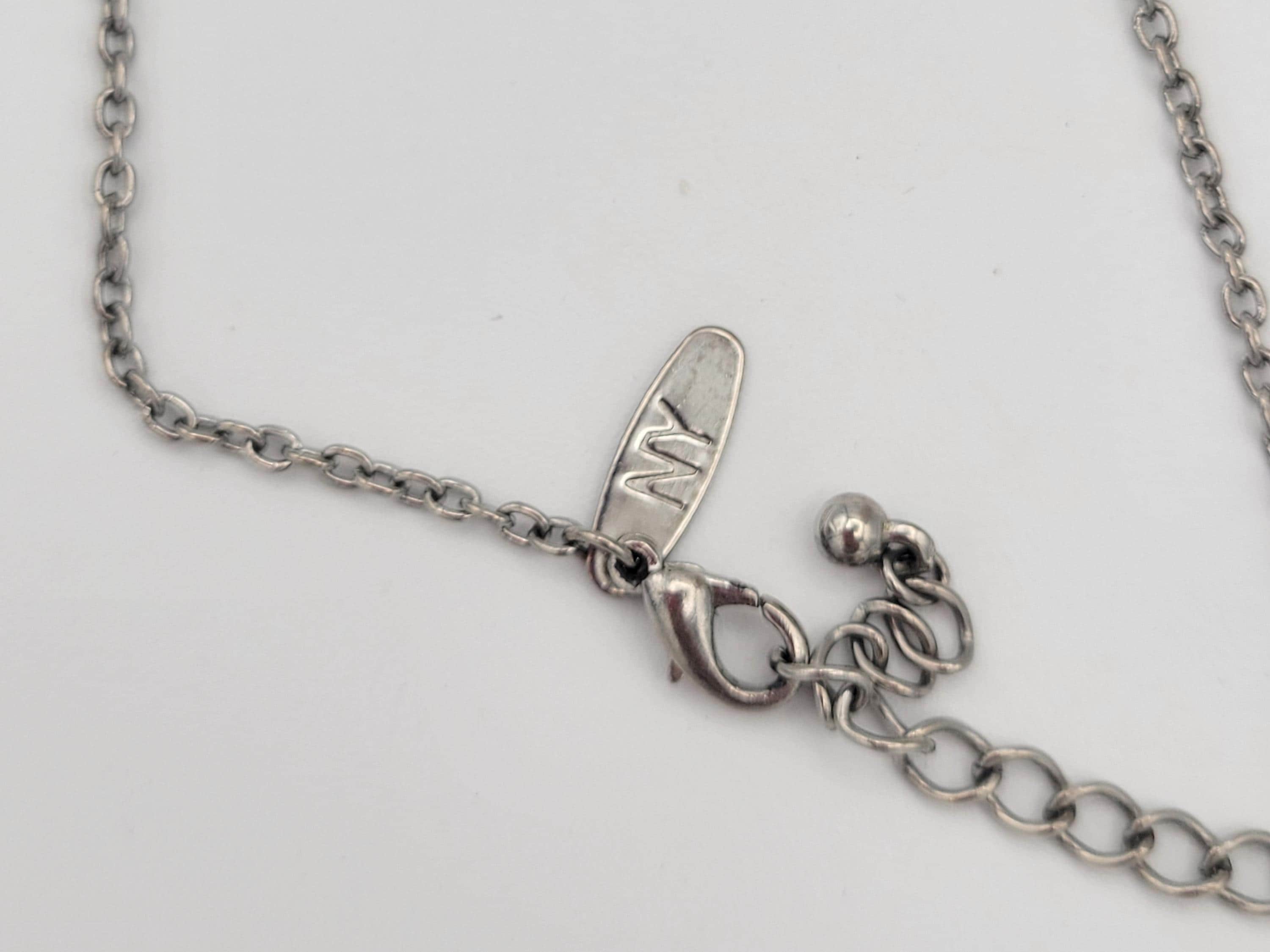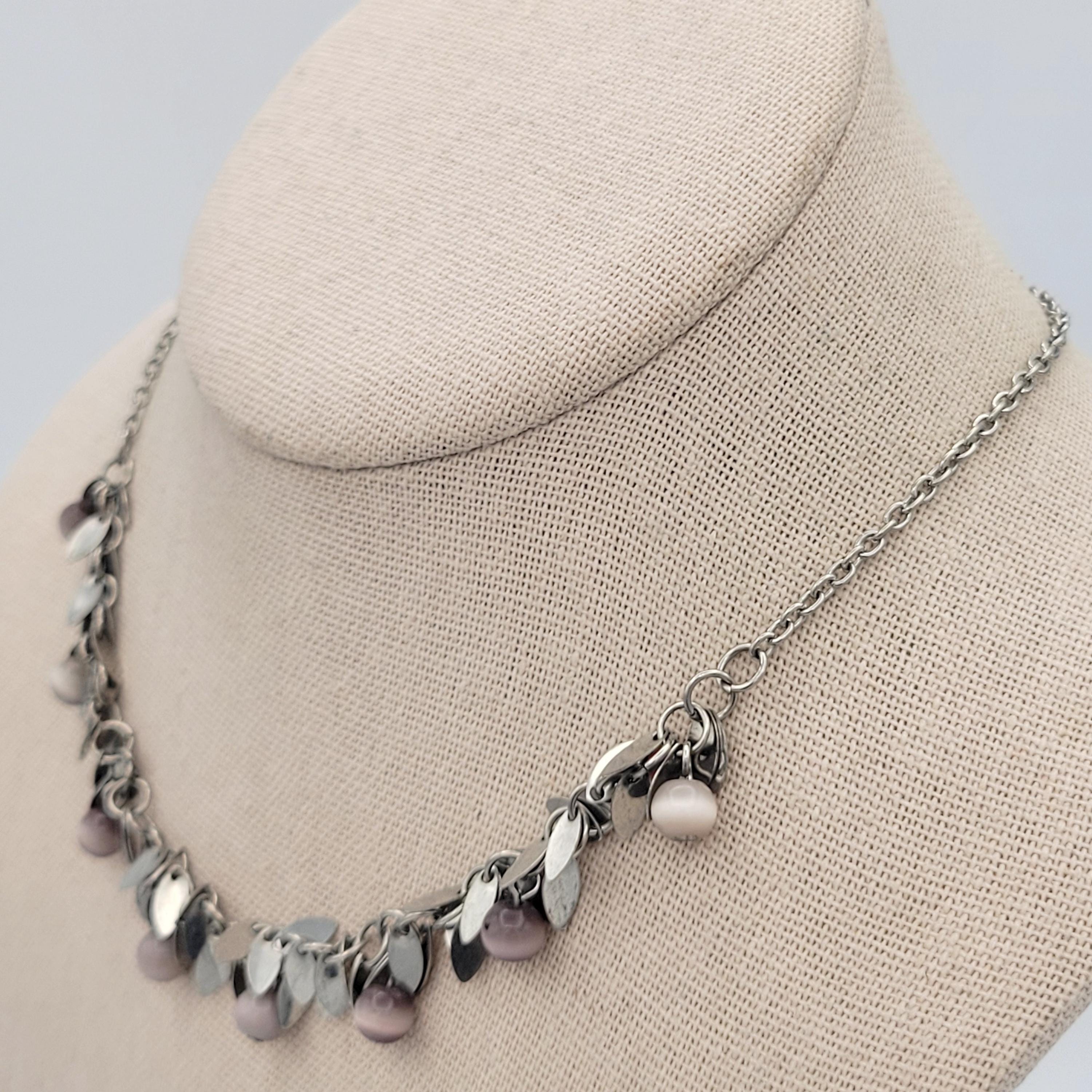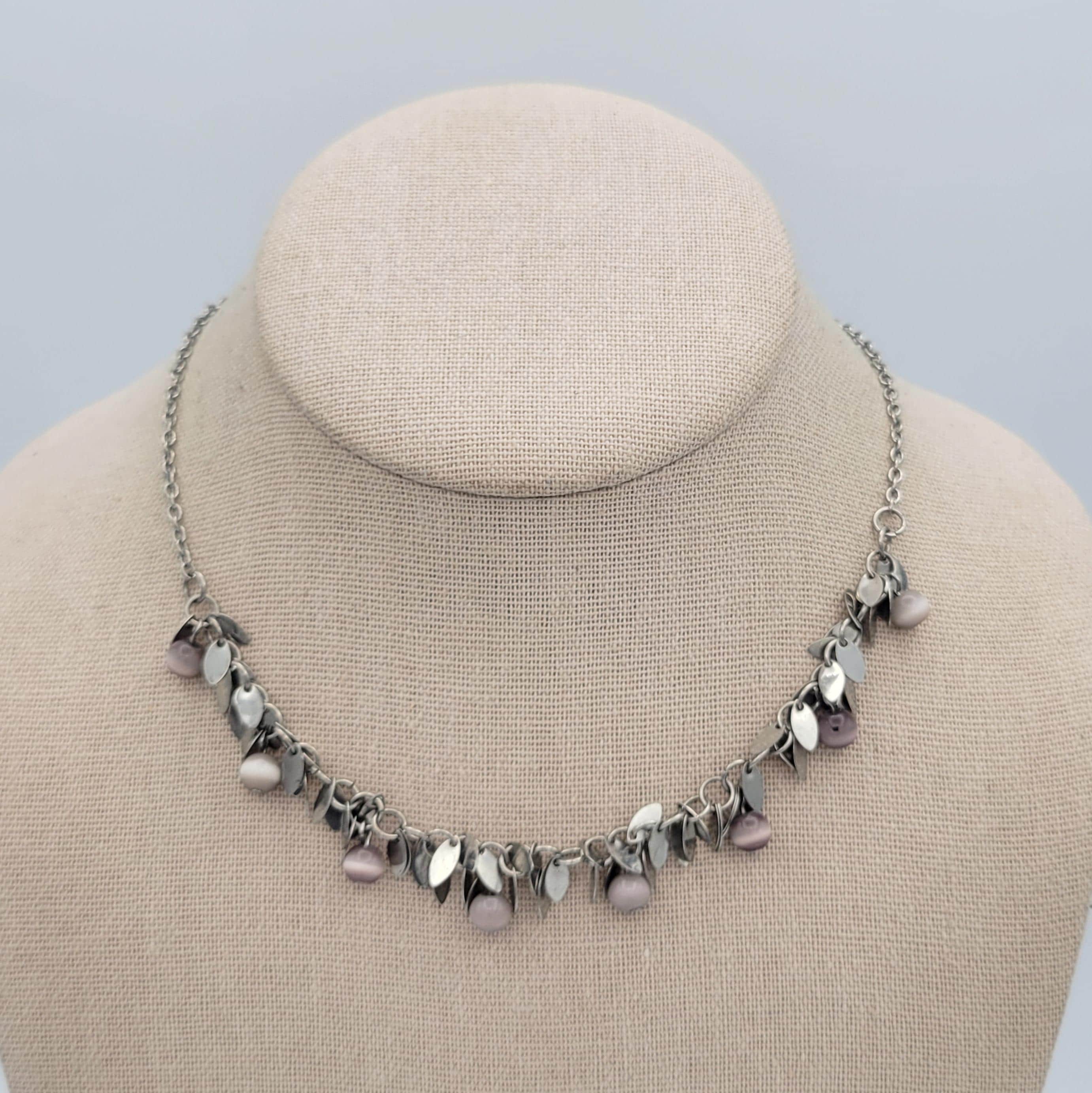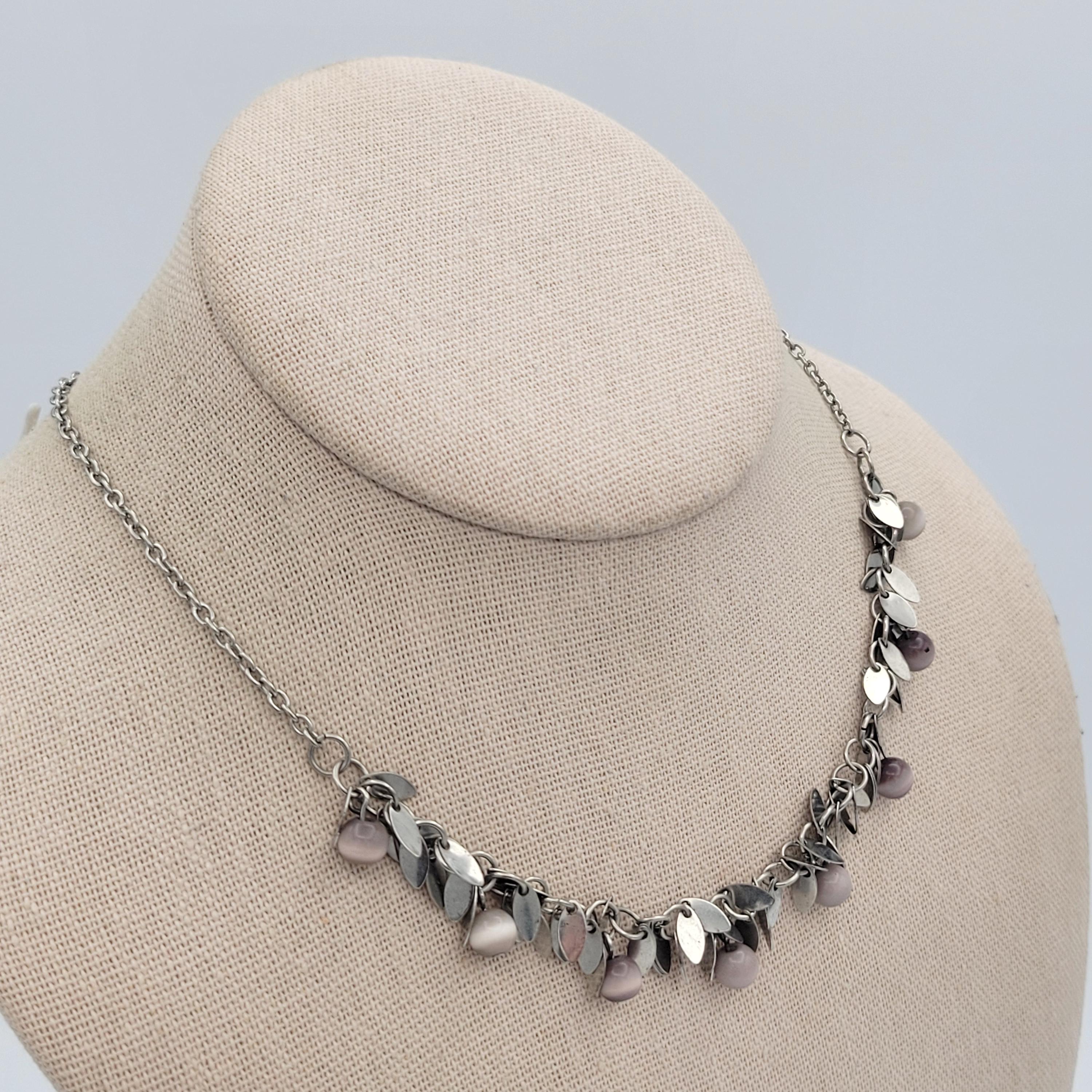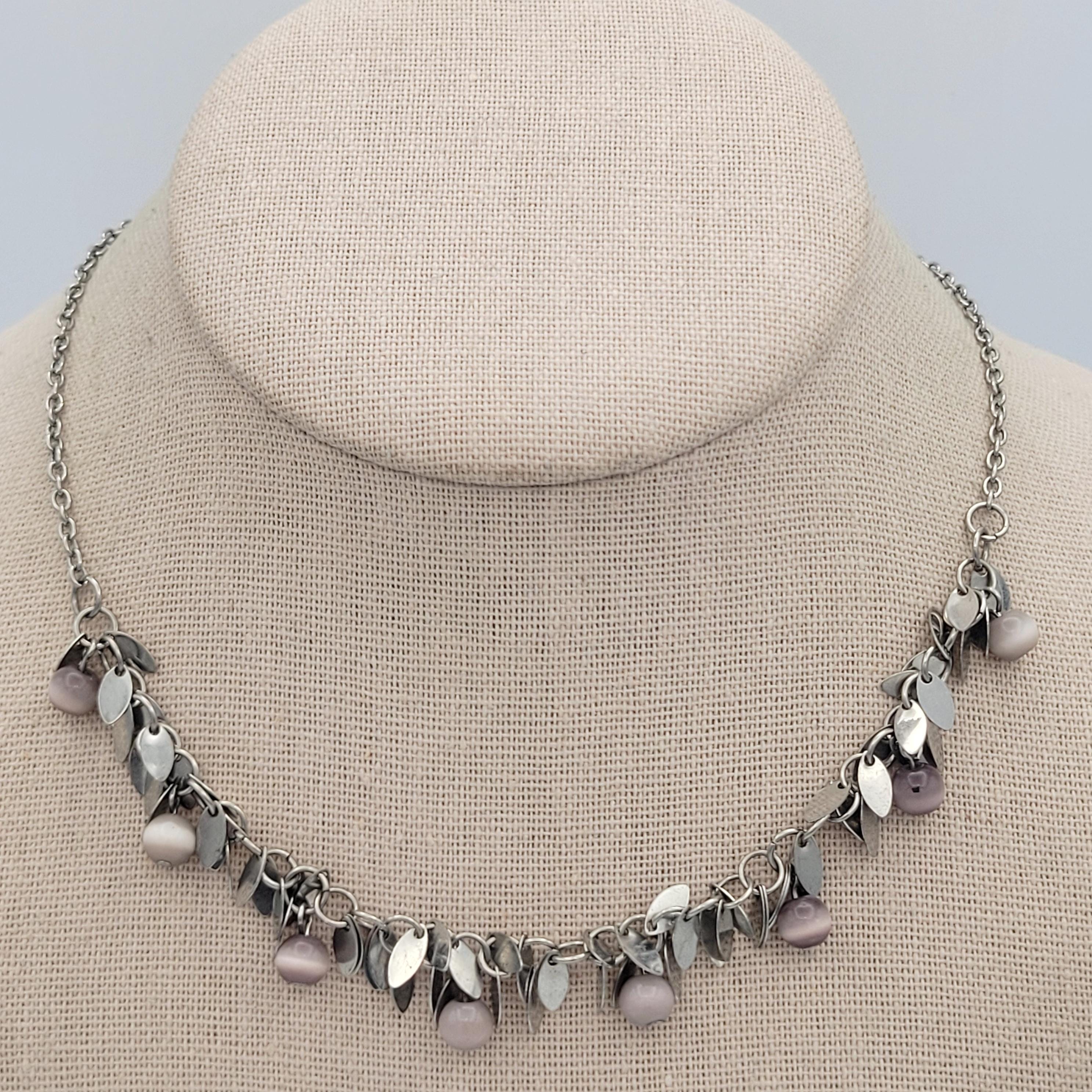 This versatile necklace will add some shine to your ensemble. The shining silver-tone cable chain secures with a lobster claw clasp & is adjustable for length. The bib of the necklace is made up of many chrome-finished oval-shaped dangles & several gray beads of faux tiger's eye. This piece is in excellent, nearly new condition.