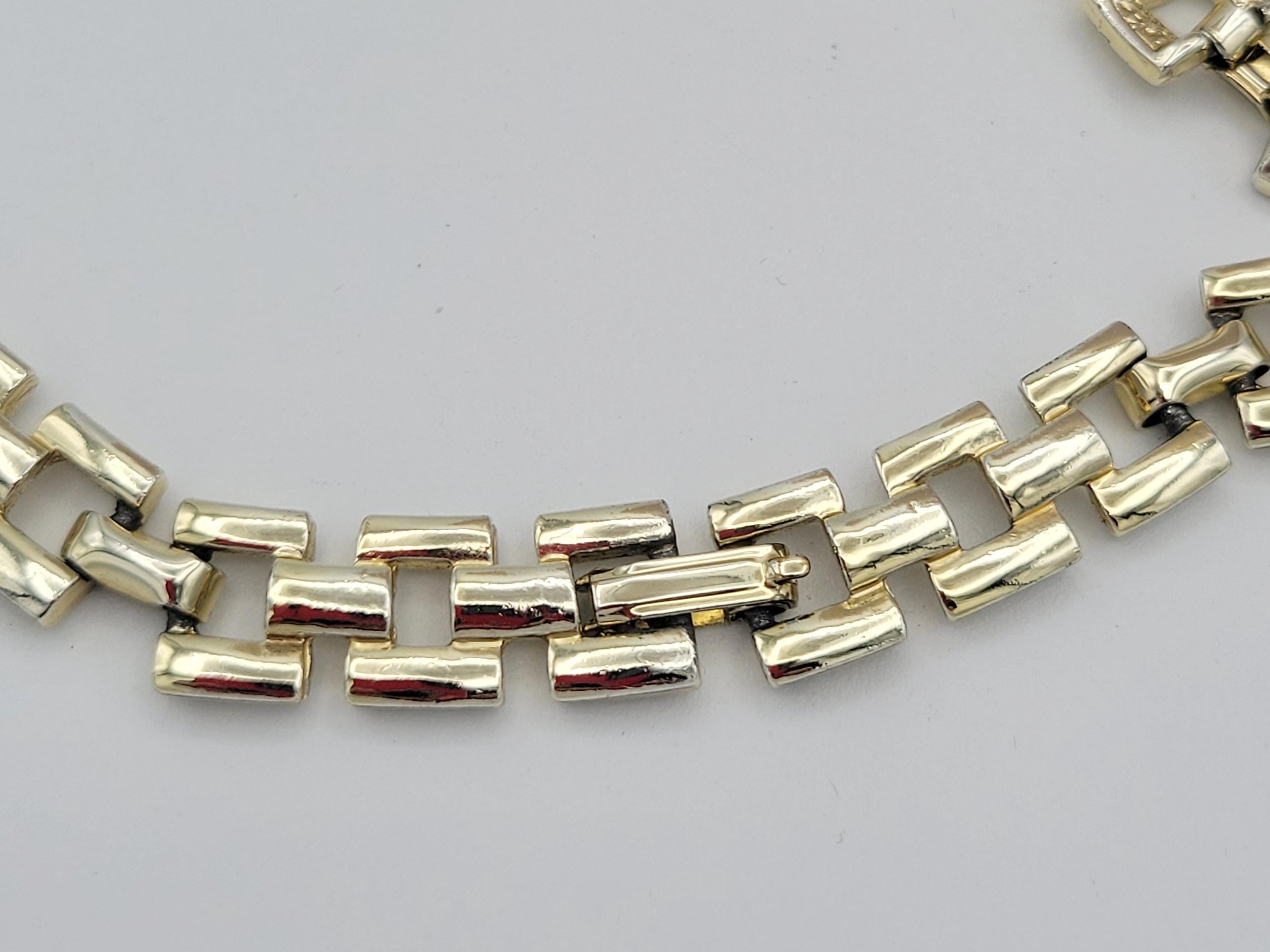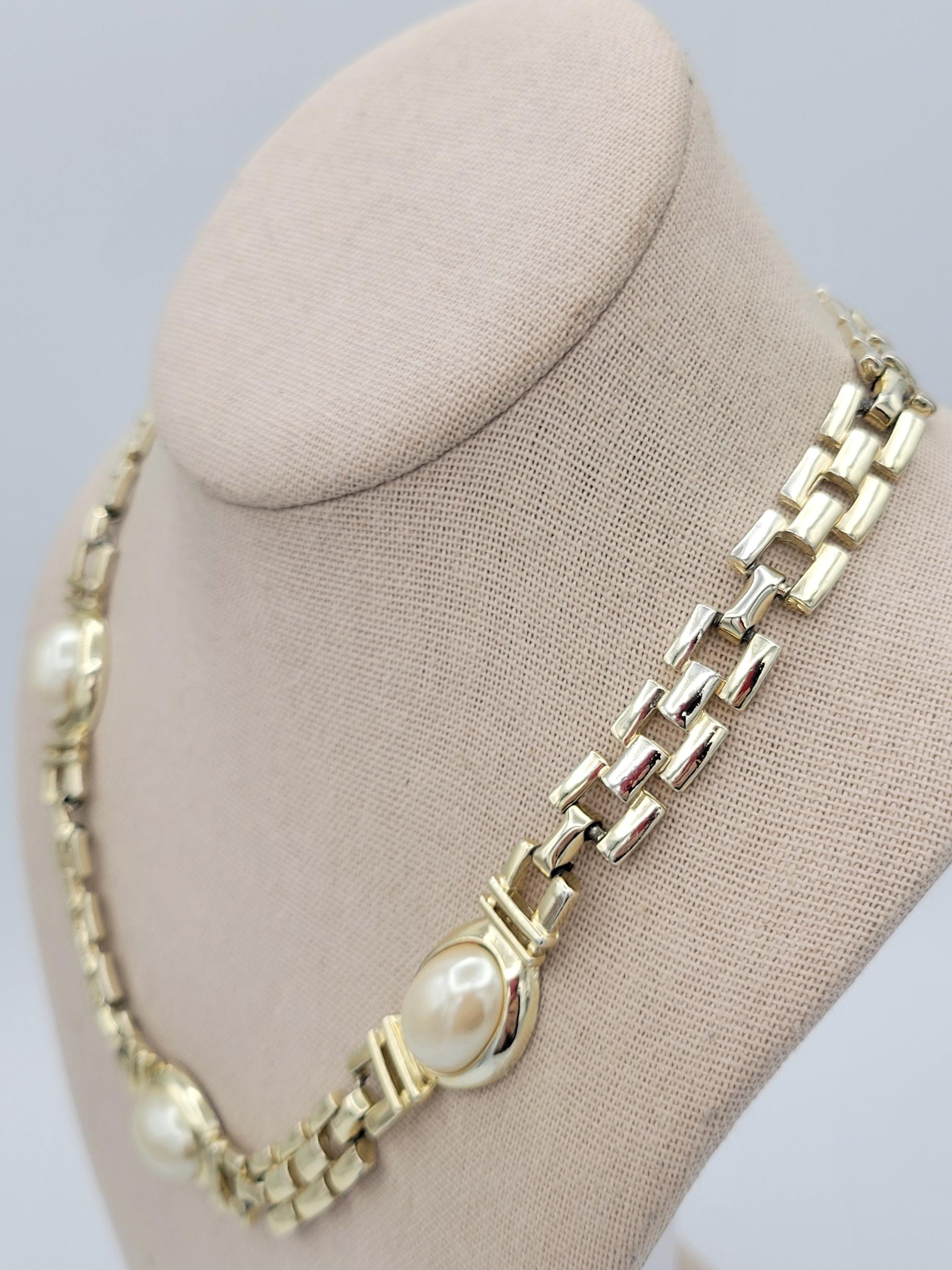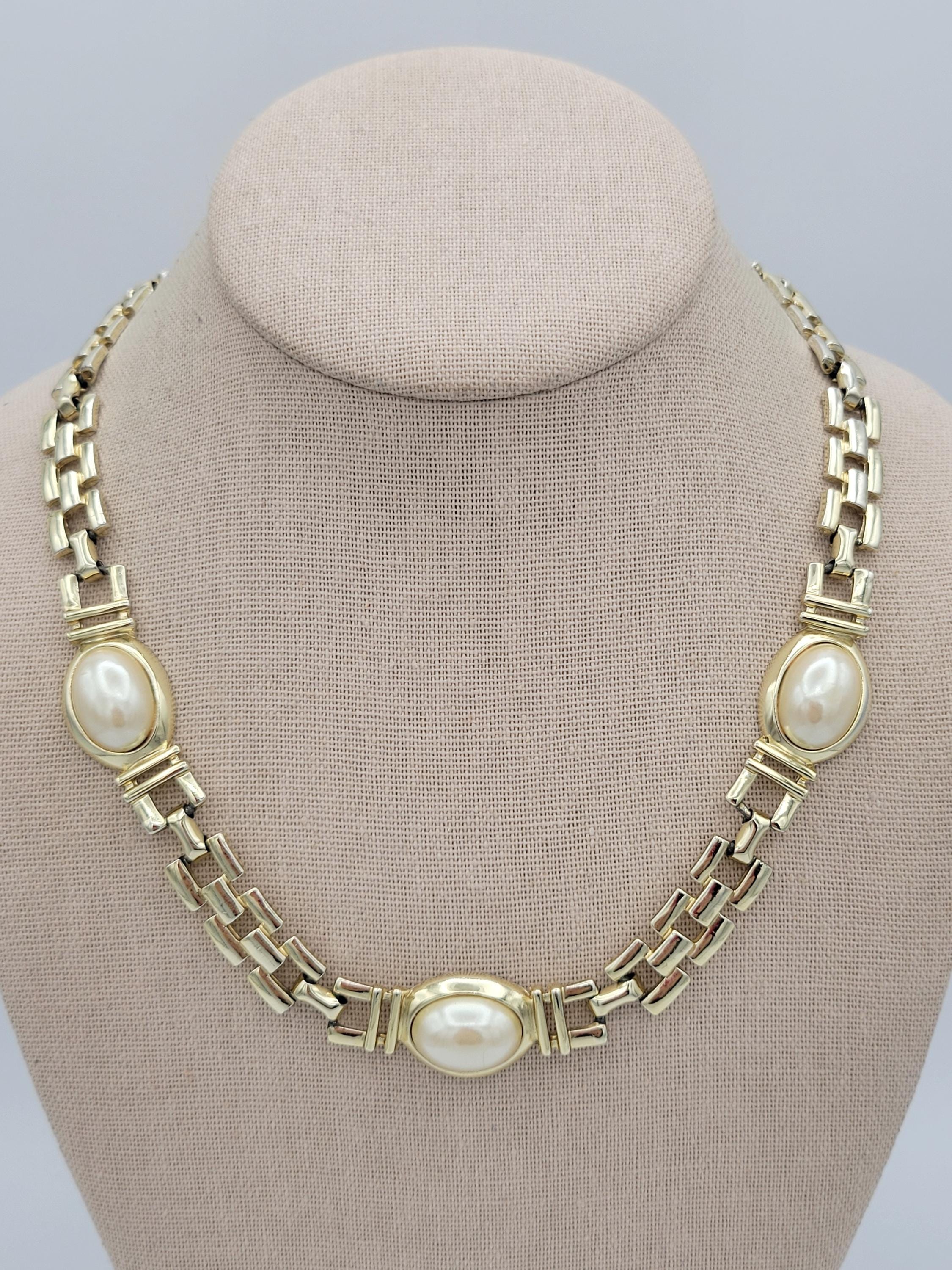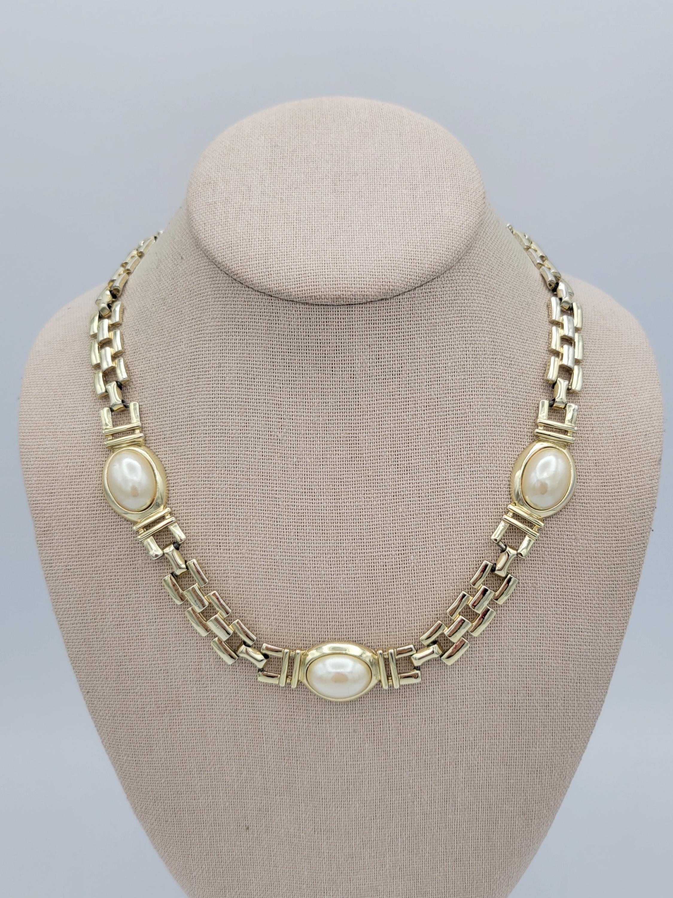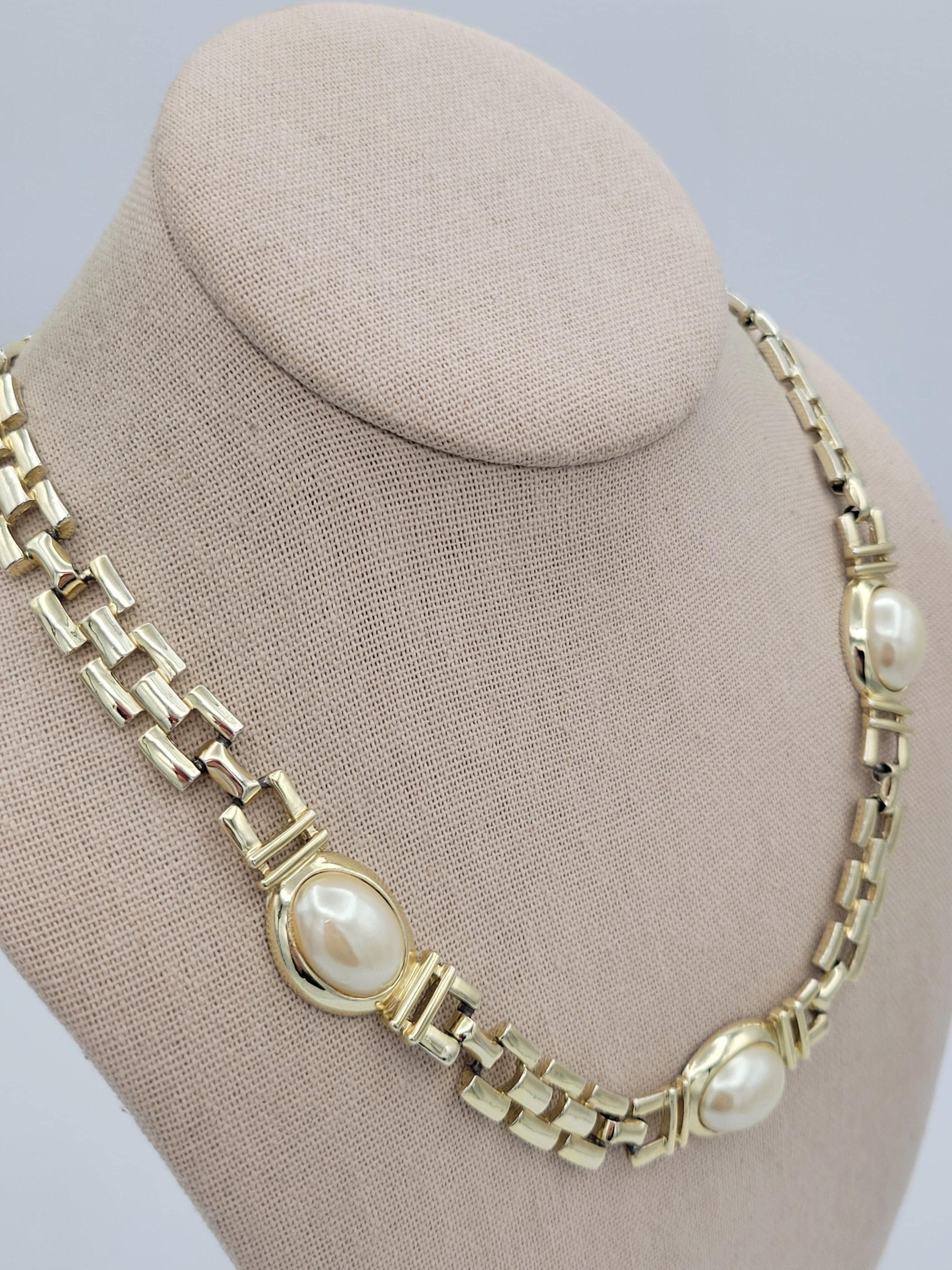 This shining necklace will make substantial statement piece. The necklace is made of shining gold-tone links of openwork chain that resemble some watch bands. There are 3 links with large ivory-colored faux pearl cabochons in the center. The necklace secures with a snap lock clasp. This piece is in excellent, like-new condition.