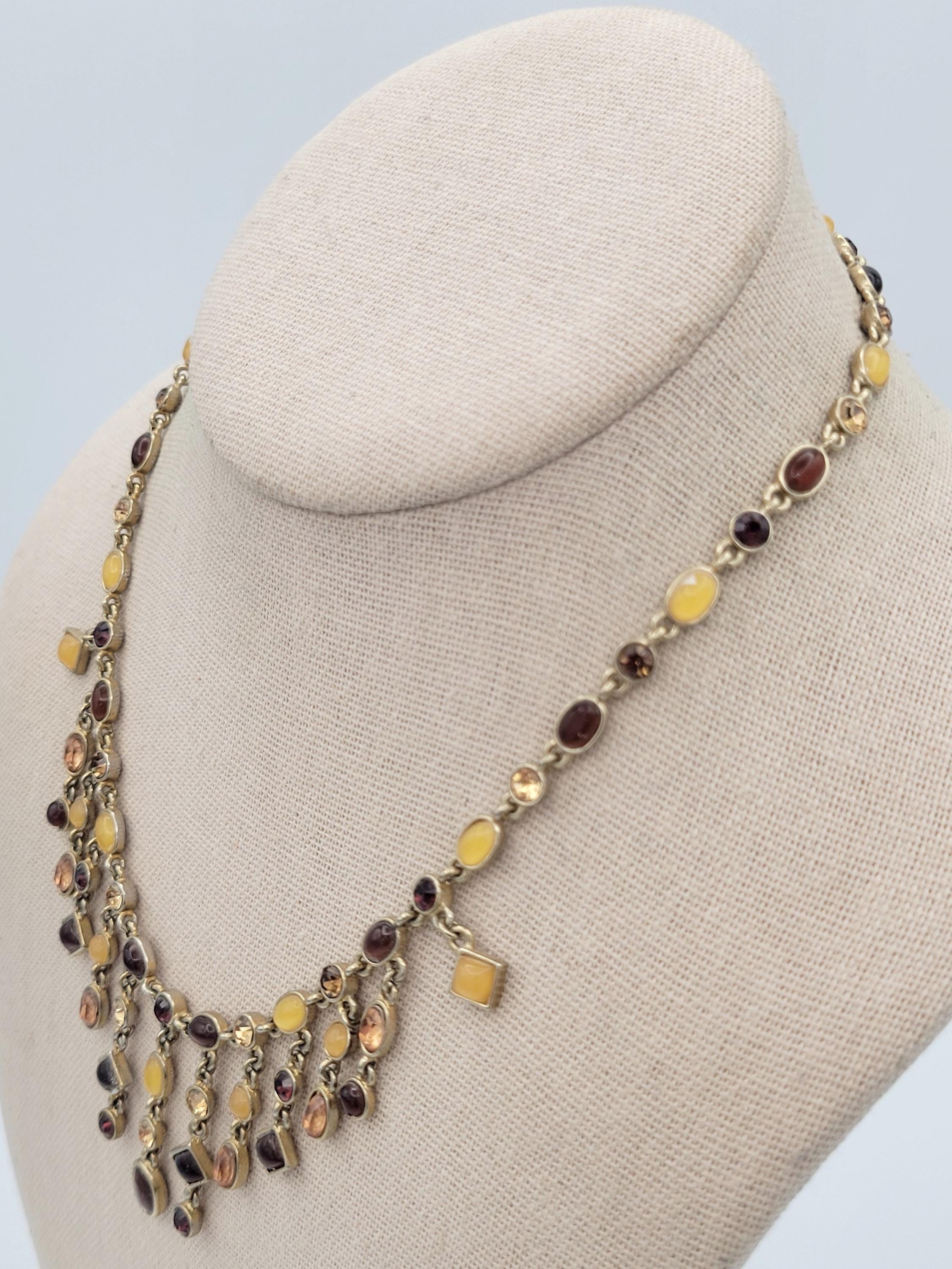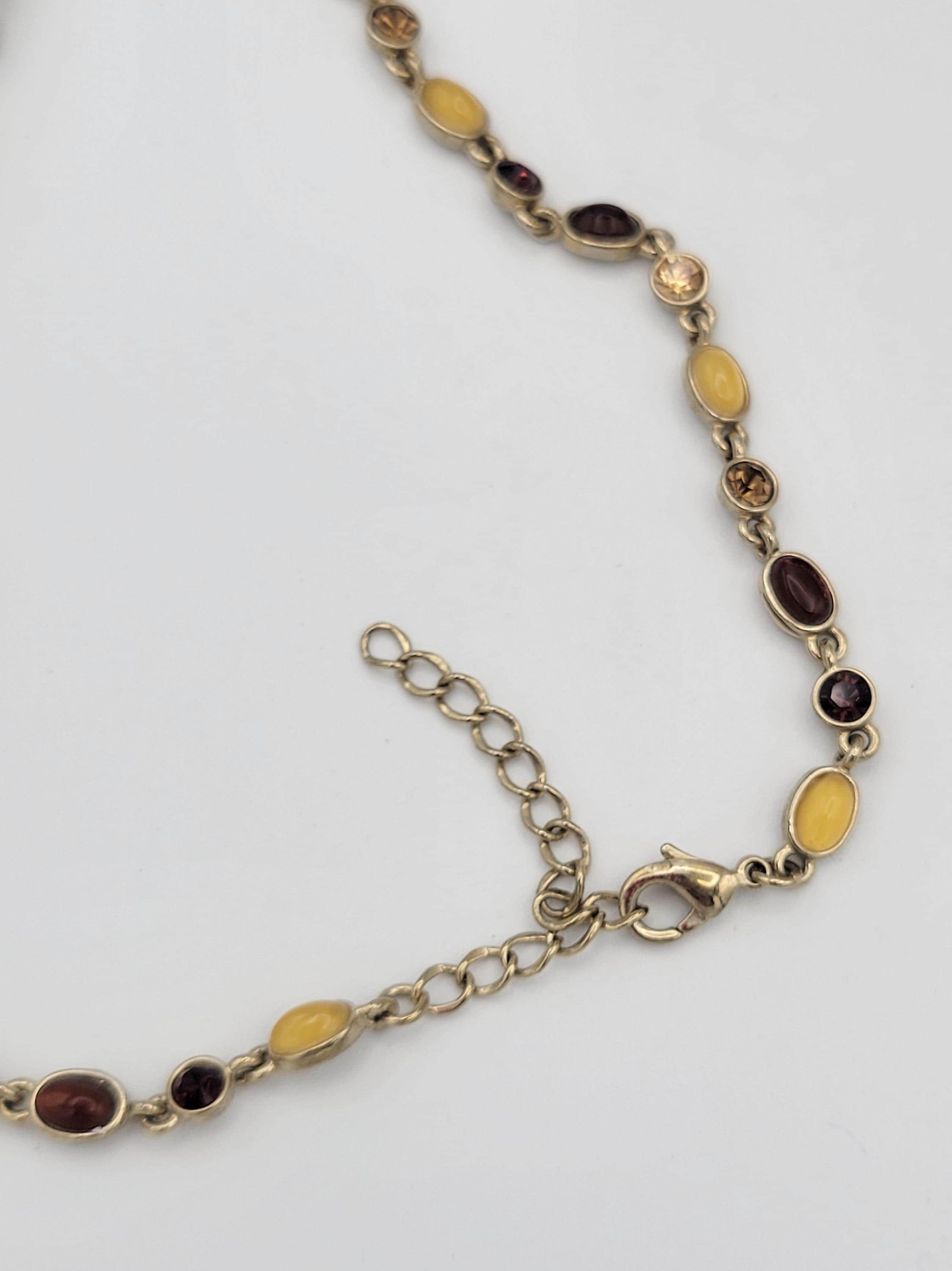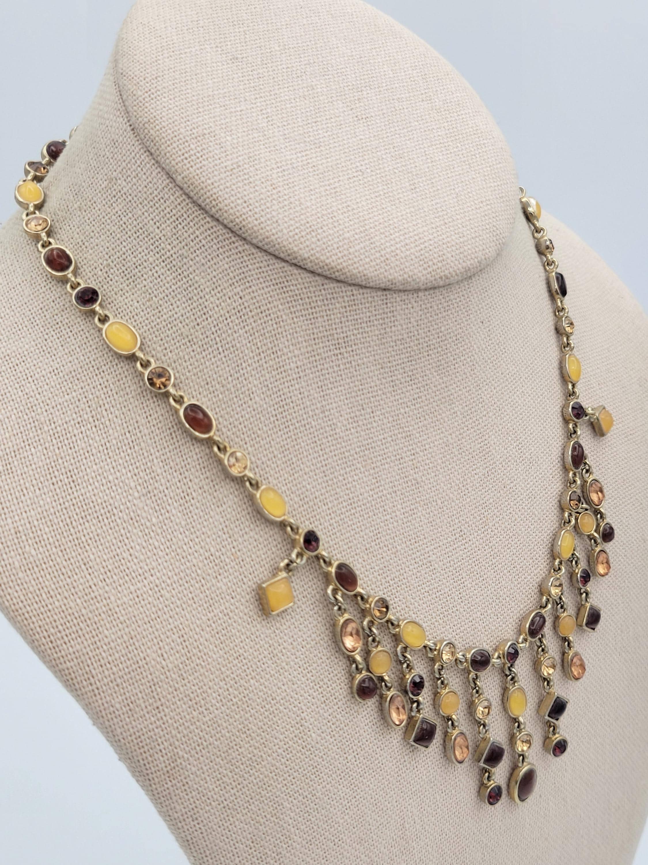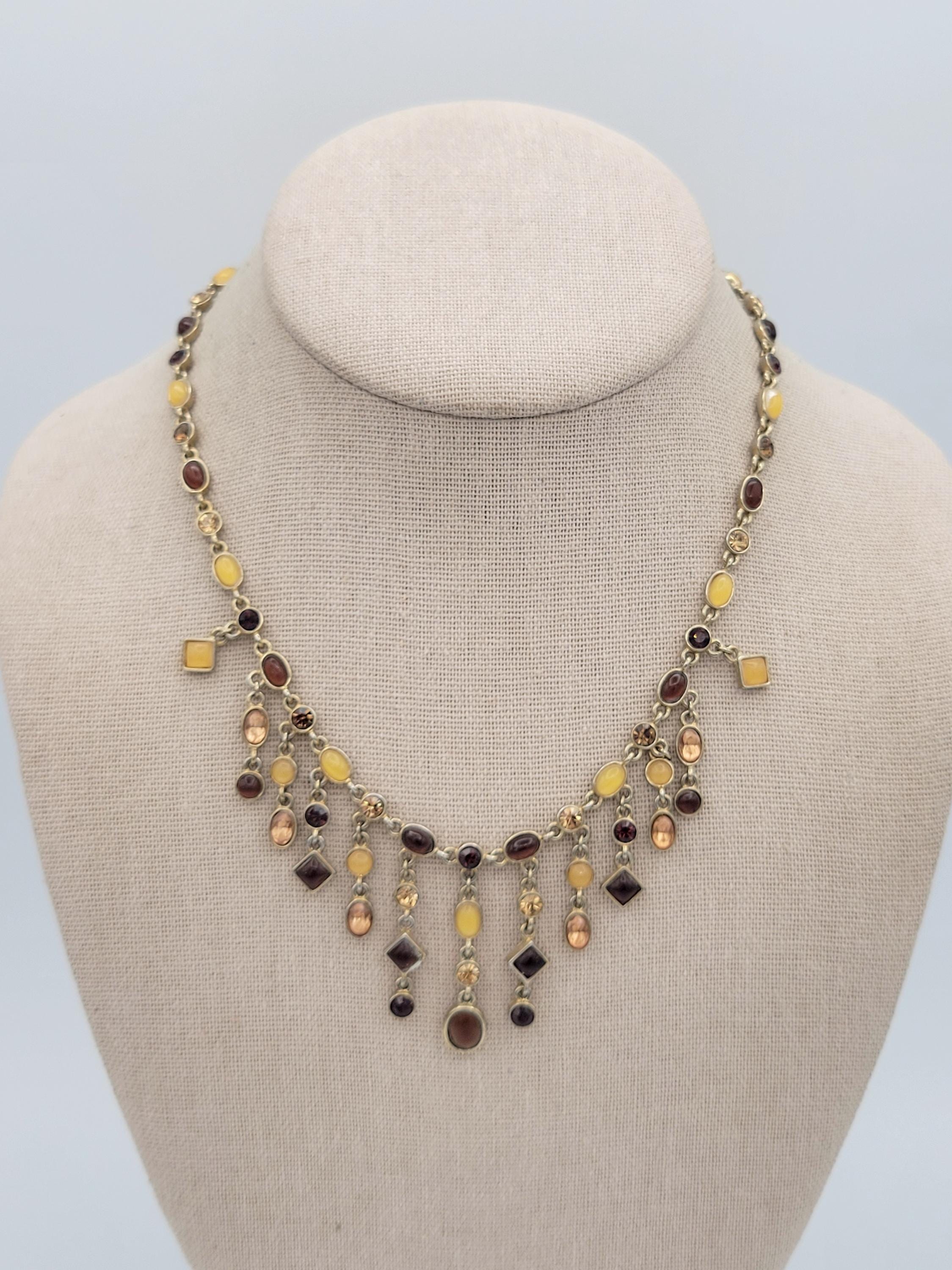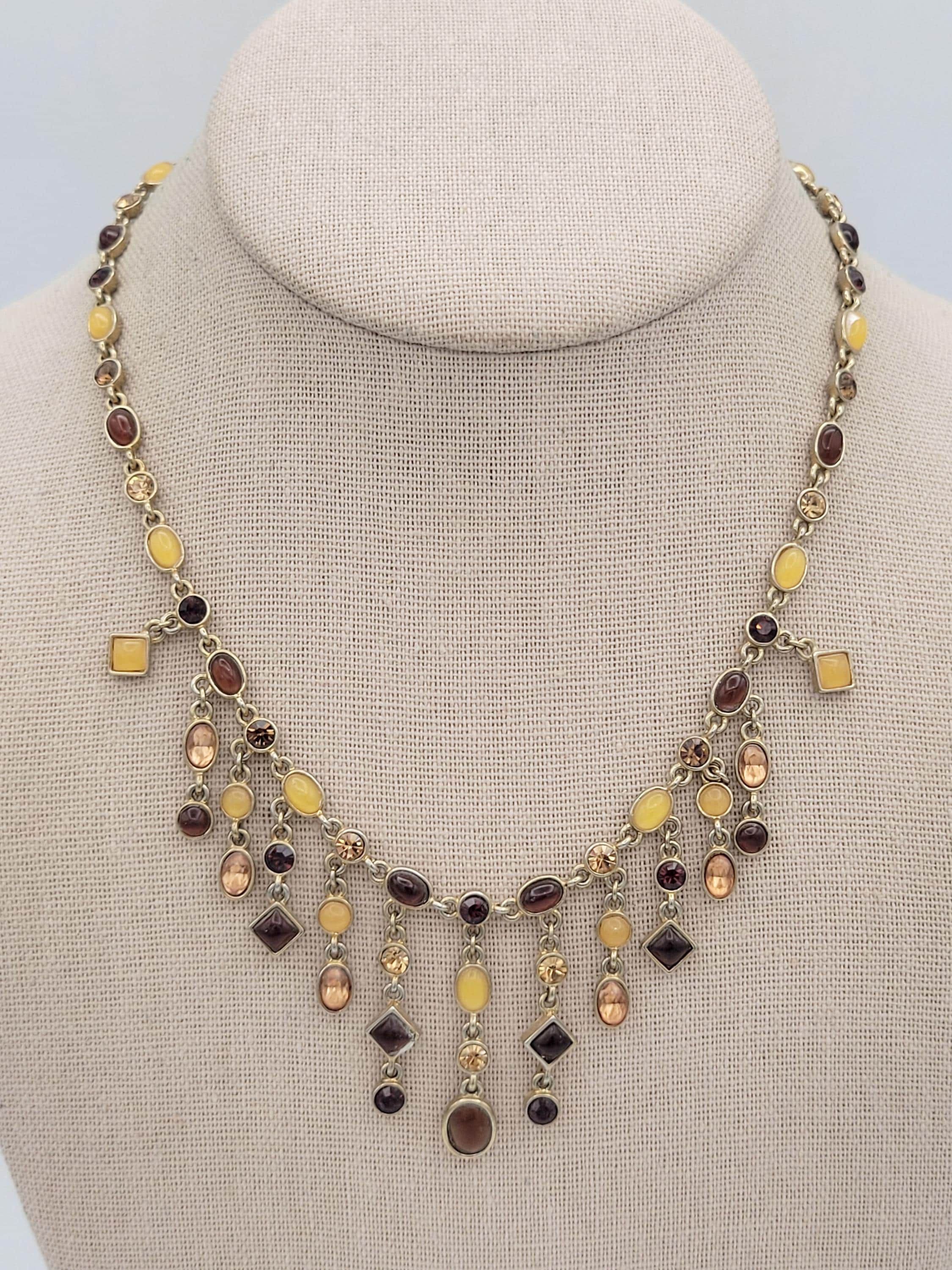 This eye-catching necklace makes a great statement piece! The necklace is made up of many gold-tone links that are accented with square, round or oval-shaped rhinestones & cabochons. The stones & cabochons are in the colors of brown, orange, yellow & red. The necklace secures with a lobster claw clasp & is not adjustable for length. This piece is in excellent vintage condition with very little wear.