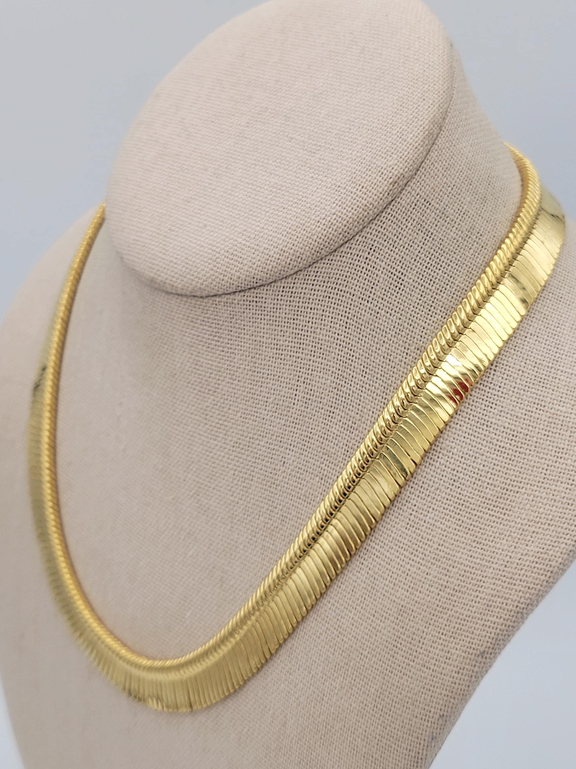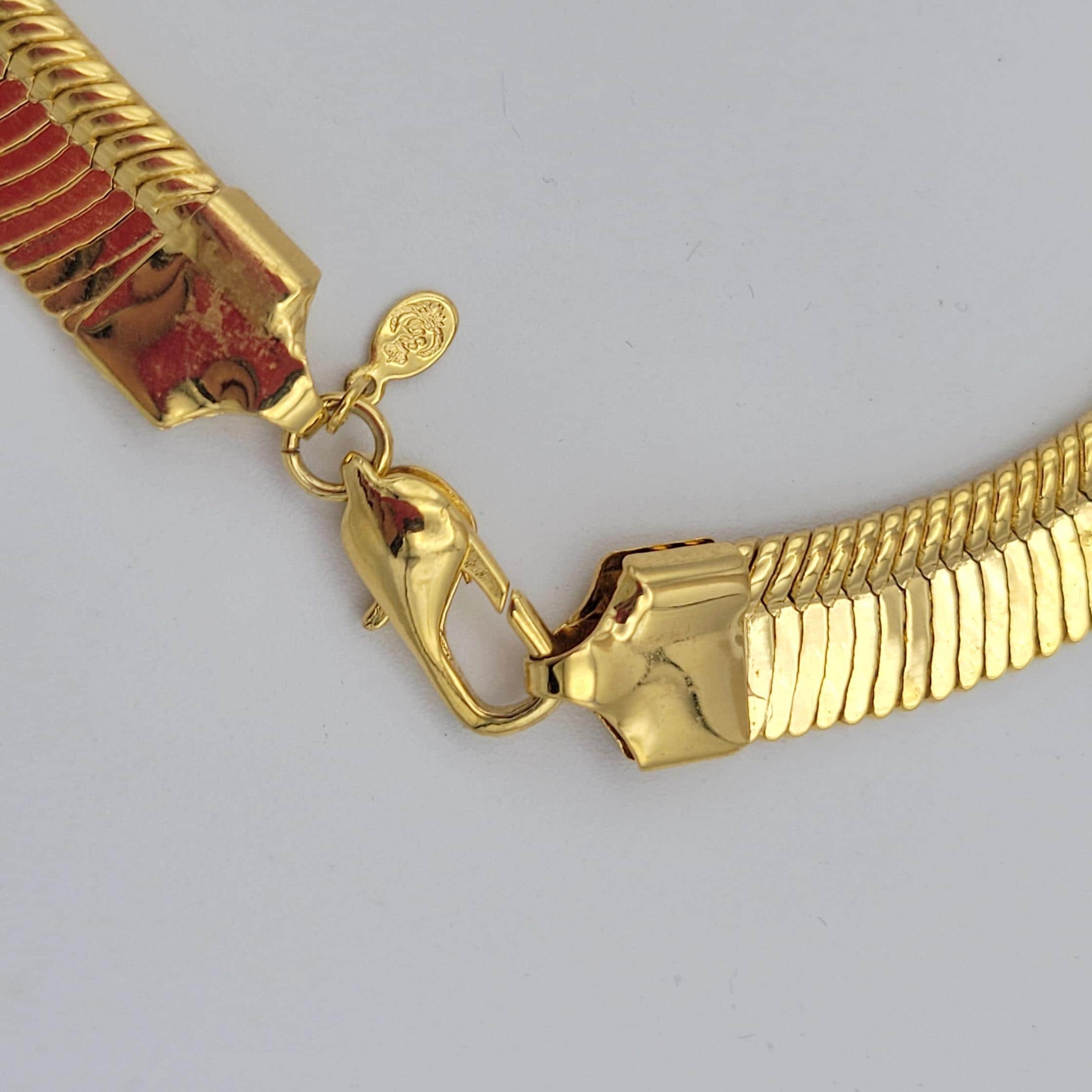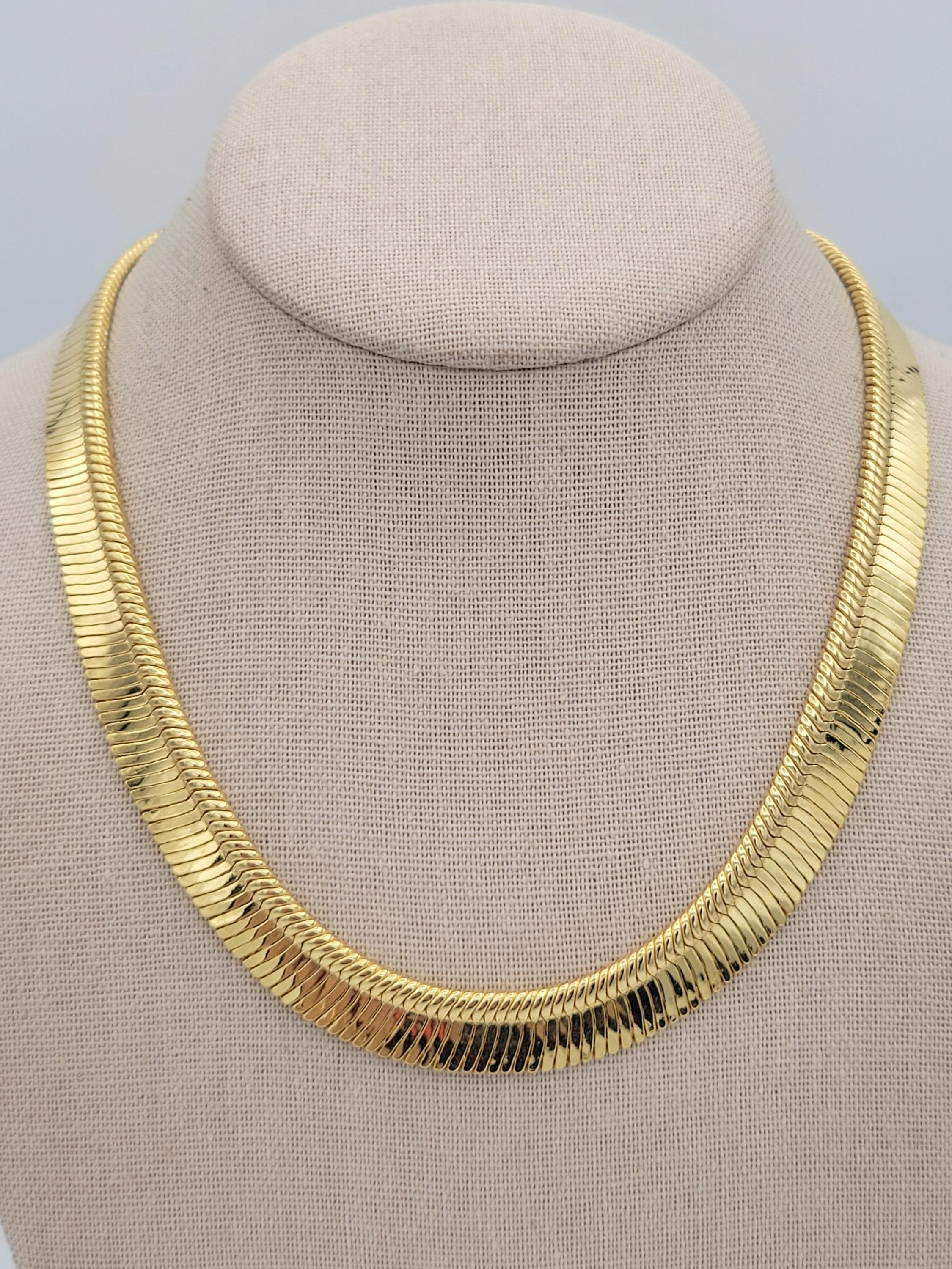 This shining chain necklace is a versatile addition to your jewelry wardrobe. The gold-tone chrome-finished chain has a herringbone pattern & is 1/2" wide. The chain secures with a lobster claw clasp & is in excellent, brand-new condition.