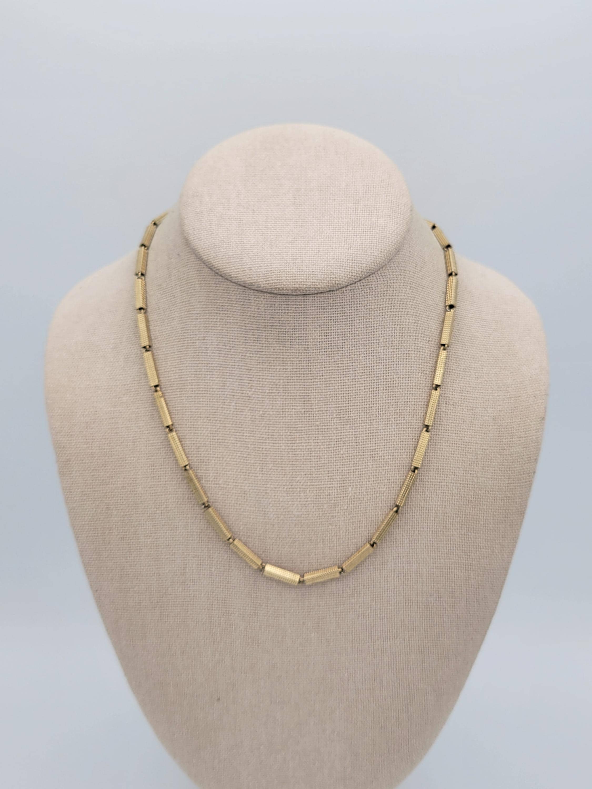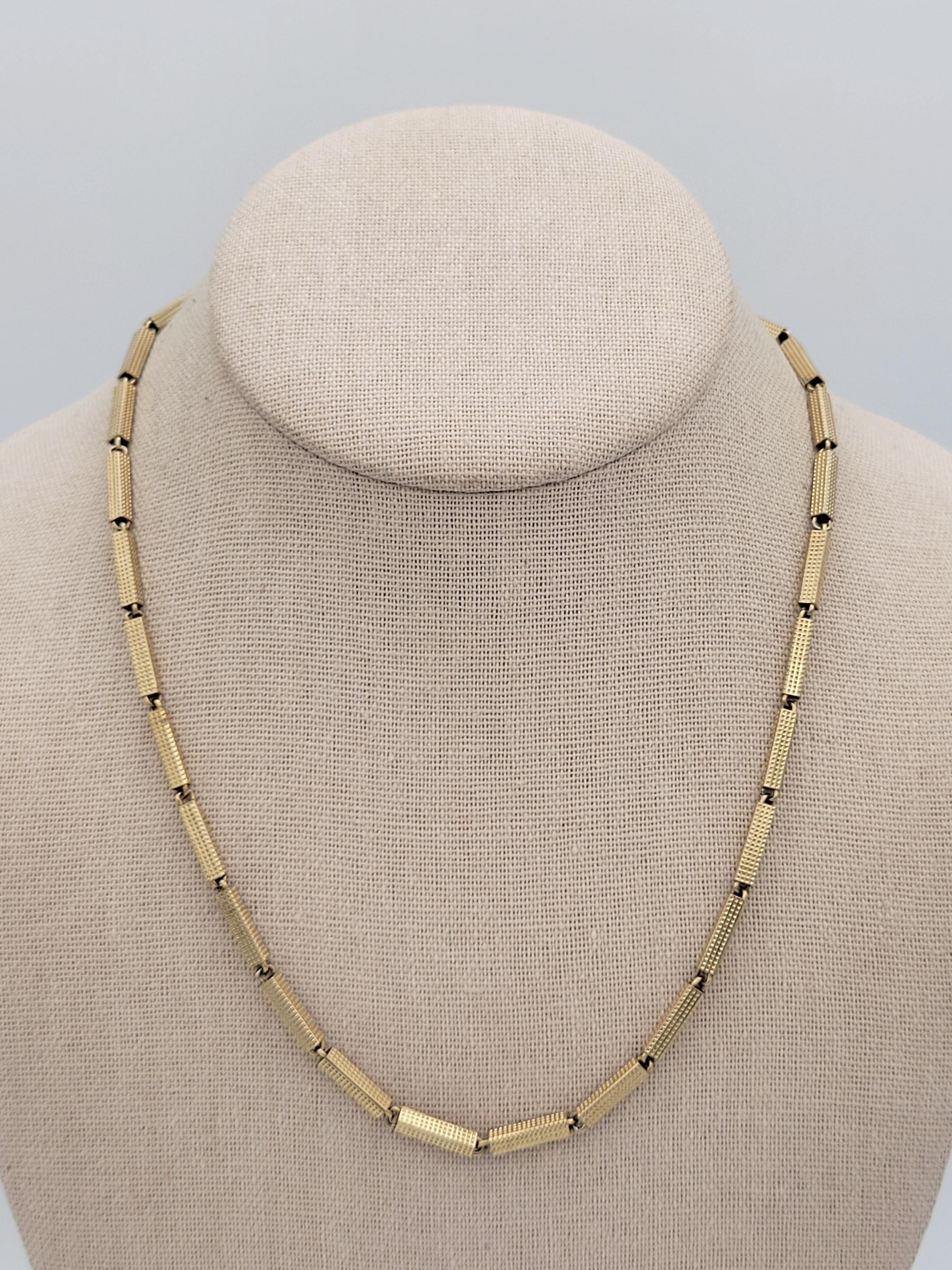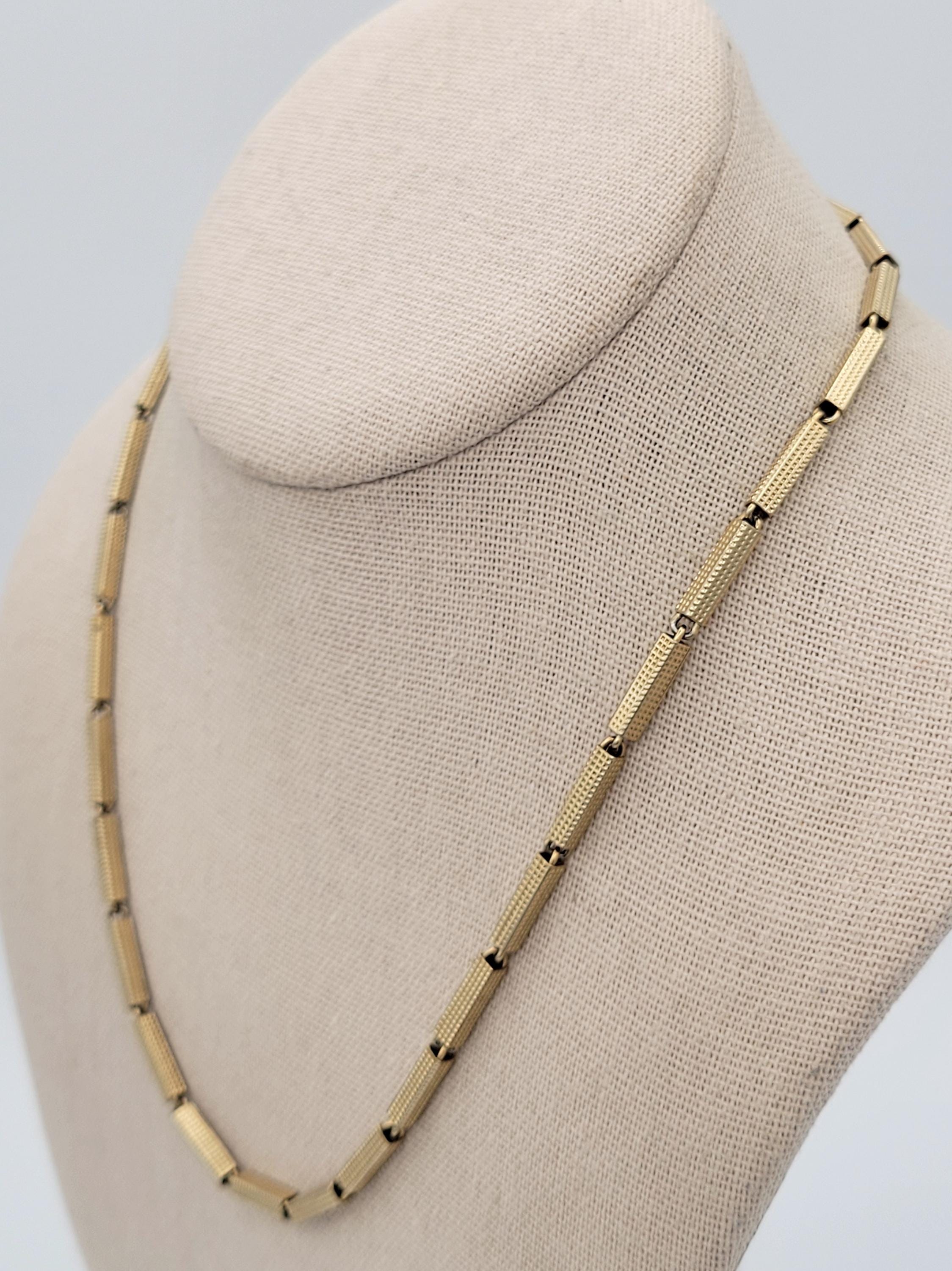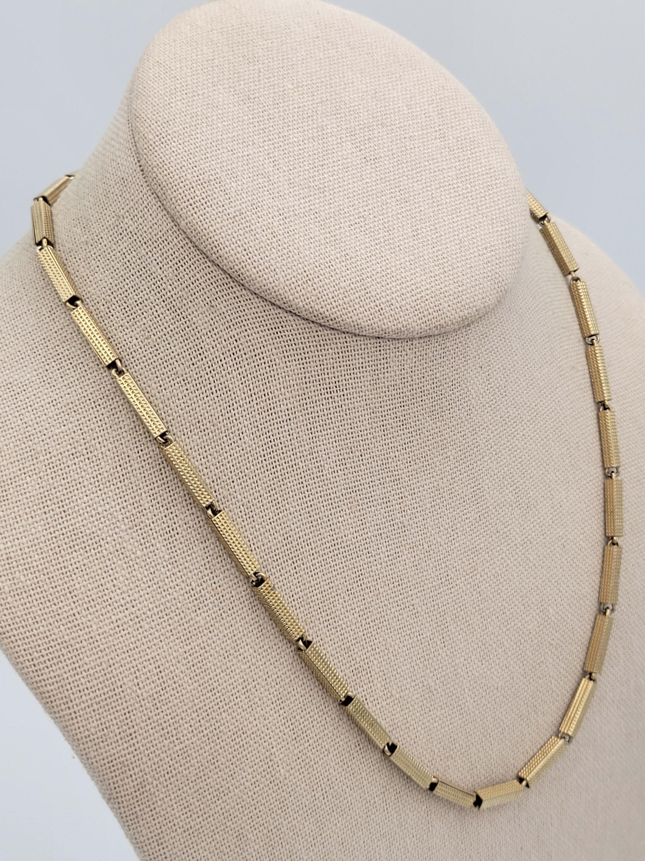 This unique chain necklace is a versatile addition to your jewelry wardrobe. The gold-tone chain is made from rectangular links that have texture on all 4 sides of the link. The piece secures with a spring-ring clasp. This necklace is in great vintage condition with a small amount of wear. It may need cleaning.