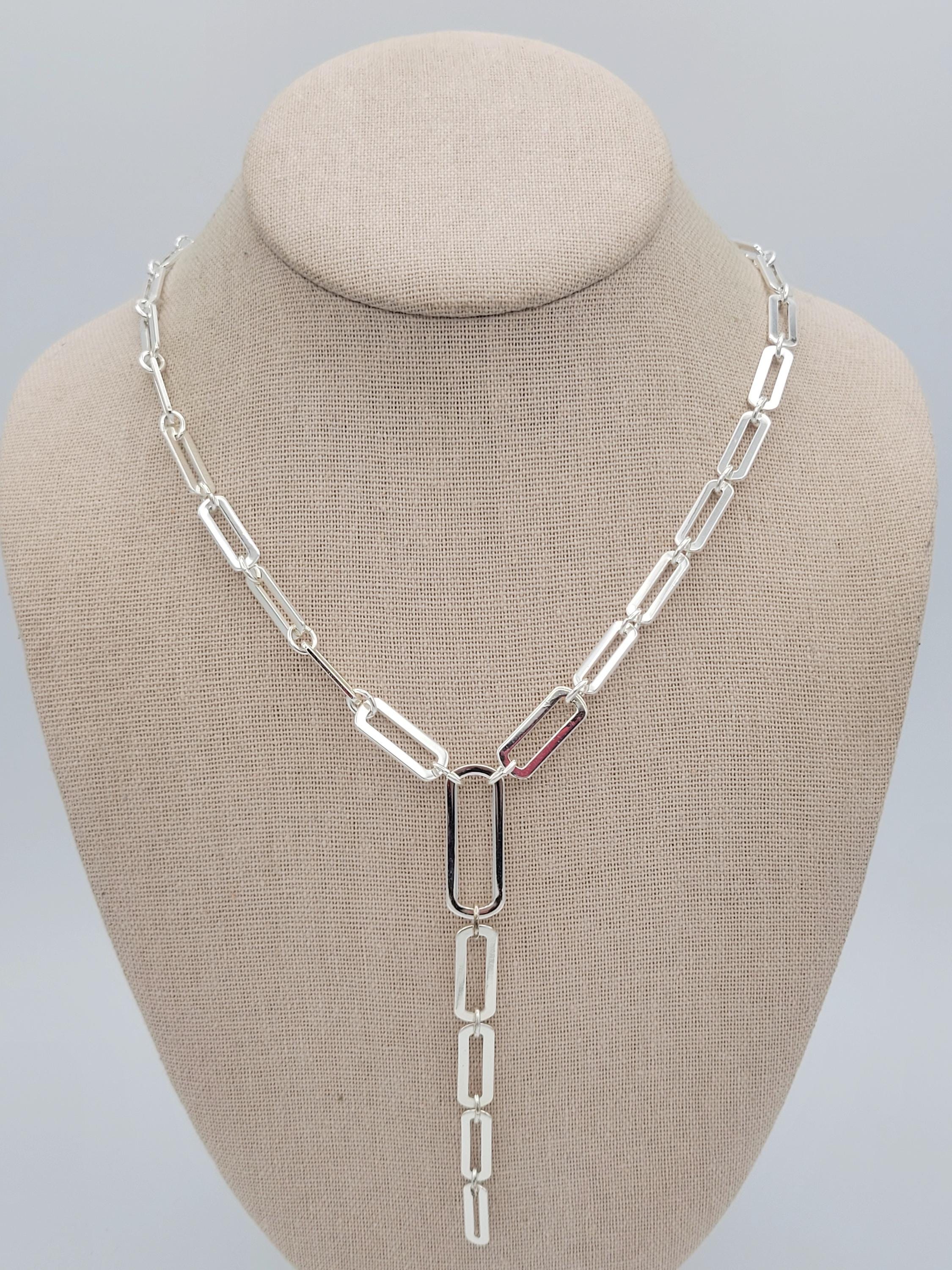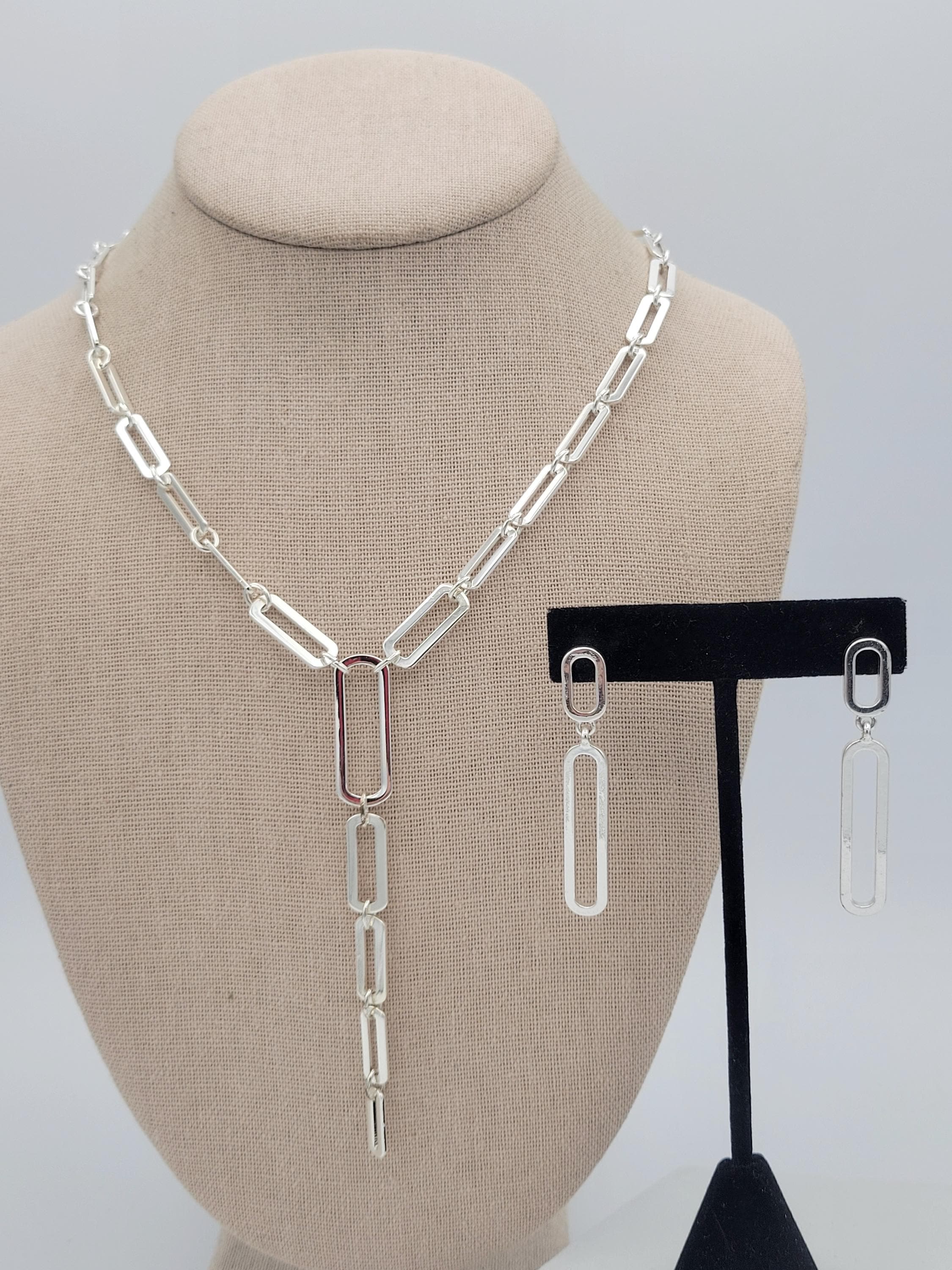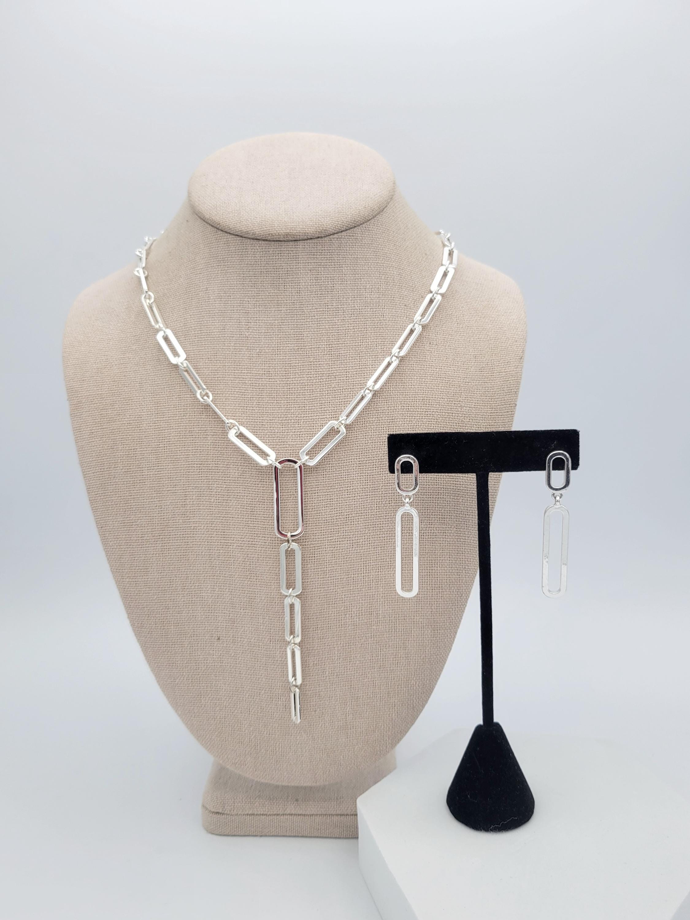 This shining jewelry set makes great statement pieces to add to your jewelry wardrobe. All 3 pieces are made with silver-tone openwork oval links that have a chrome finish. The Y-necklace secures with a lobster claw clasp & is adjustable for length. This set is in excellent, brand-new condition.