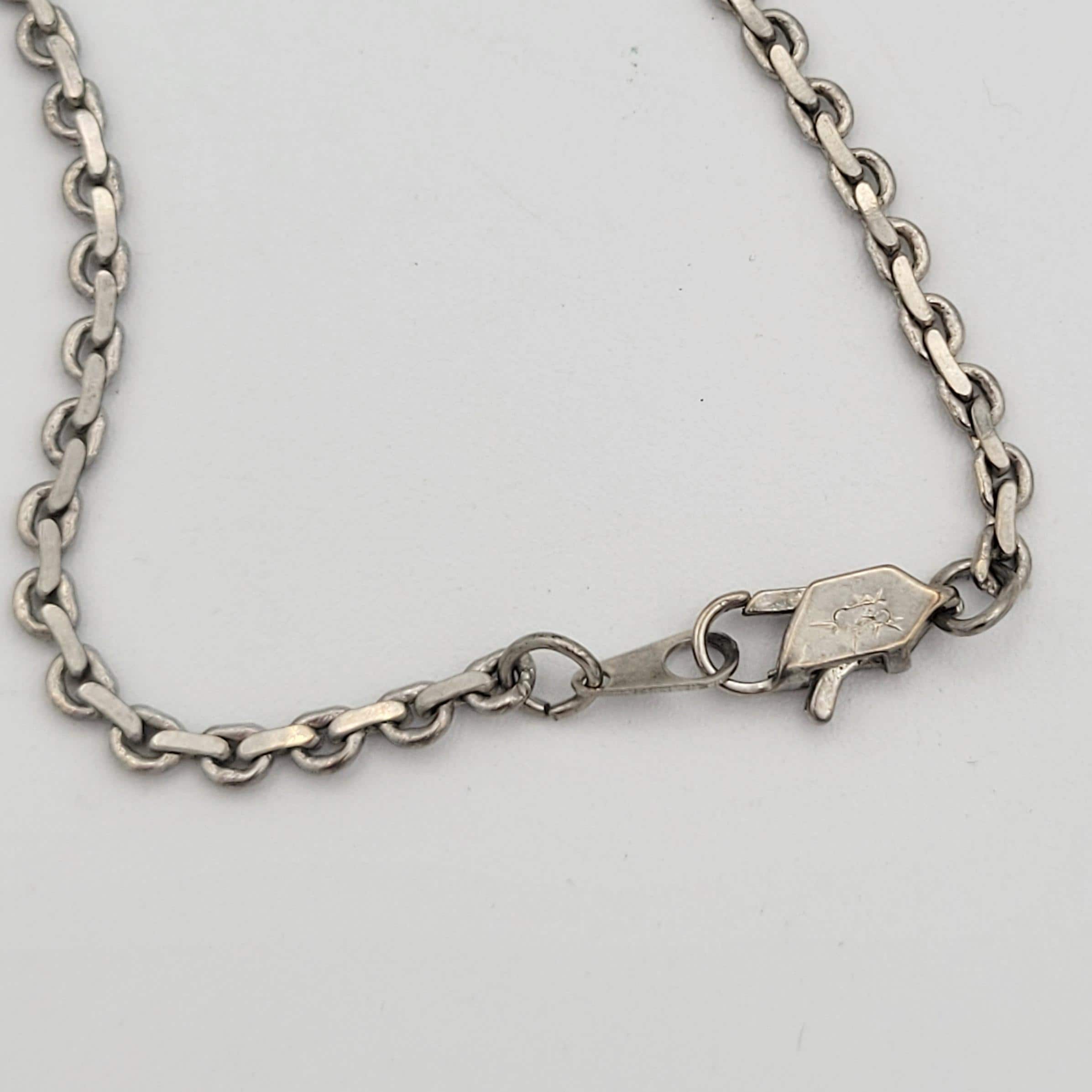 This unique statement piece has a great retro look! The silver-tone flattened cable chain secures with a lobster claw clasp & is made of sterling silver. The bib of the necklace features several small silver curb chains that form a drape across the chest. This piece is in excellent vintage condition with very little wear.