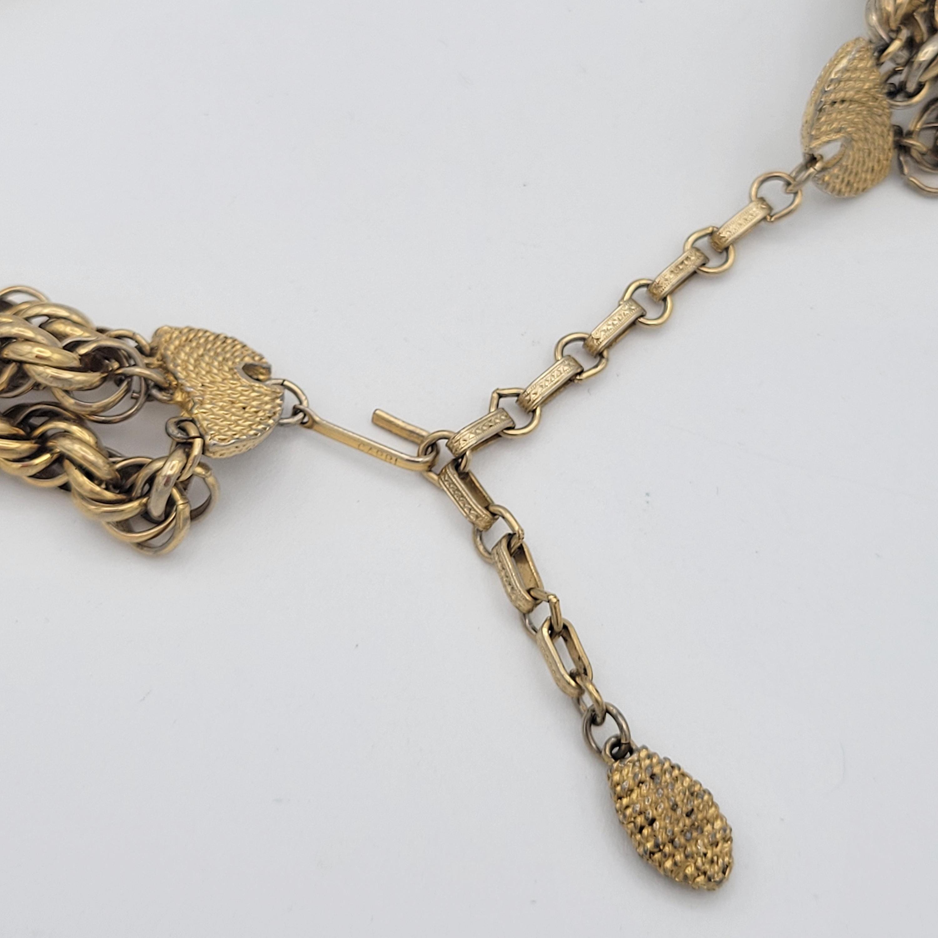 This unique statement piece has a great retro look! The chunky gold-tone rope chains are affixed to textured endcaps. The necklace secures with a hook clasp & is adjustable for length. The necklace is made of 3 of the chunky chains & is in excellent vintage condition. The necklace has very little wear.