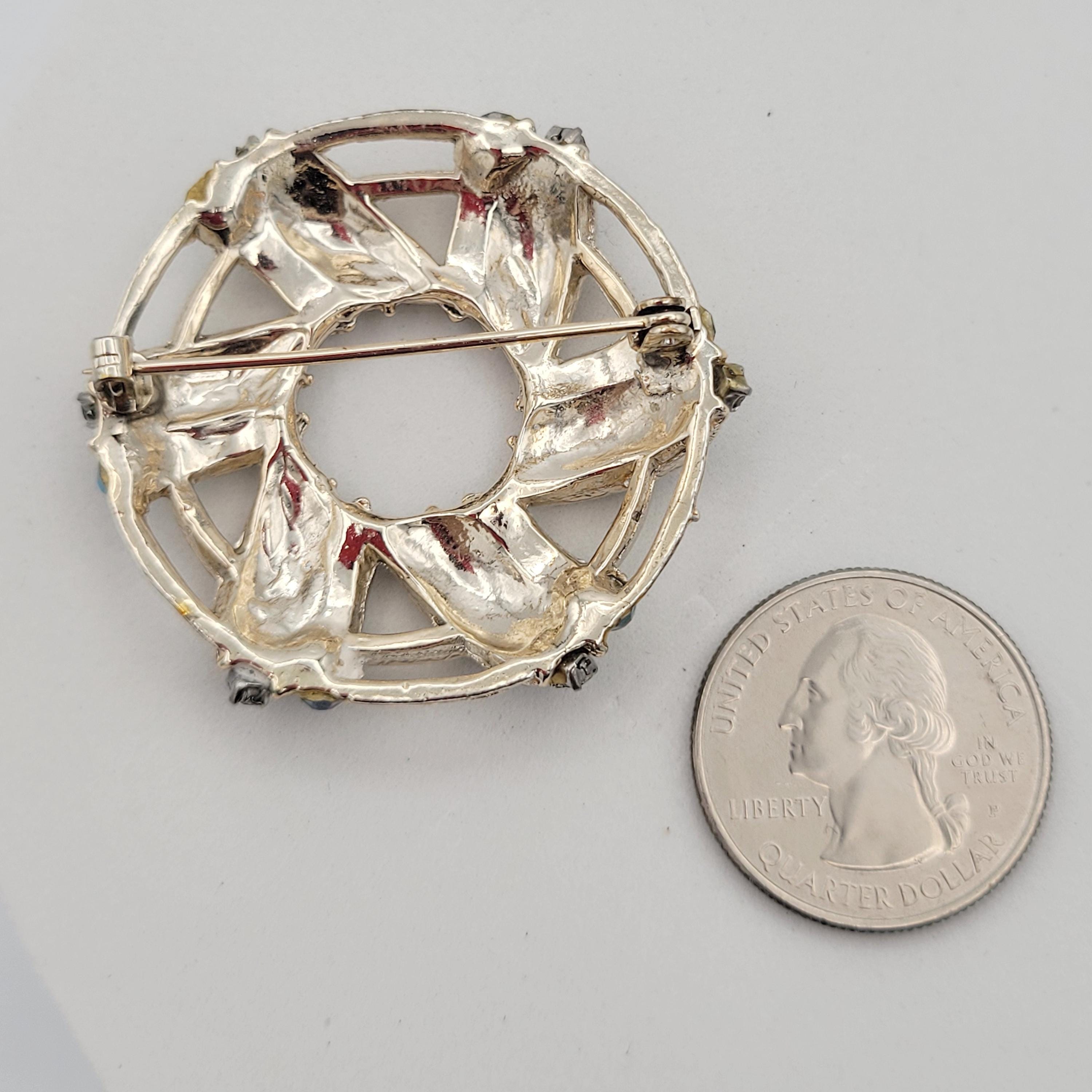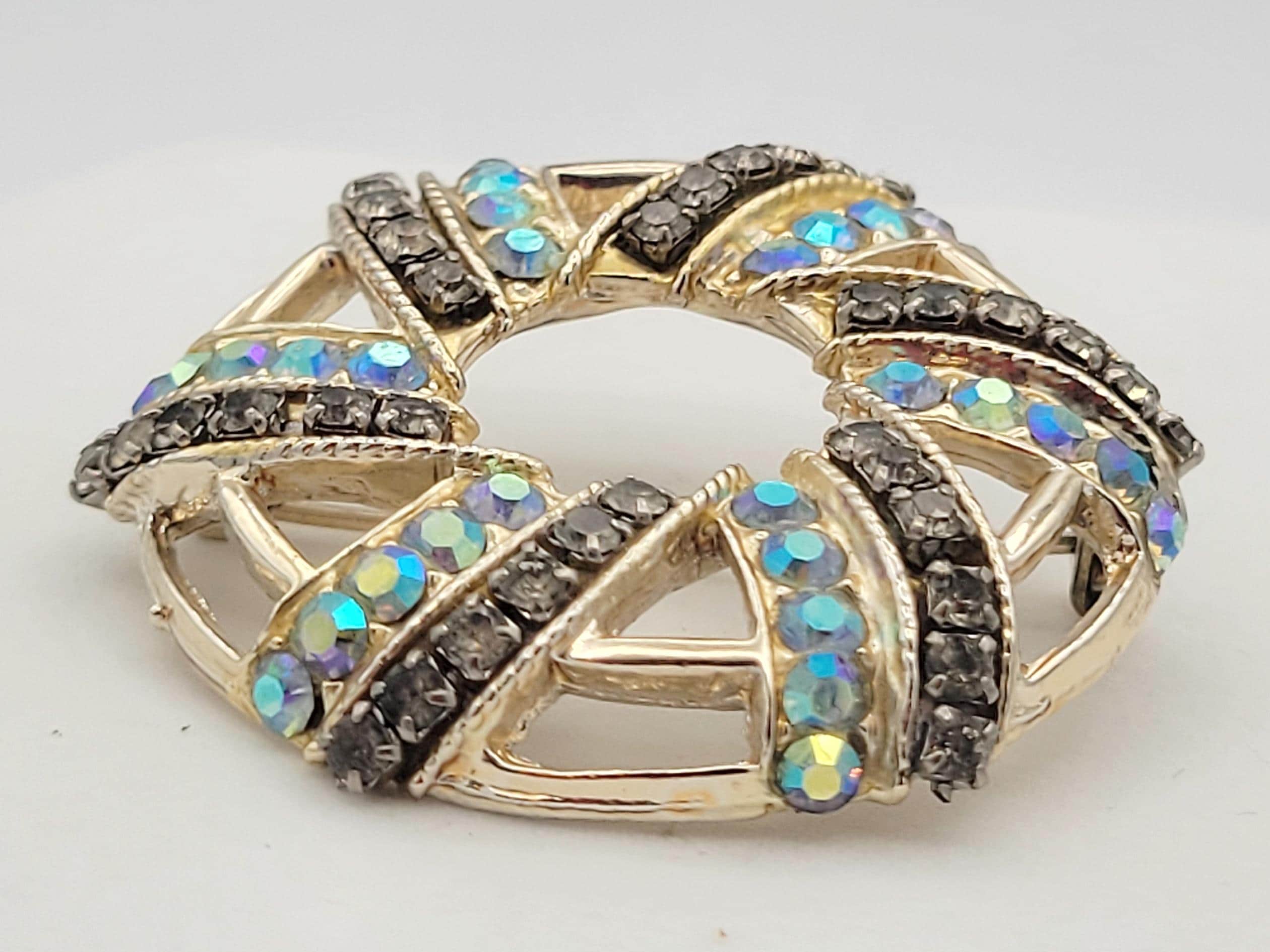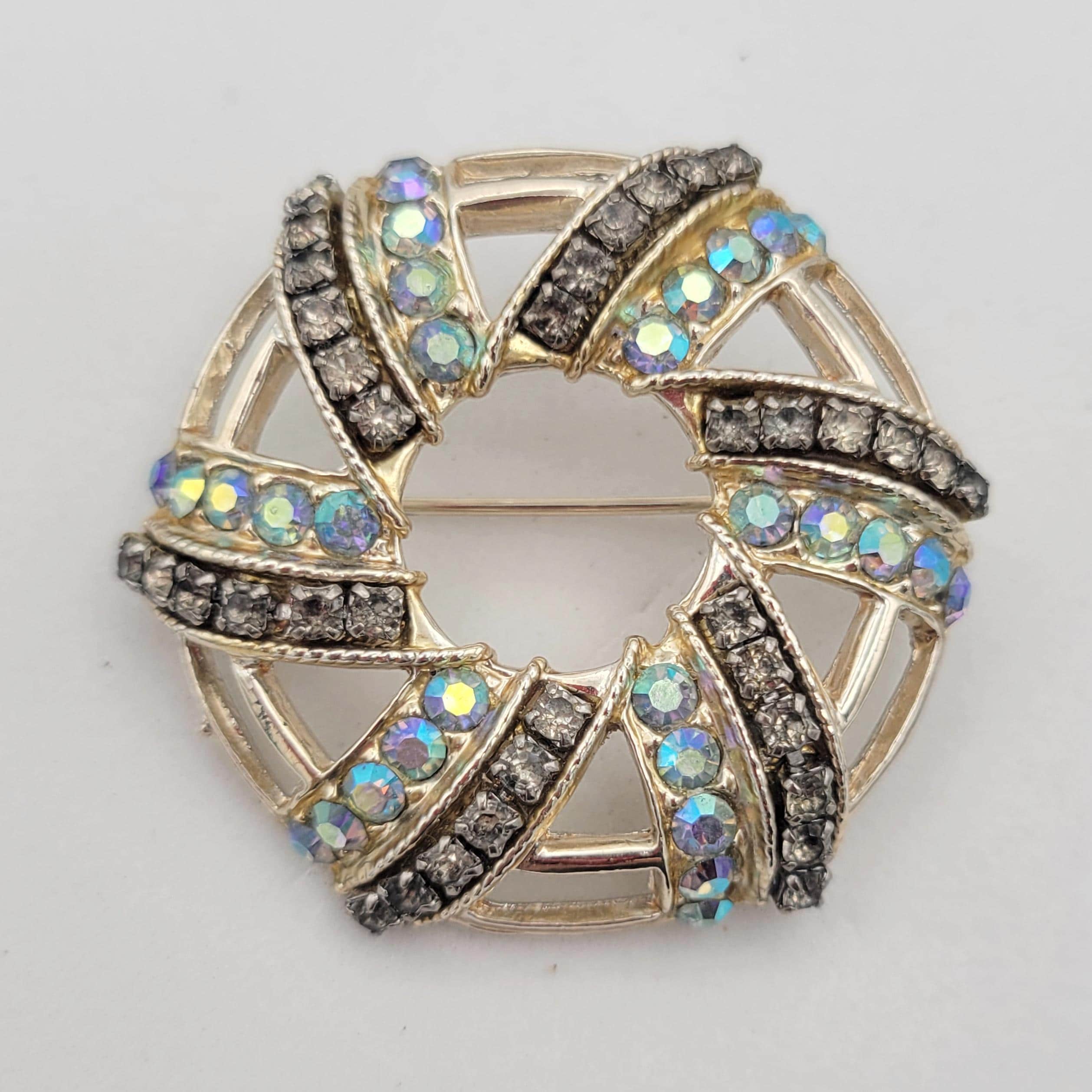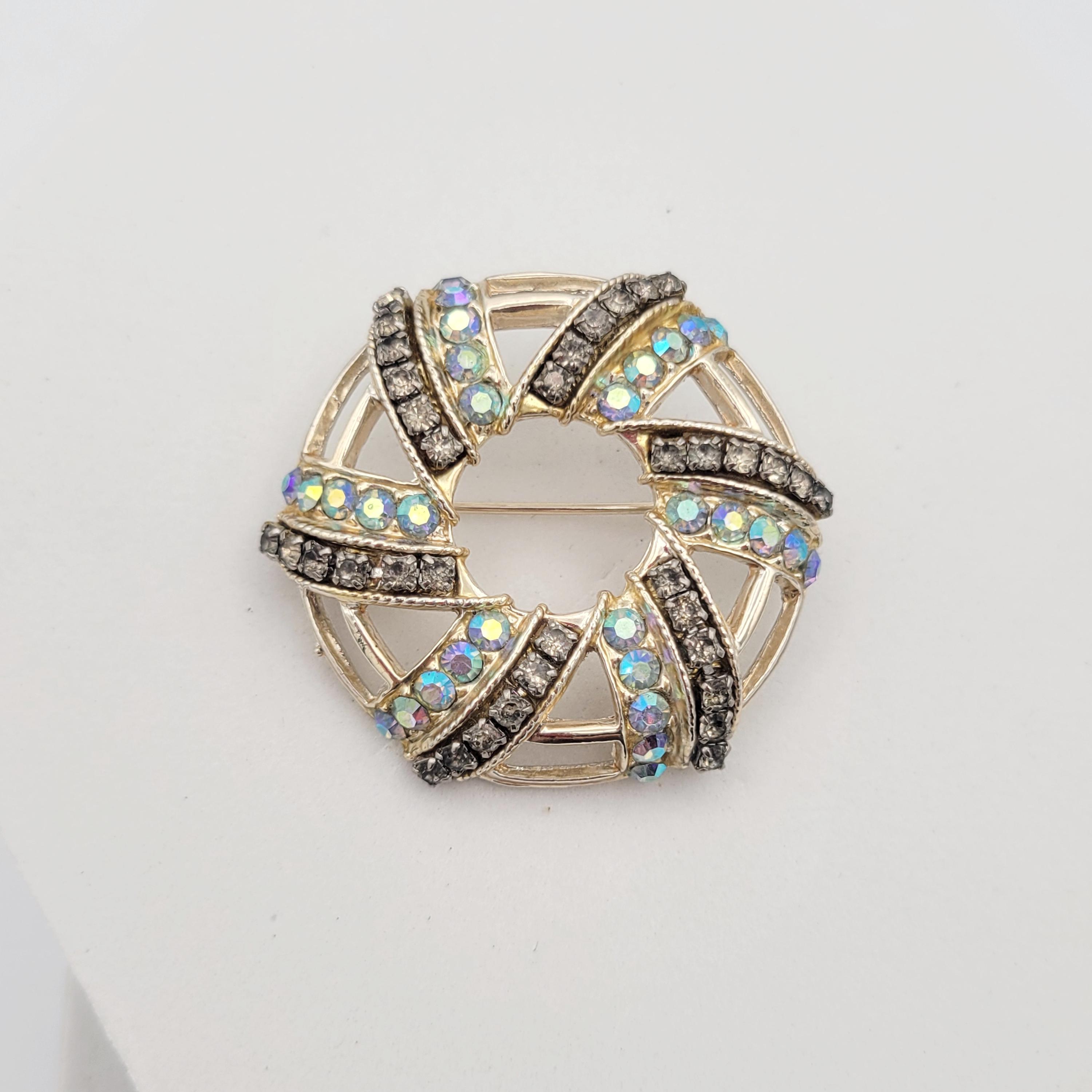 This shining brooch makes a great statement piece. The gold-tone brooch forms an openwork circle with a pinwheel design. There are alternating rows of rhinestones - clear with black enamel background & then bluish iridescent stones. This piece is in excellent vintage condition with very little wear.