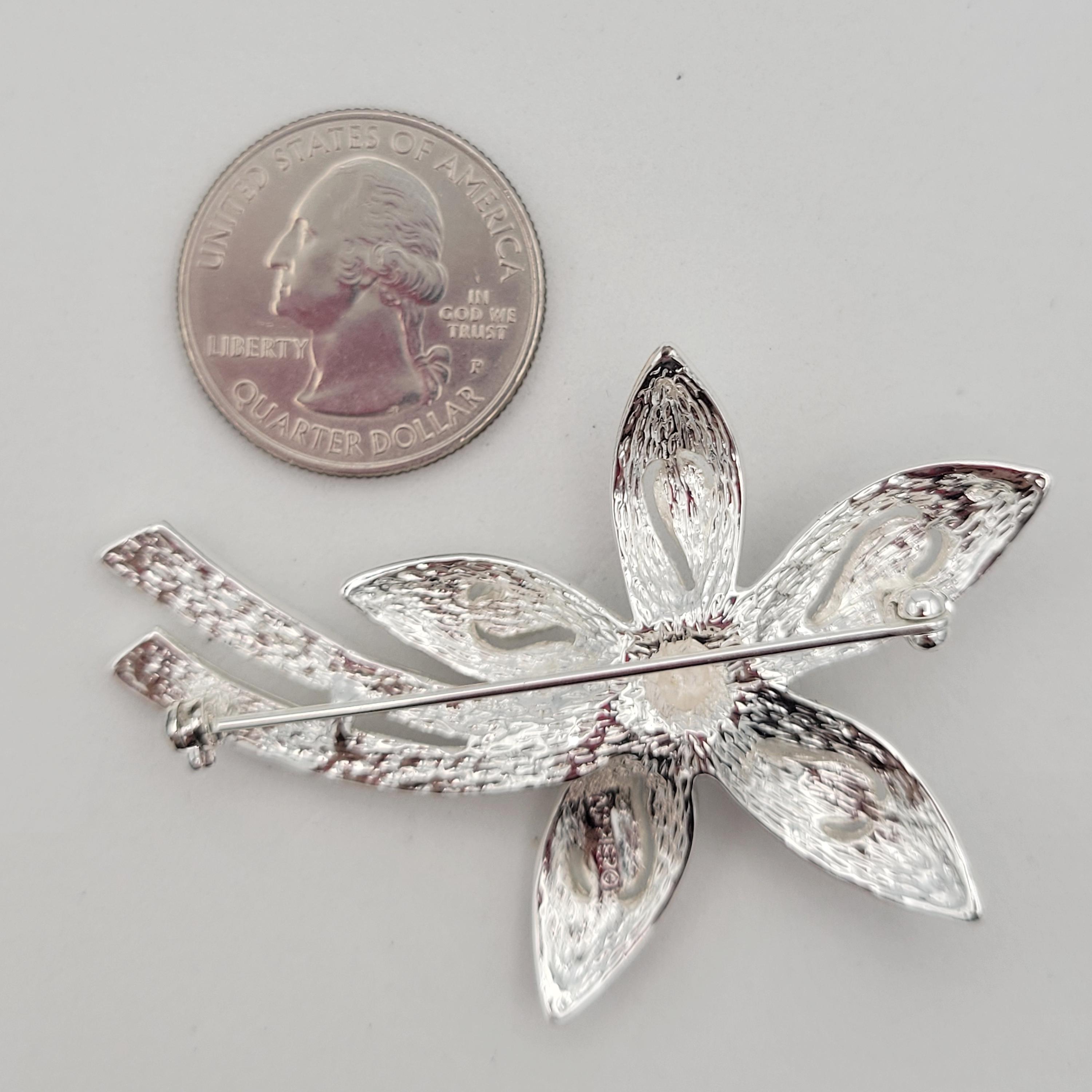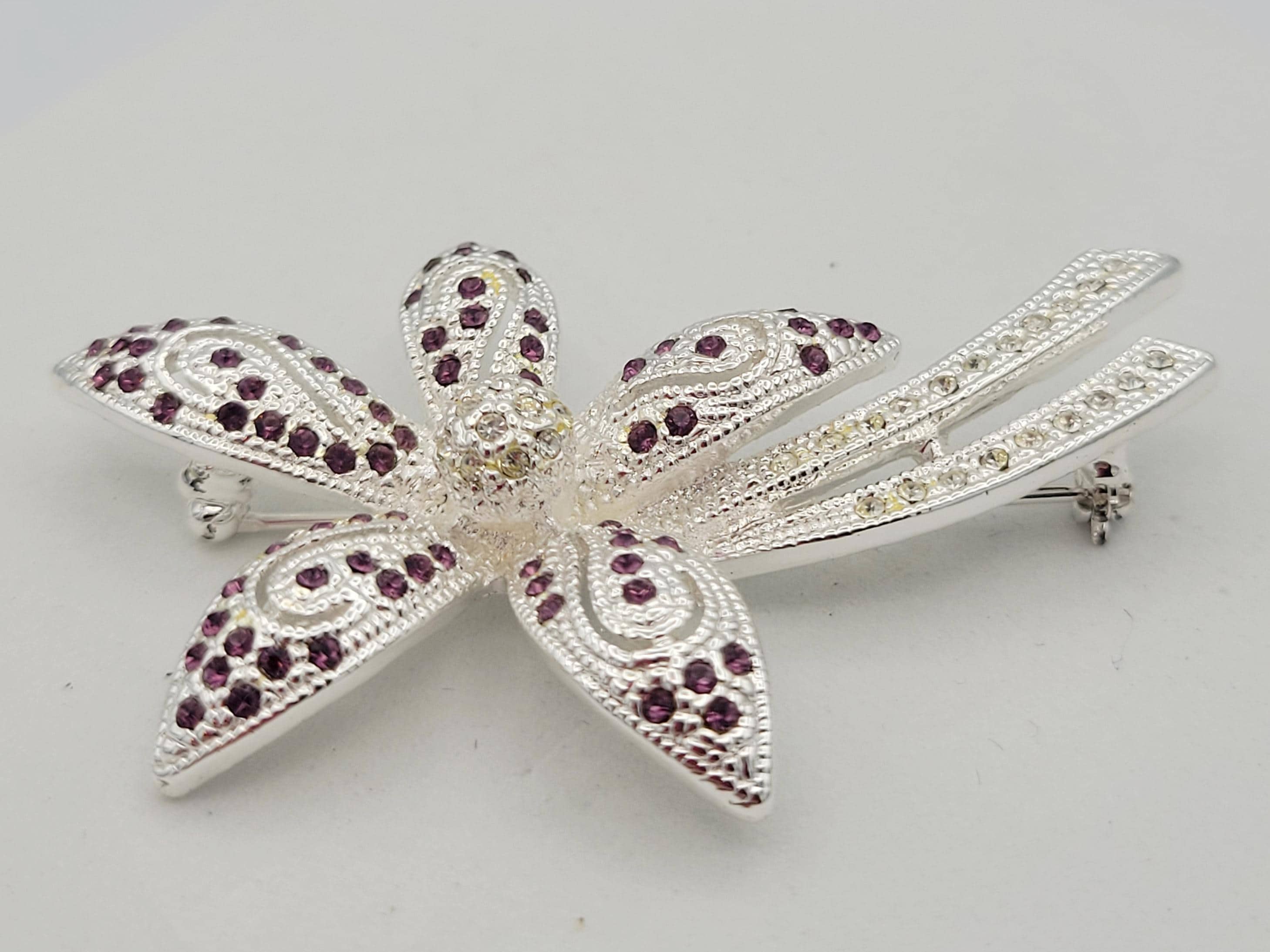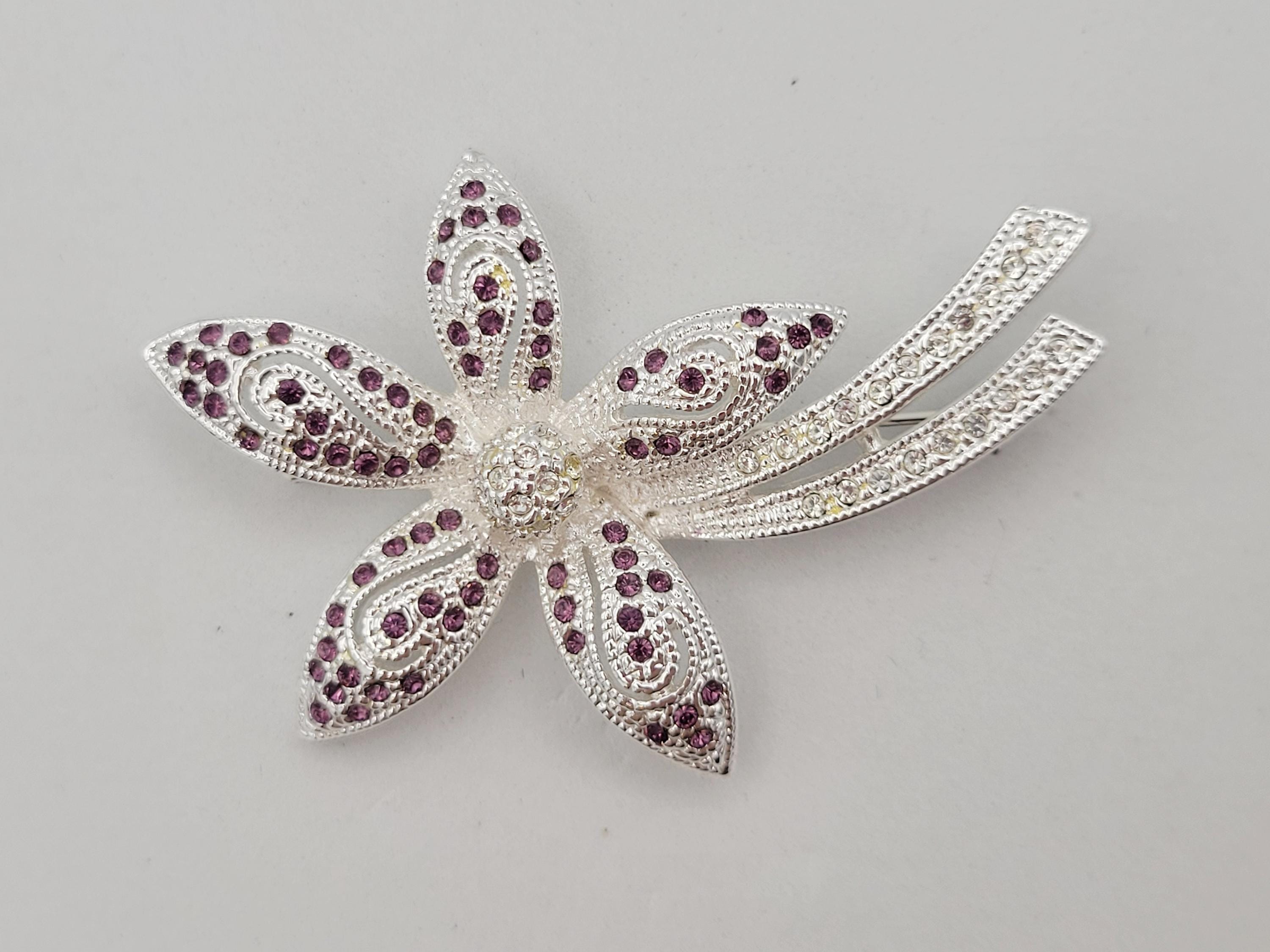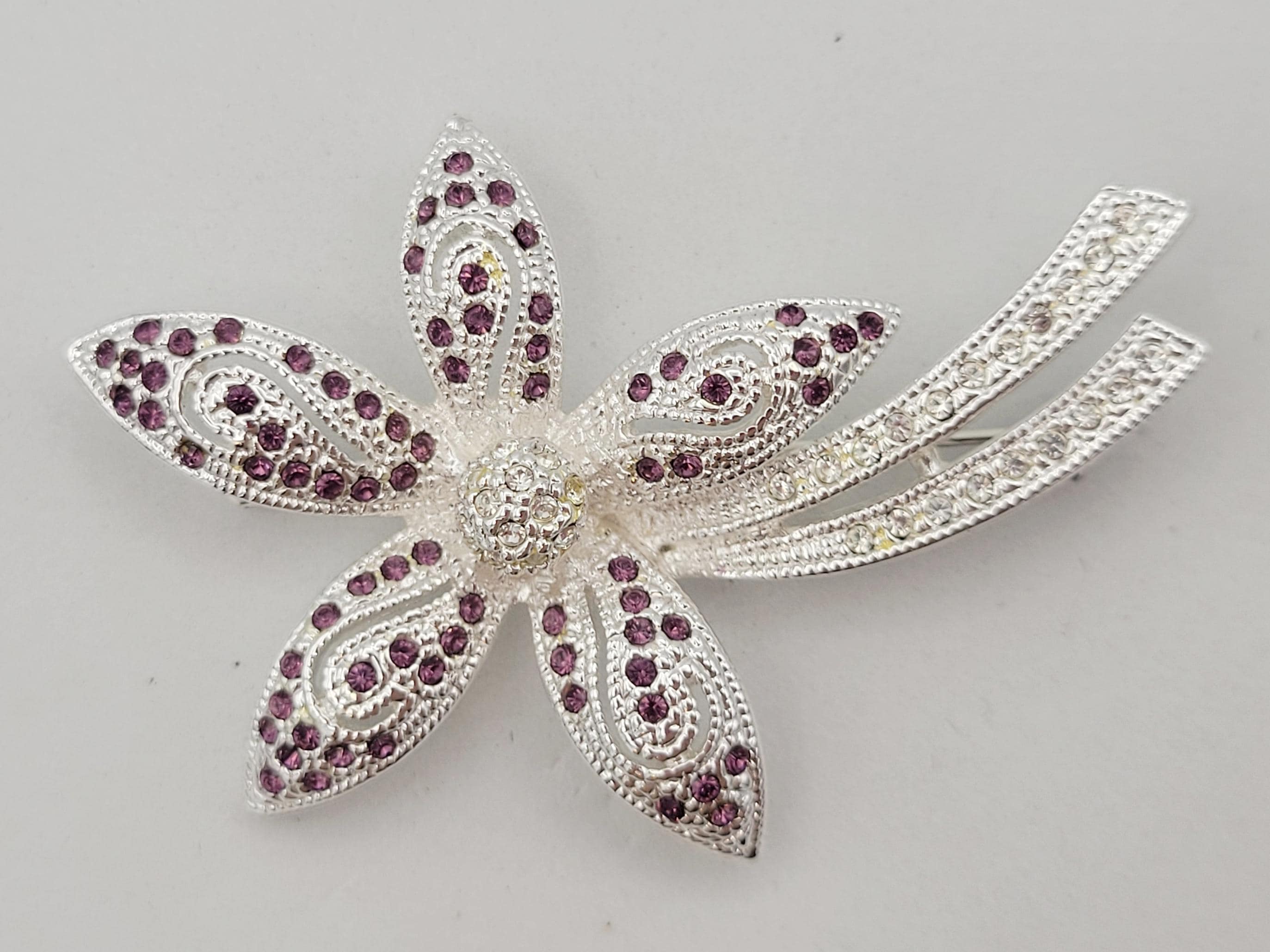 This sparkling piece is sure to get noticed! This brooch is made from textured silver-tone metal & forms a beautiful floral shape. The petals are dotted with small purple crystals while the center & stems are dotted with clear crystals. This piece is in excellent, nearly new condition.