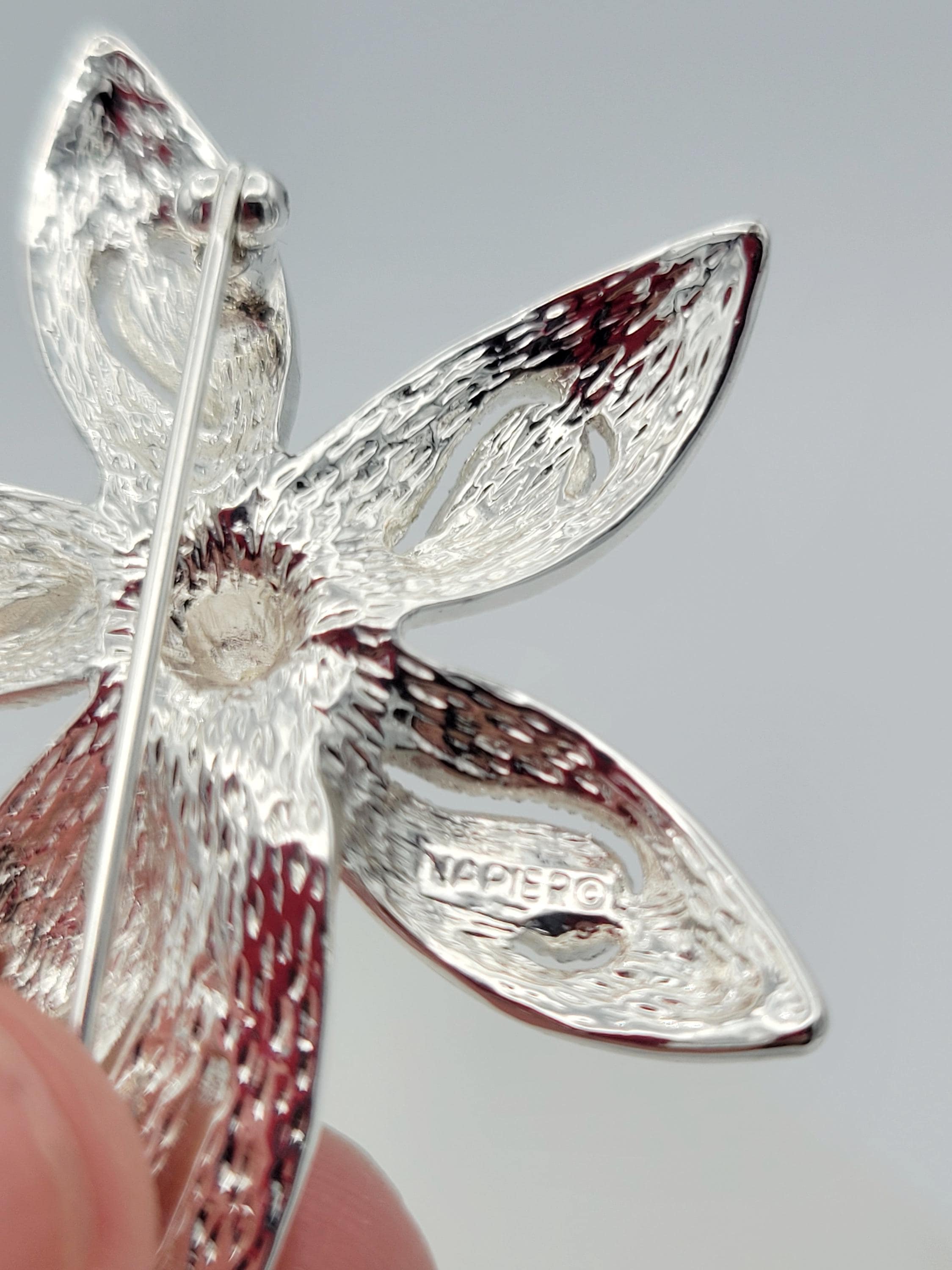 Vintage 1990s Napier Silver Tone Textured Floral Brooch with Purple Rhinestones
