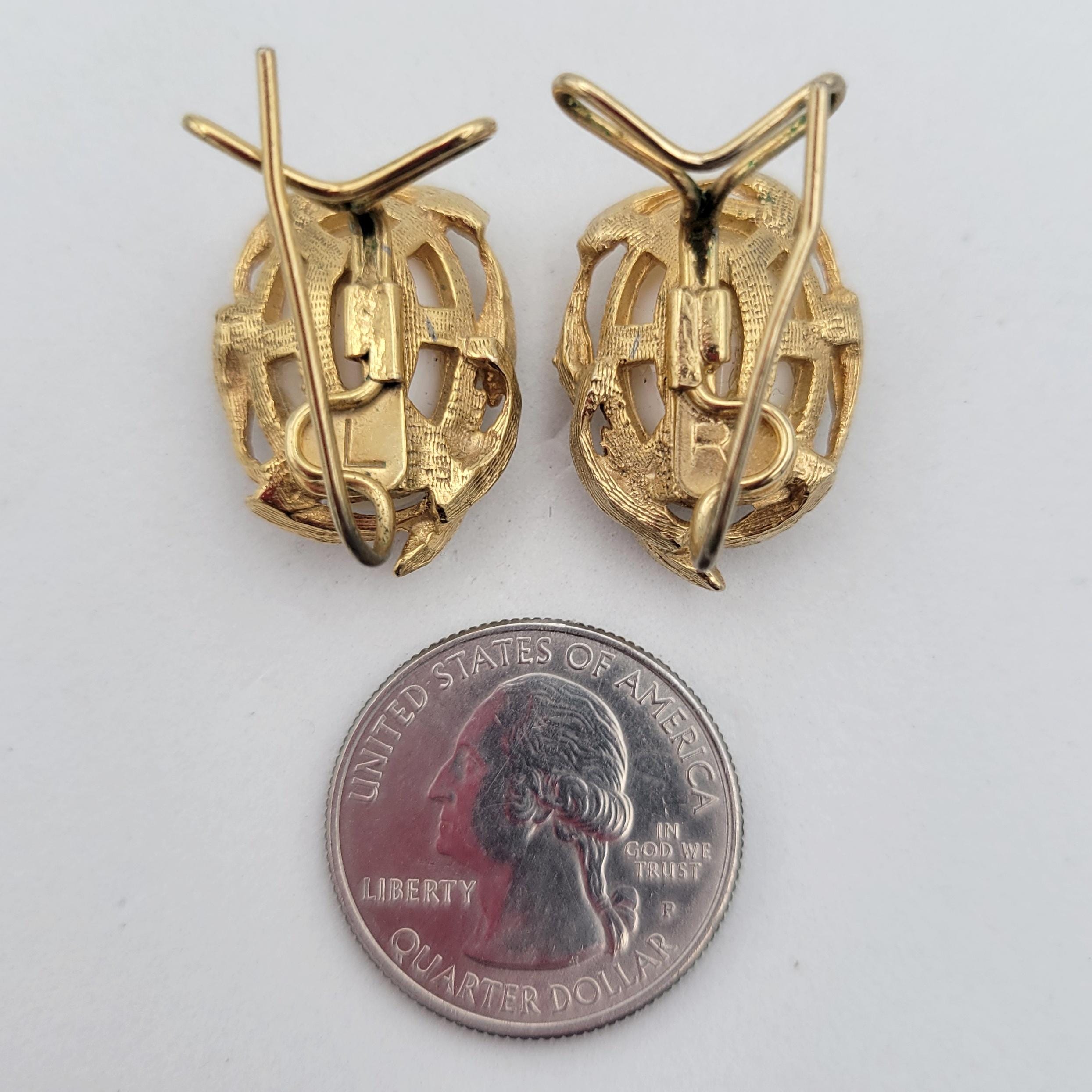 These shining earrings have a great retro look. The gold-tone earrings feature an openwork leaf motif design around the edge. In the center of each earring is a large white faceted stone. The clasps are wingbacks, which are designed to be worn in hollow curve of the ear. These earrings are in excellent, like-new condition.