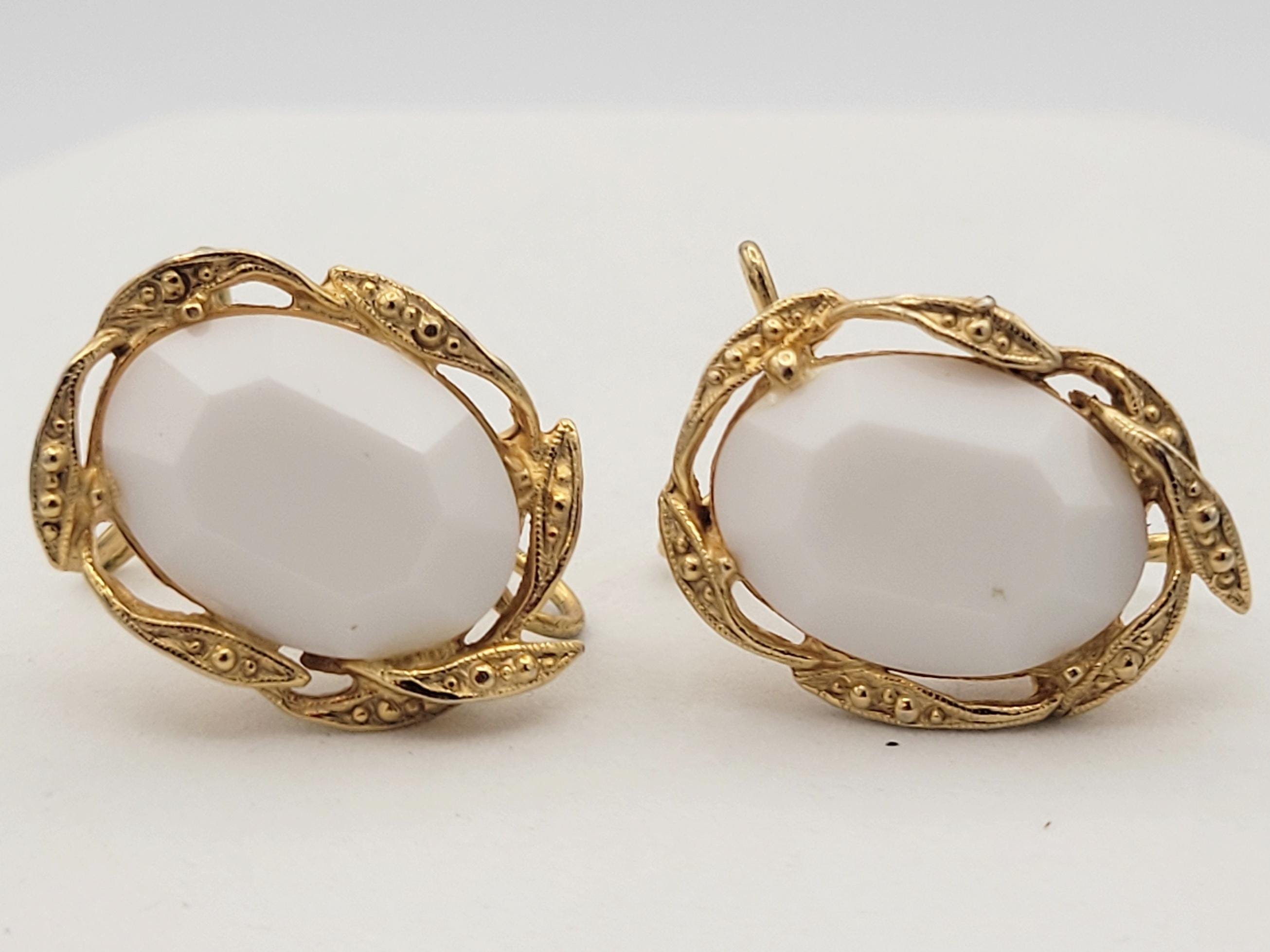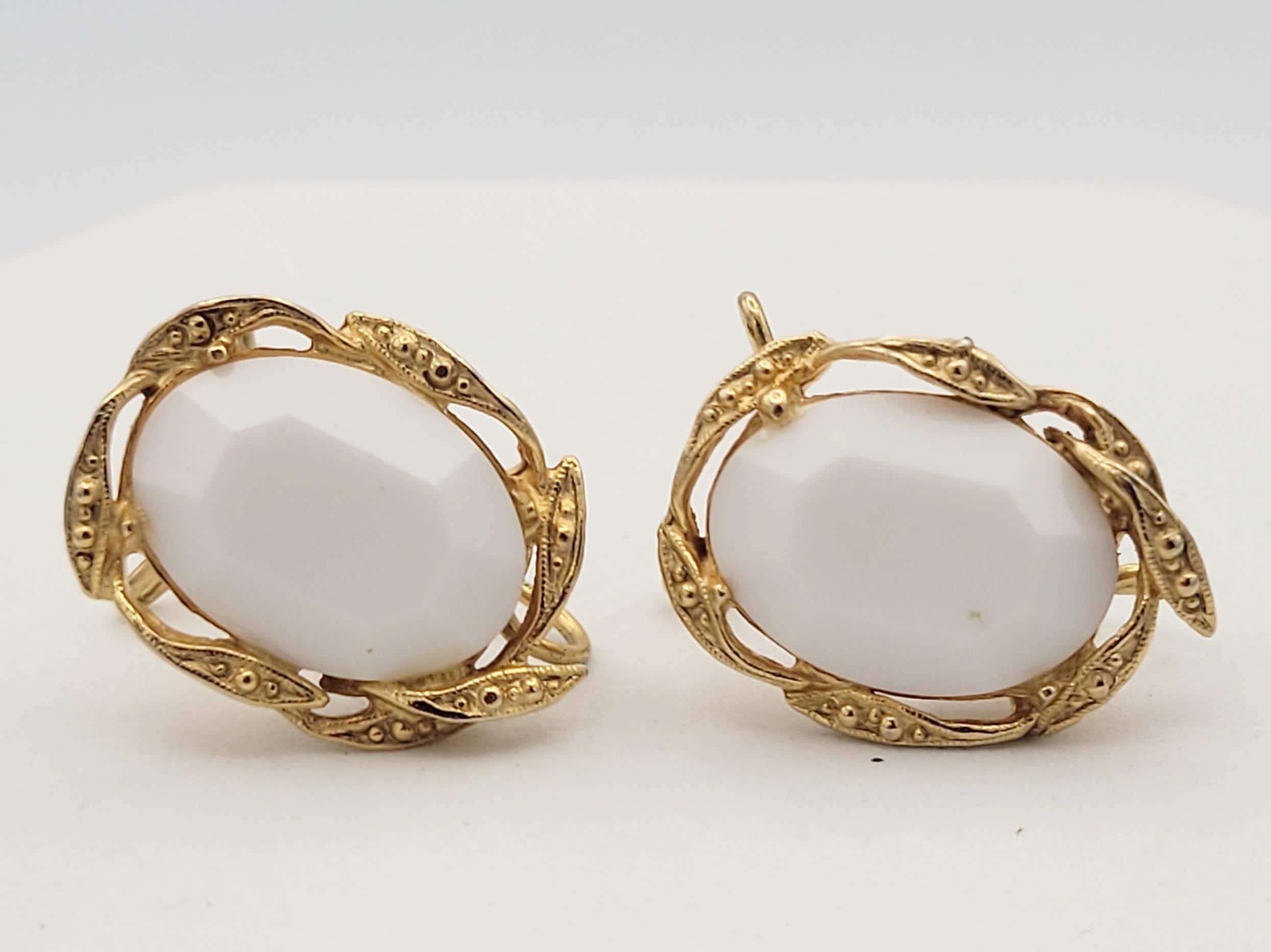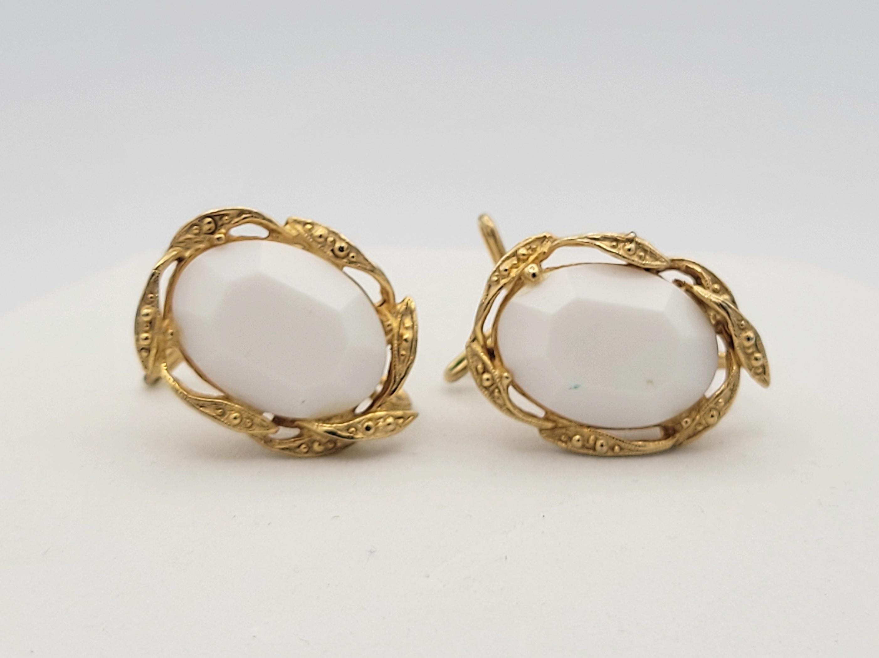 Vintage 1950s Gold Tone & White Faceted Stone Wingback Clip On Earrings with Leaves Motif