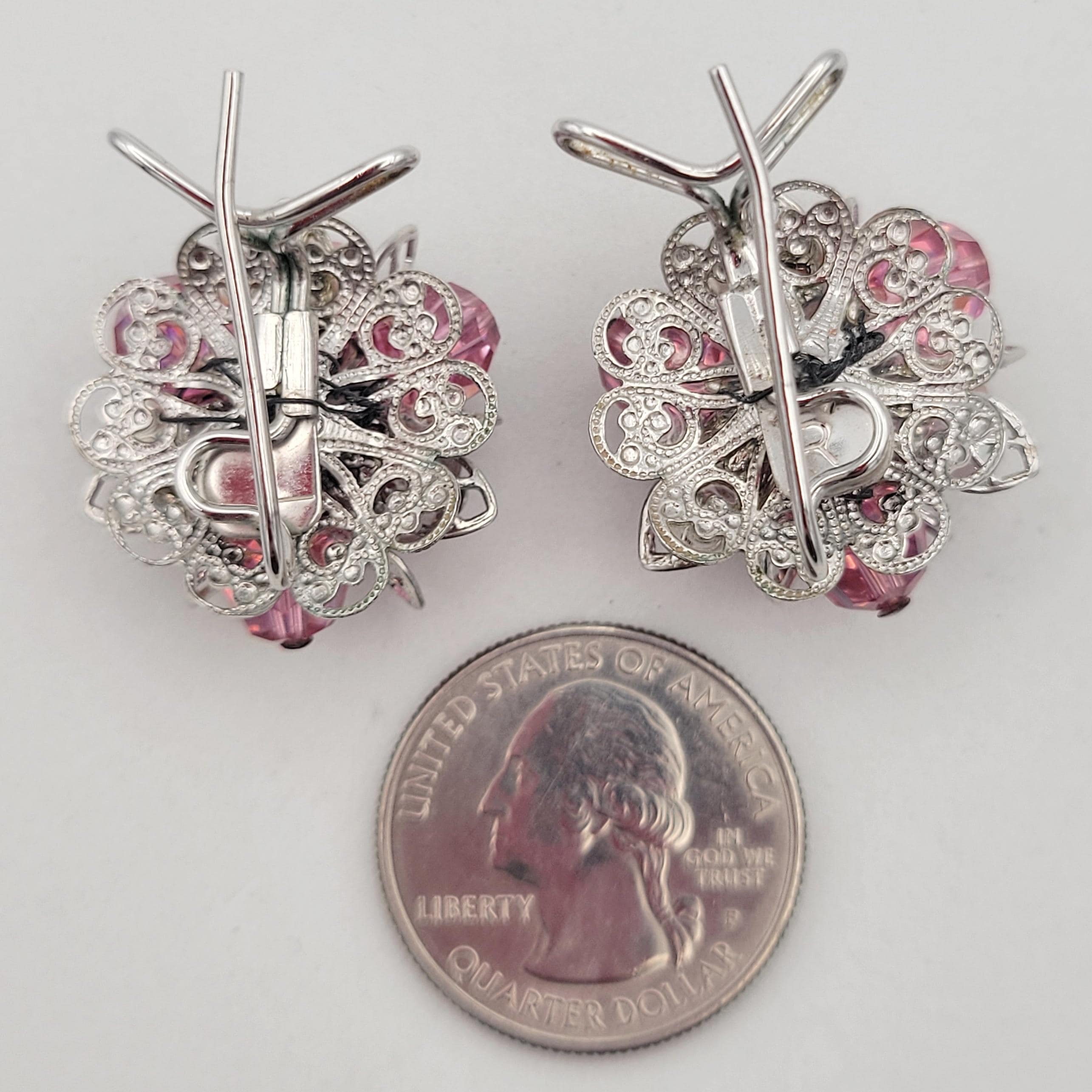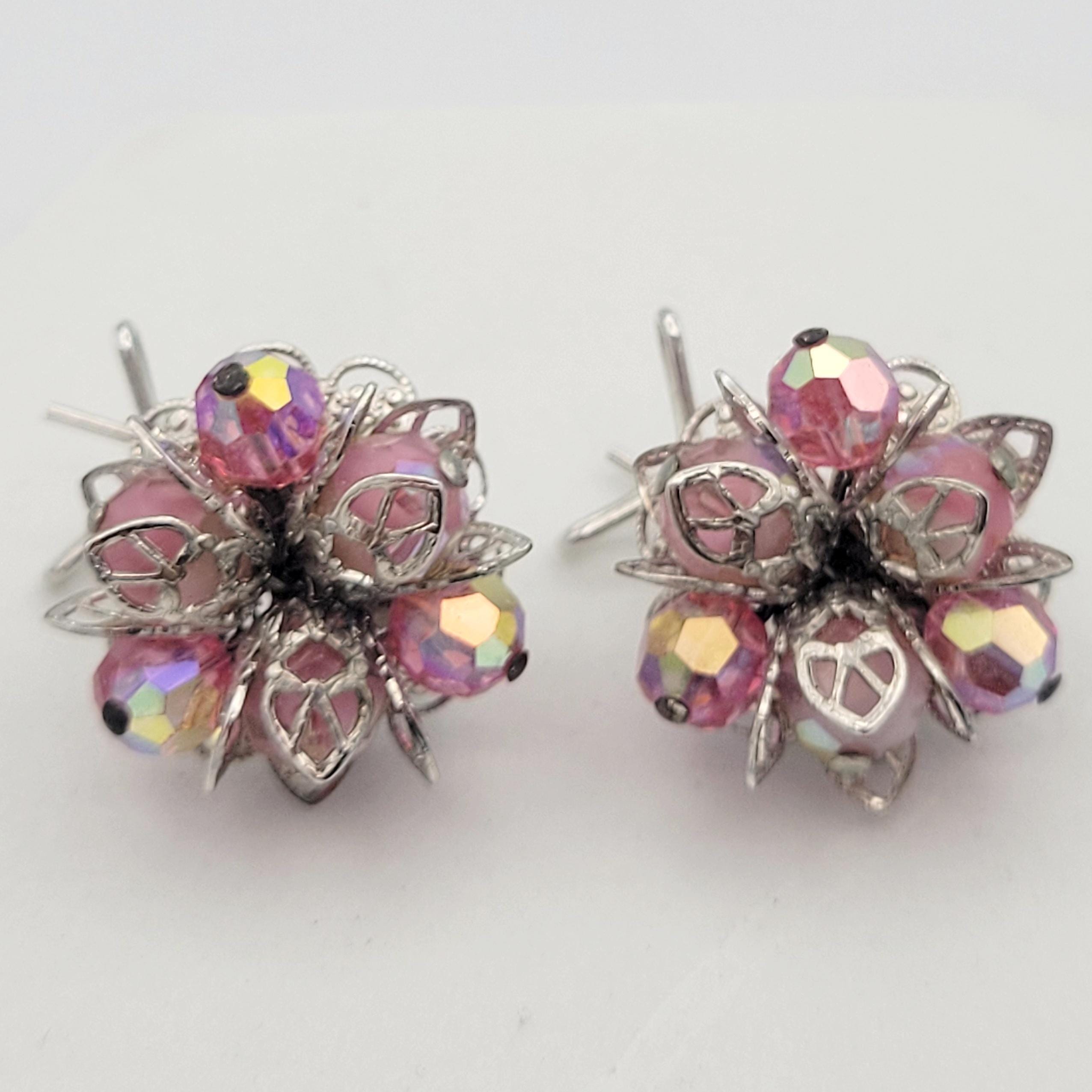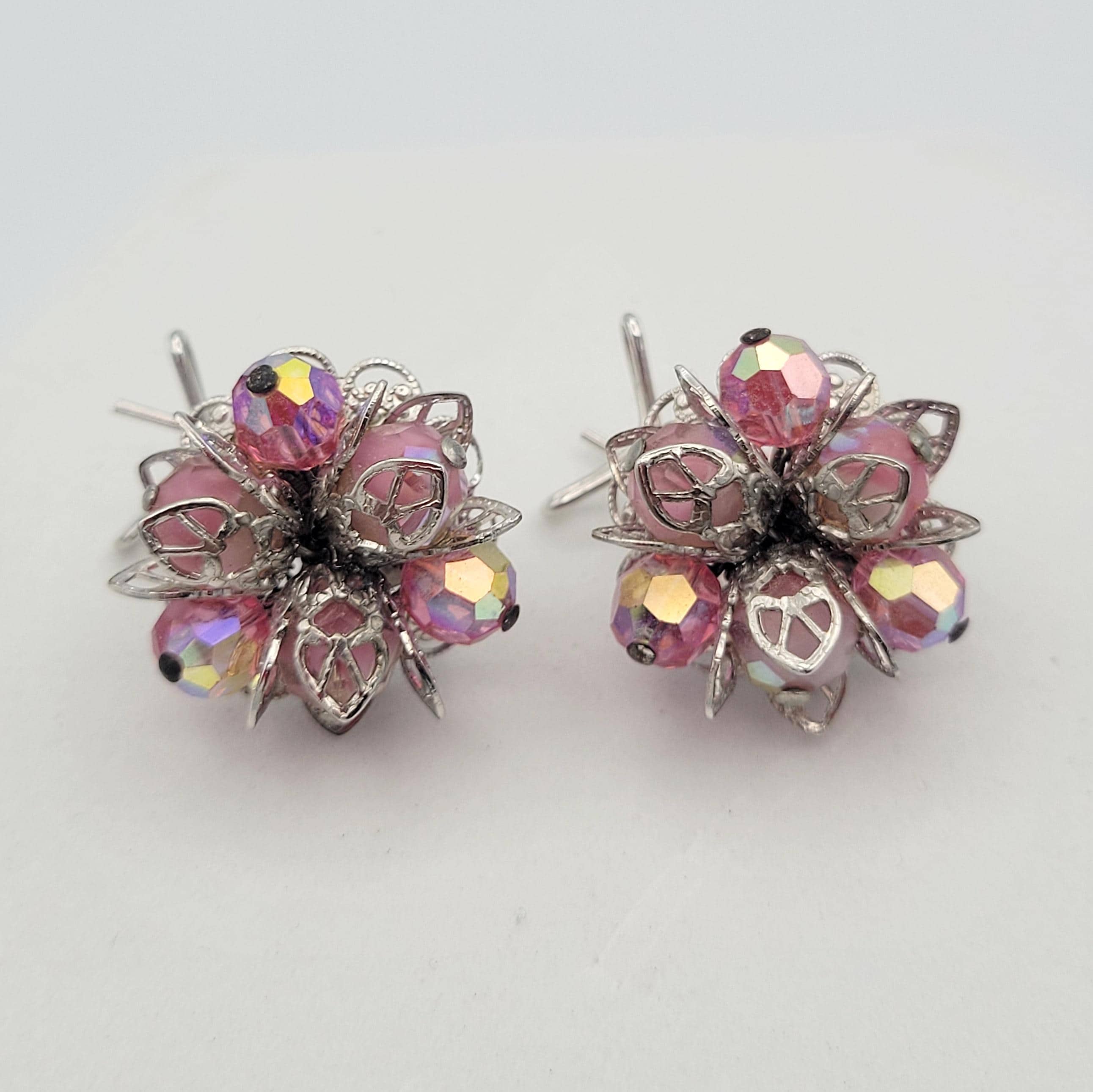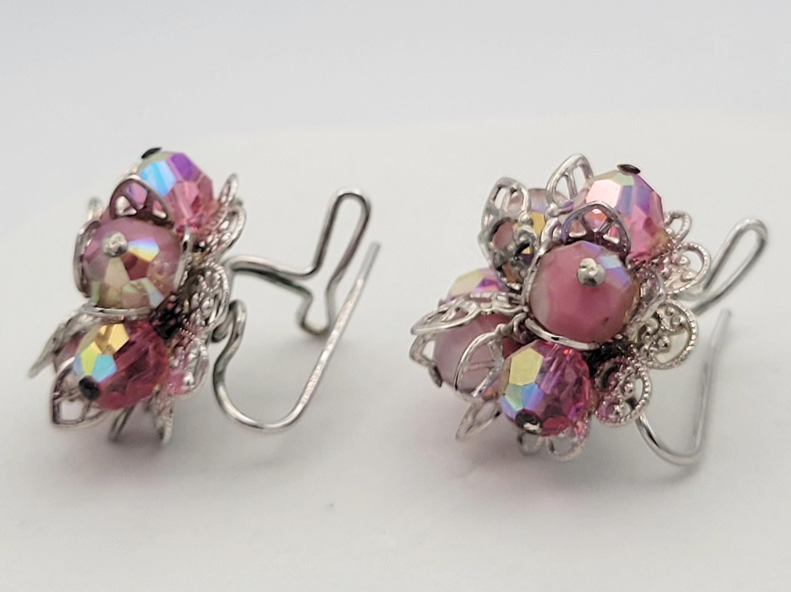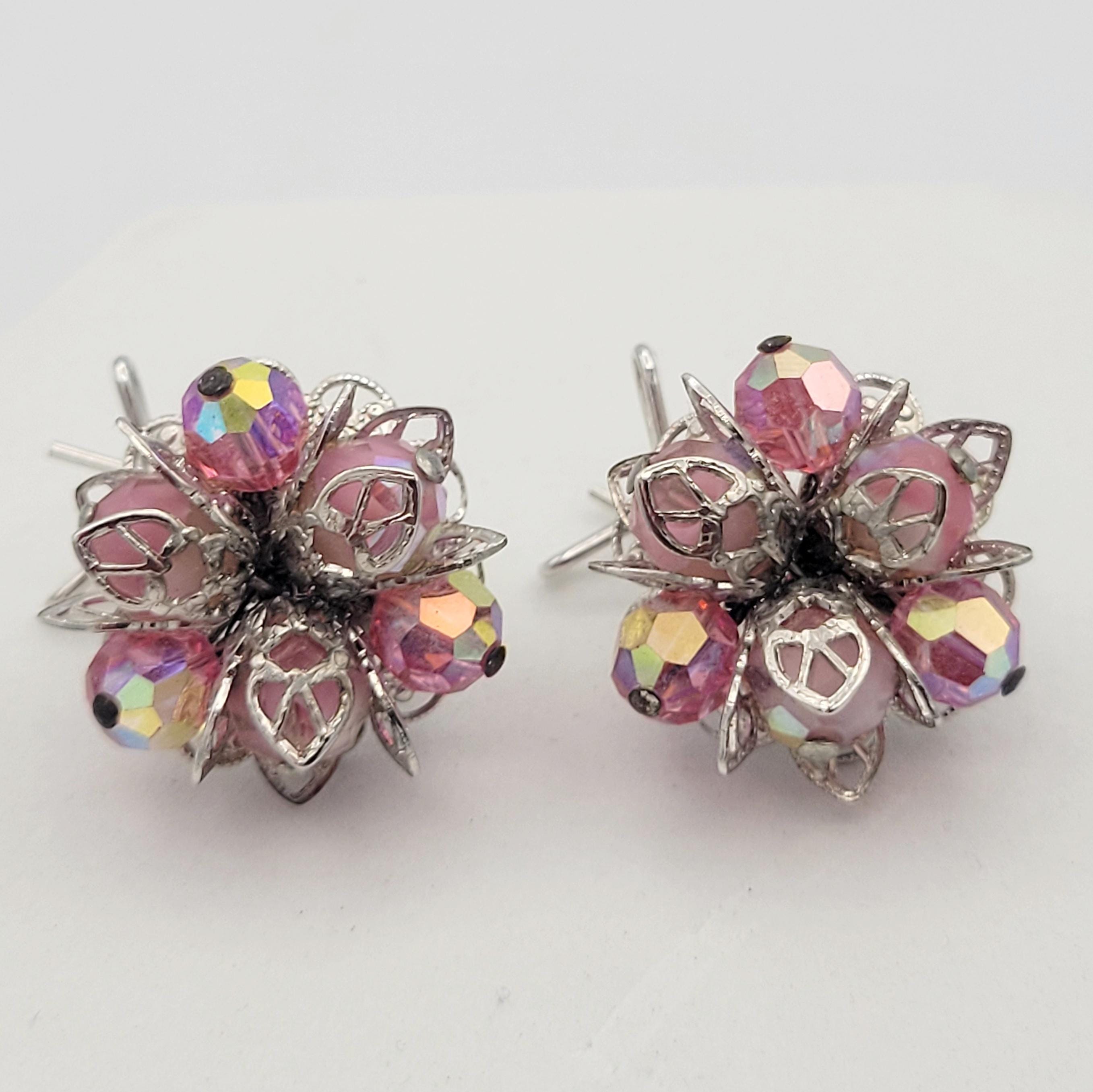 These shining earrings have a great retro look. The silver-tone earrings feature a bottom layer of openwork filigree & a top layer of openwork leaf shapes. In the center are clusters of pink iridescent beads that are faceted to add sparkle. The clasps are wingbacks, which are designed to be worn in hollow curve of the ear. These earrings are in excellent, like-new condition.