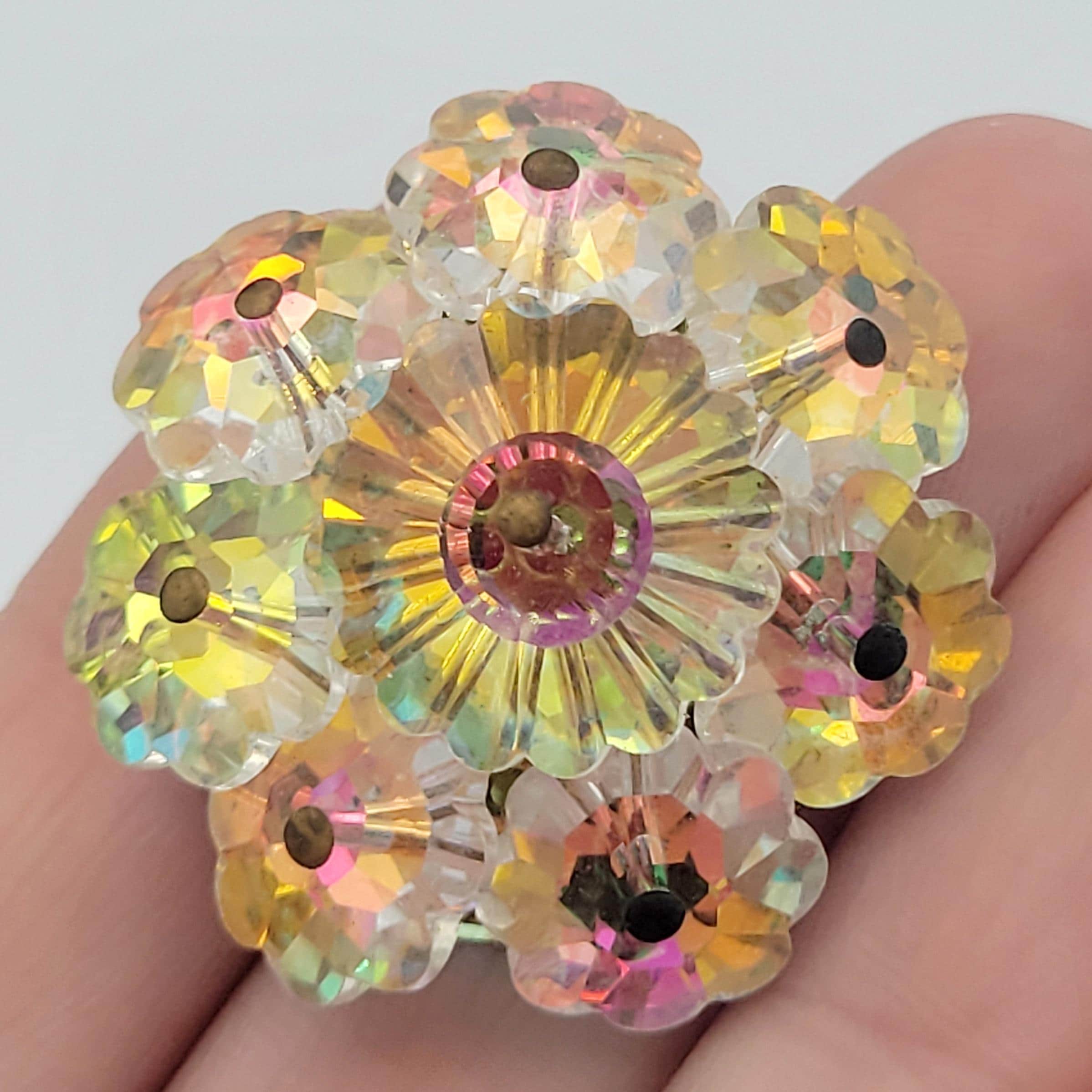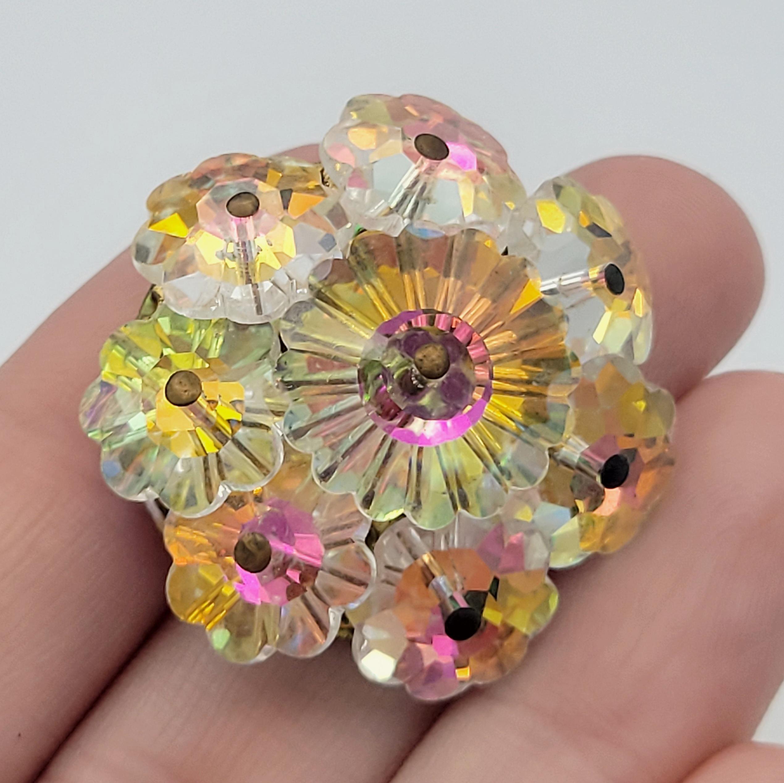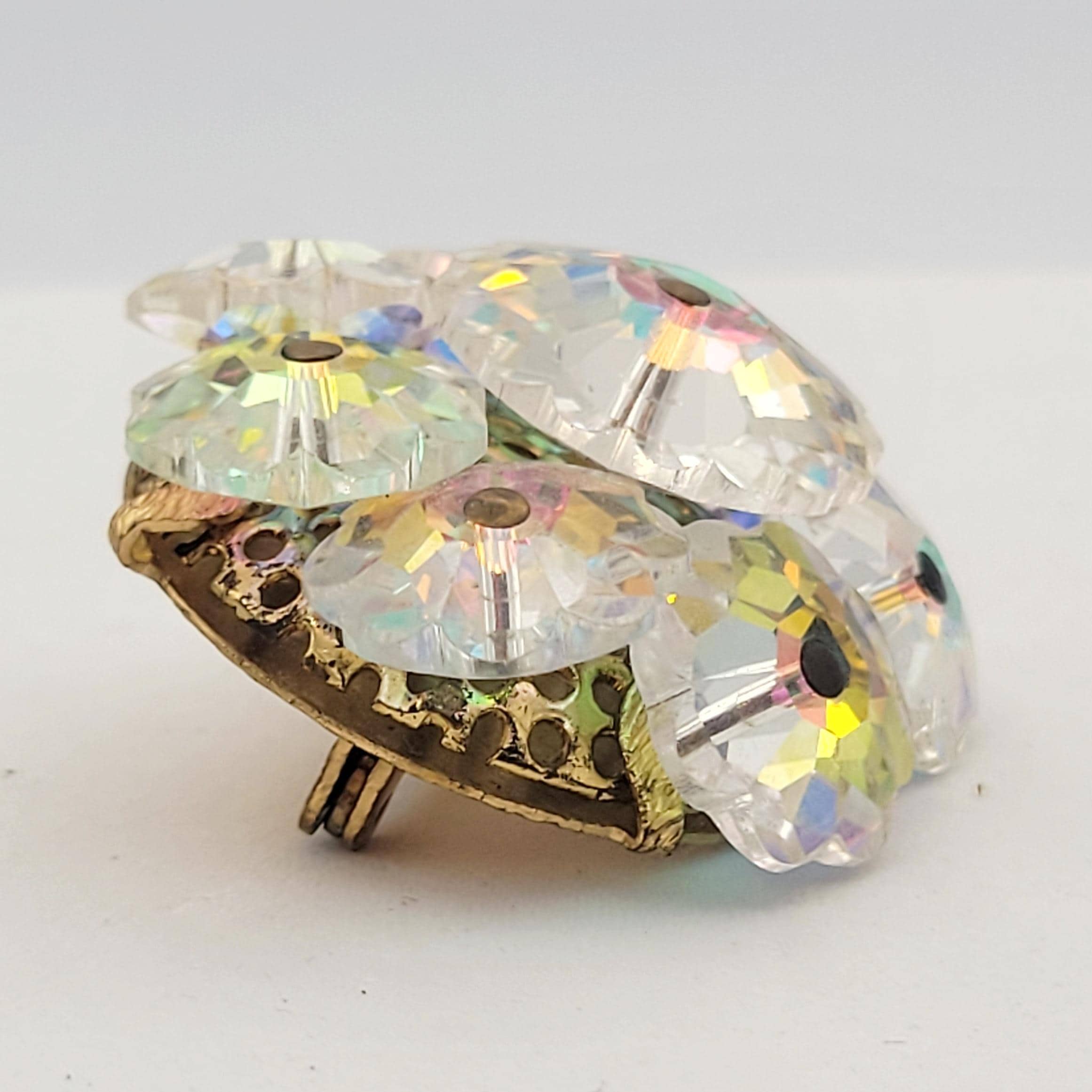 Vintage 1950s Gold Tone Aurora Borealis Iridescent Floral Cut Crystal Brooch