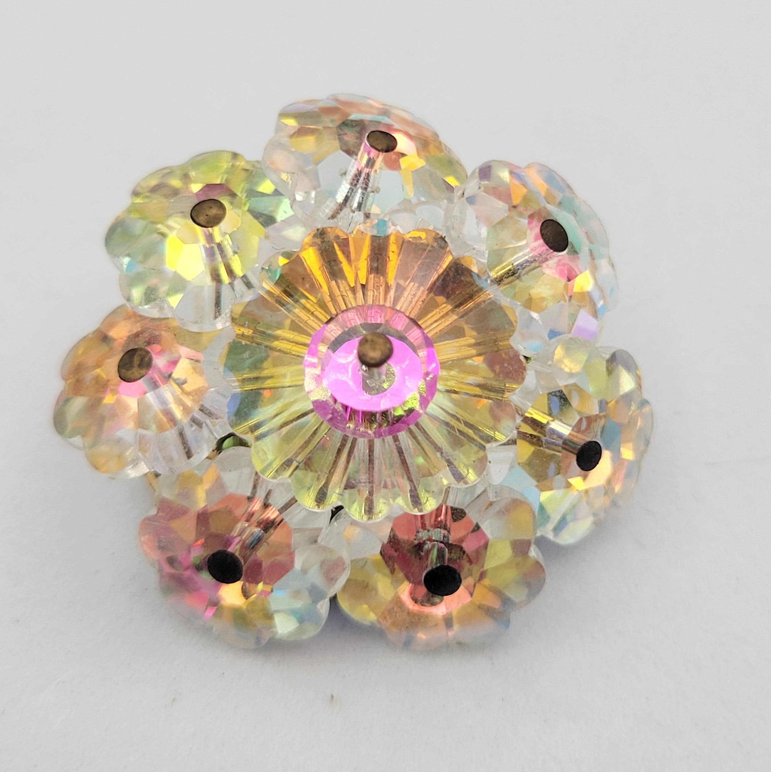 This sparkling brooch makes a great statement piece. The gold-tone circular base provides the setting for the 8 iridescent crystals that are cut into flower shapes & then arranged in a floral shape. The piece has flashes of pink, yellow & orange. This piece is in excellent vintage condition with very little wear.