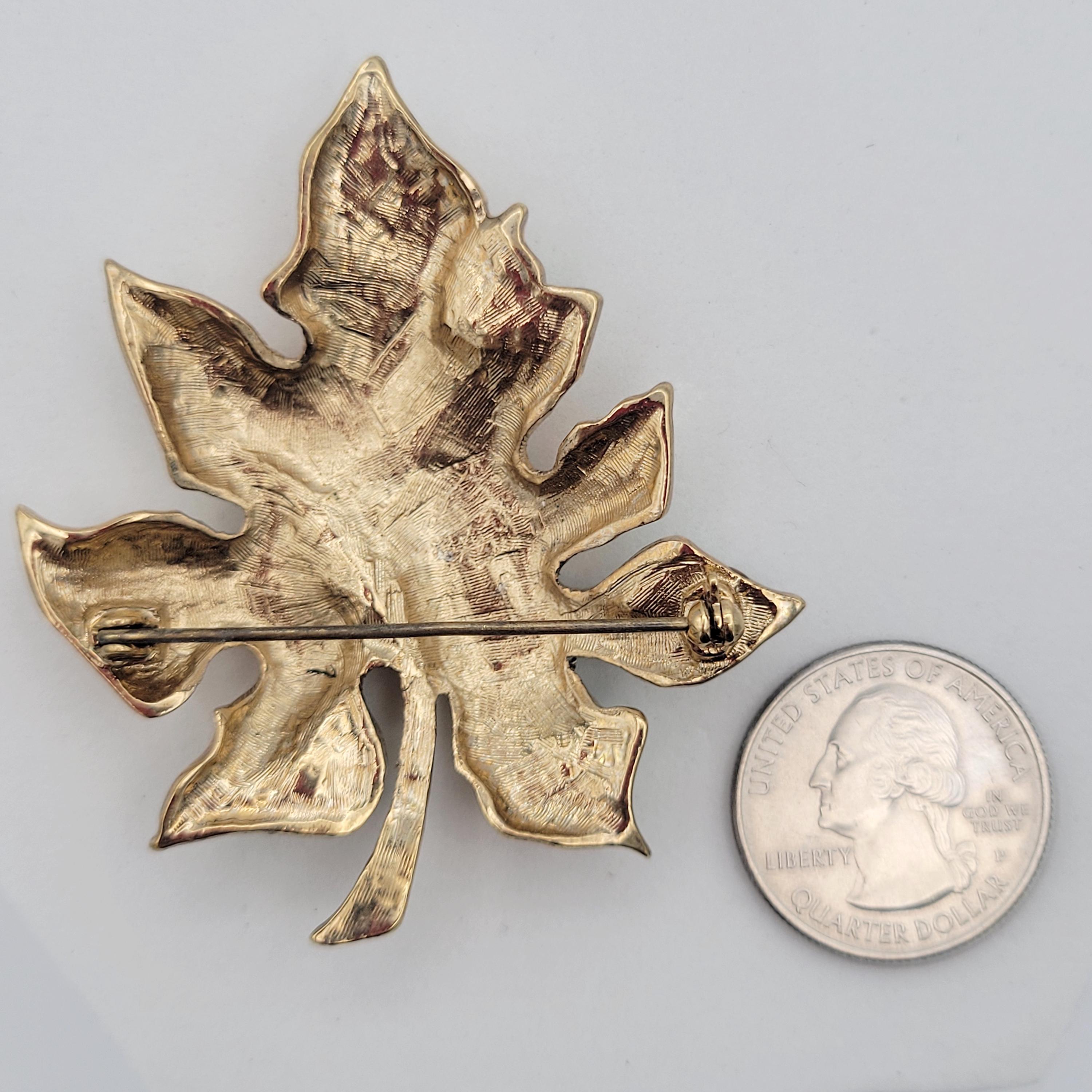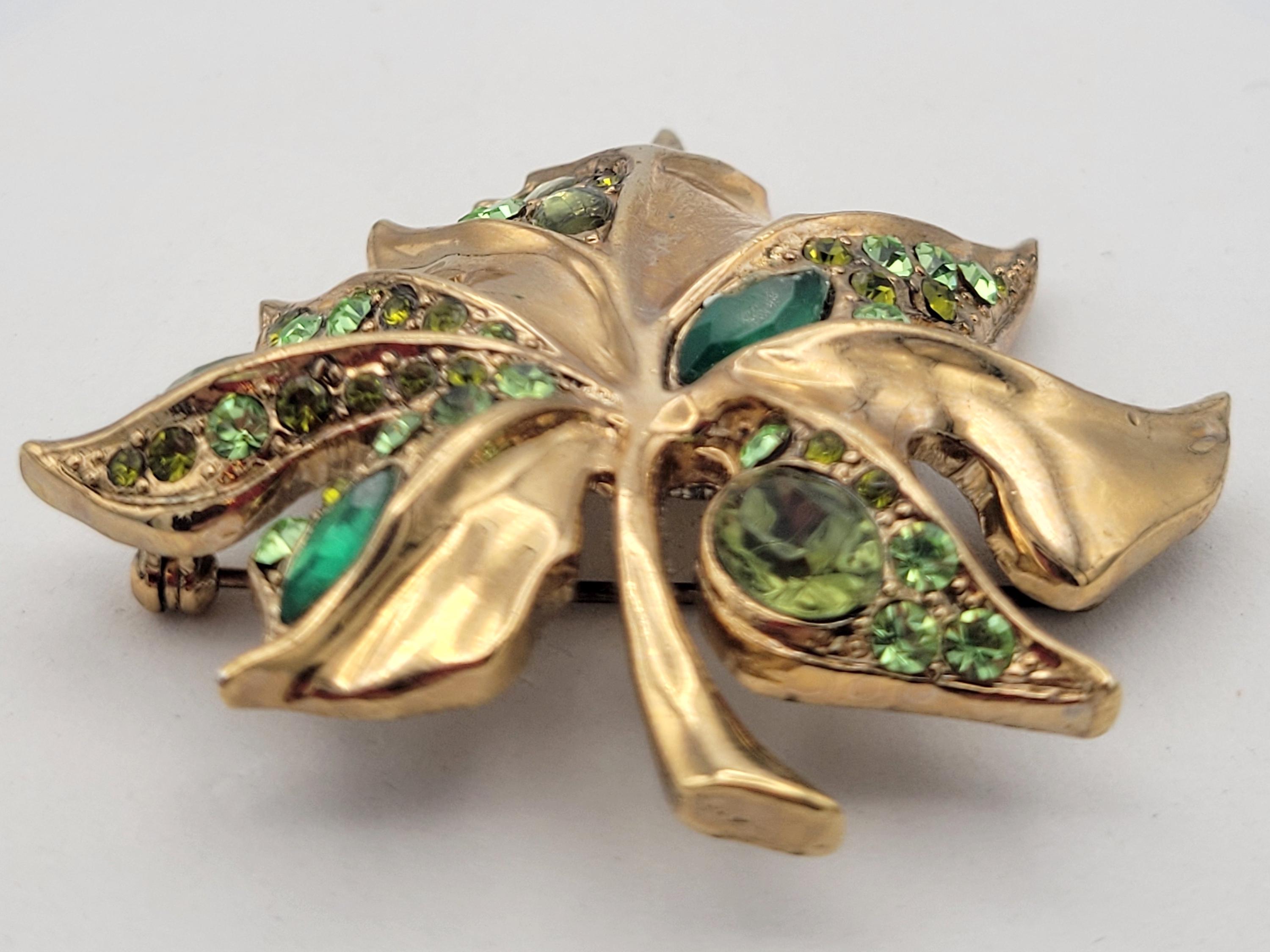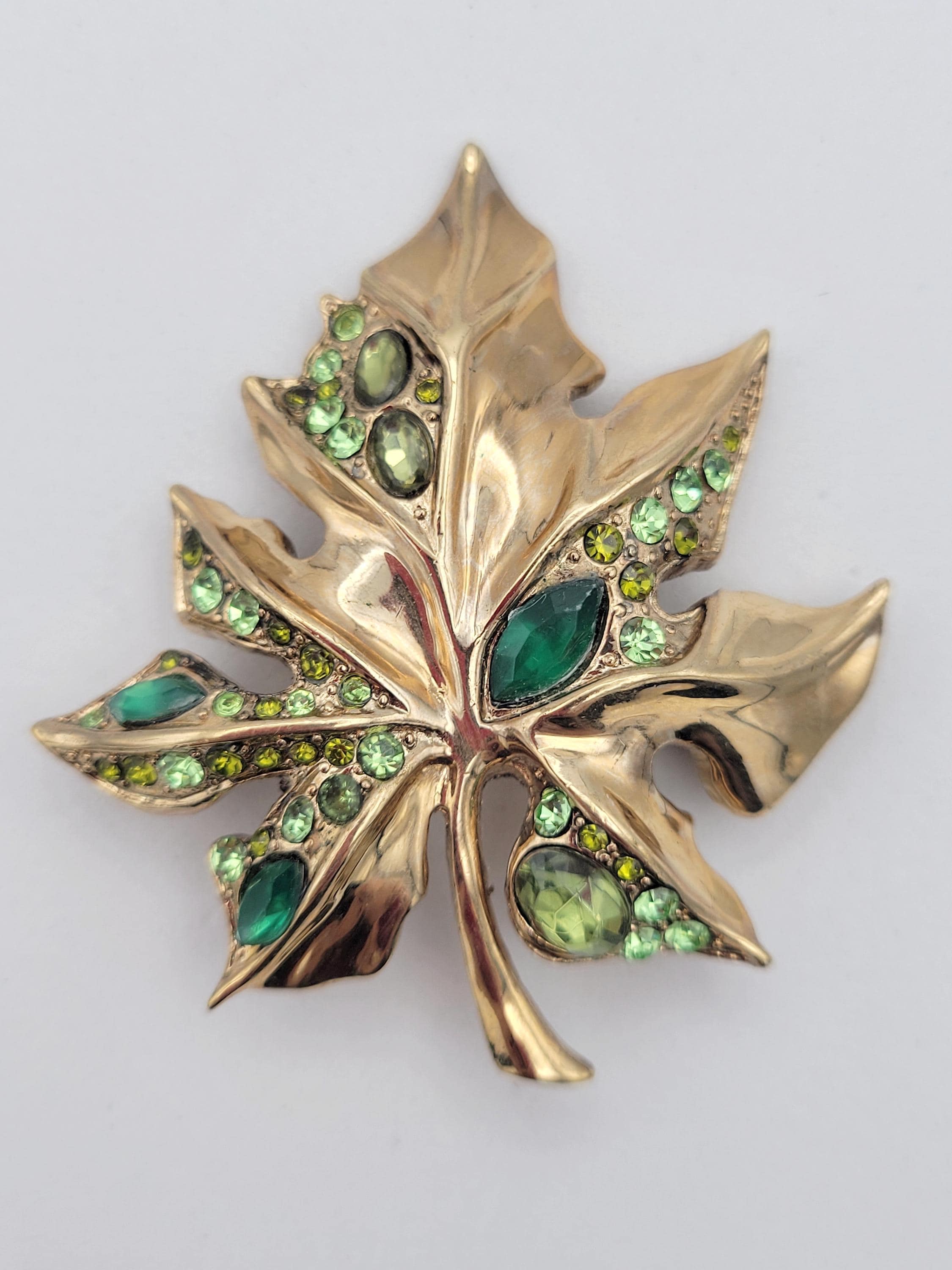 This stunning piece is sure to get noticed! This large brooch is made from shining gold-tone metal & forms the slightly domed shape of a maple leaf. The leaf is accented with pale green, lime green & emerald green rhinestones in various shapes & sizes. This piece is in excellent vintage condition with very little wear.