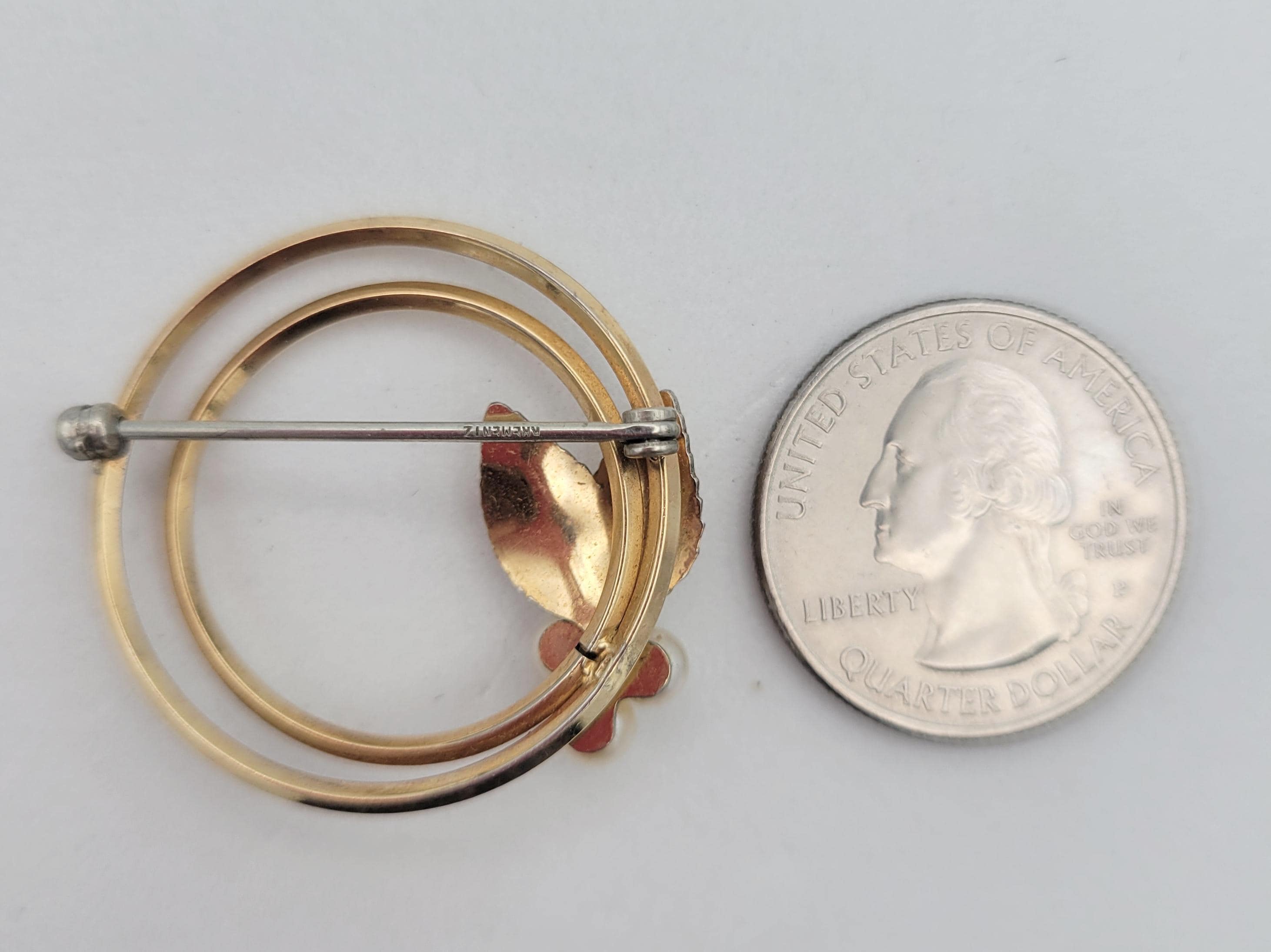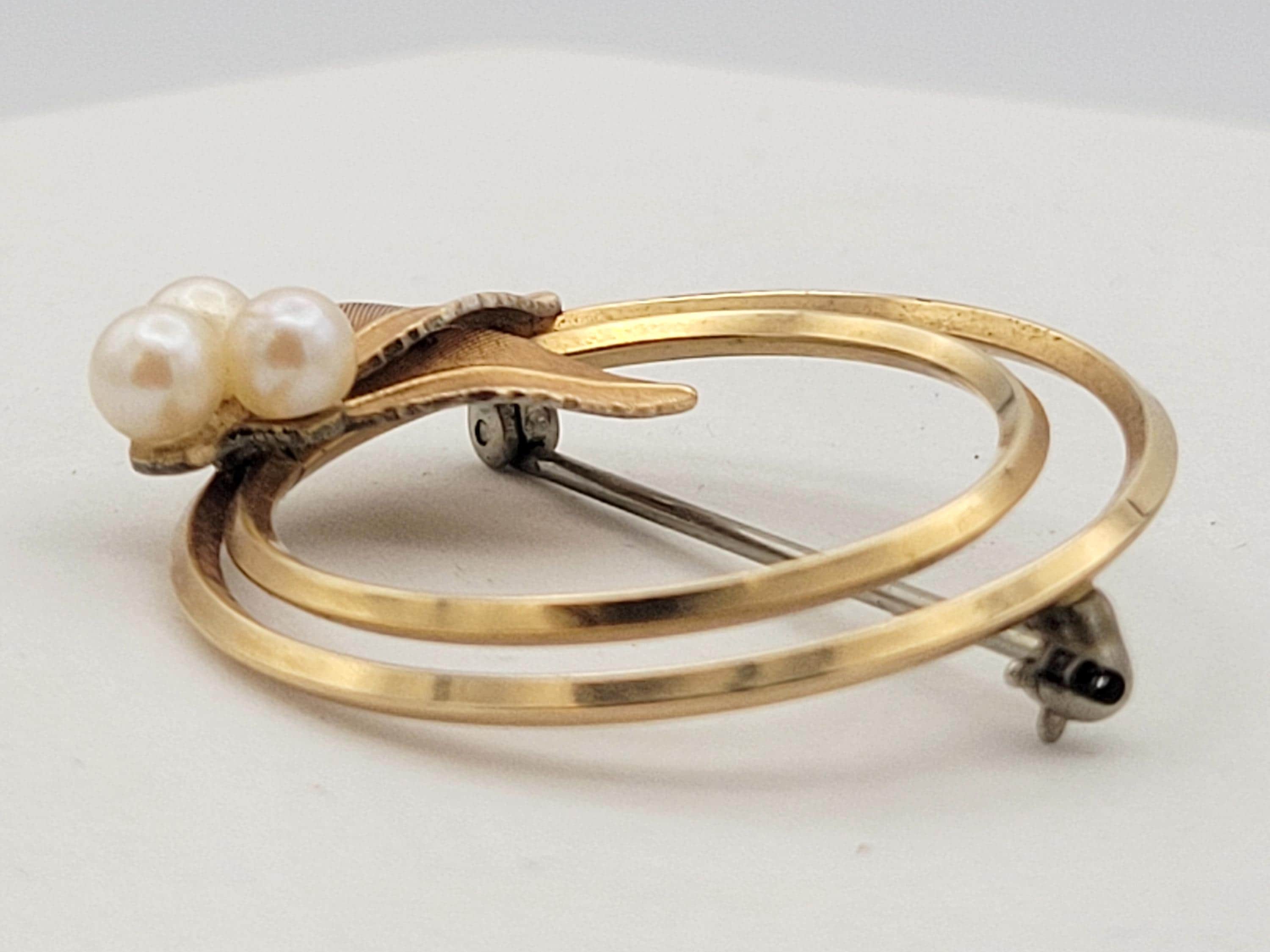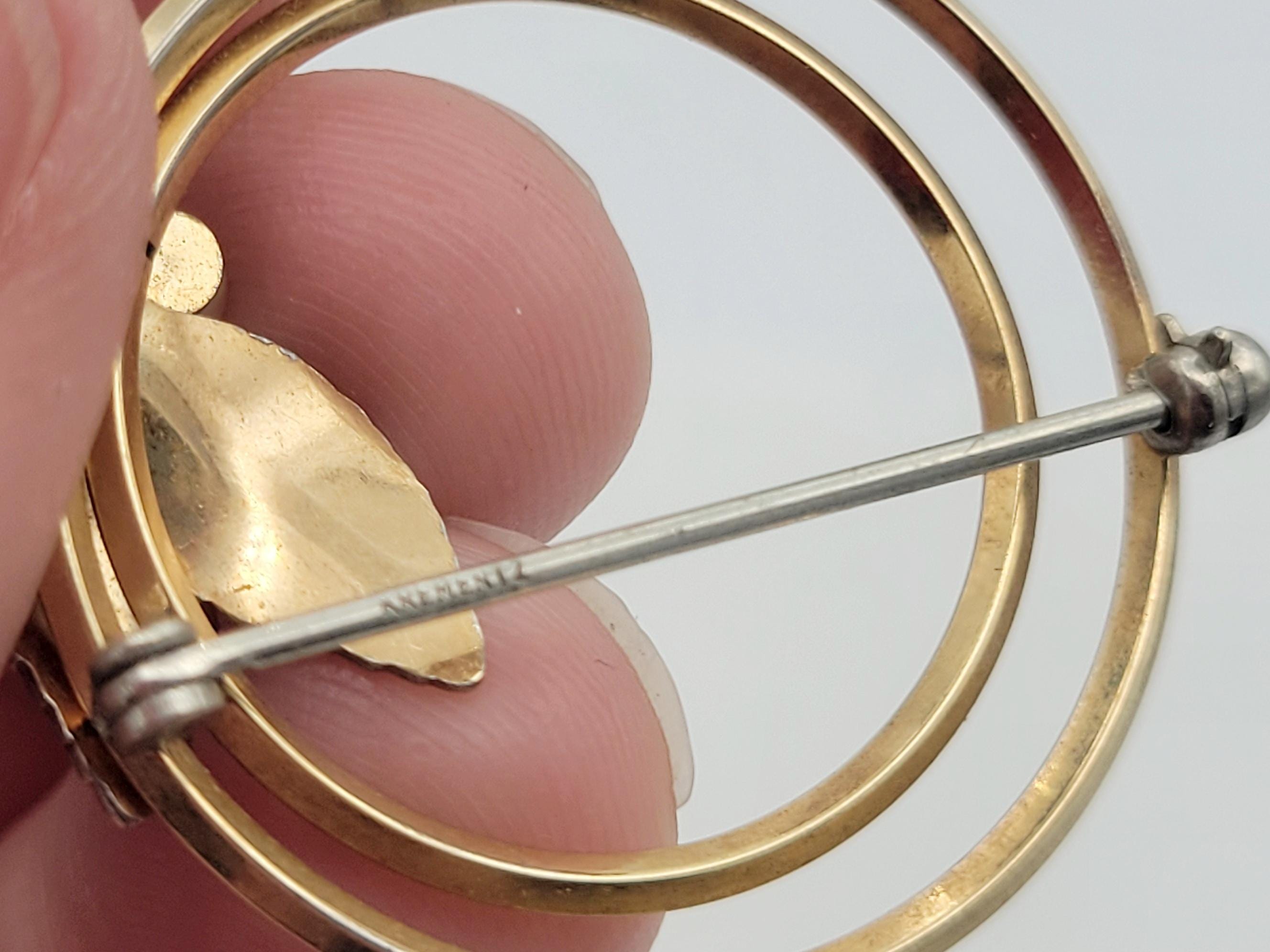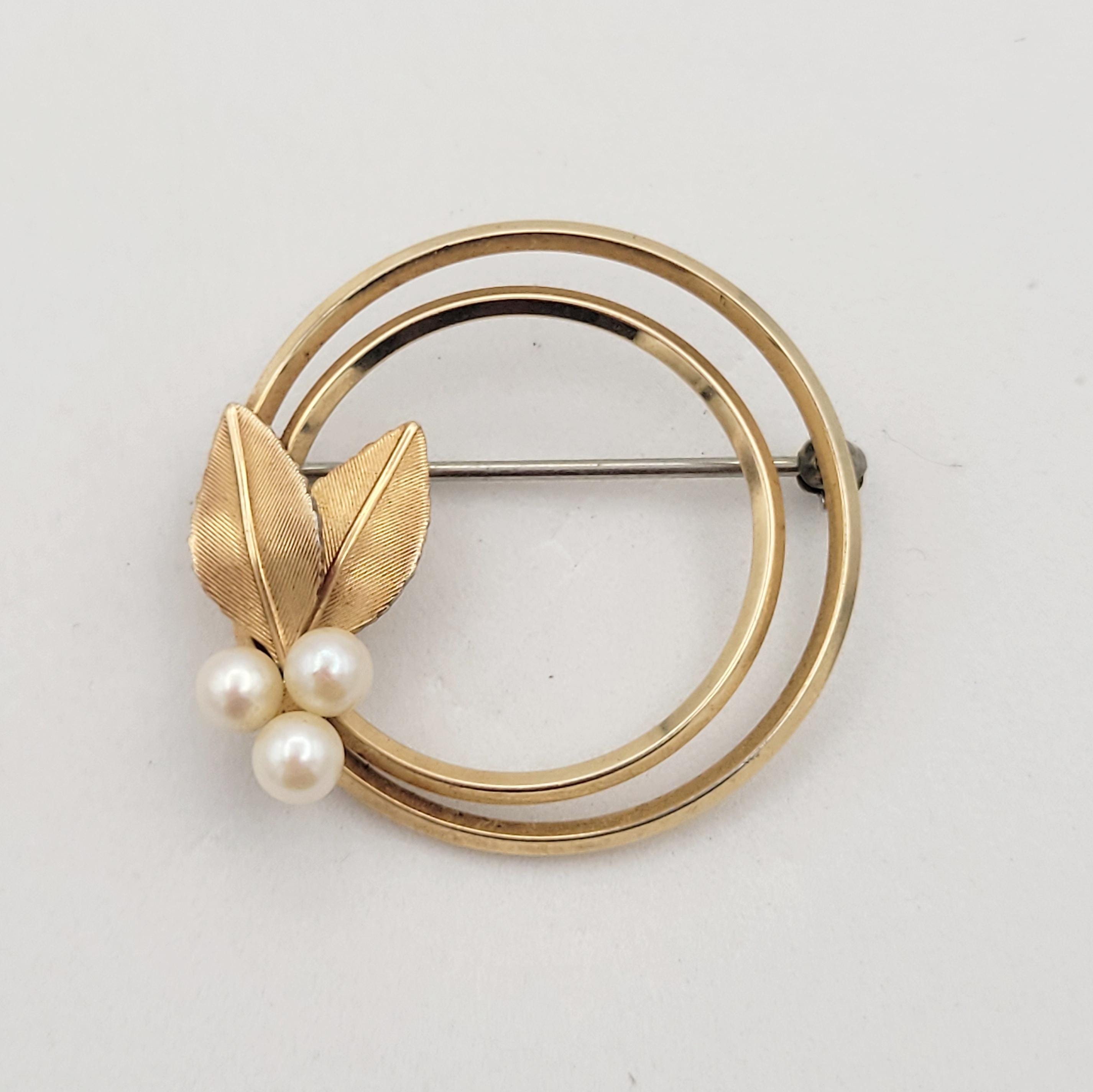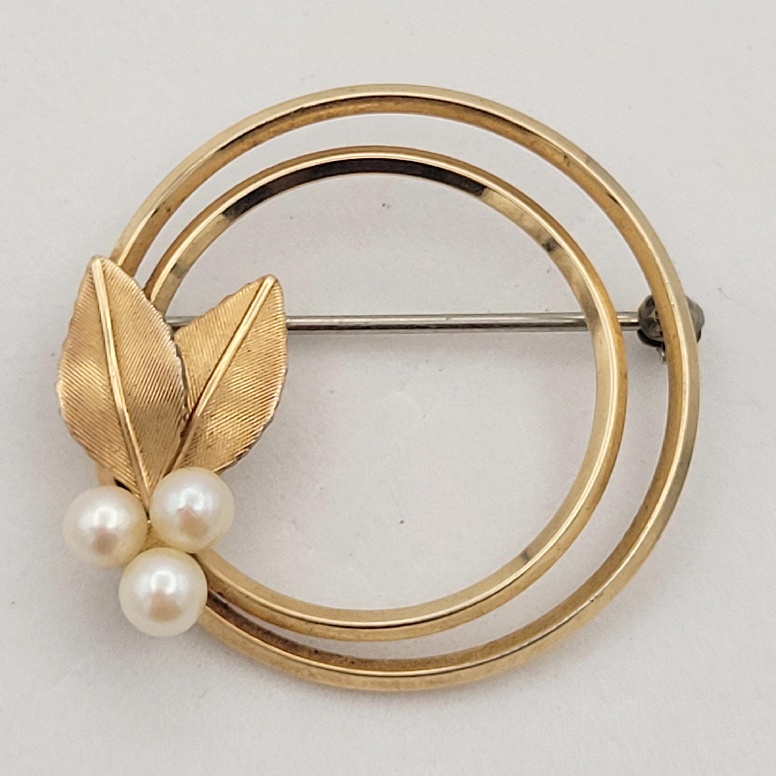 Vintage 1950s Krementz Gold Plated Pearl & Leaf Double Circle Brooch