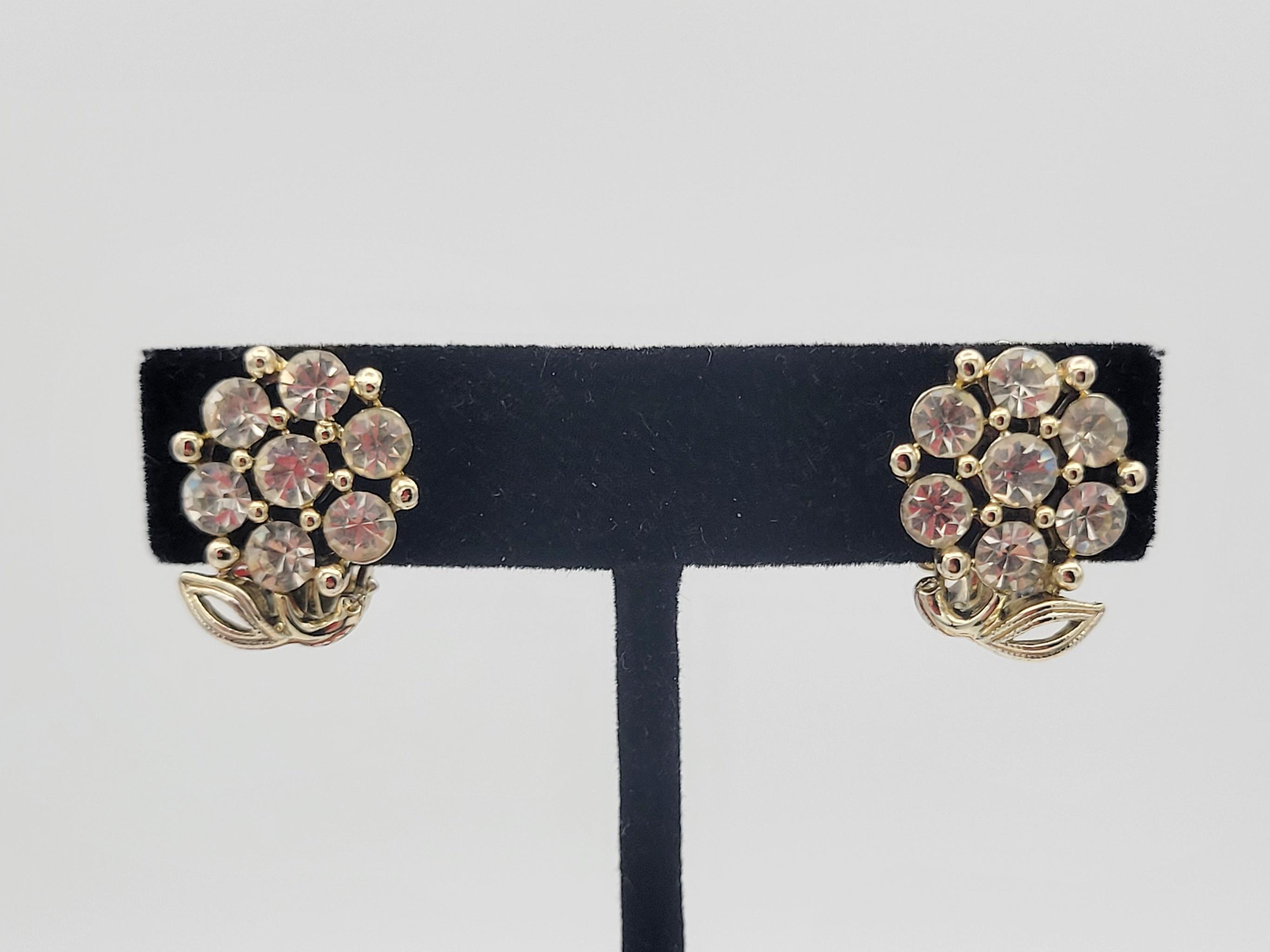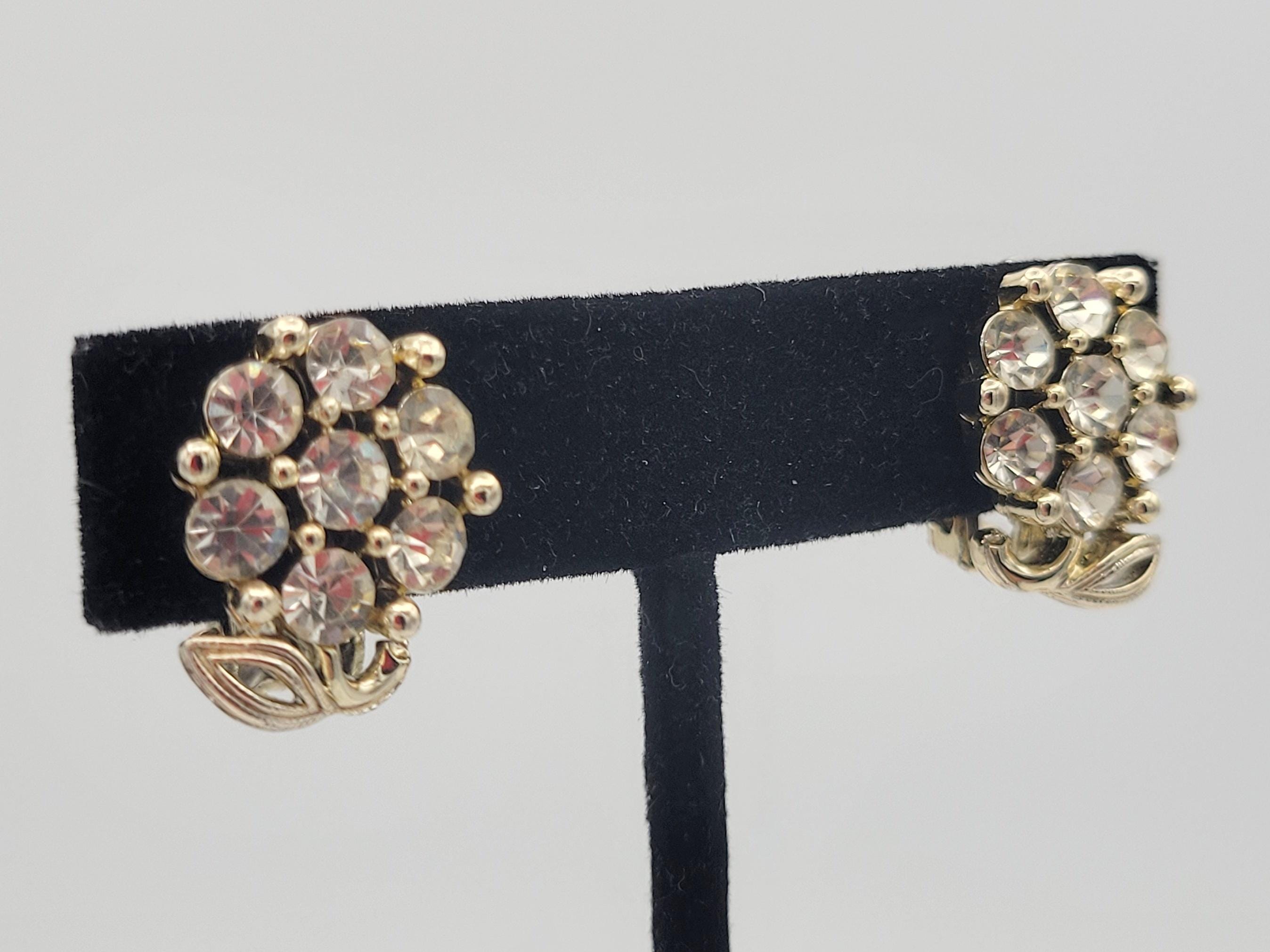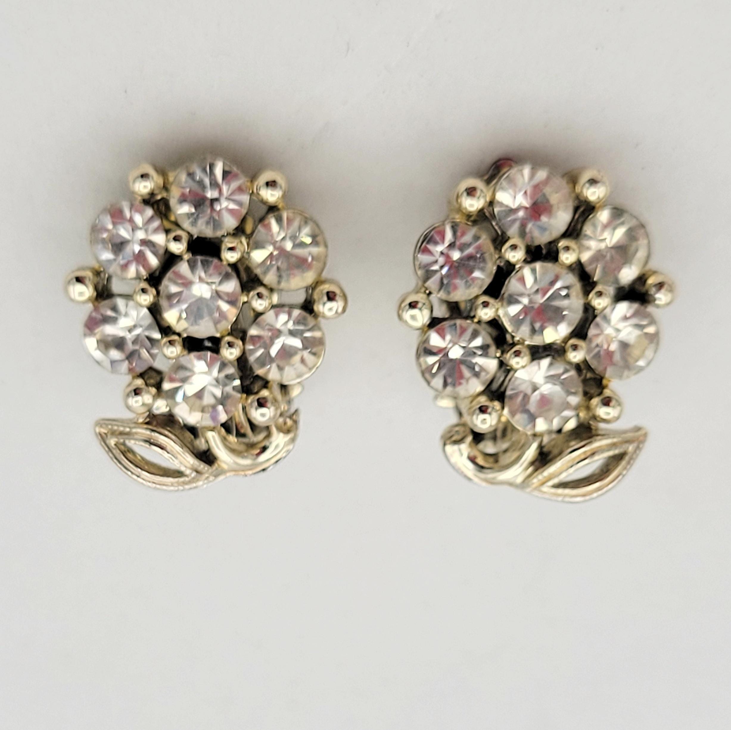 Vintage 1960s Lisner Silver Tone Rhinestone Encrusted Floral Bouquet Button Clip On Earrings
