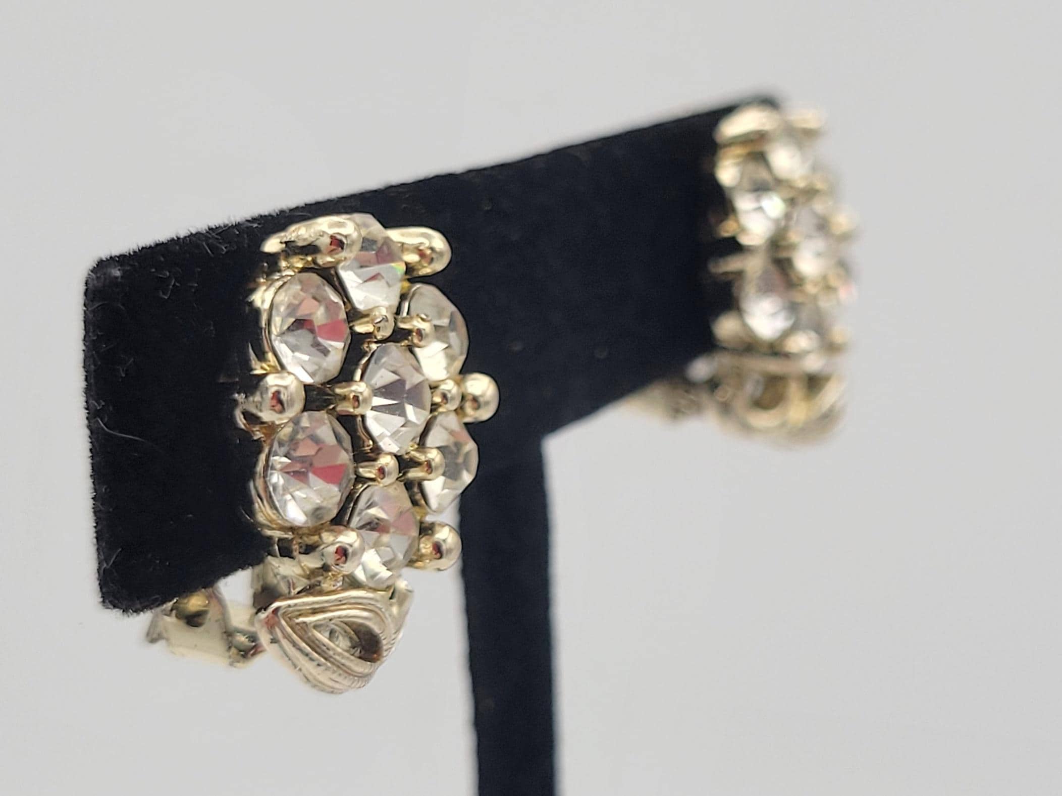 These sparkling earrings will make a versatile addition to your jewelry wardrobe. The clips are affixed to a shining silver-tone openwork base that forms a flower & leaf shape. The flower area is filled with faceted rhinestones. These earrings are in excellent, nearly new condition.