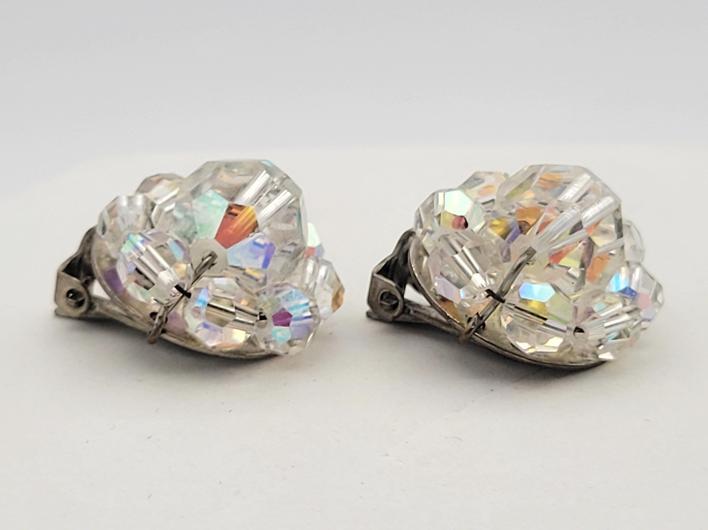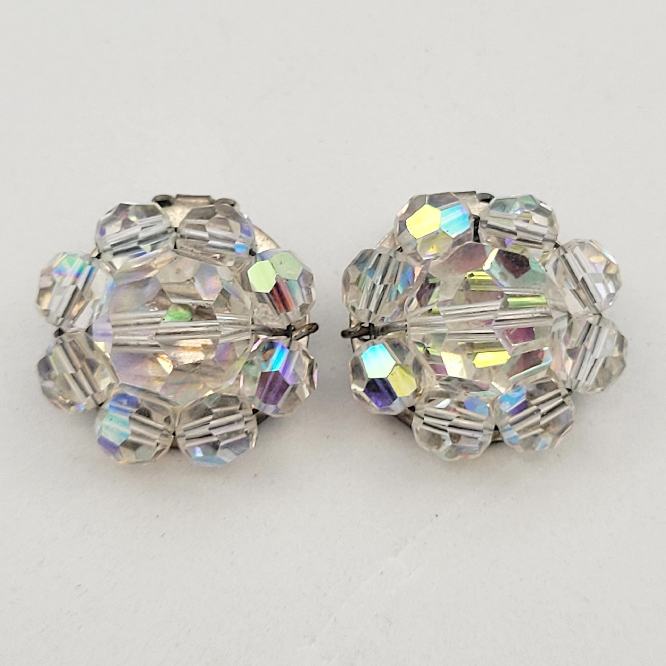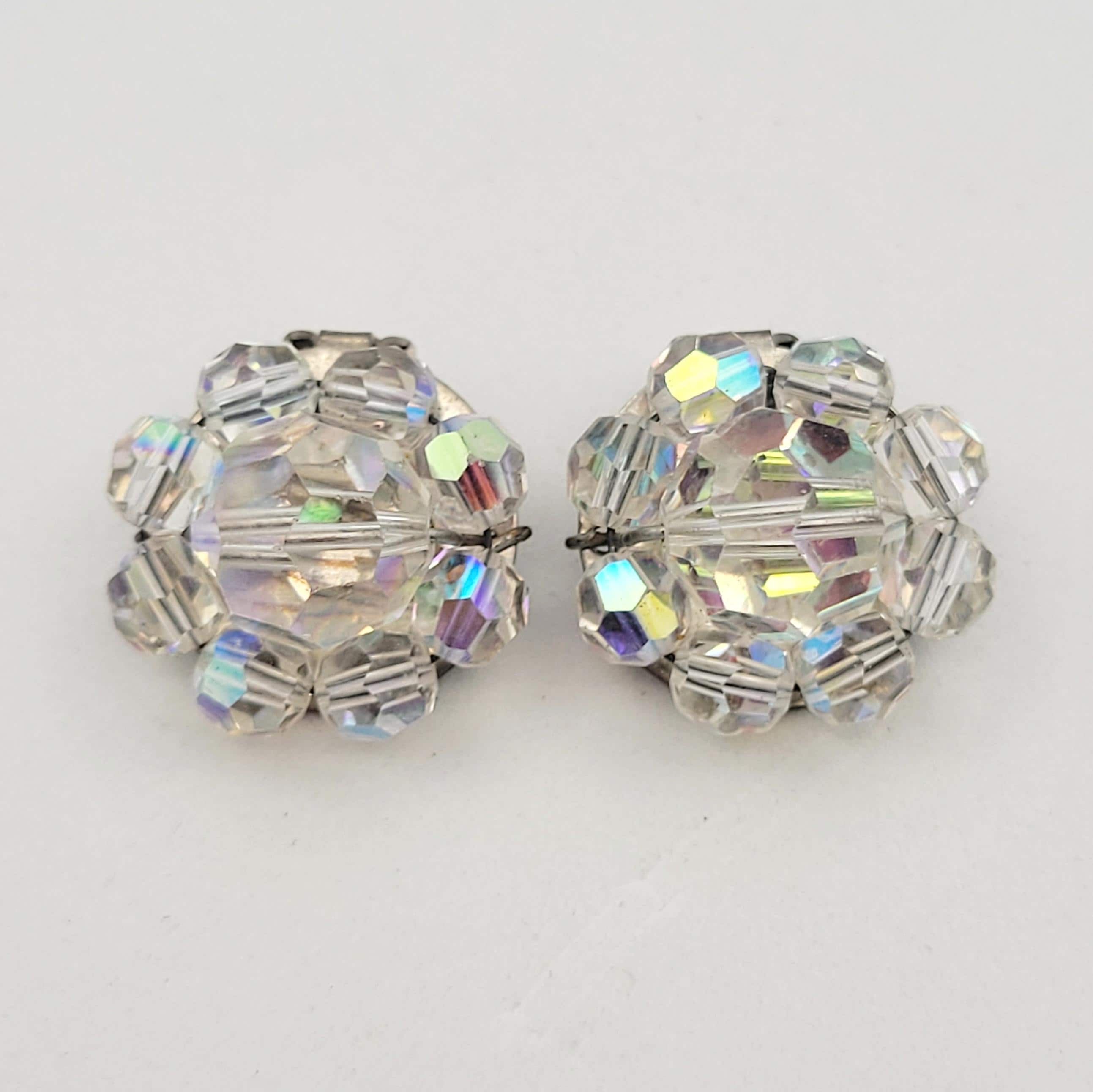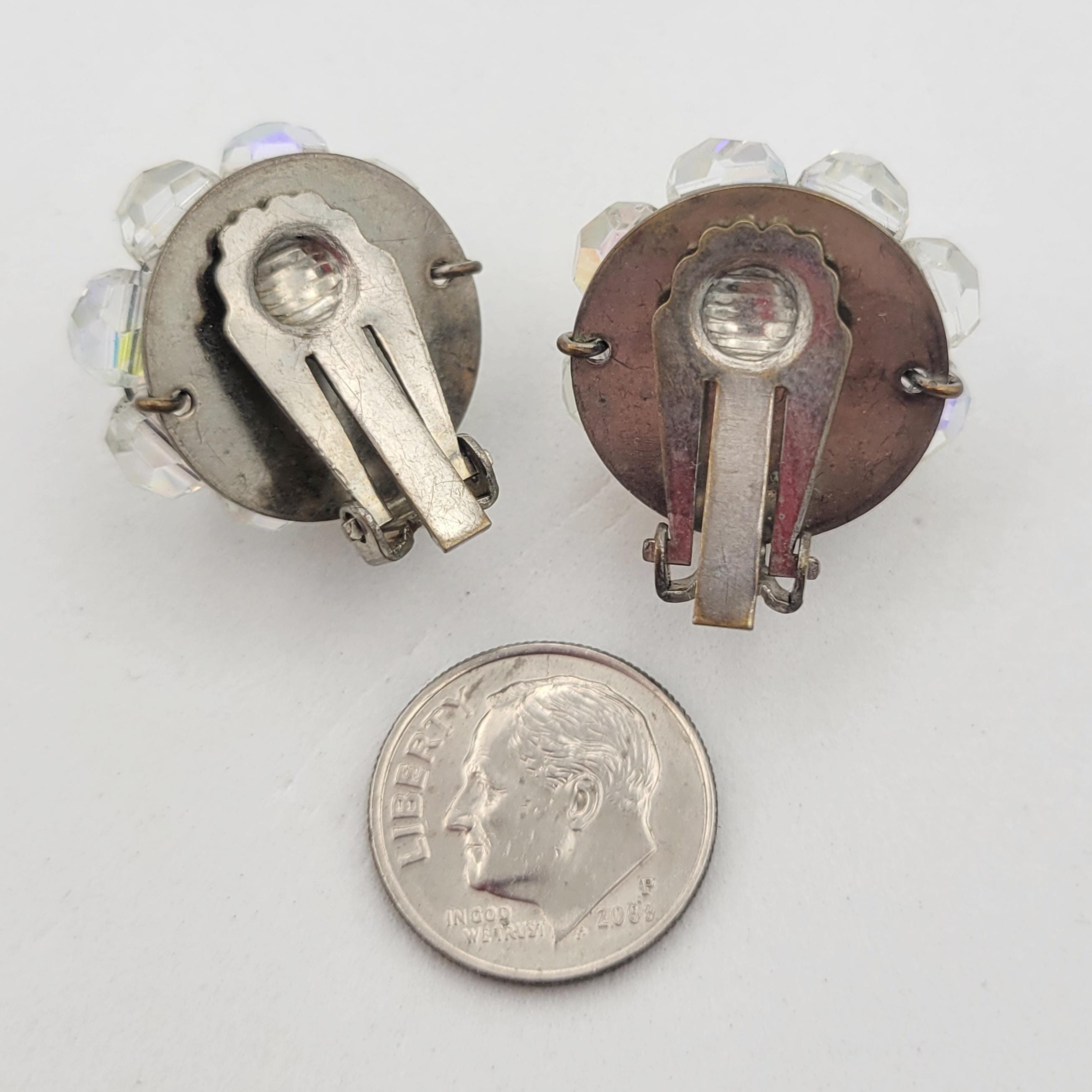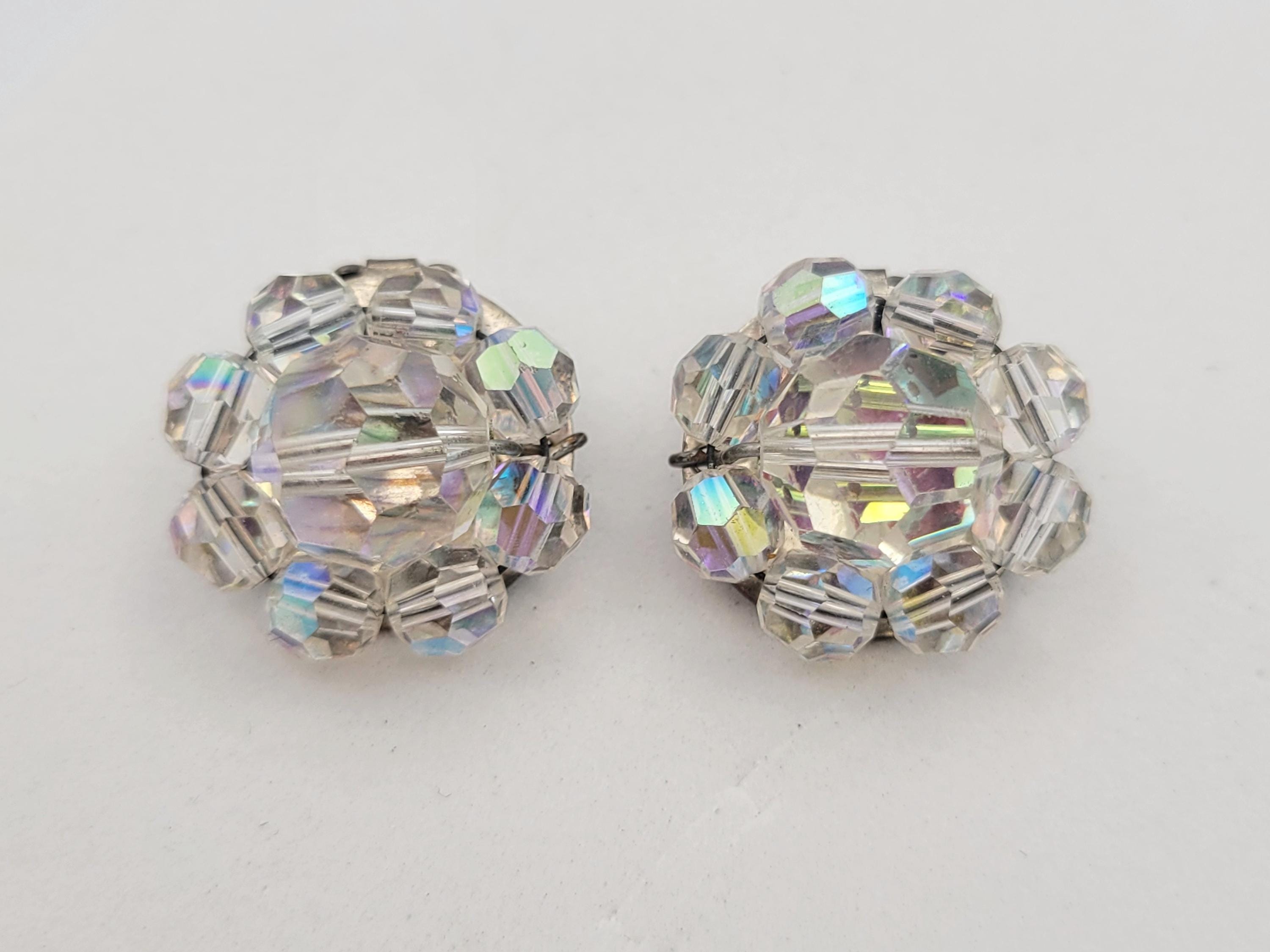 These chunky earrings will add some sparkle to your ensemble! The silver-tone clips are affixed to a cluster of sparkling clear faceted plastic beads. The beads form a round or floral shape & have an iridescent sheen. These earrings are in excellent vintage condition with very little wear.