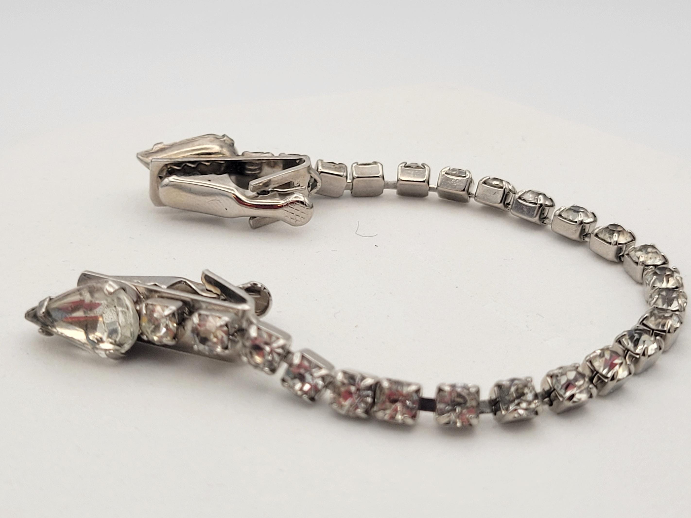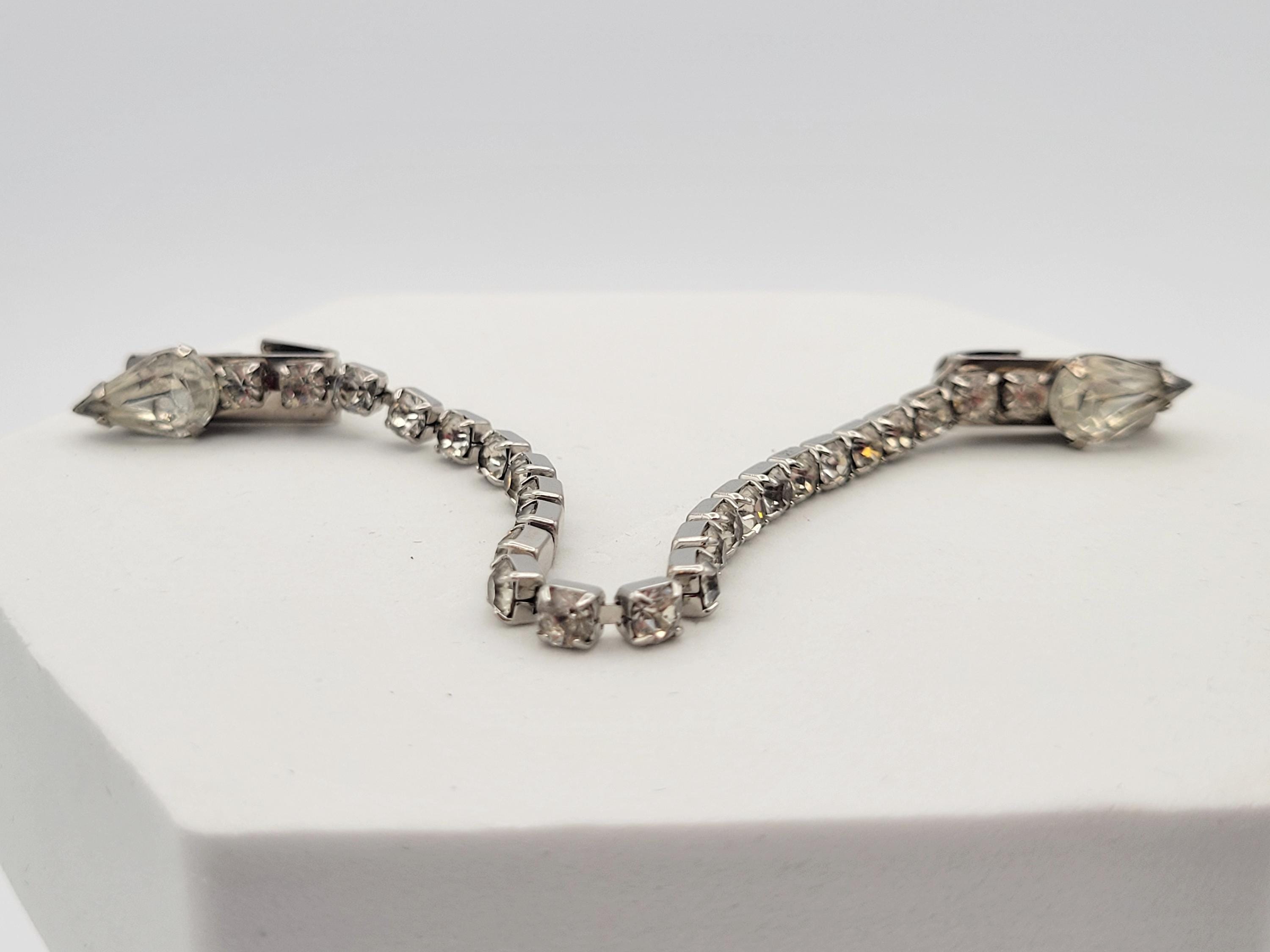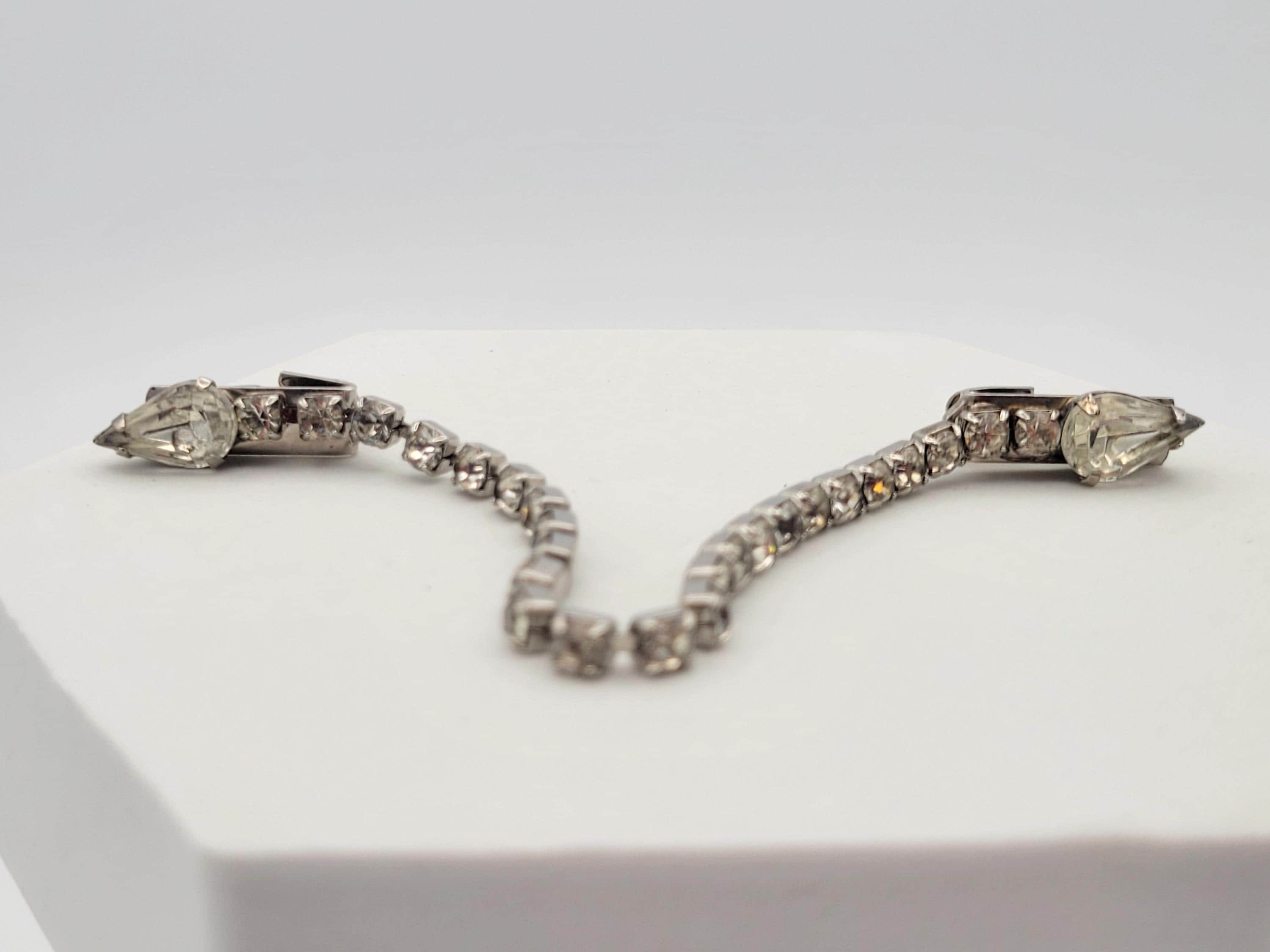 This elegant sweater clip makes a great vintage statement piece. The piece is made by two silver-tone alligator clips that are adorned with large pear-shaped rhinestones. There is a chain of round rhinestones that connect the 2 clips together. This piece is in excellent, nearly new condition.