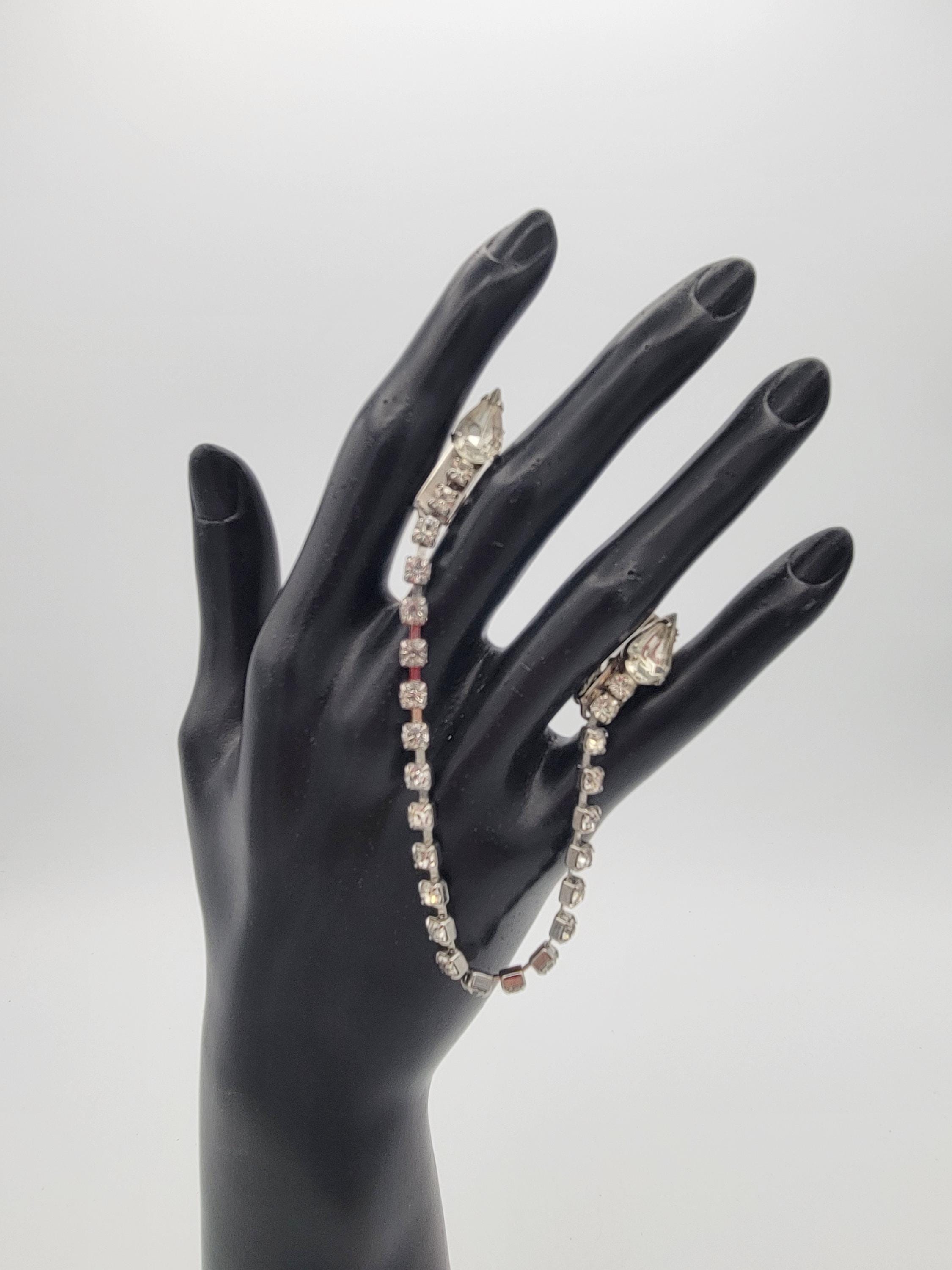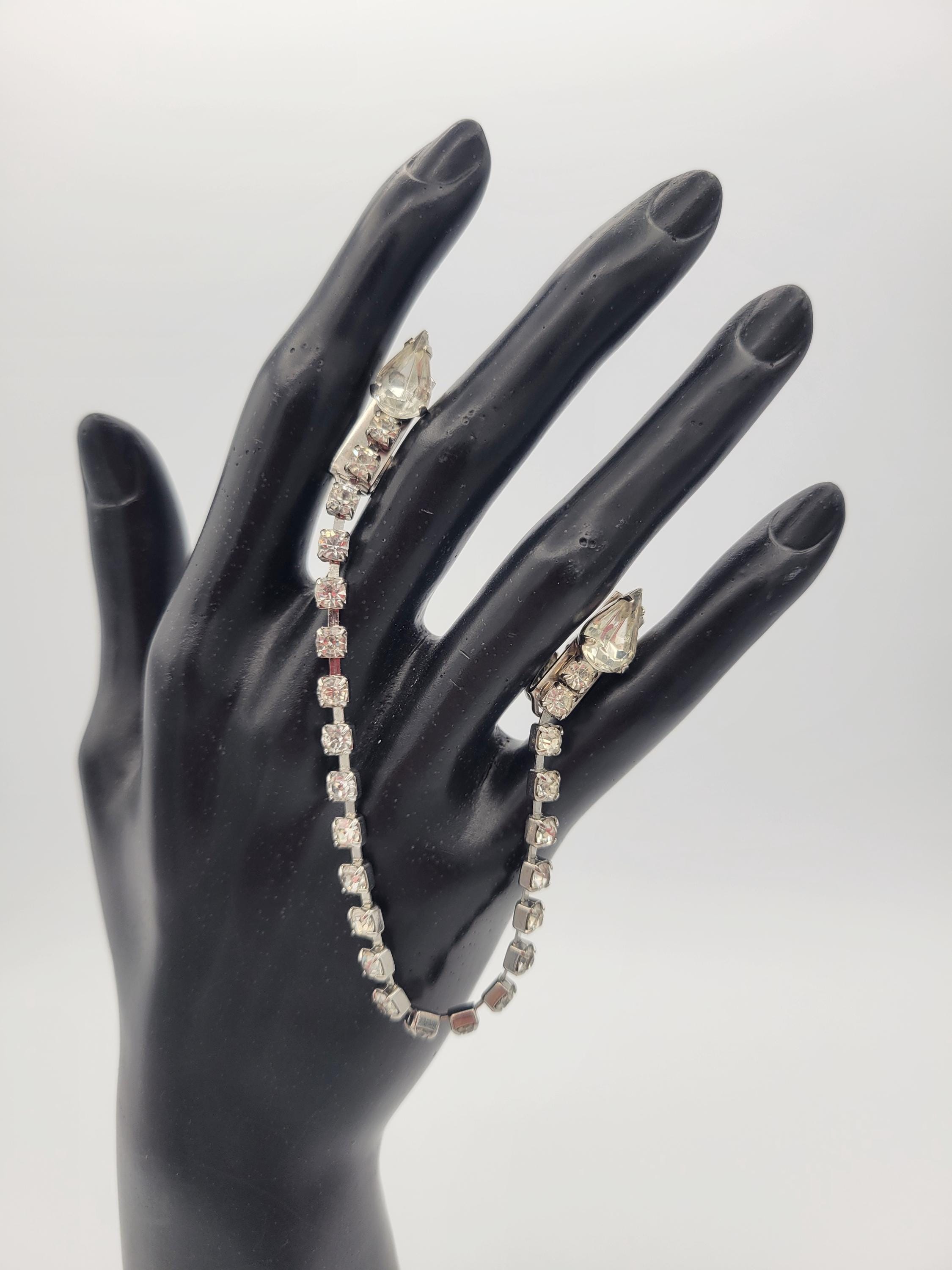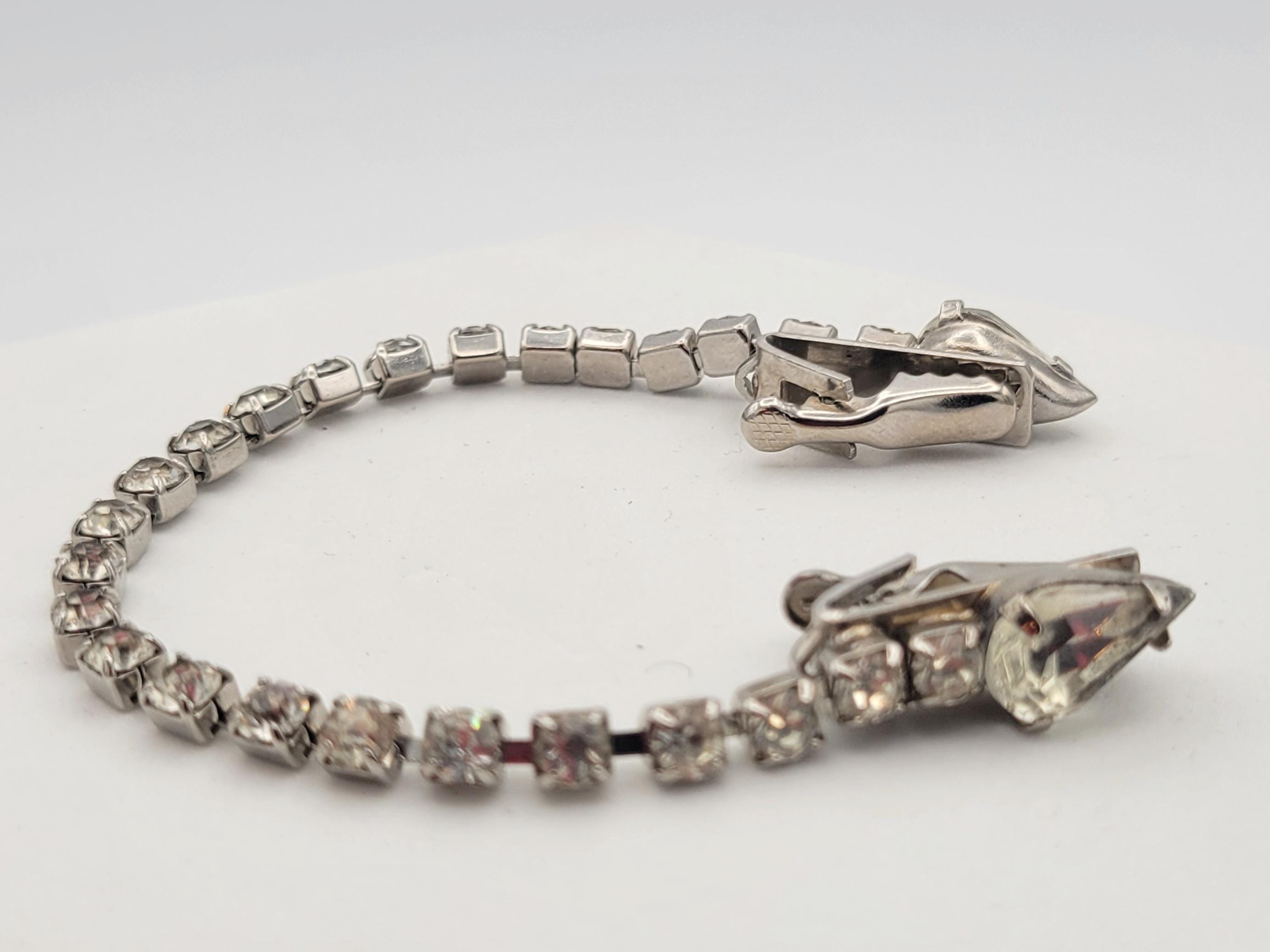 This elegant sweater clip makes a great vintage statement piece. The piece is made by two silver-tone alligator clips that are adorned with large pear-shaped rhinestones. There is a chain of round rhinestones that connect the 2 clips together. This piece is in excellent, nearly new condition.