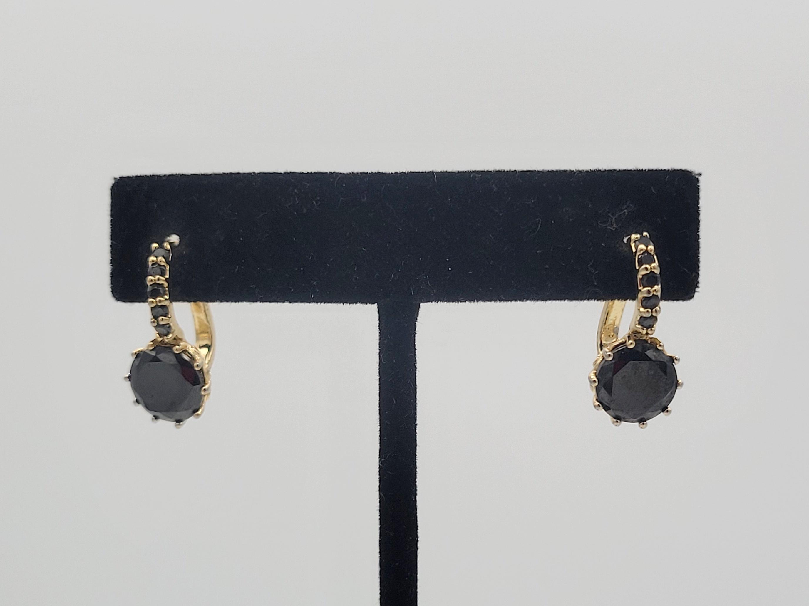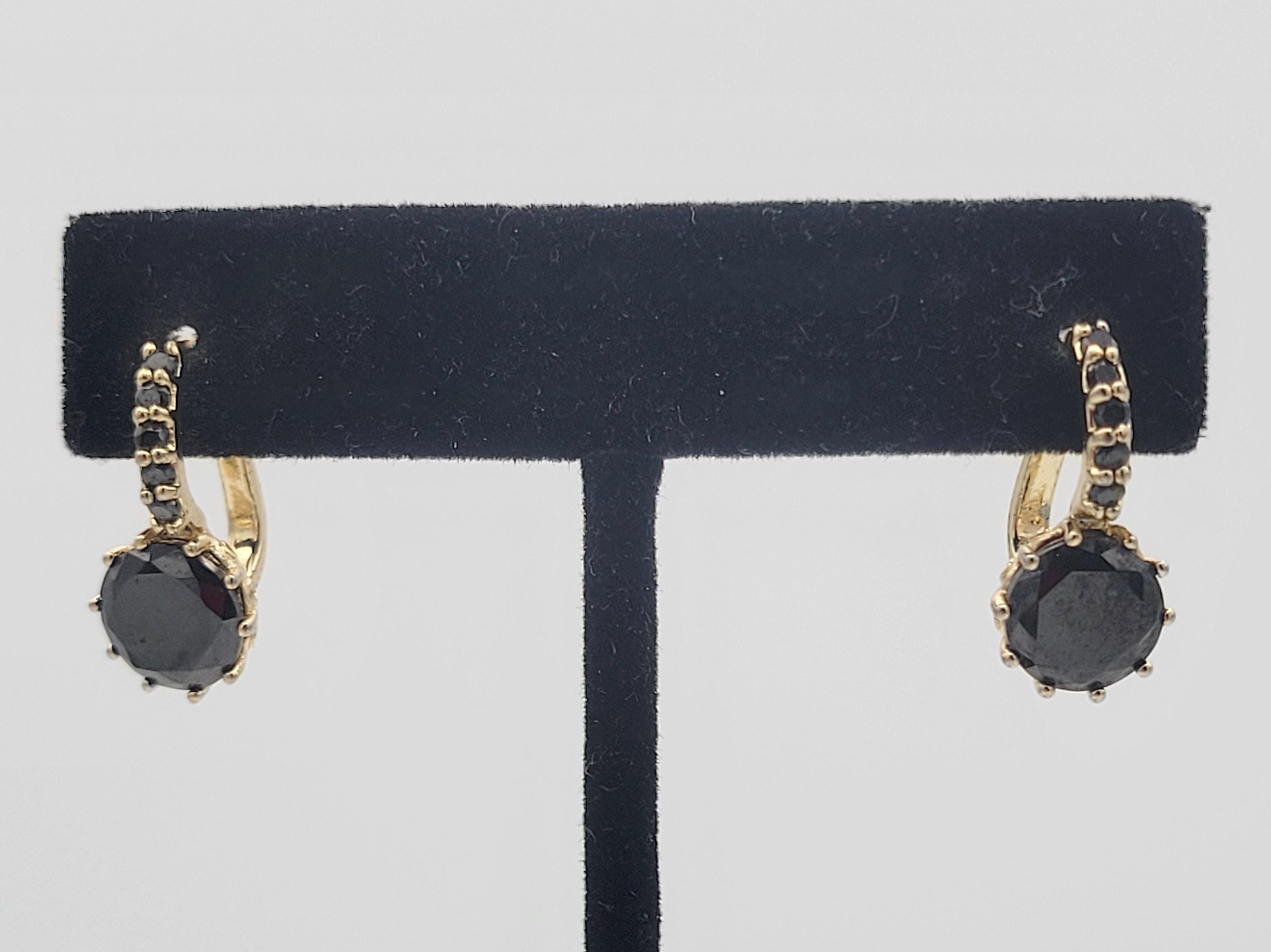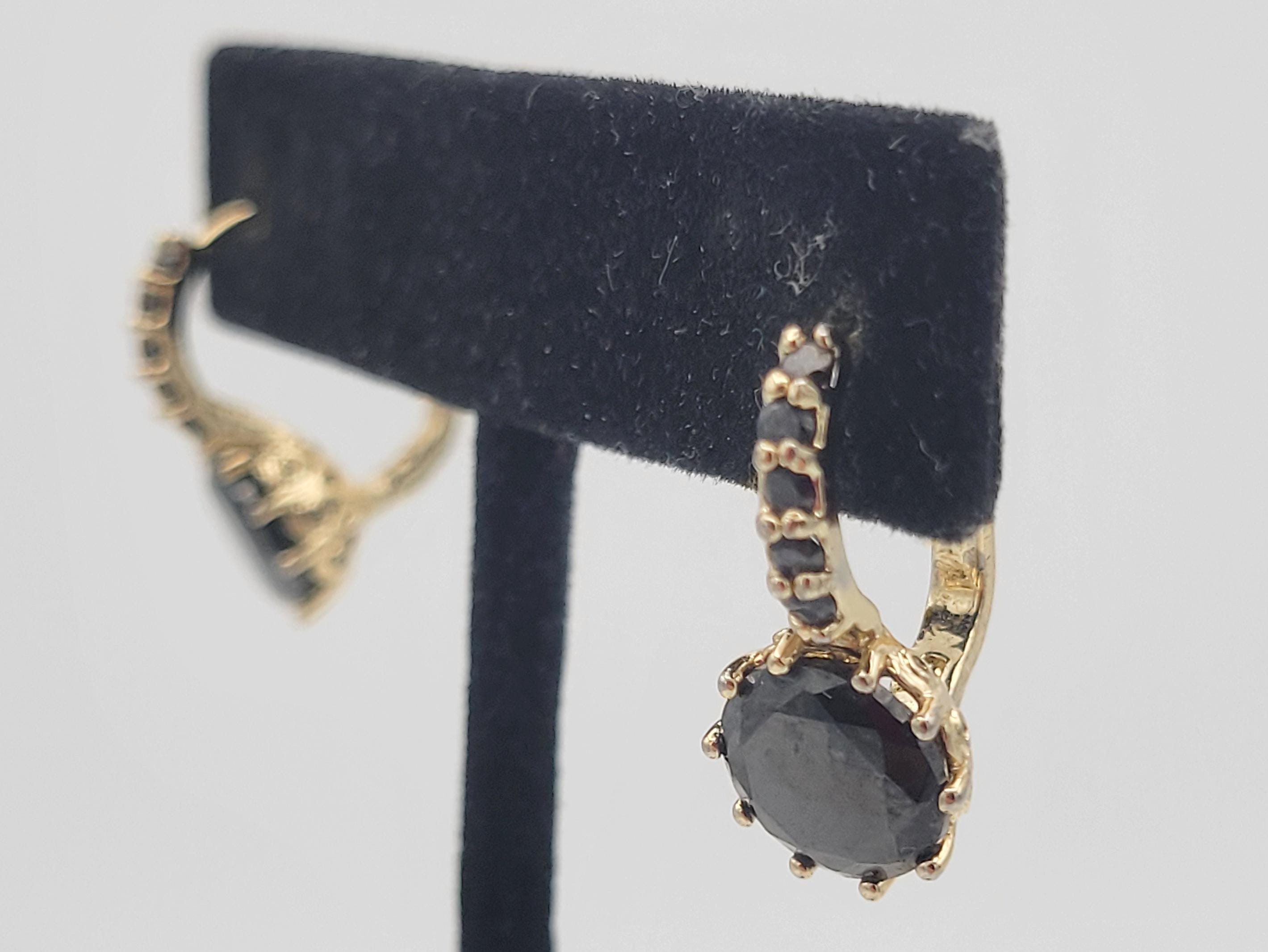 These shining earrings make great accent pieces. The gold-tone earrings form a loop & are encrusted with black faceted rhinestones. A larger black rhinestone is at the end of each earring. The earrings secure with a latch-back closure. These earrings are in excellent, nearly new condition.