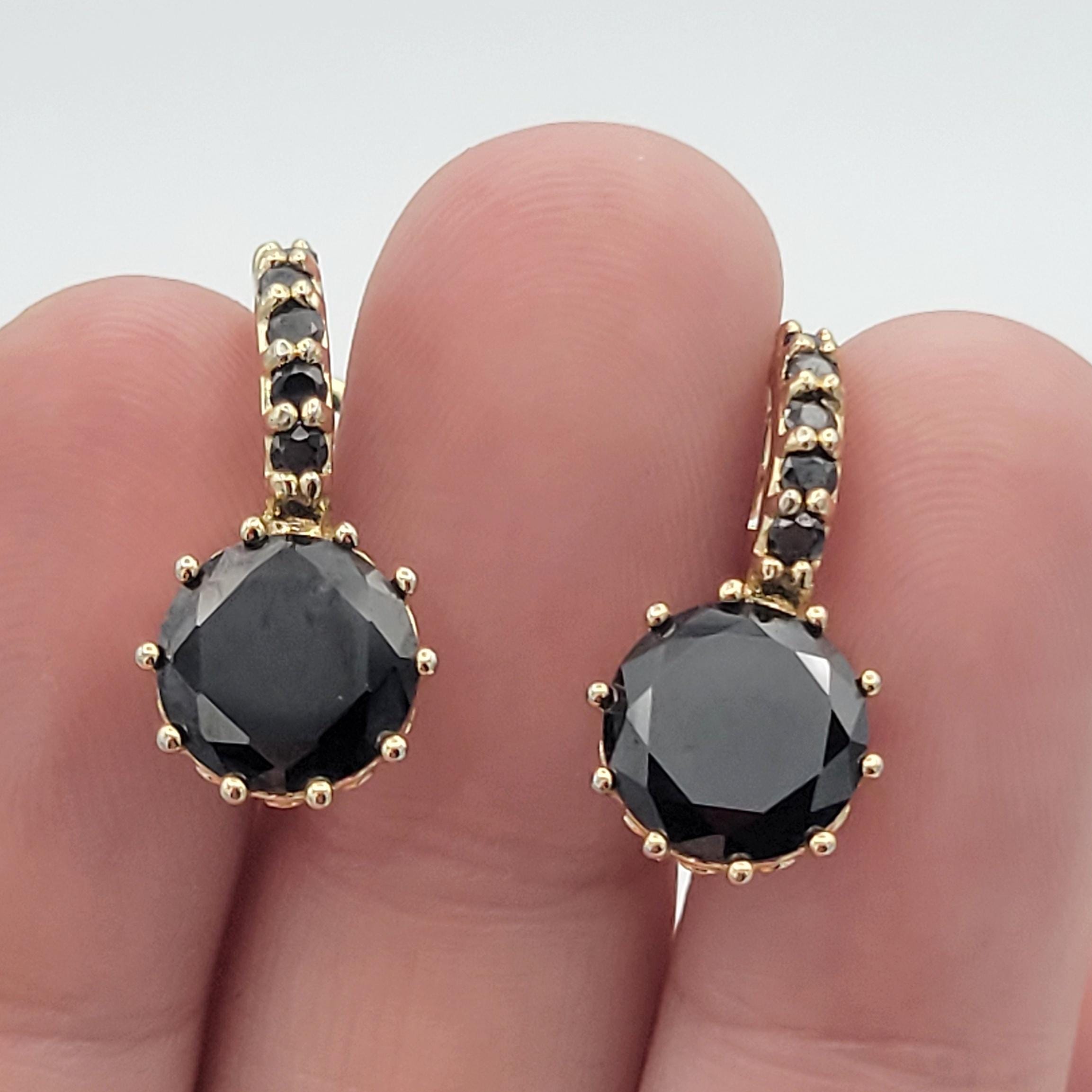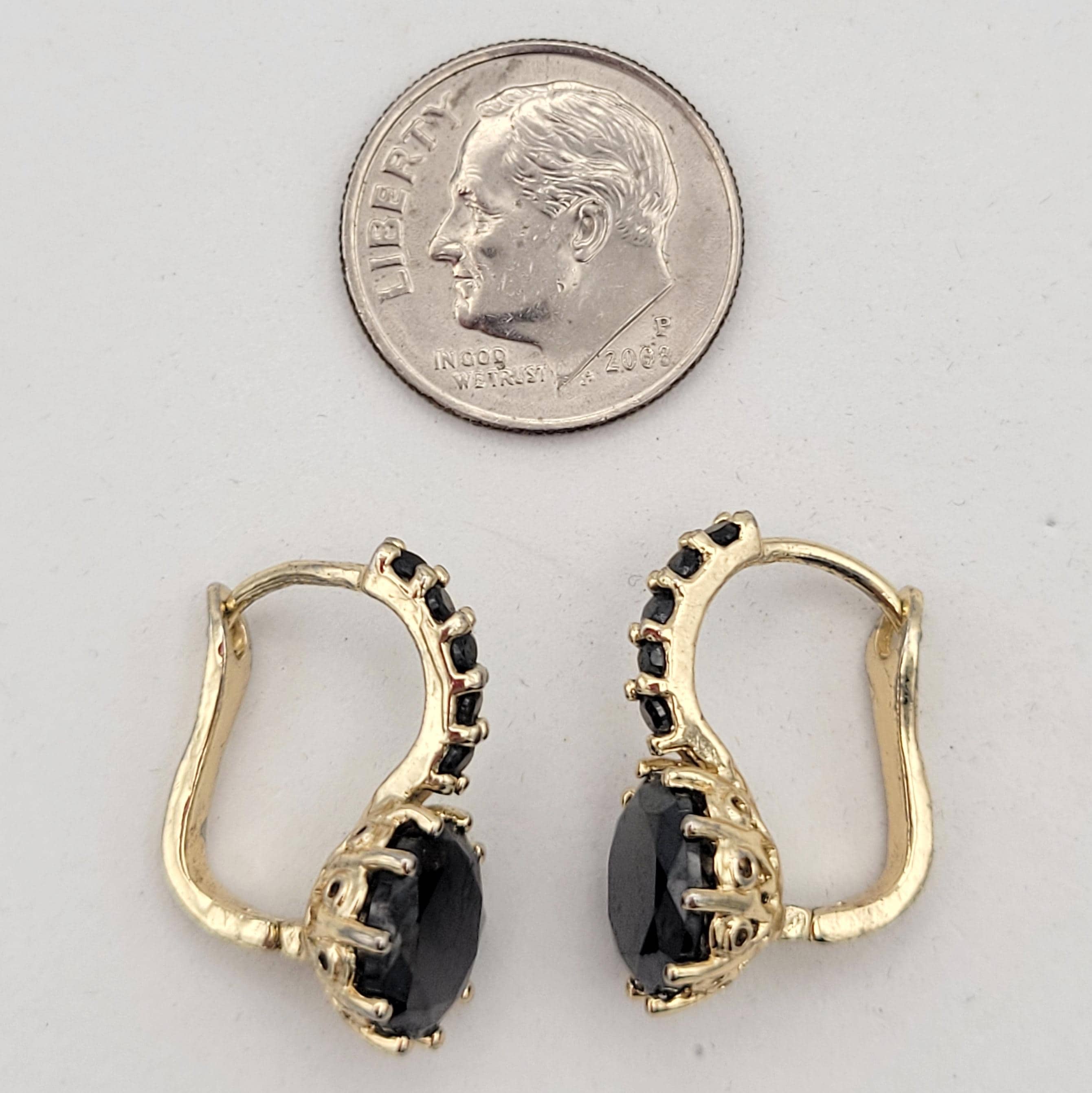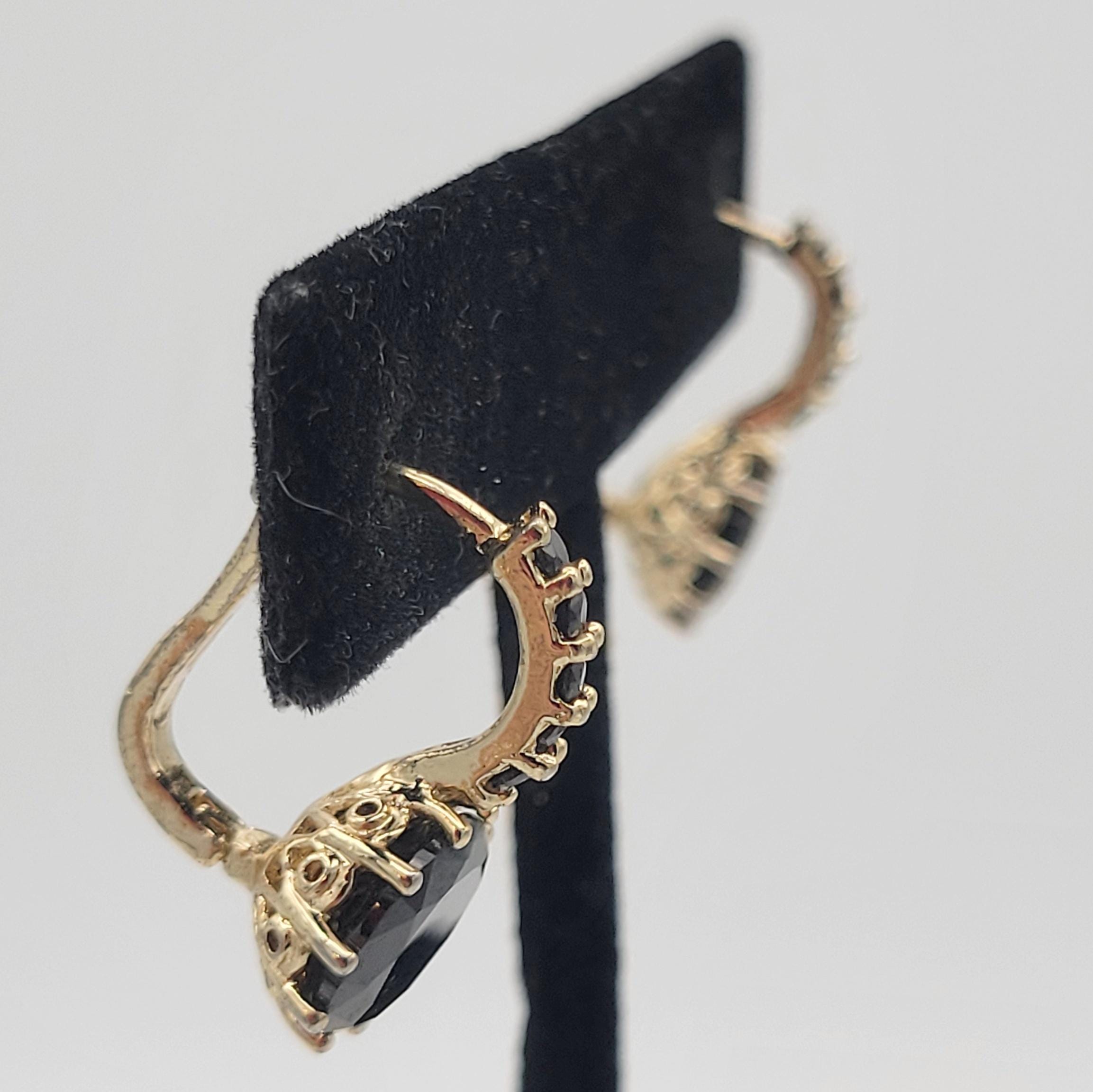 These shining earrings make great accent pieces. The gold-tone earrings form a loop & are encrusted with black faceted rhinestones. A larger black rhinestone is at the end of each earring. The earrings secure with a latch-back closure. These earrings are in excellent, nearly new condition.
