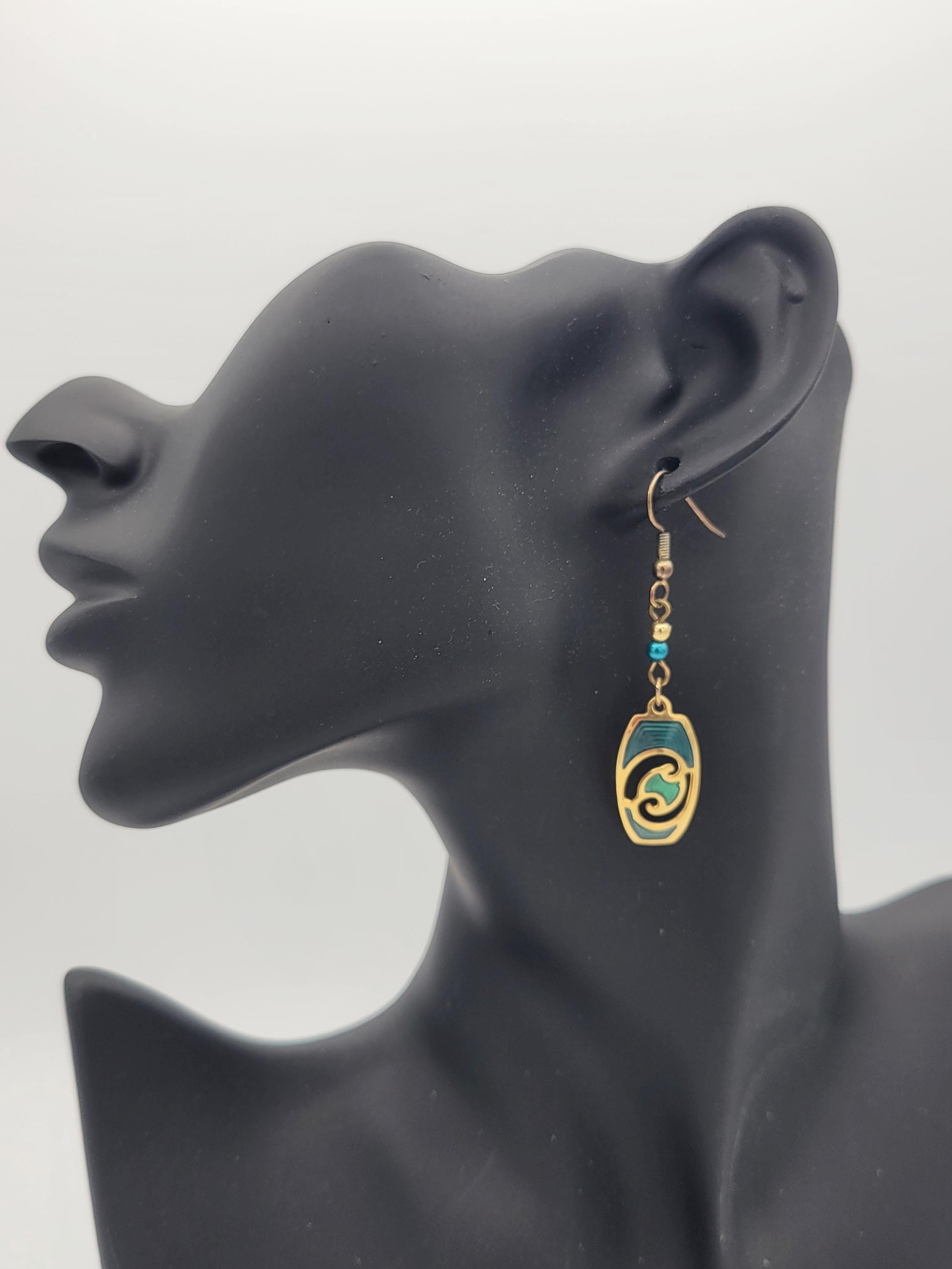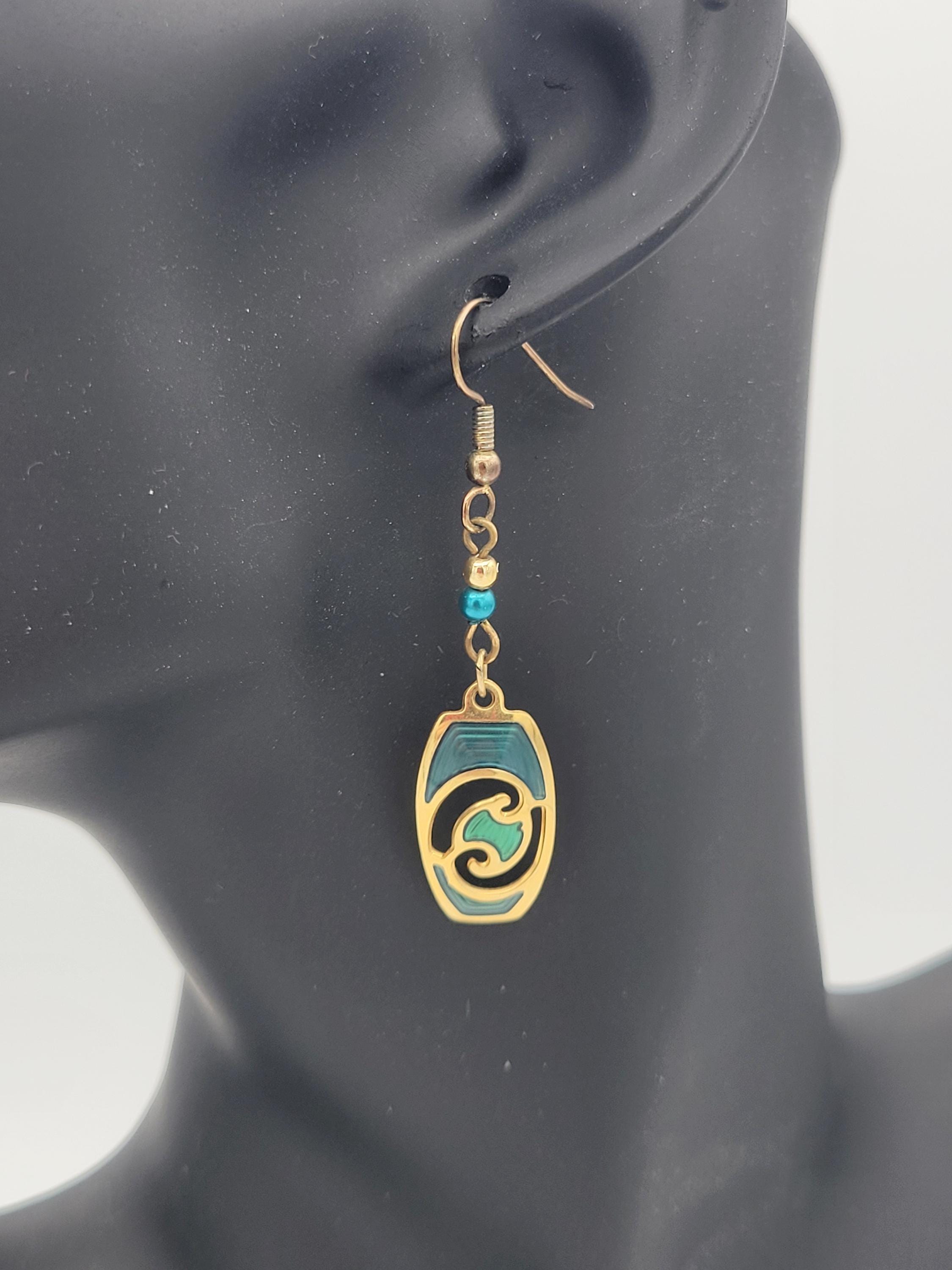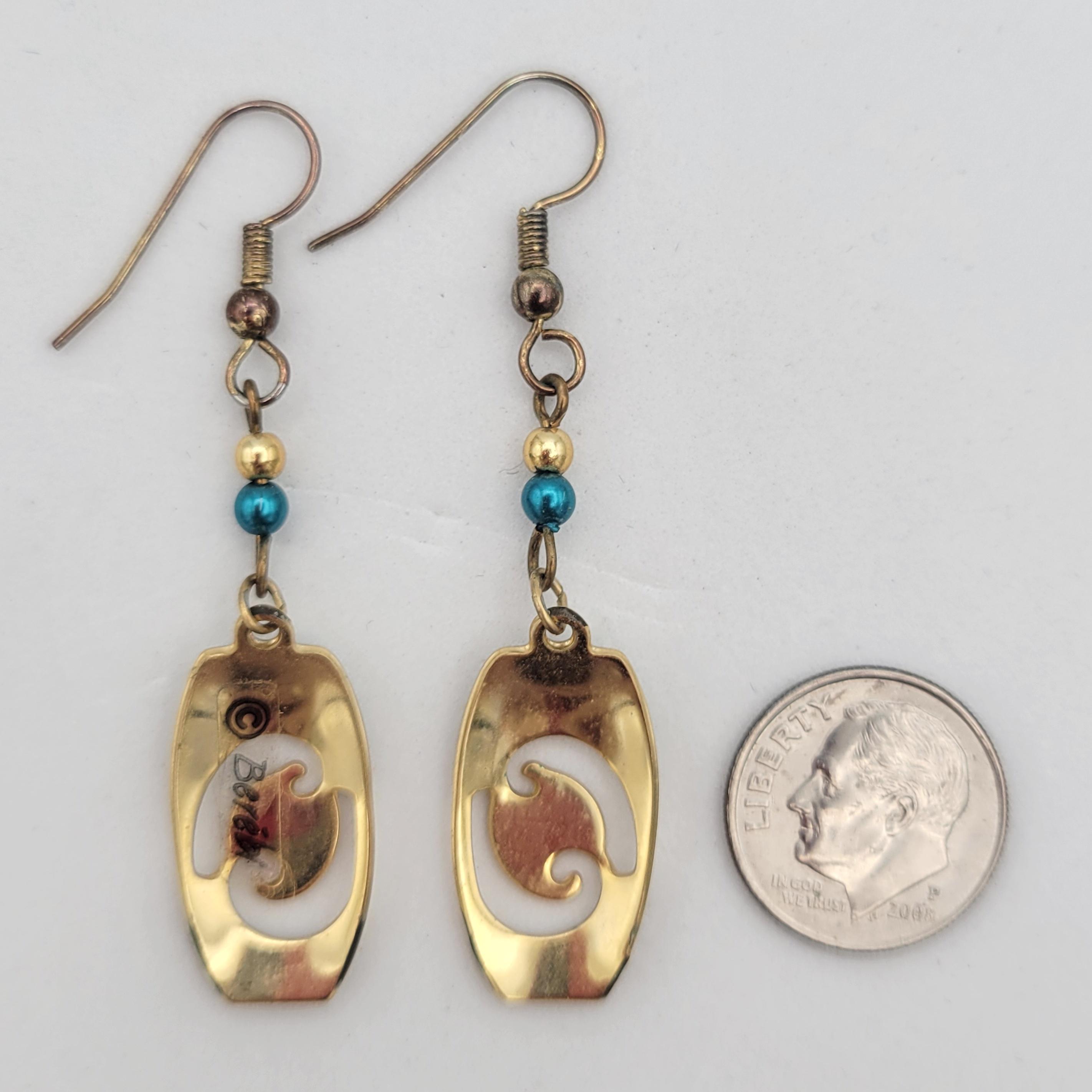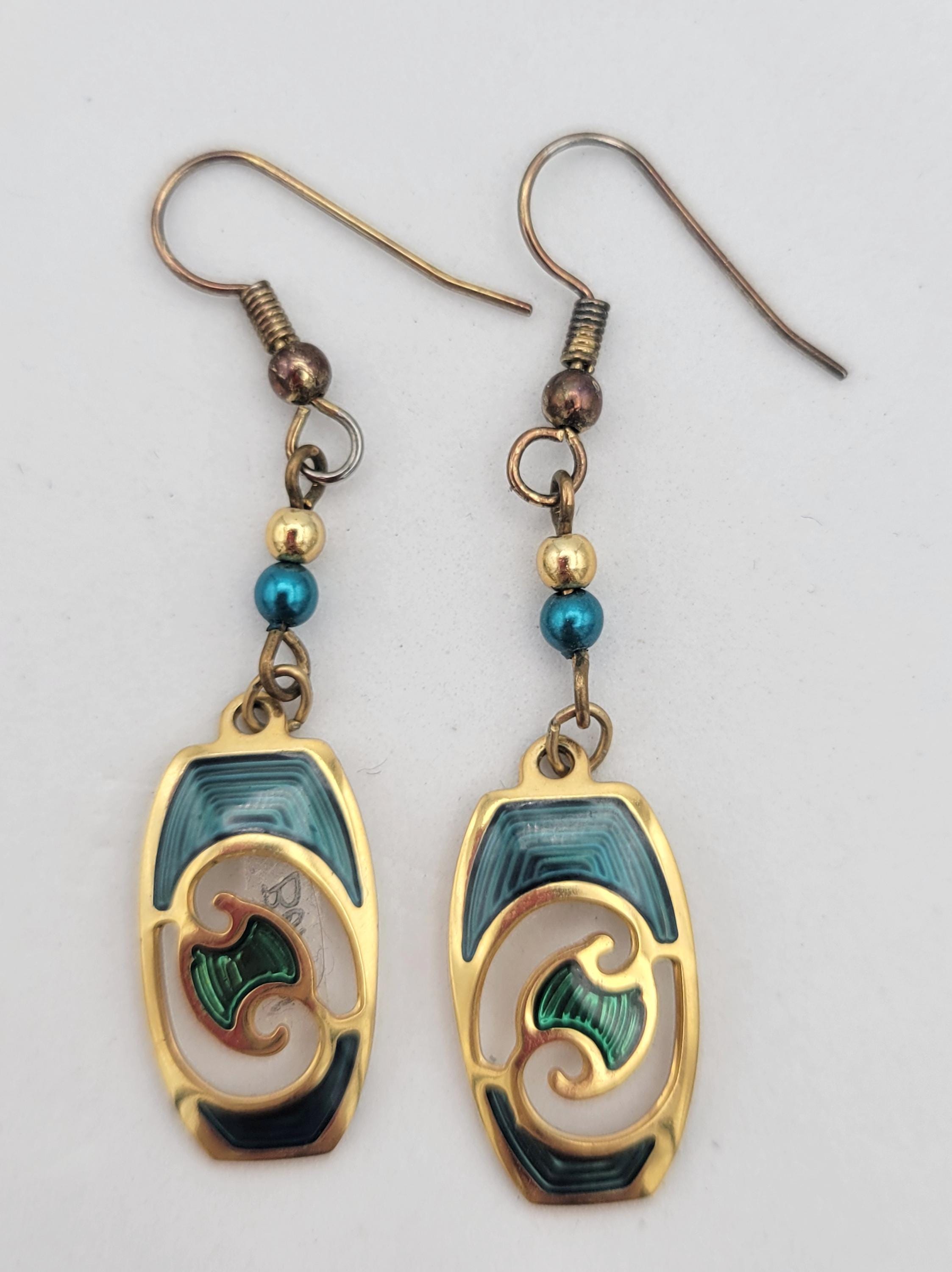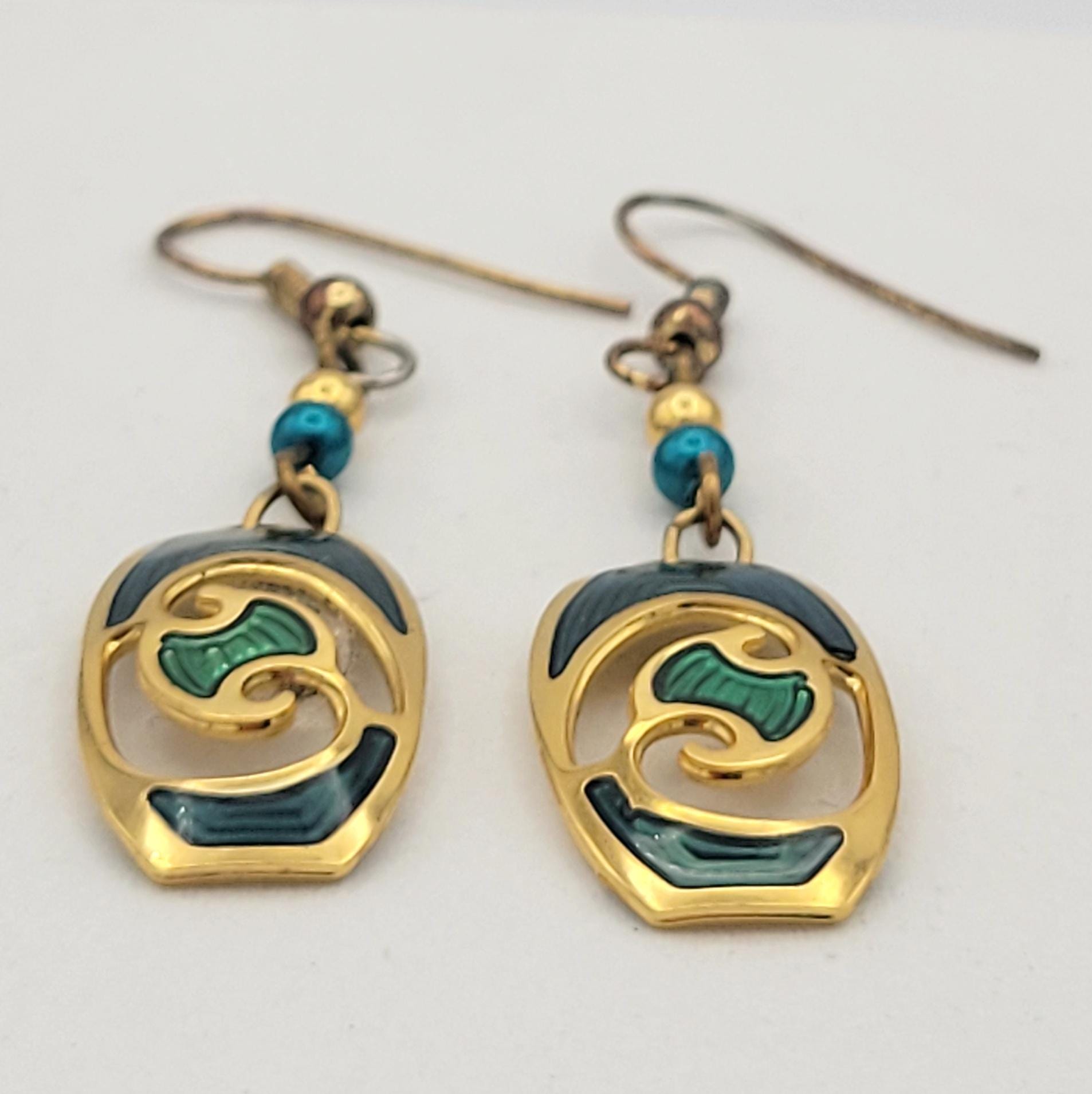 These unique earrings from Berebi have a great retro look. The lightweight earrings form a rounded rectangular shape with an openwork swirled center. The dangles are filled with teal enamel & are accented by gold-tone & teal beads. These earrings are in excellent, nearly new condition.