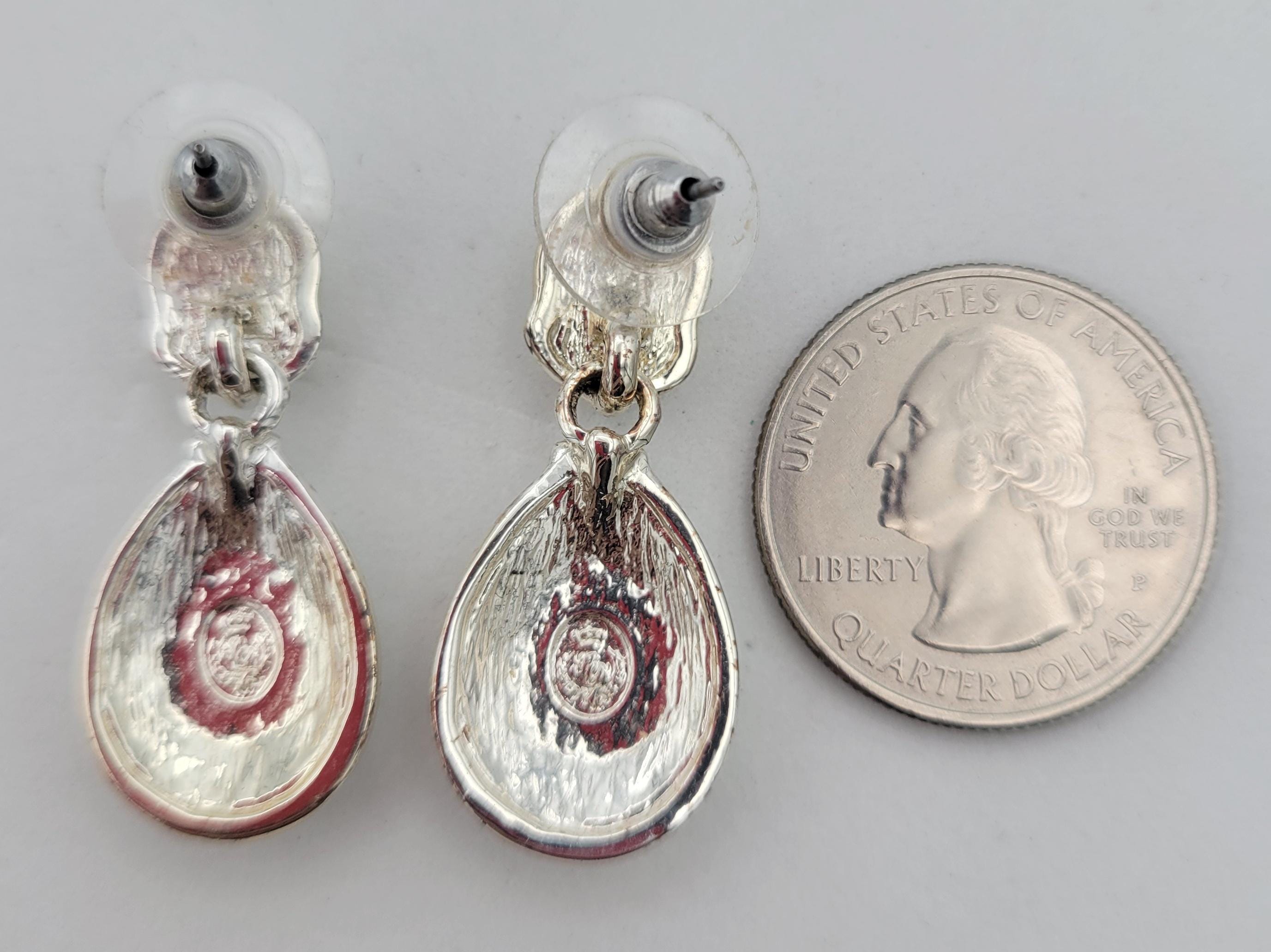 These earrings make versatile statement pieces. The earrings have form 2 teardrop shapes with a silver-tone chrome-finished base & a gold-tone nailhead textured center. They are marked with e Premier Designs logo on the back. These earrings are in excellent, nearly-new condition.