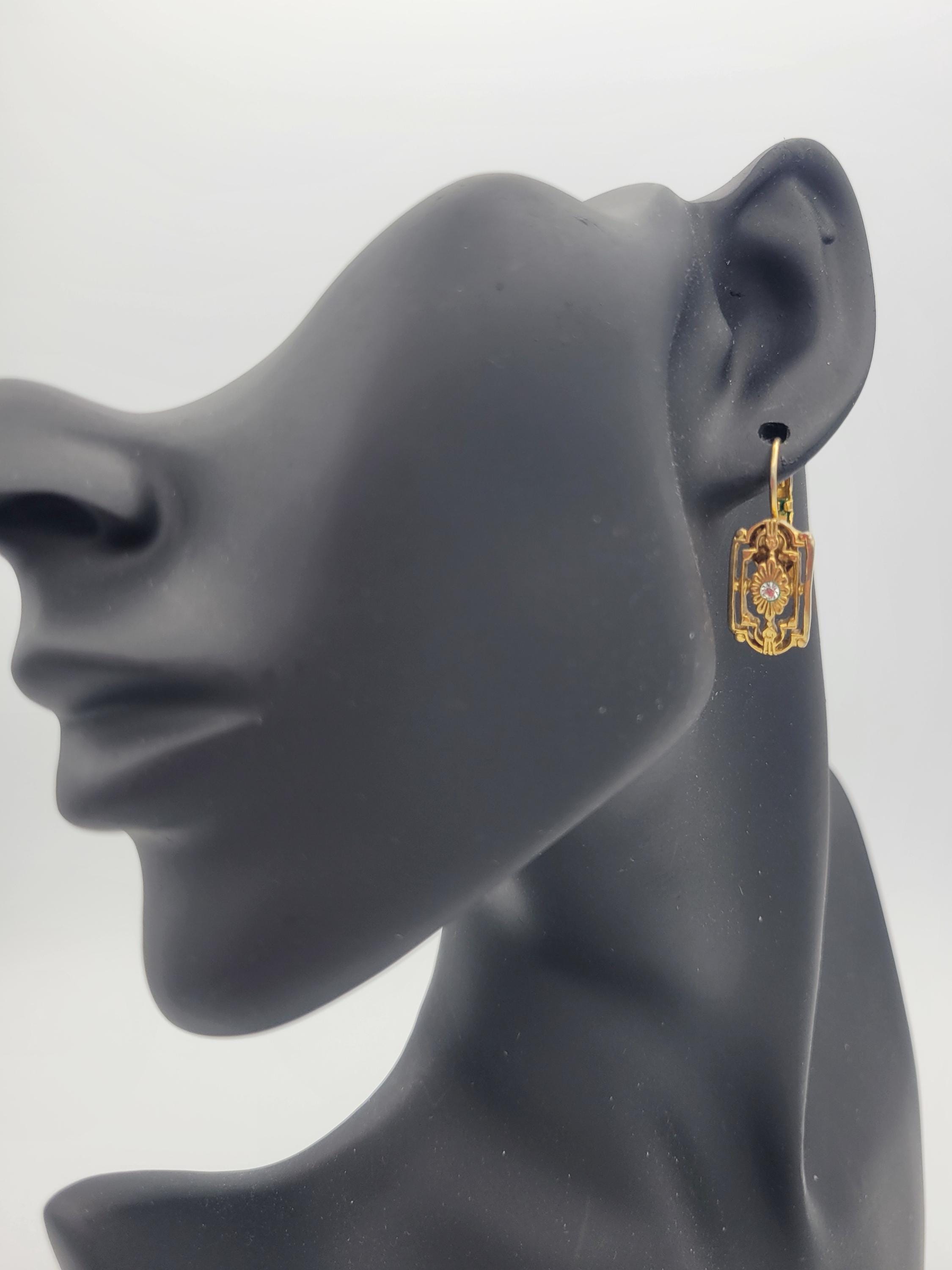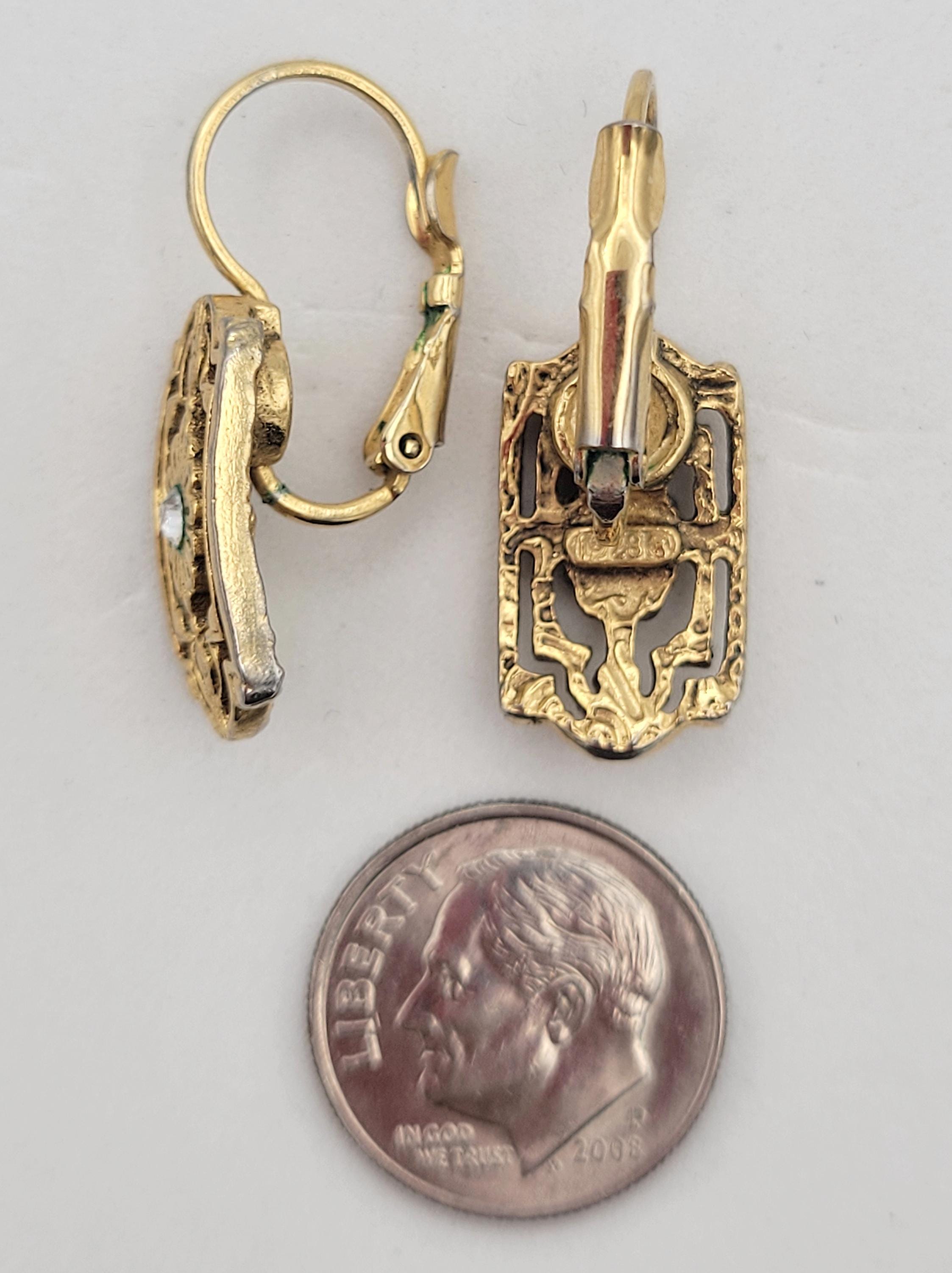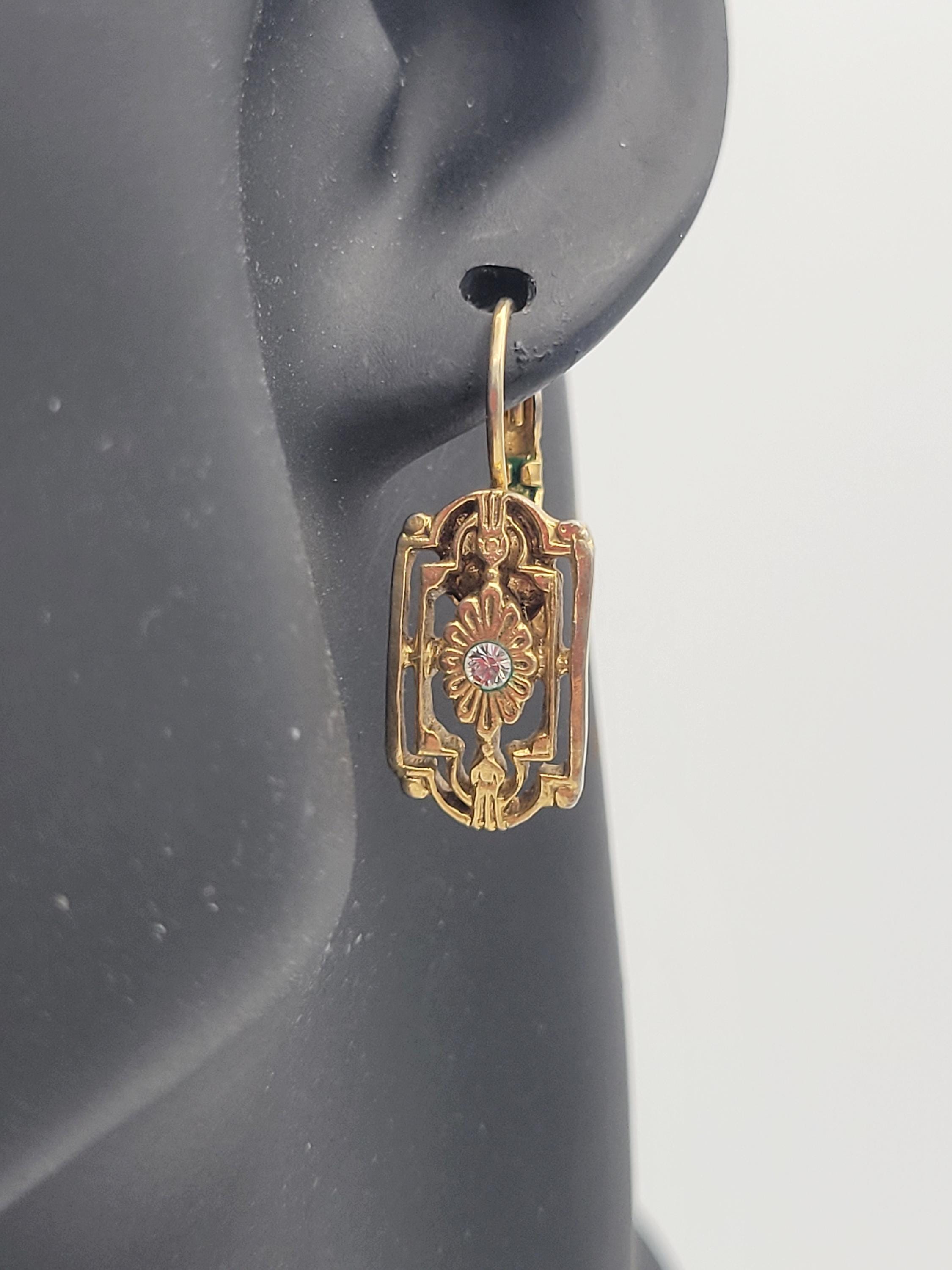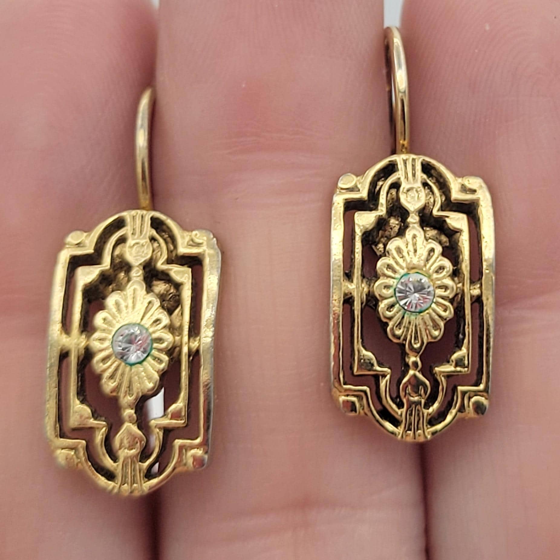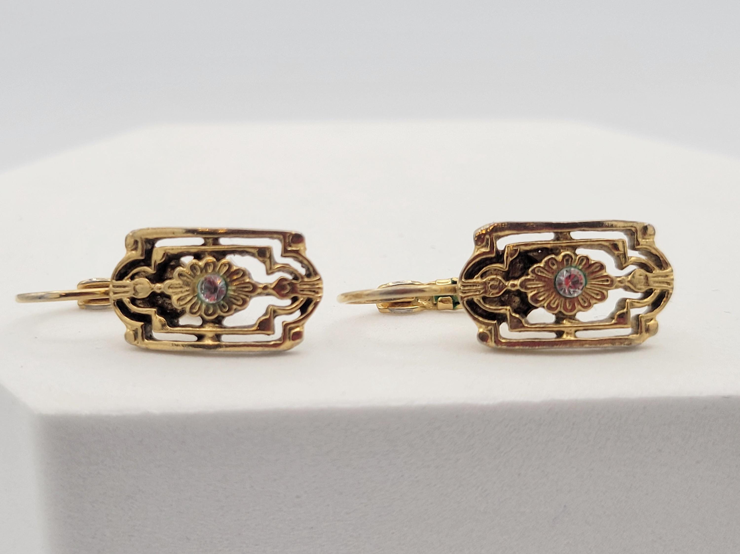 These pretty earrings have a retro design. The gold-tone lever backs are affixed to an openwork rectangular art deco shape that is accented with a rhinestone in the center. These earrings are in excellent vintage condition with very little wear.