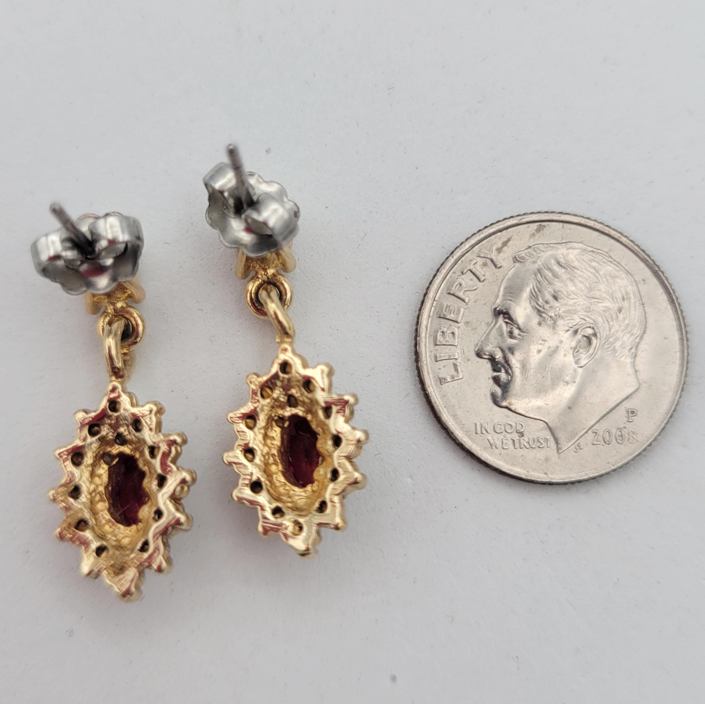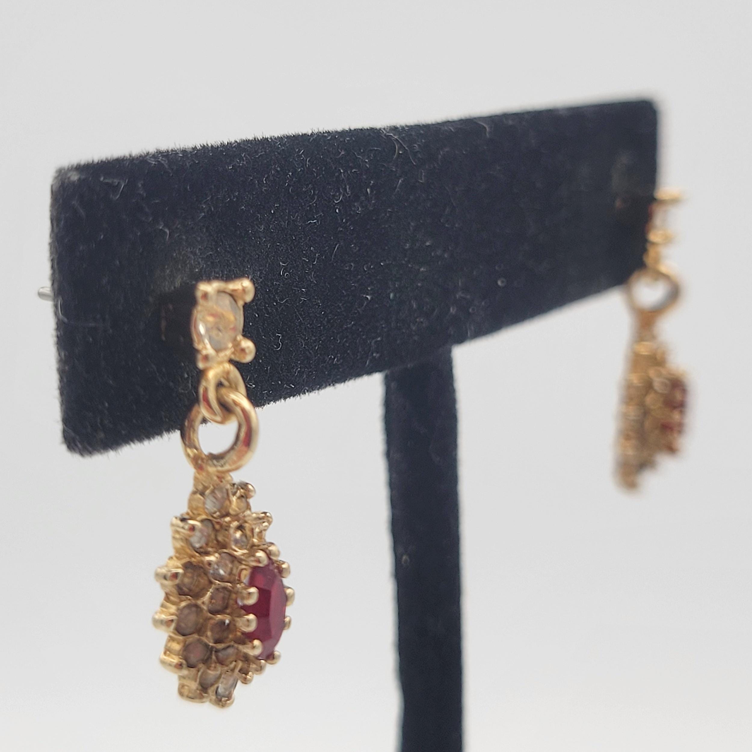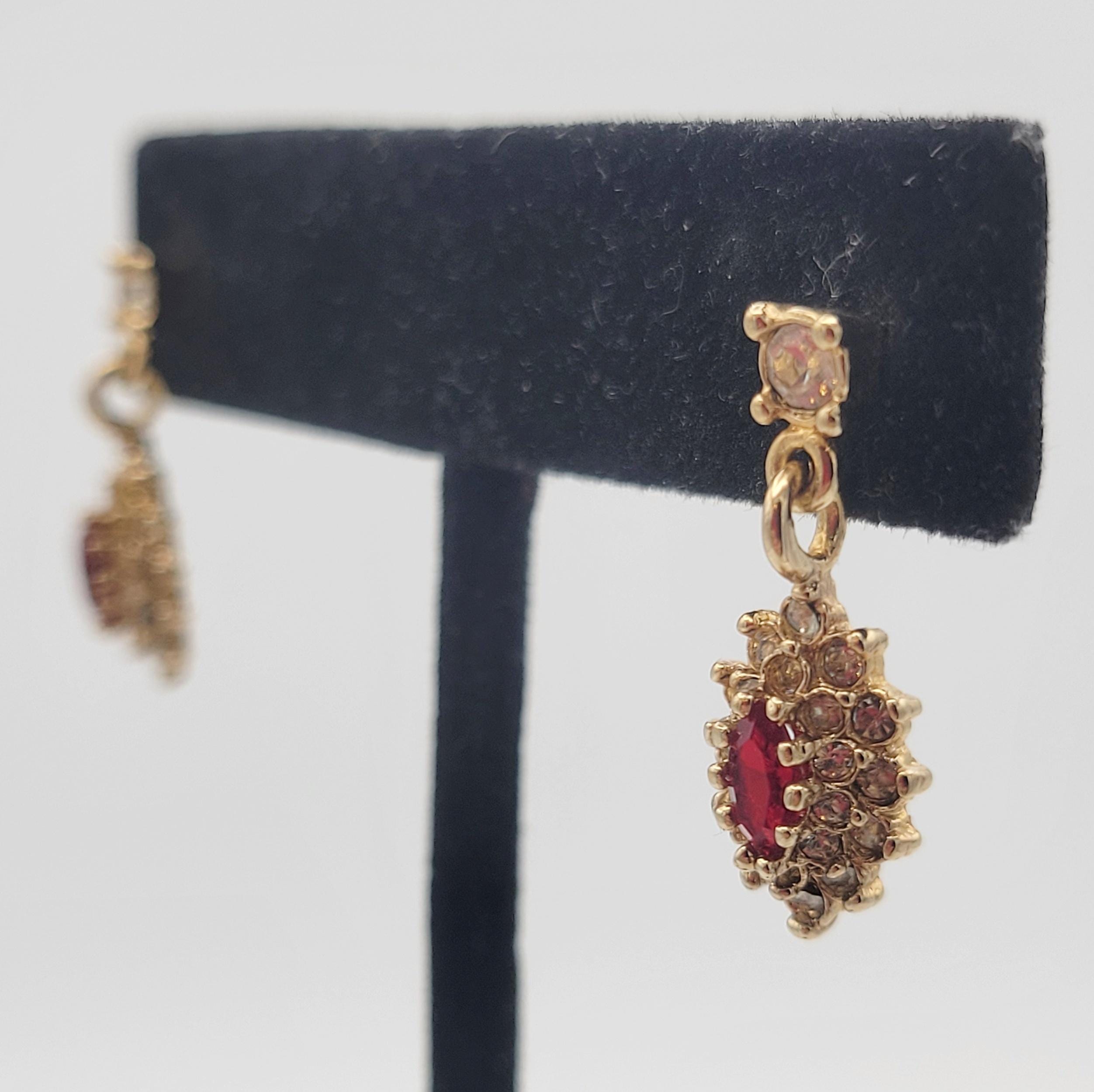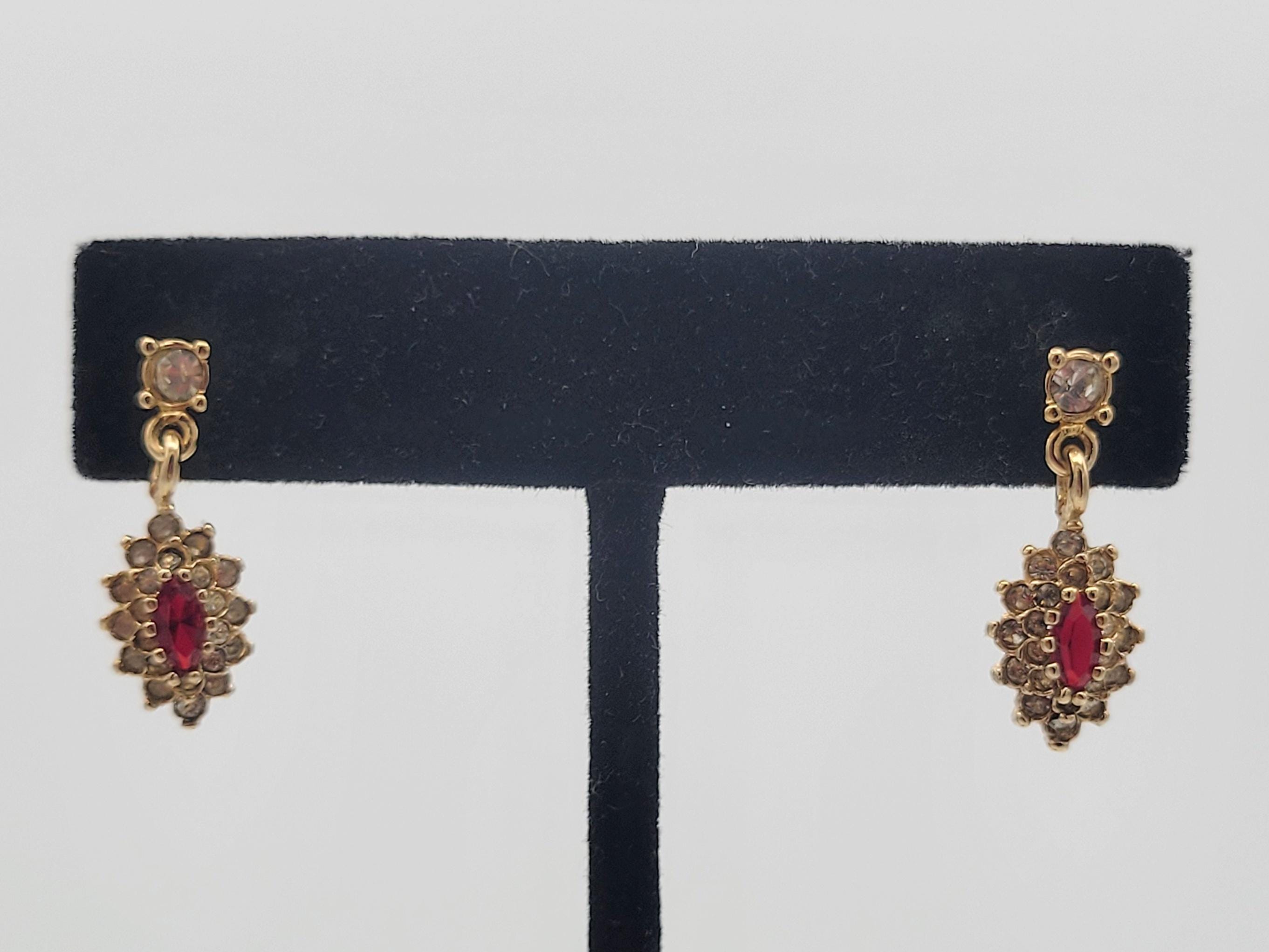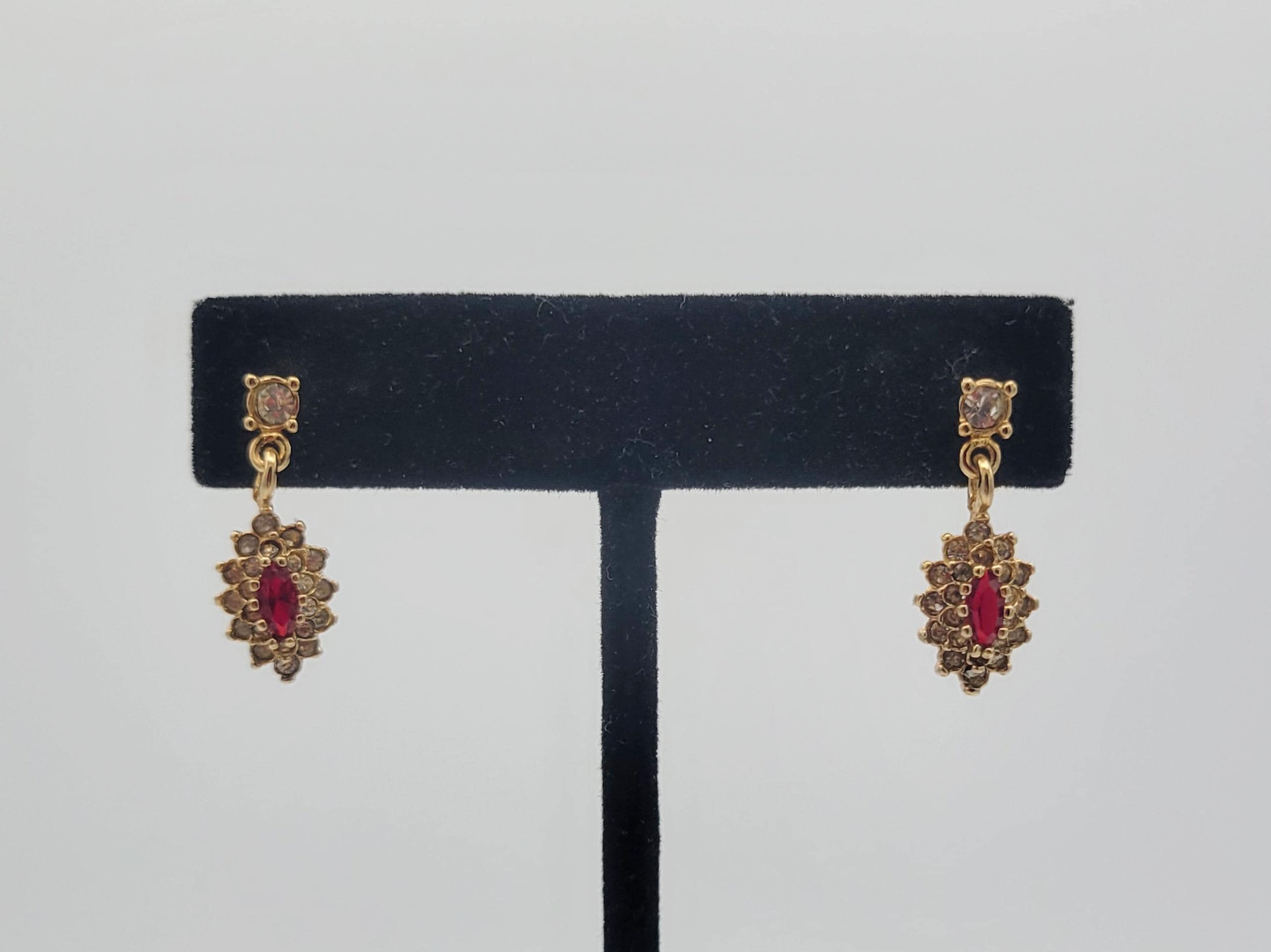 Vintage Gold Tone Oval Rhinestone Encrusted Dangle Earrings with Faux Ruby Marquise Stone