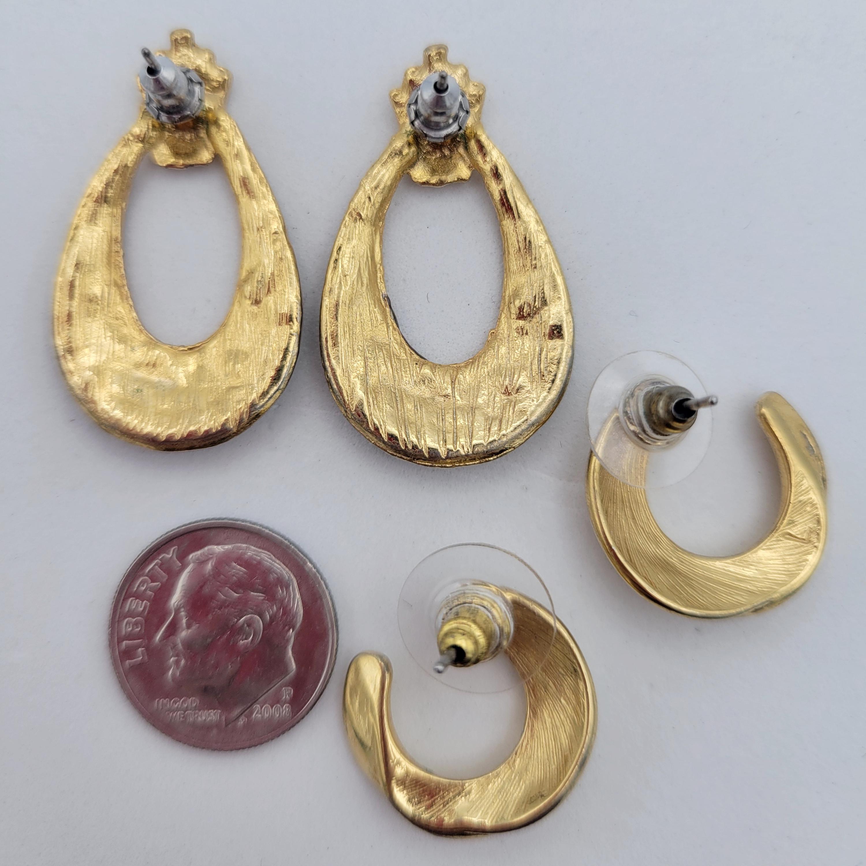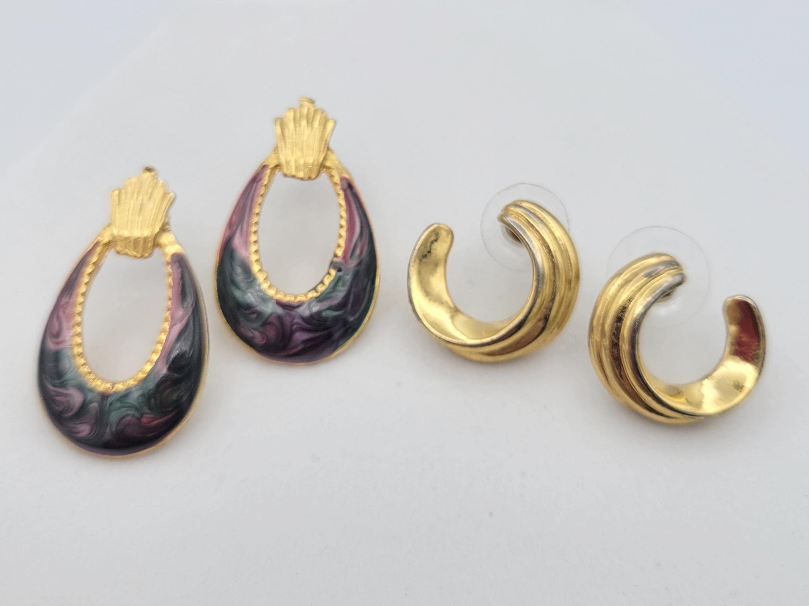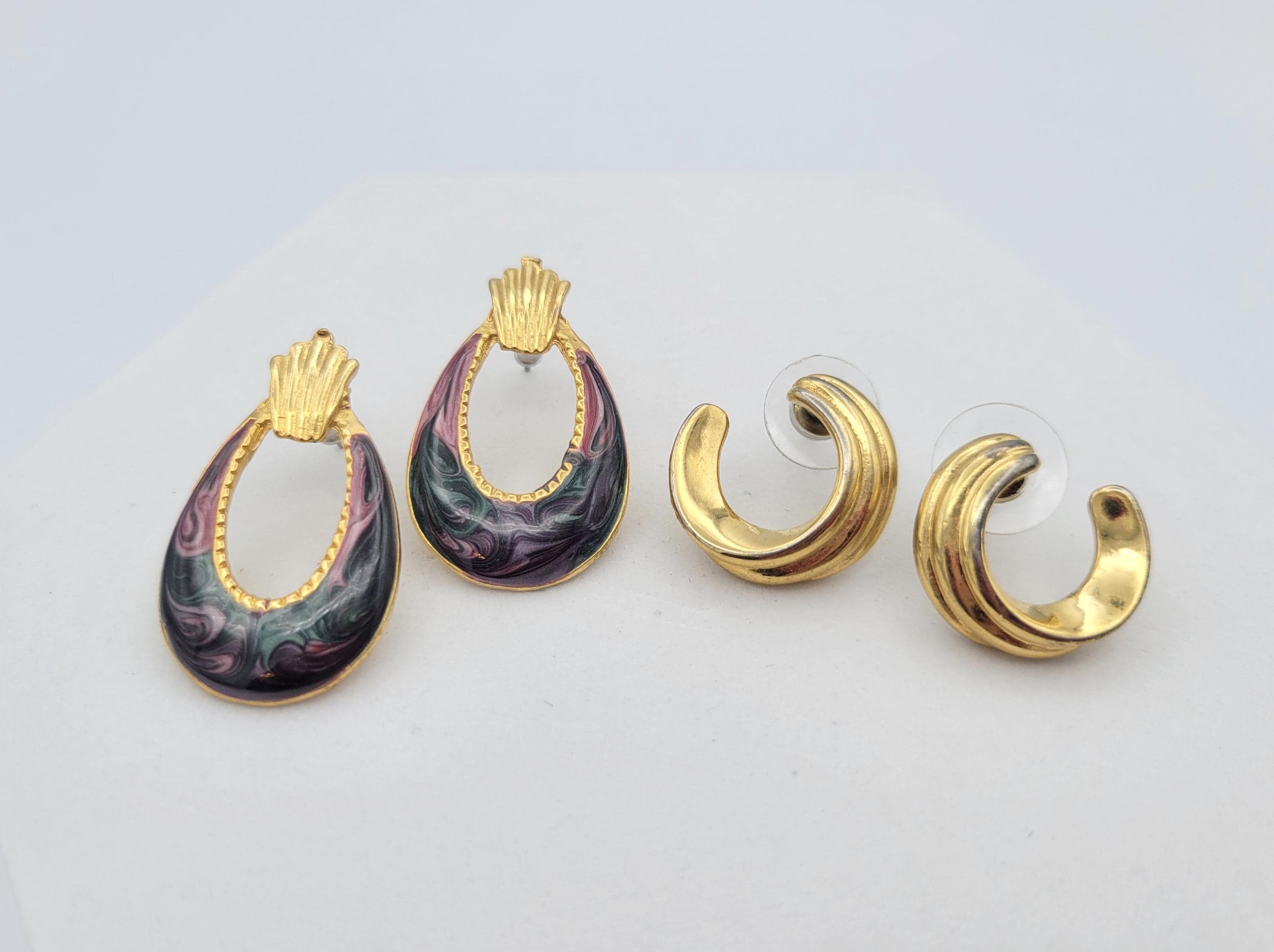 Two Pairs of Vintage 1990s Gold Tone Earrings Swirled Enamel Door Knocker Style & Curved