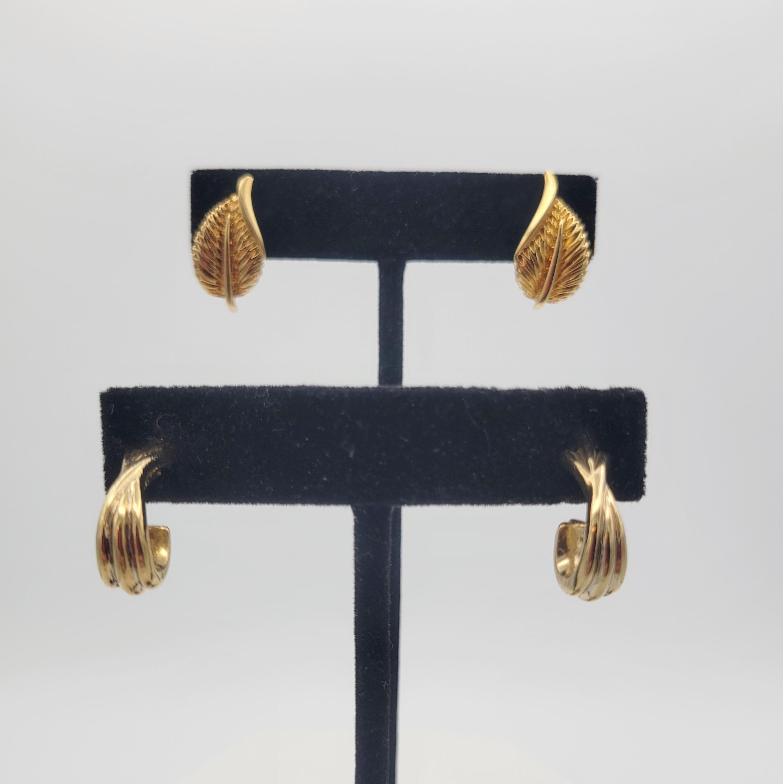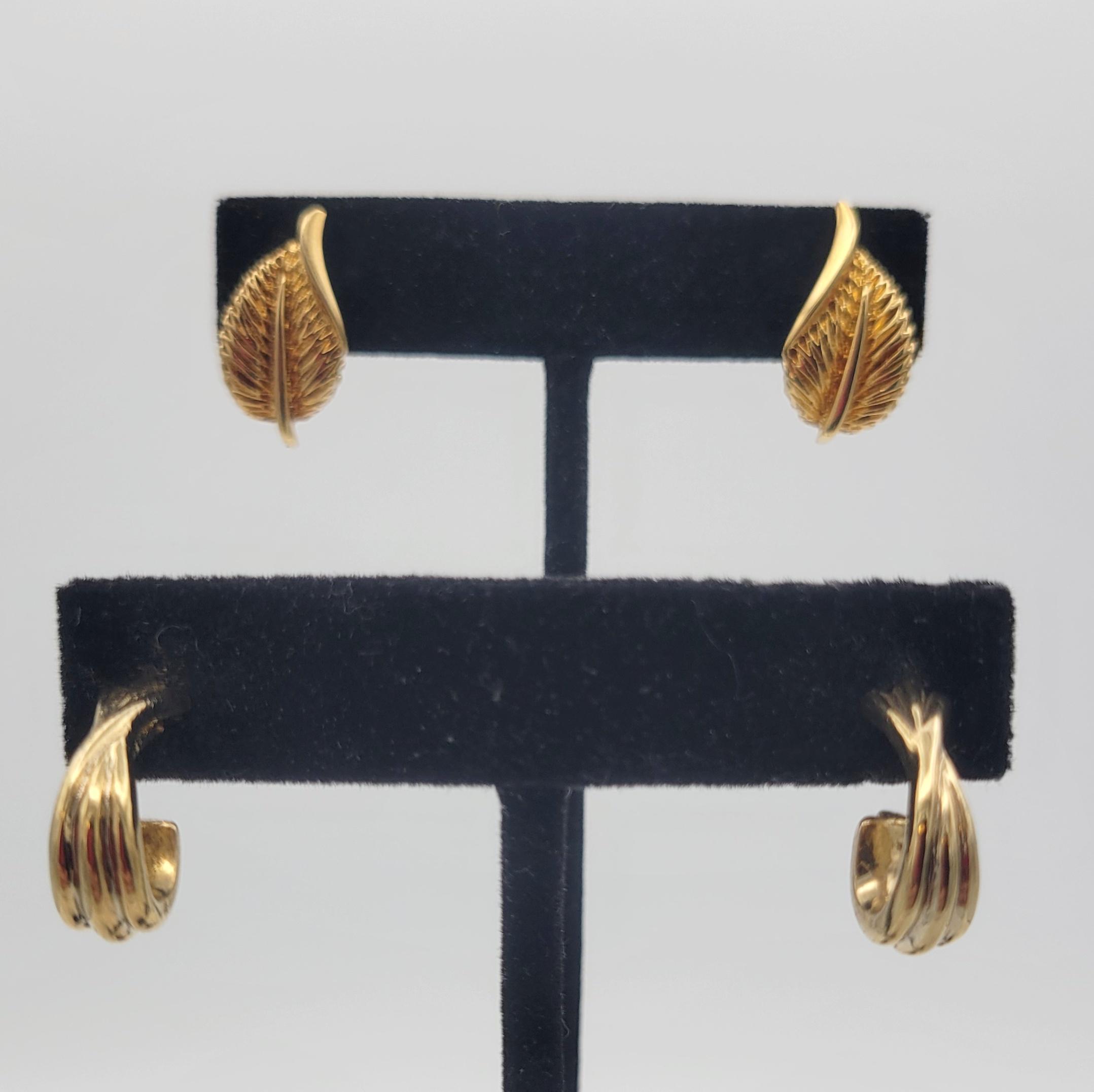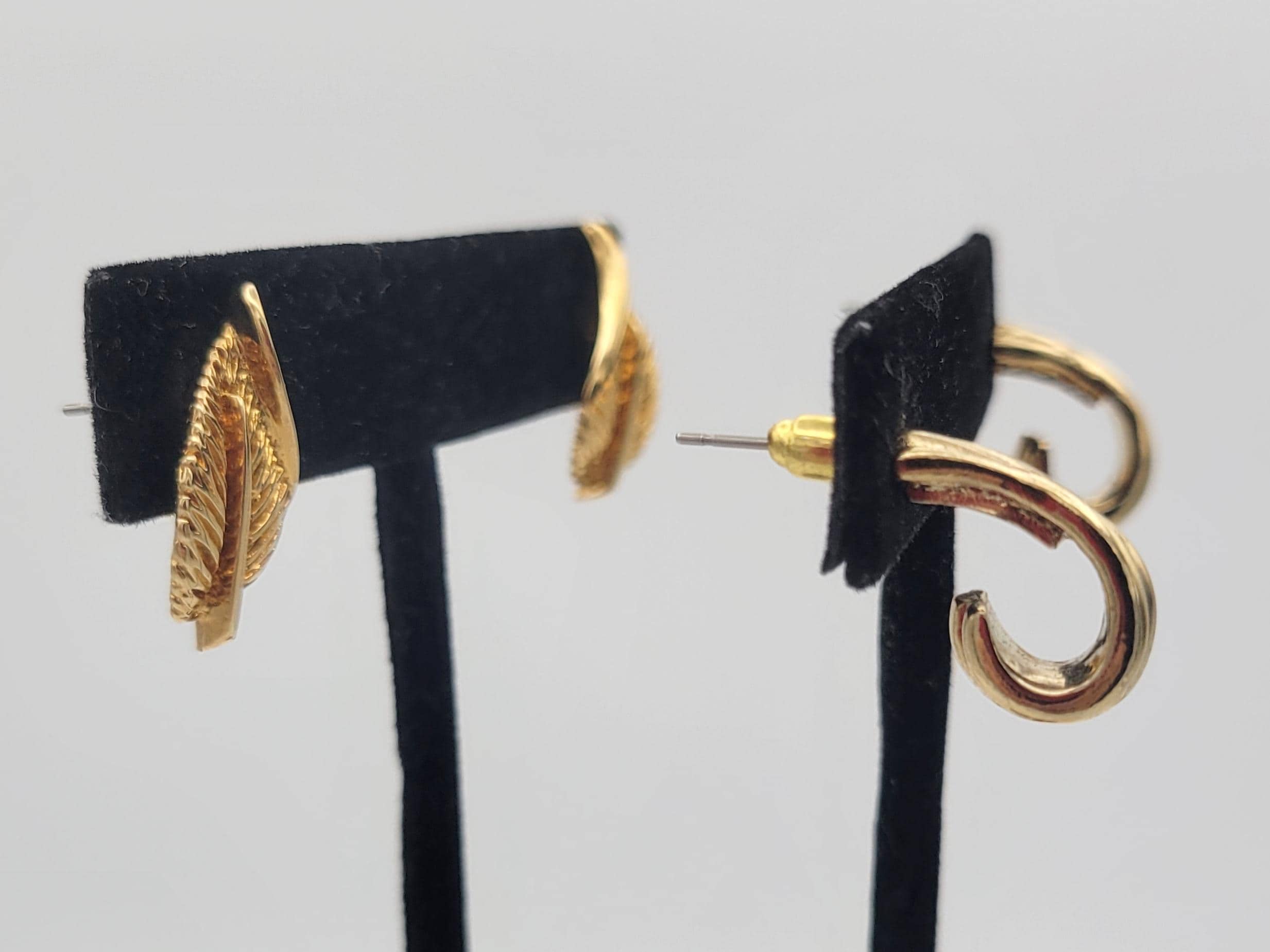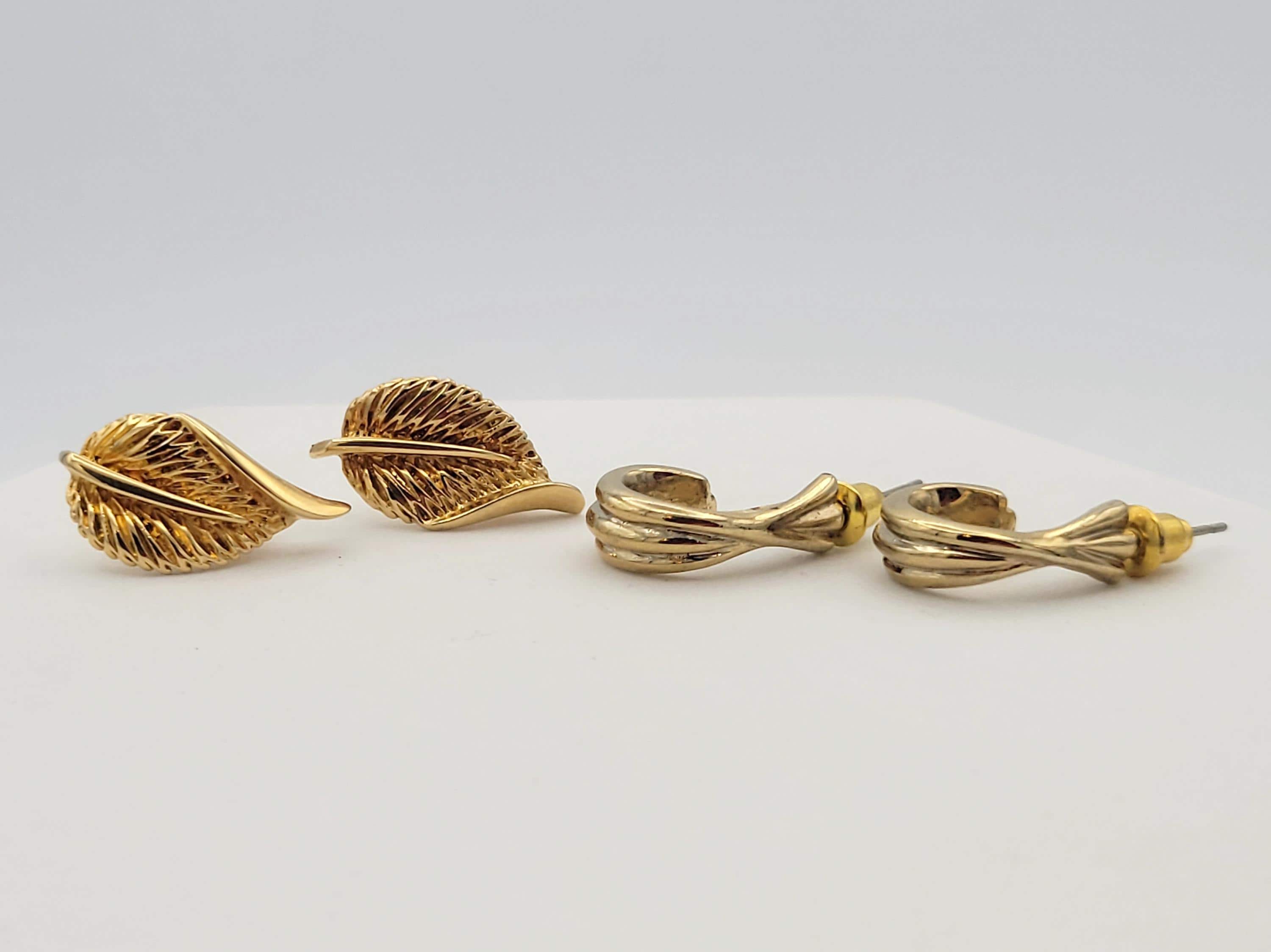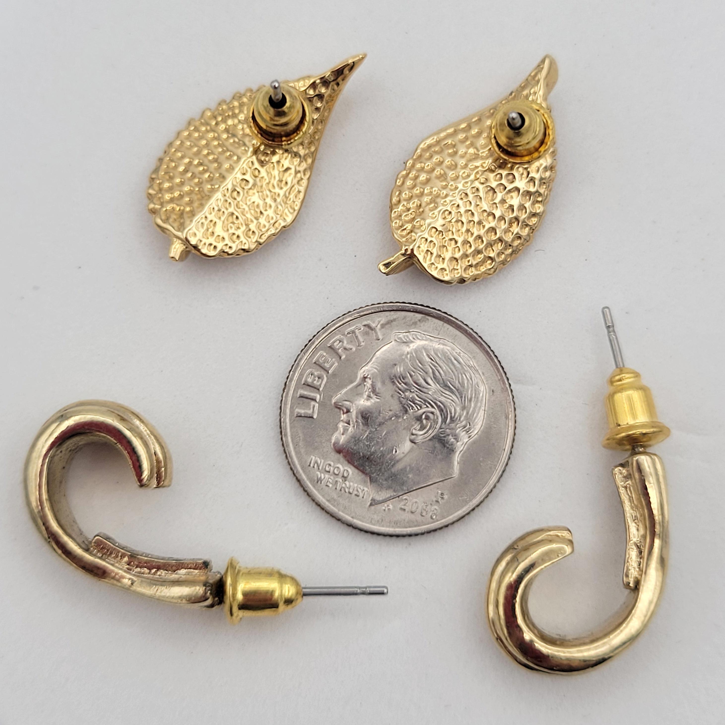 Two Pairs of Vintage Gold Tone Stud Earrings Leaves & Curves