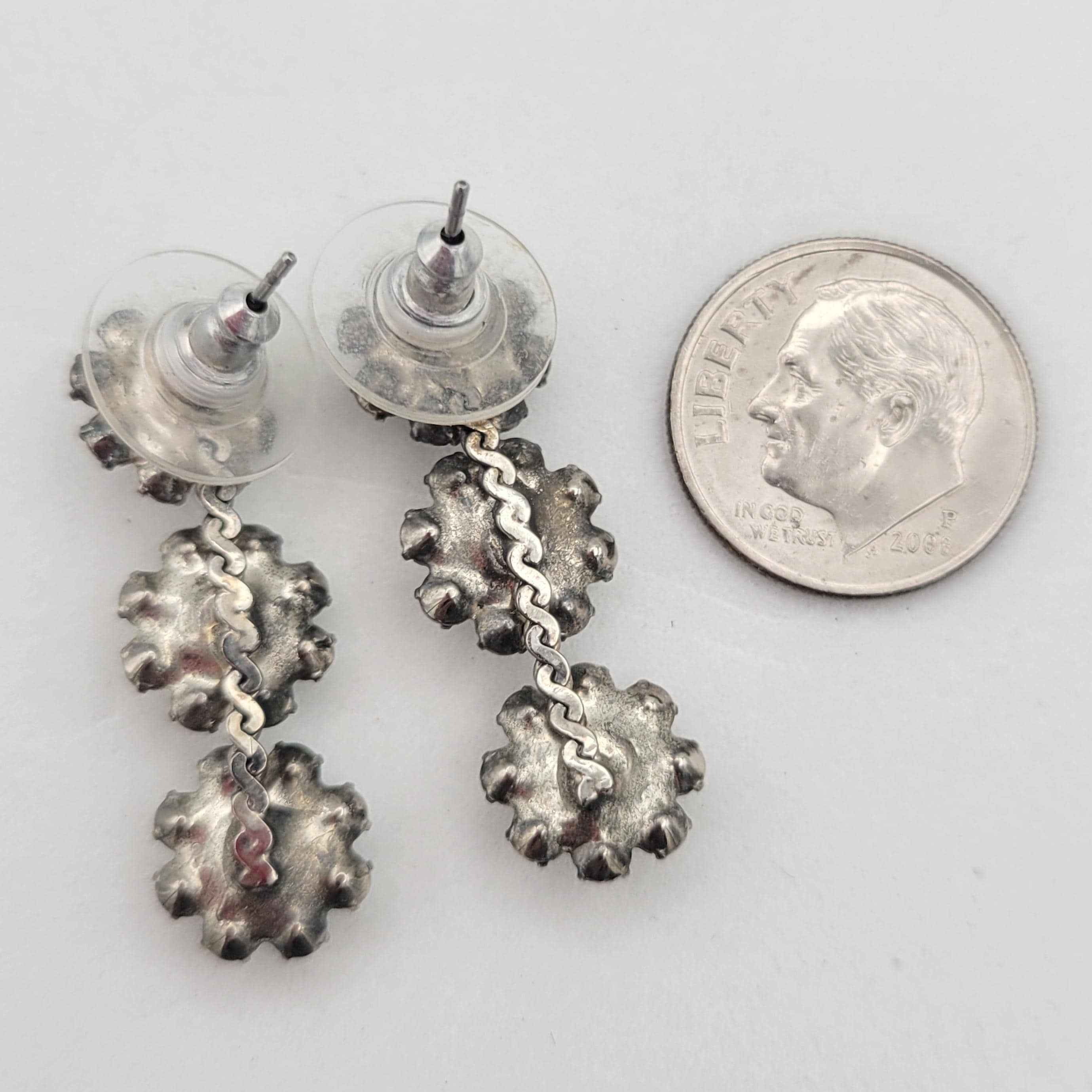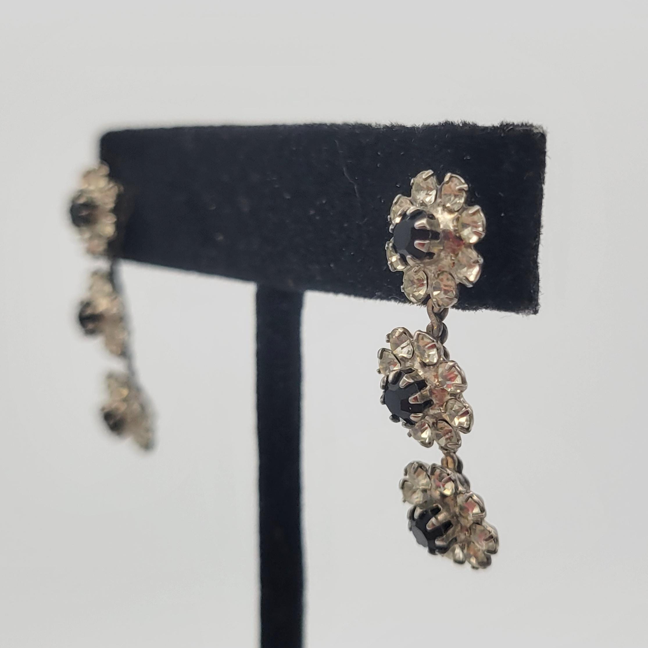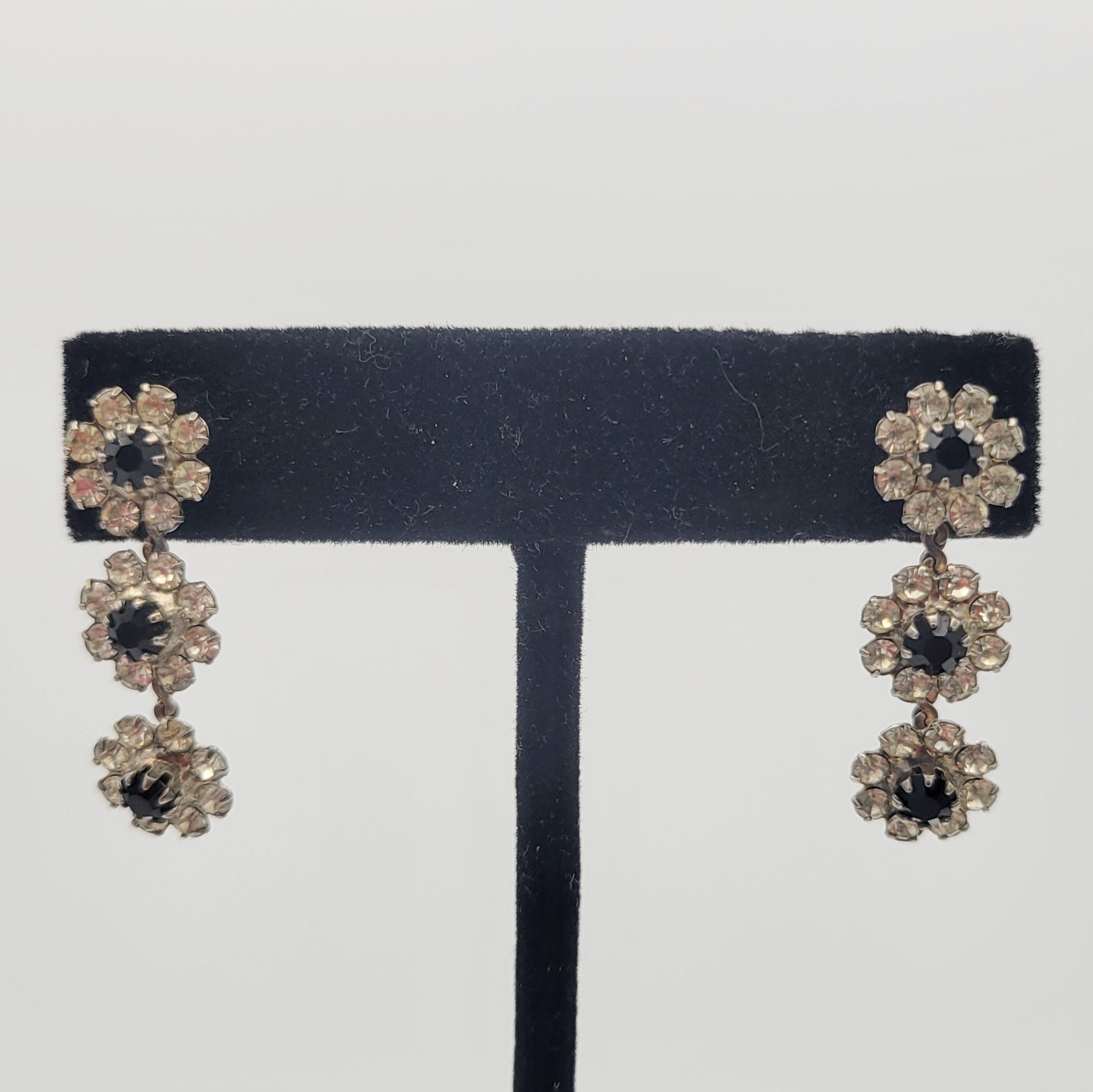 These floral earrings will add some sparkle to your look! The silver-tone earrings are made of 3 floral-shaped links that provide the settings for many clear faceted rhinestones on the petals. In the center of each flower is a larger black rhinestone. The 3 floral links are affixed to a silver-tone chain to make the dangle. These earrings are in excellent vintage condition with very little wear.