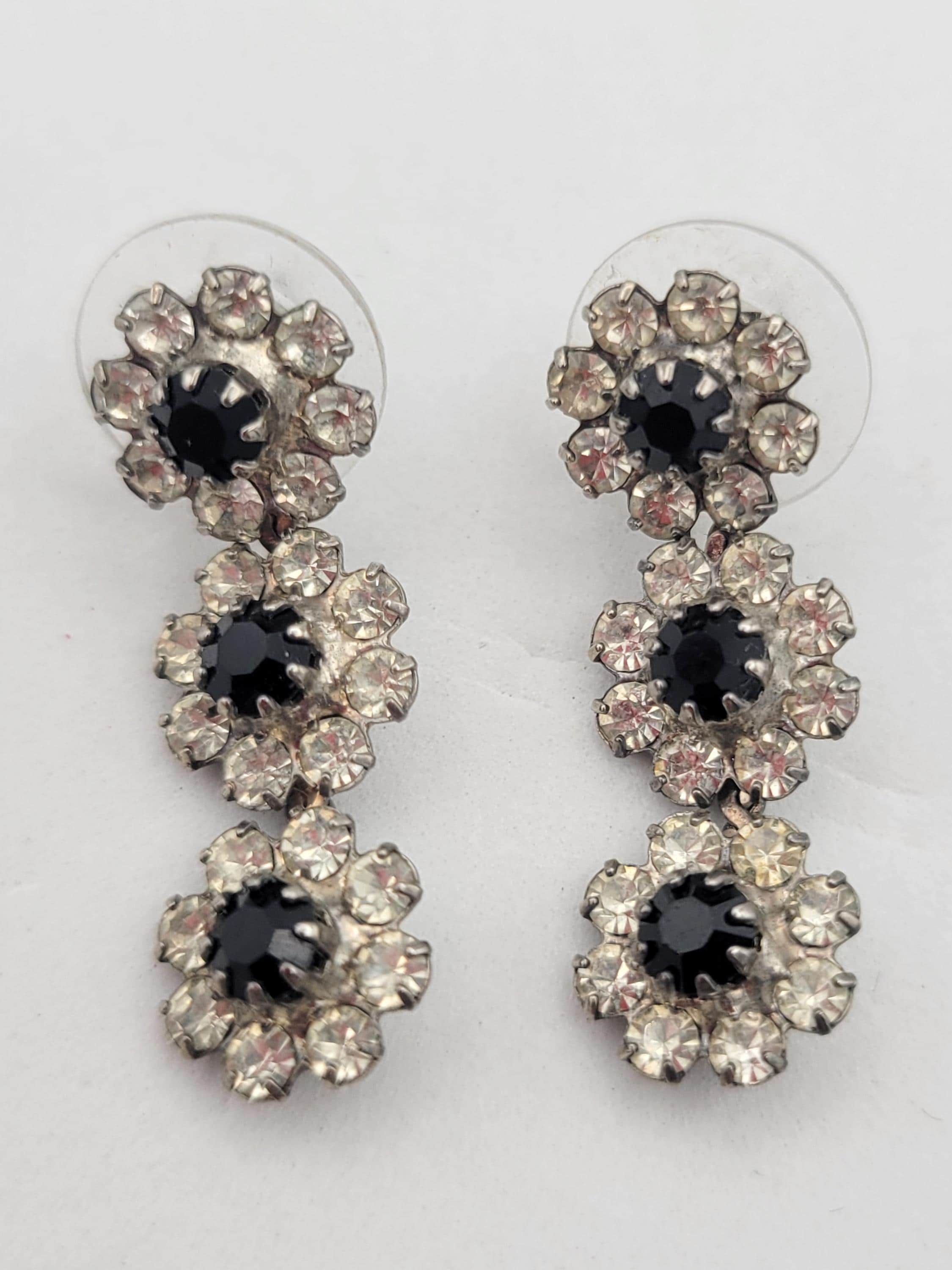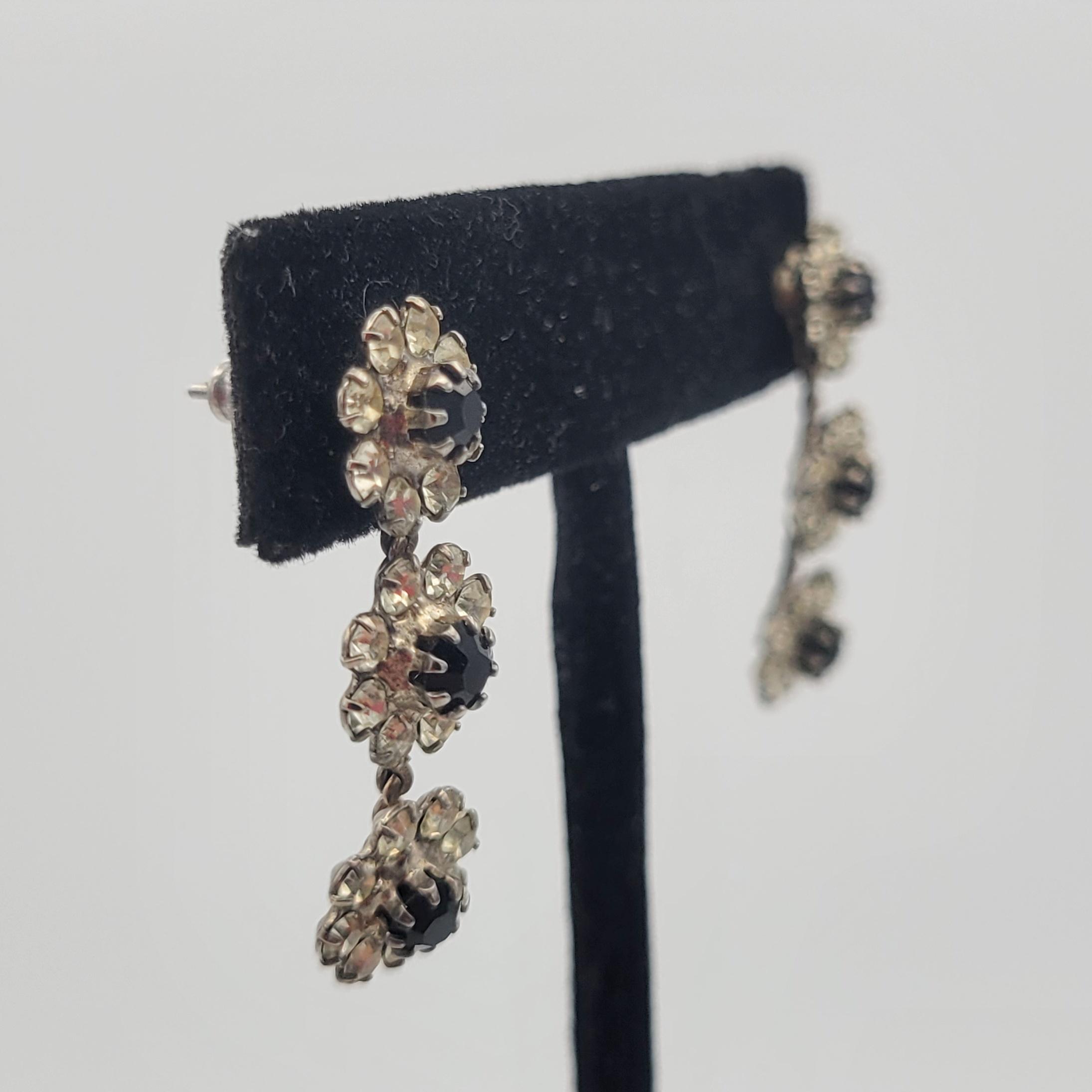 Vintage Silver Tone Floral Drop Earrings Encrusted with Clear & Black Rhinestones