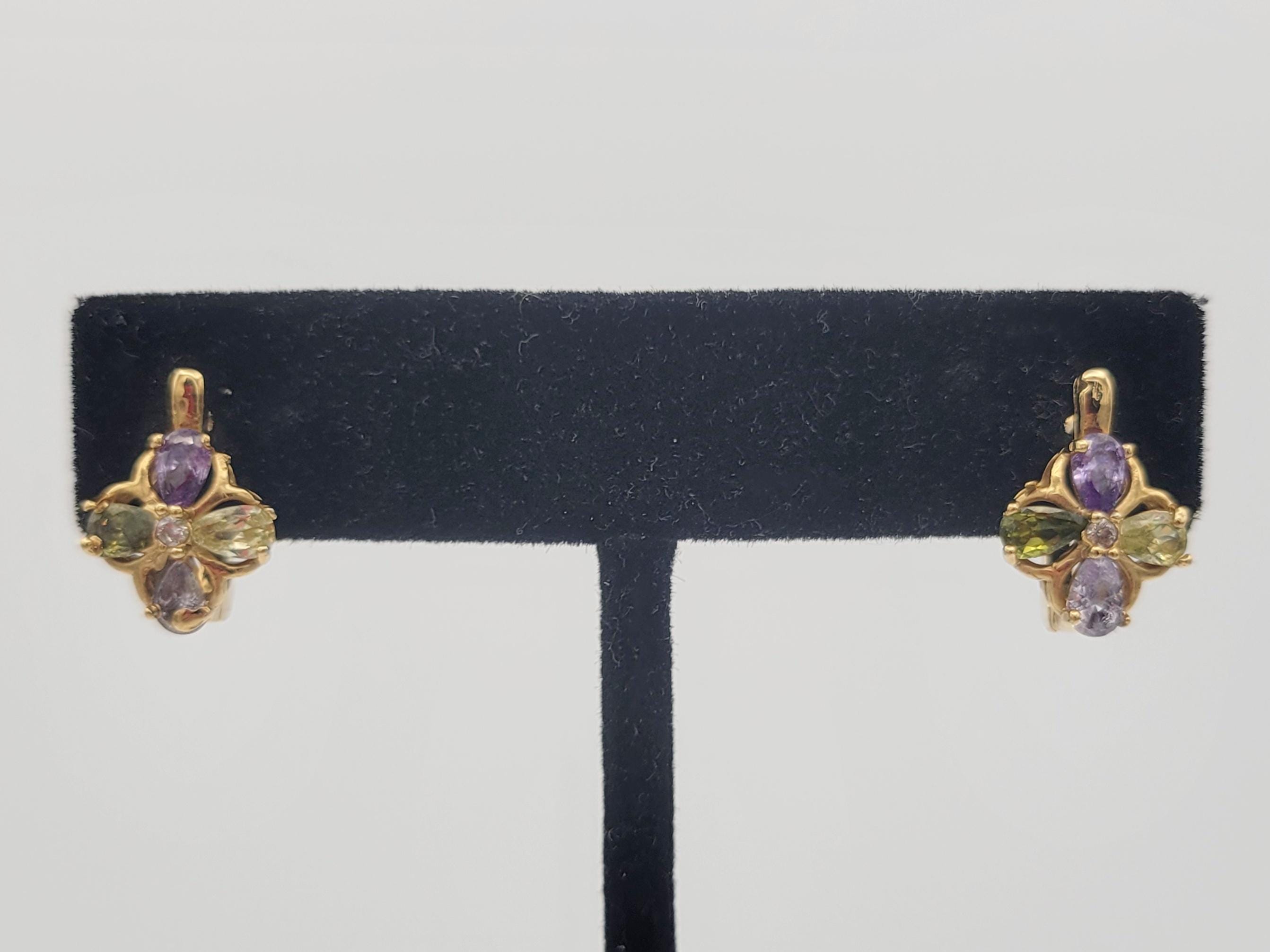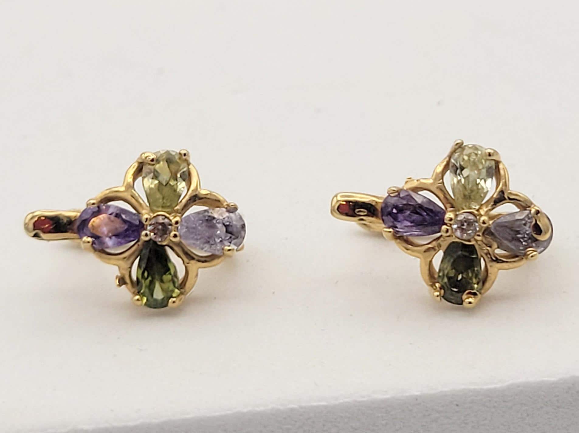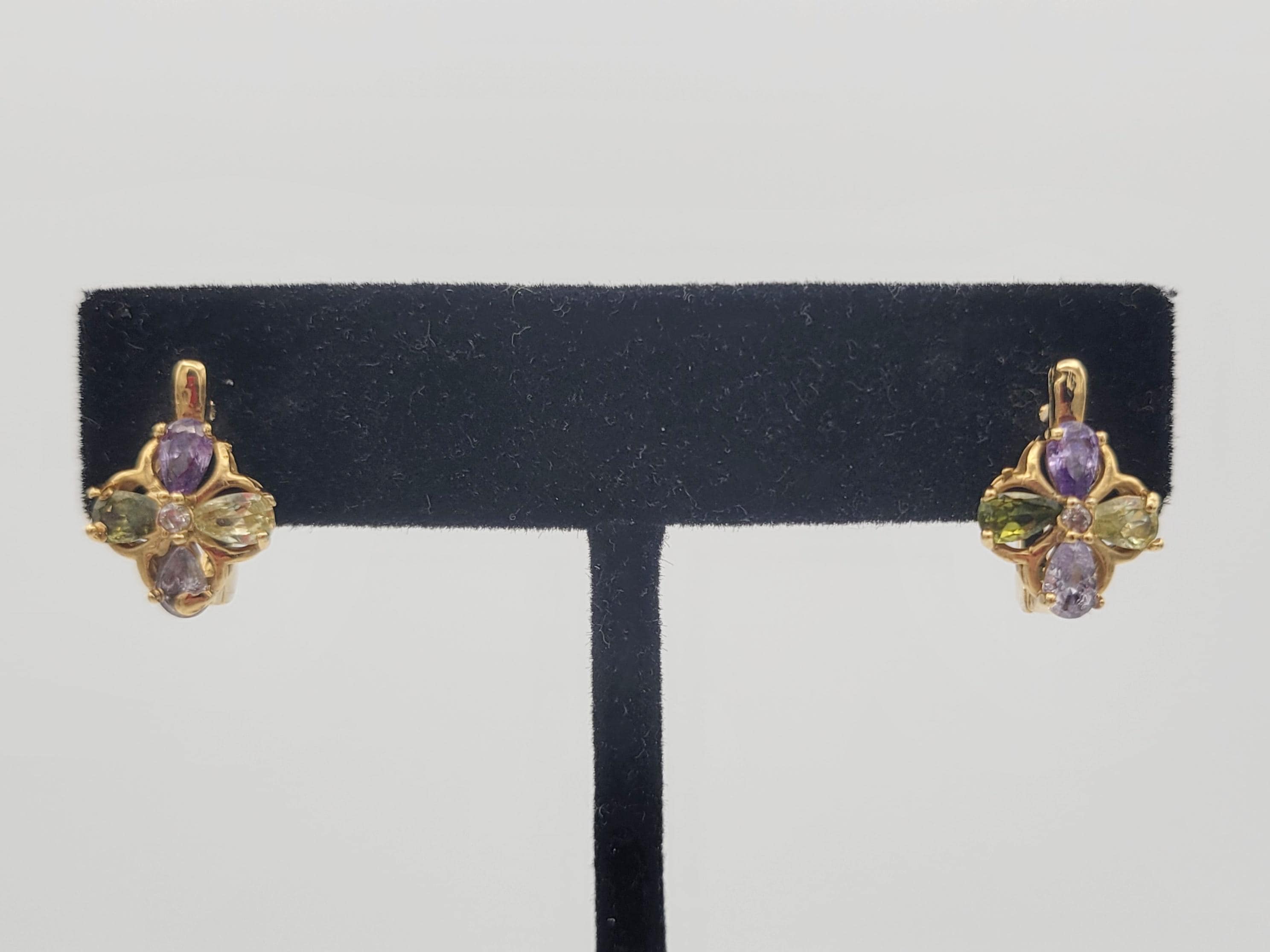 These lucky earrings make great accent pieces. The gold-tone earrings form a loop & secure with latch back closures. The earrings are accented with 4 pear-shaped stones in 2 shades of purple & green. These earrings are in excellent, nearly new condition.