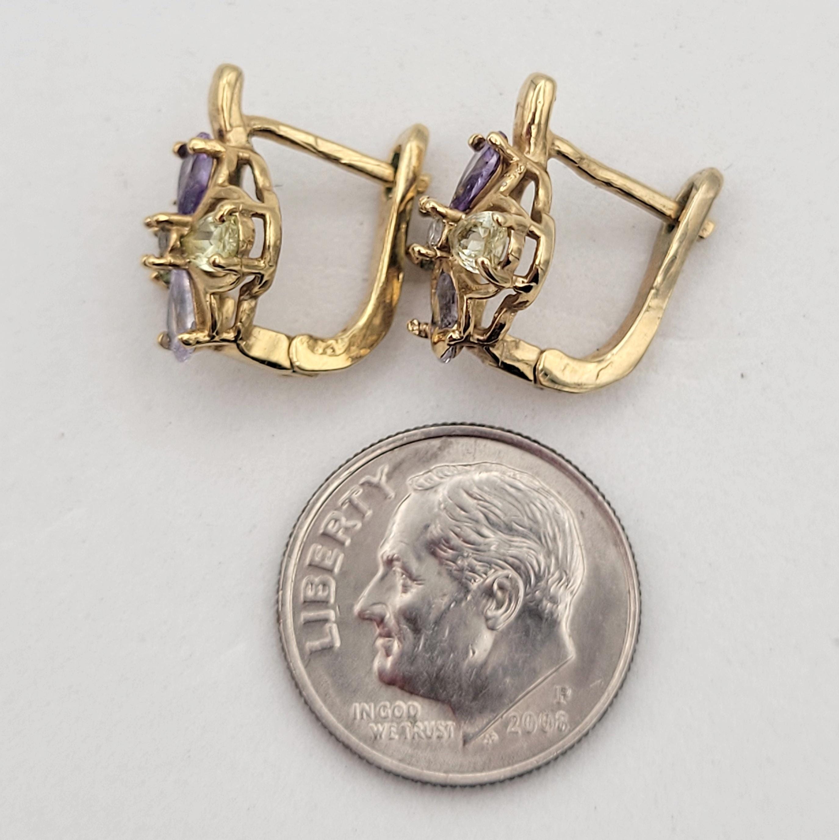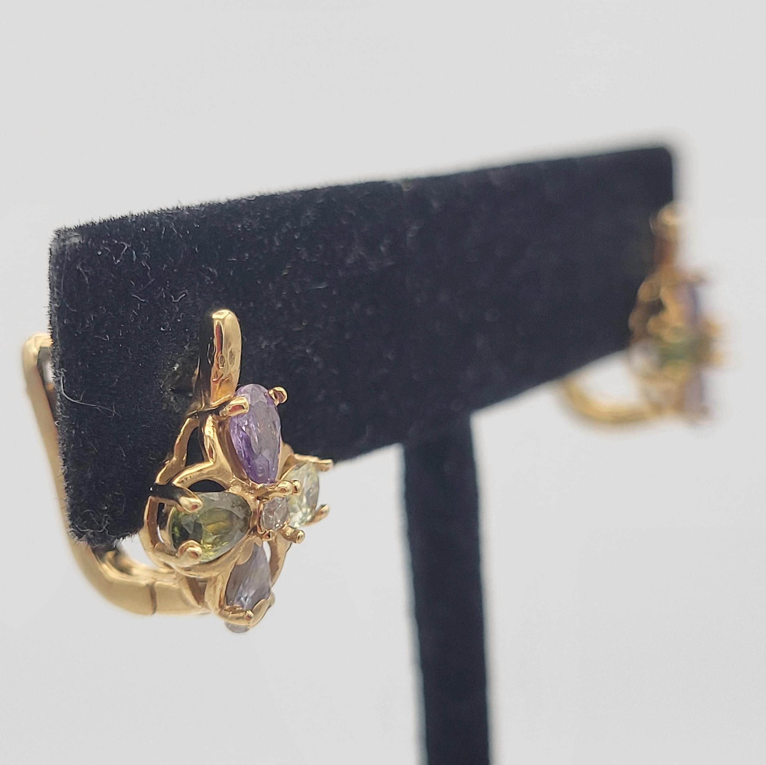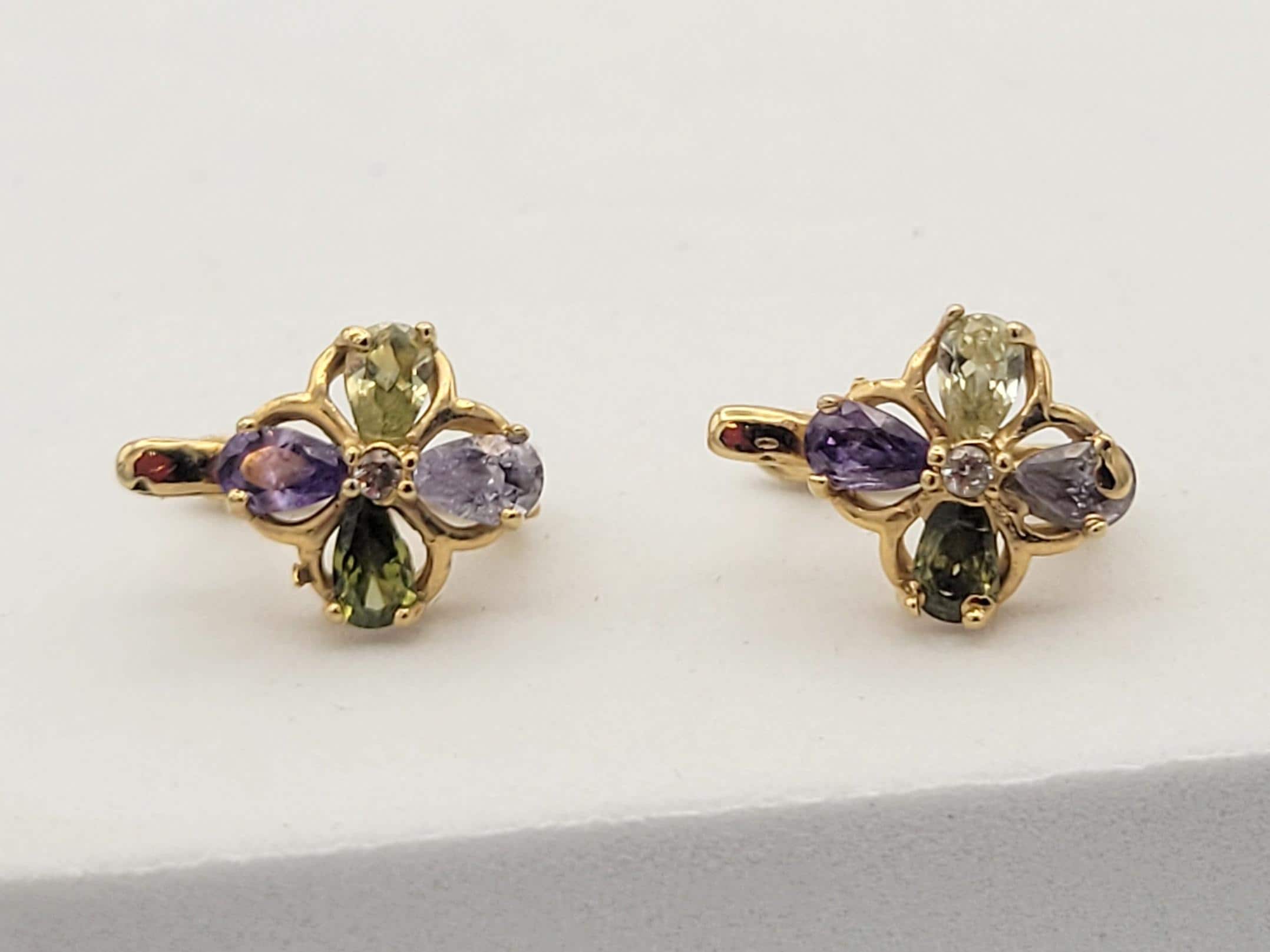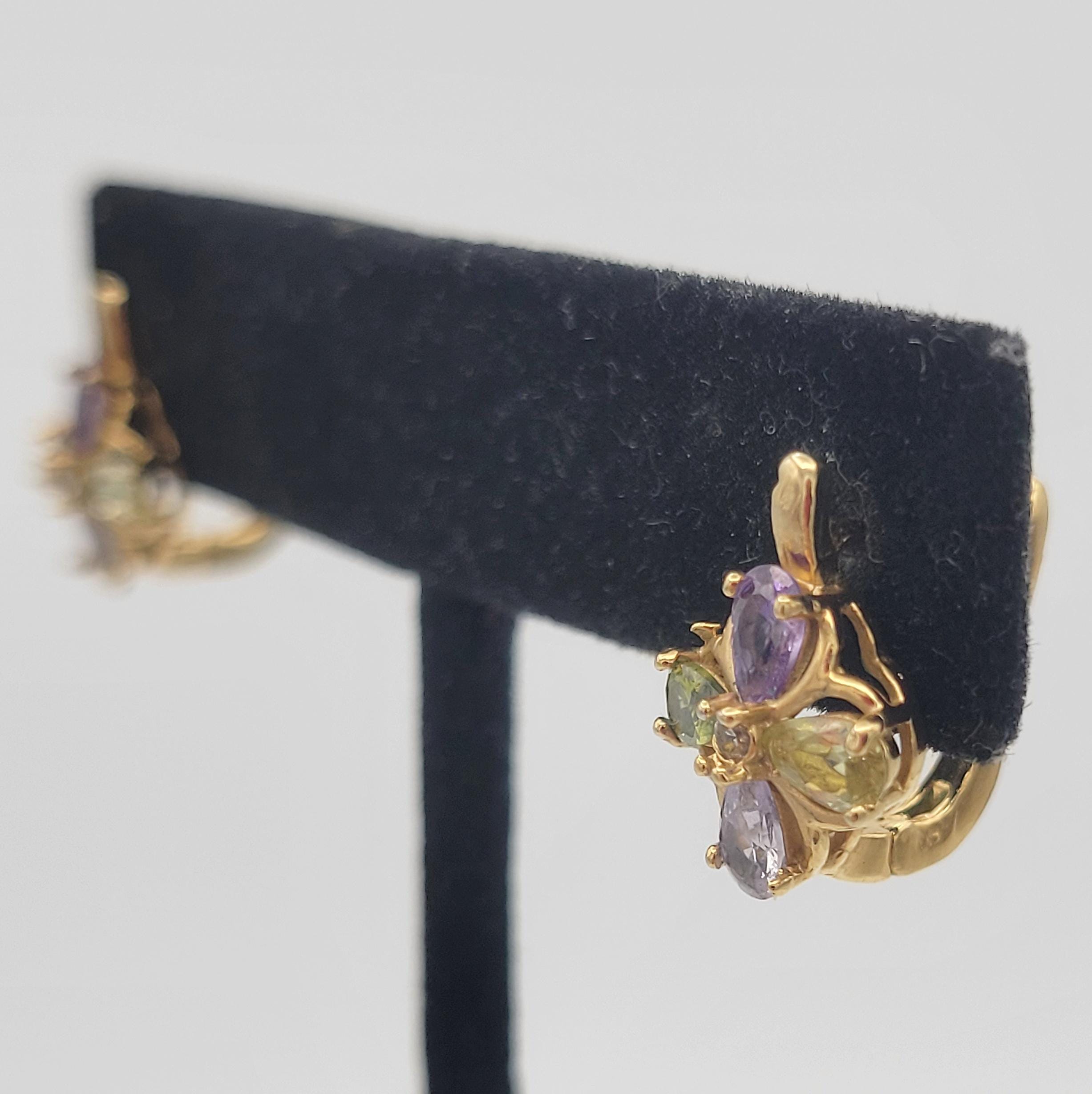 These lucky earrings make great accent pieces. The gold-tone earrings form a loop & secure with latch back closures. The earrings are accented with 4 pear-shaped stones in 2 shades of purple & green. These earrings are in excellent, nearly new condition.