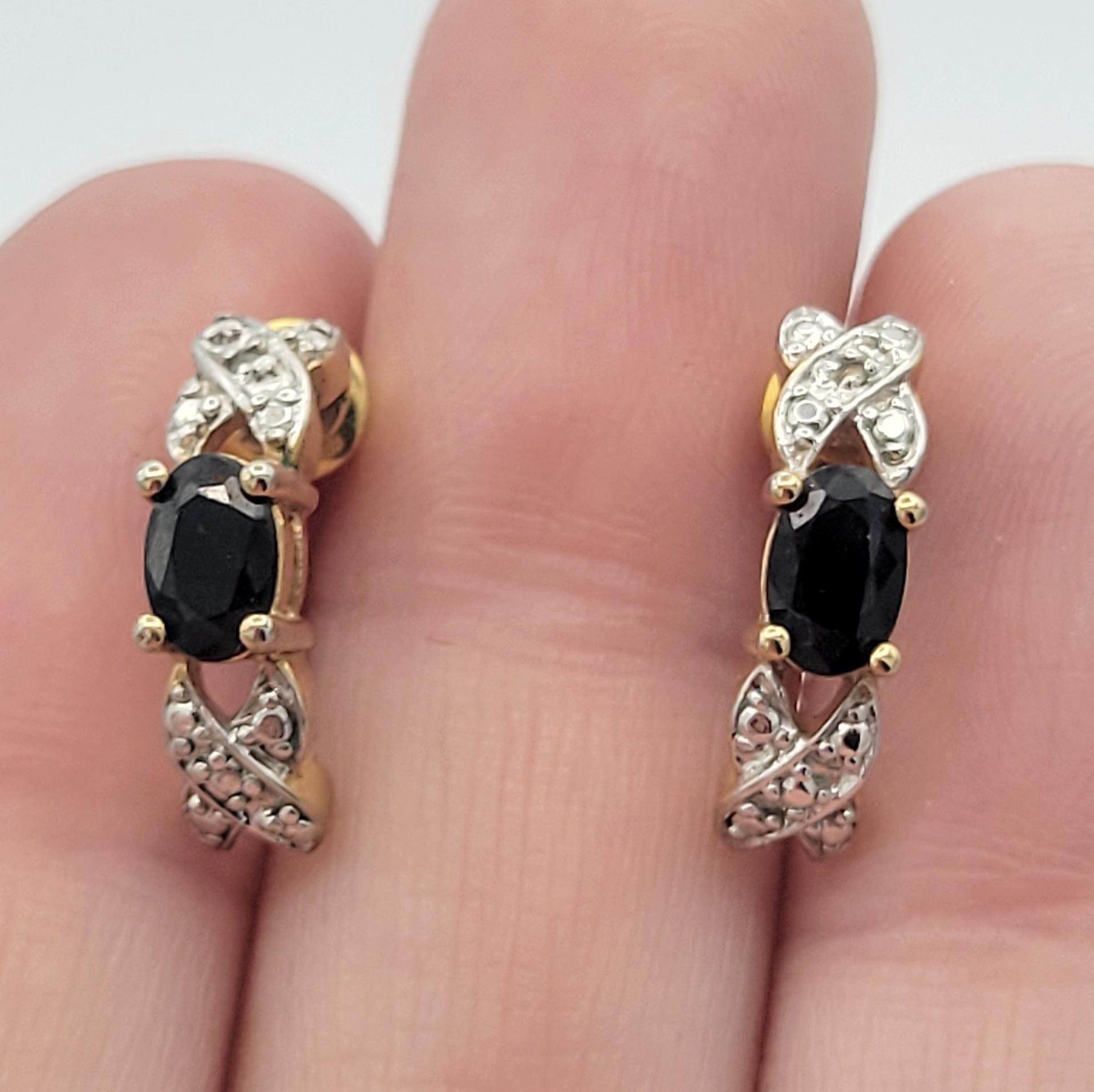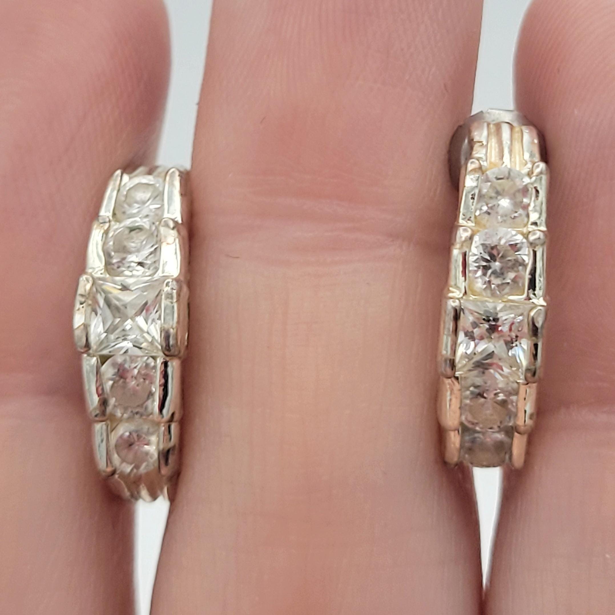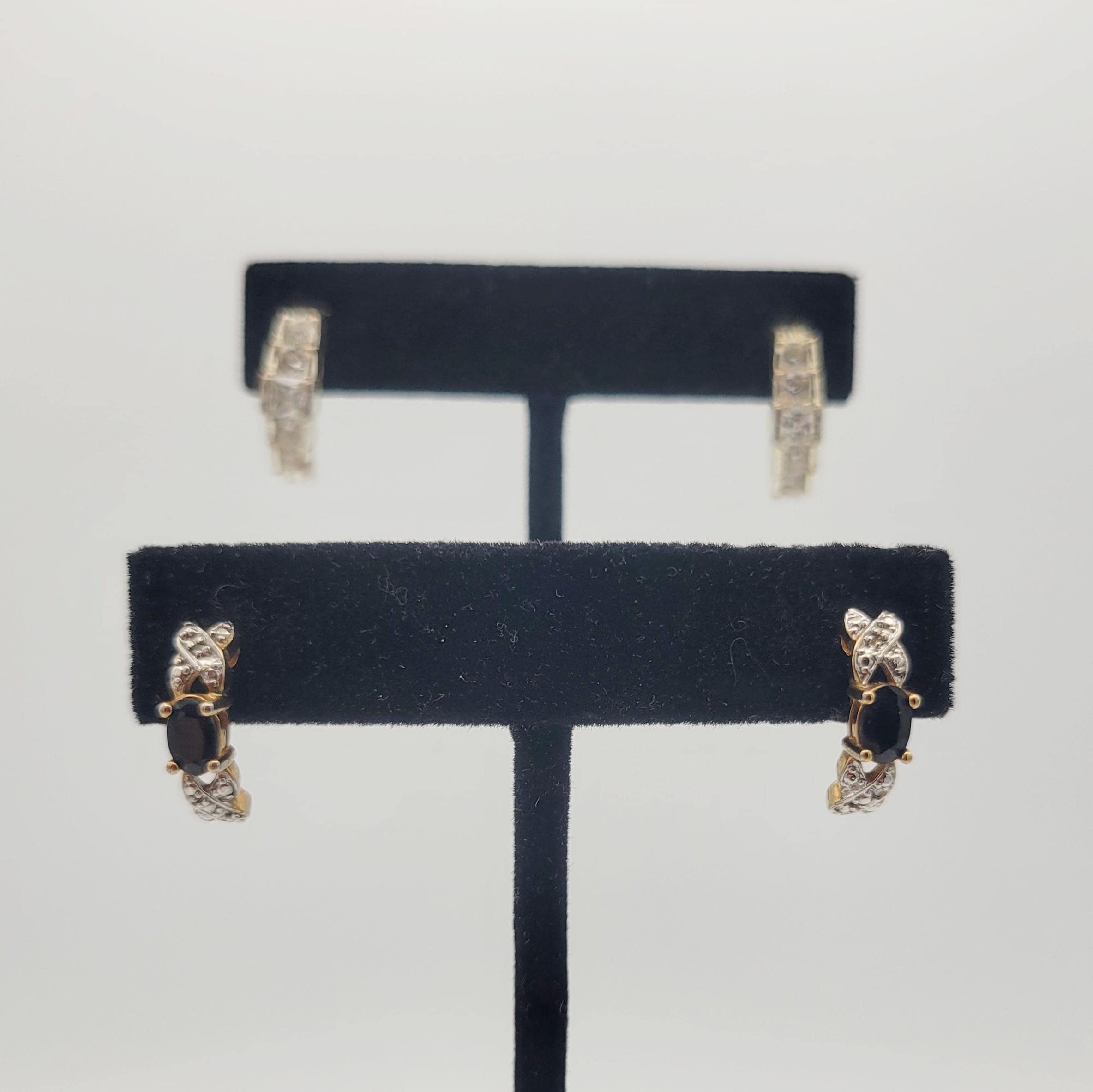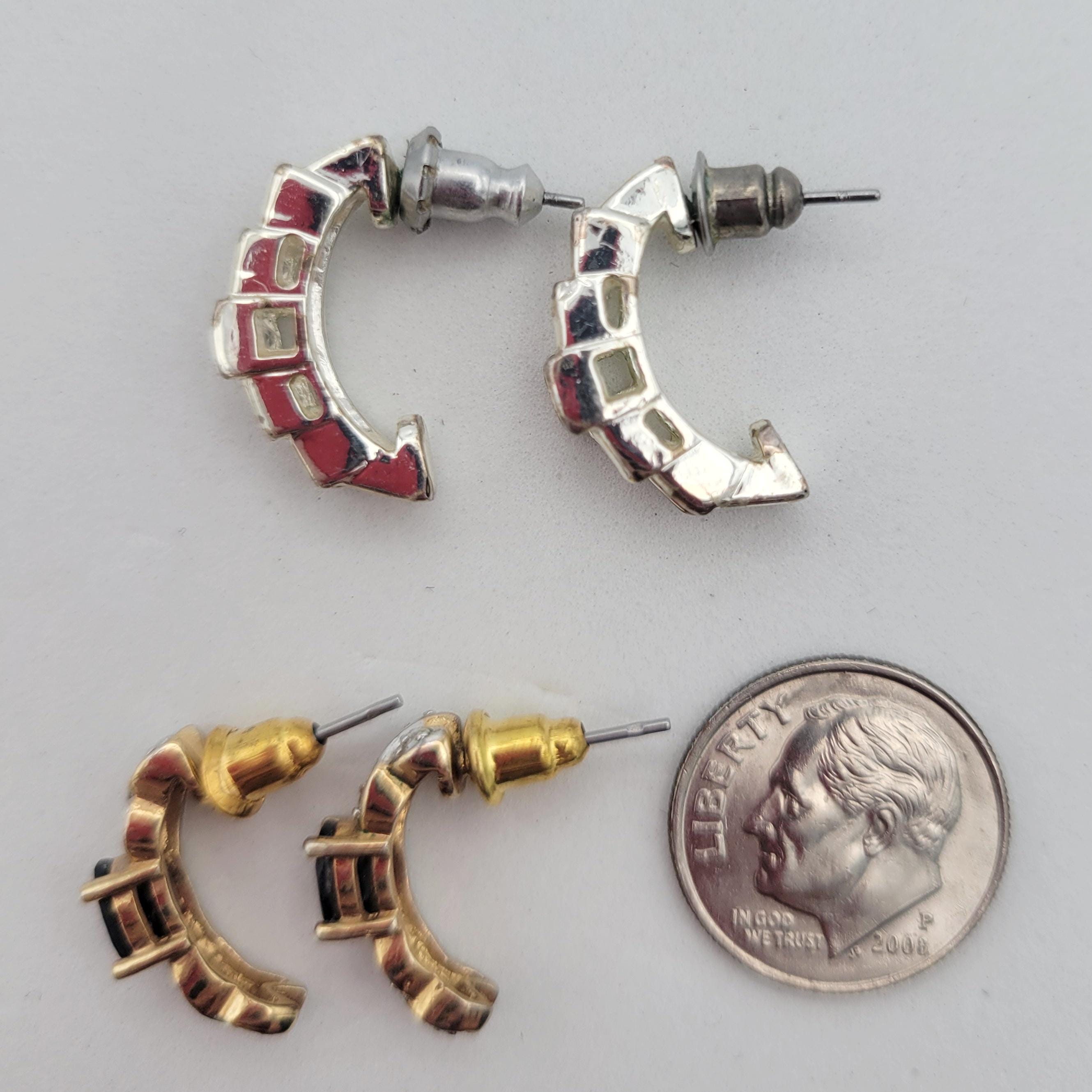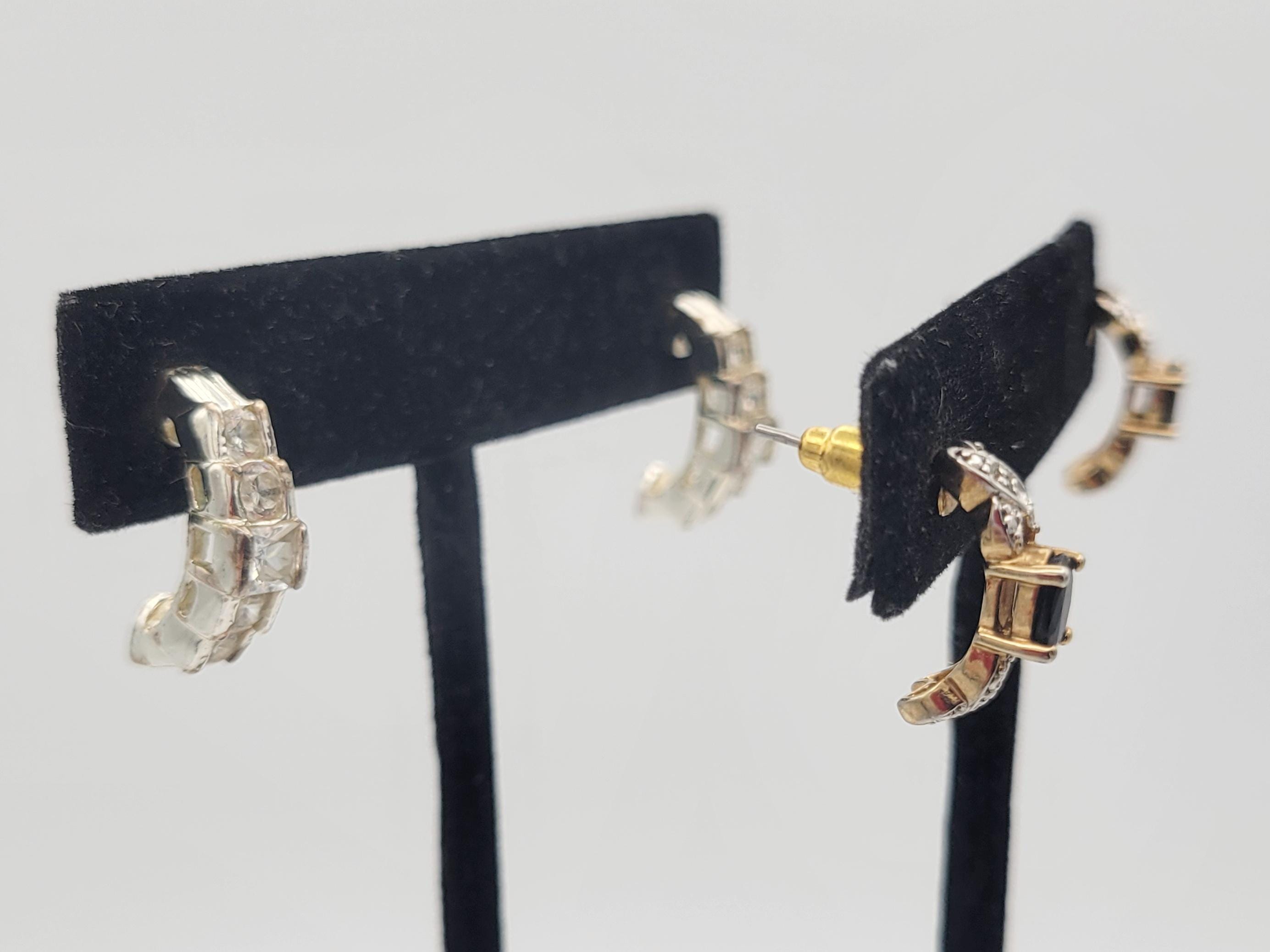 This listing includes 2 pairs of sparkling earrings to spice up your jewelry wardrobe. The smaller gold-tone earrings feature an openwork criss-cross pattern & larger black rhinestones in the center. The larger silver-tone earrings are completely encrusted with round & princess-cut rhinestones. Both pairs of earrings are in excellent vintage condition with a small amount of wear.