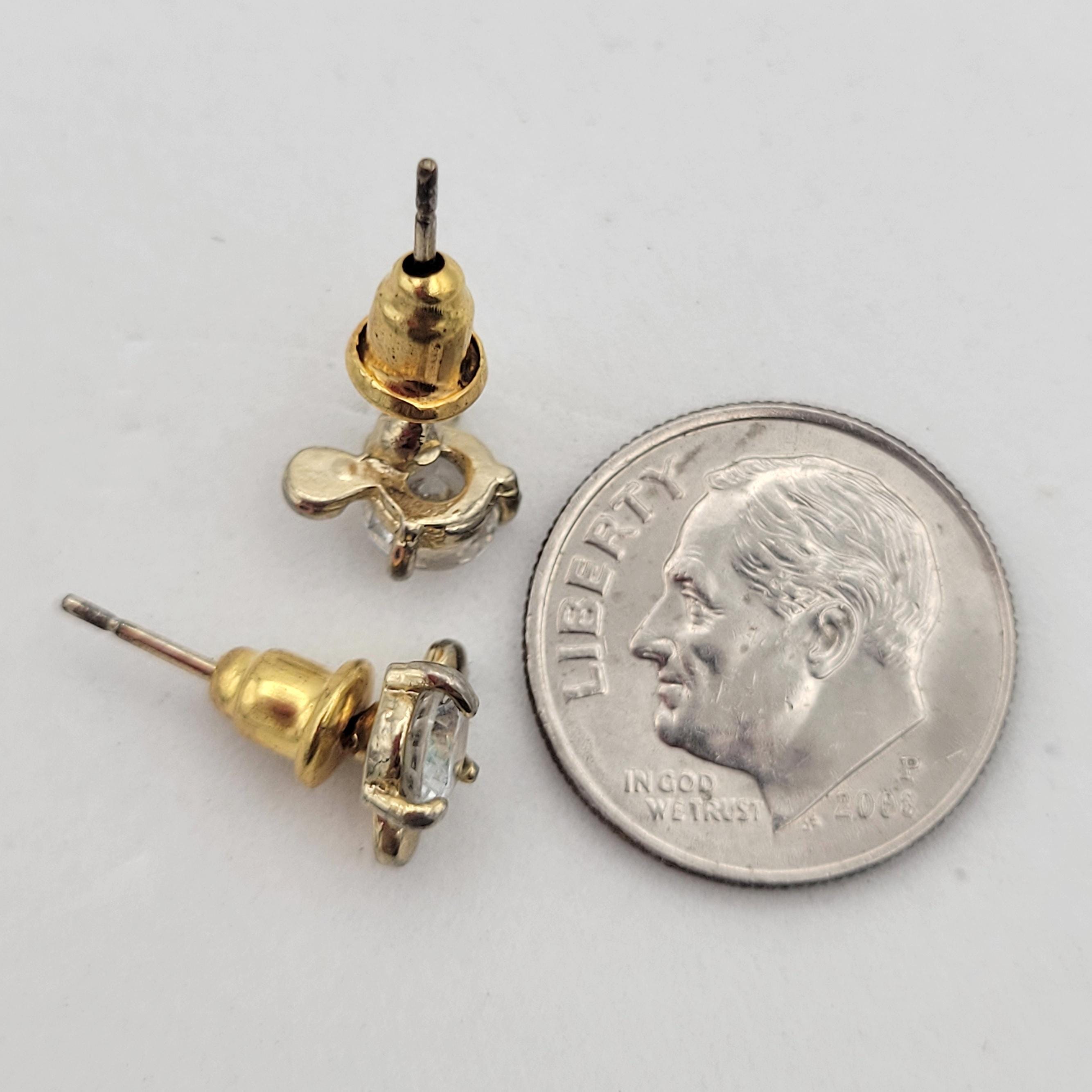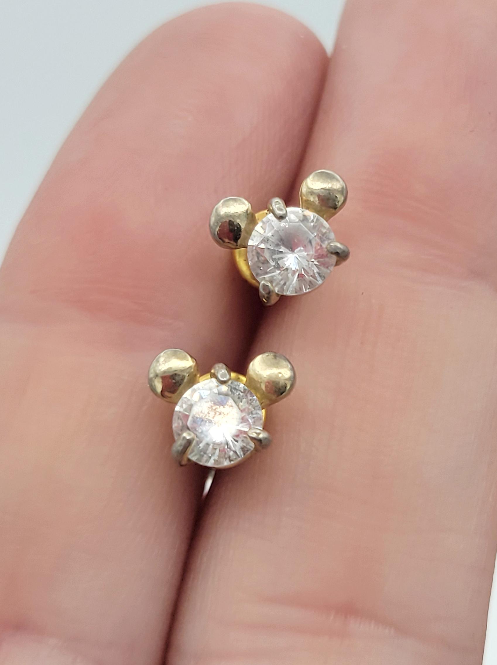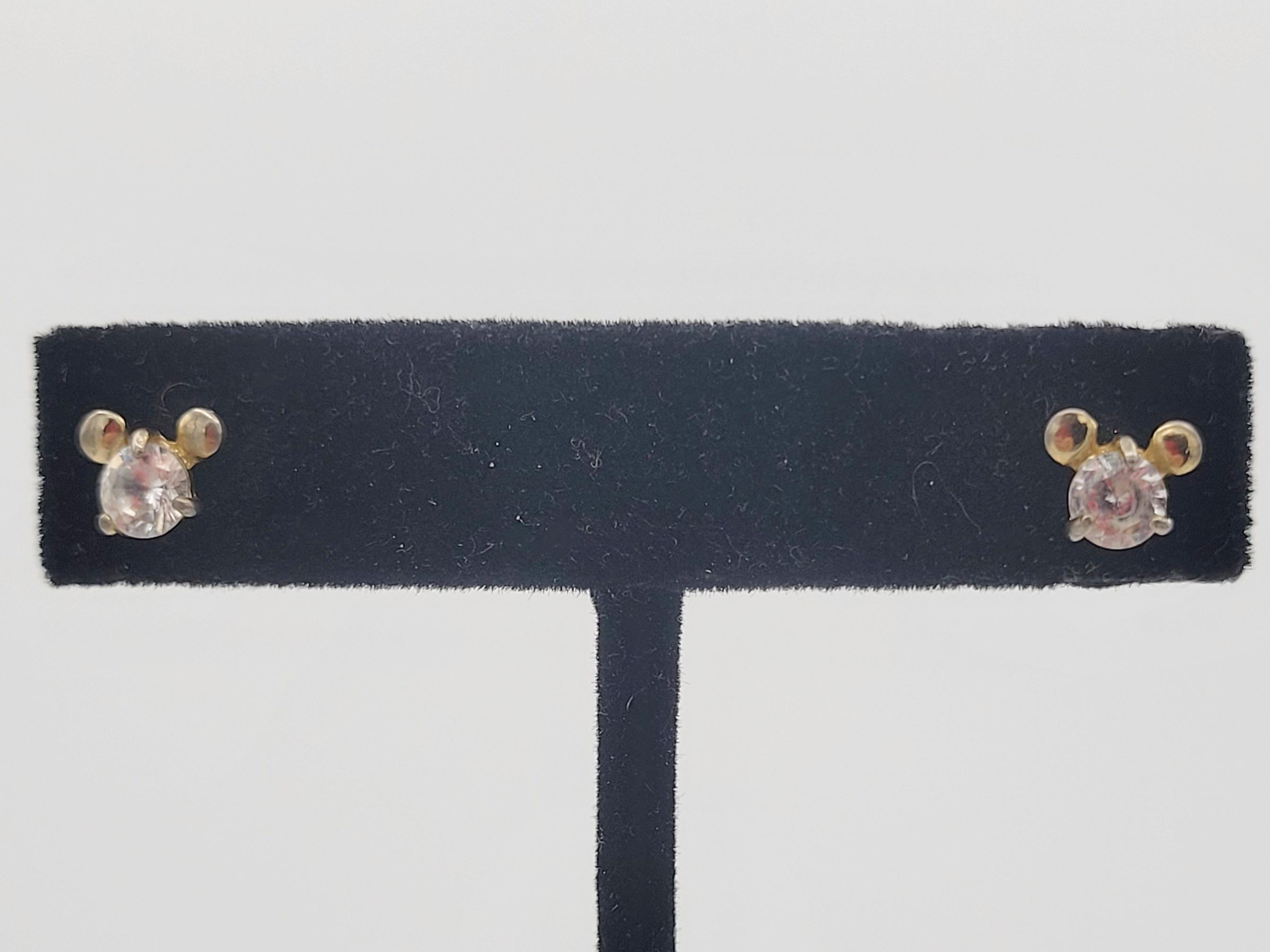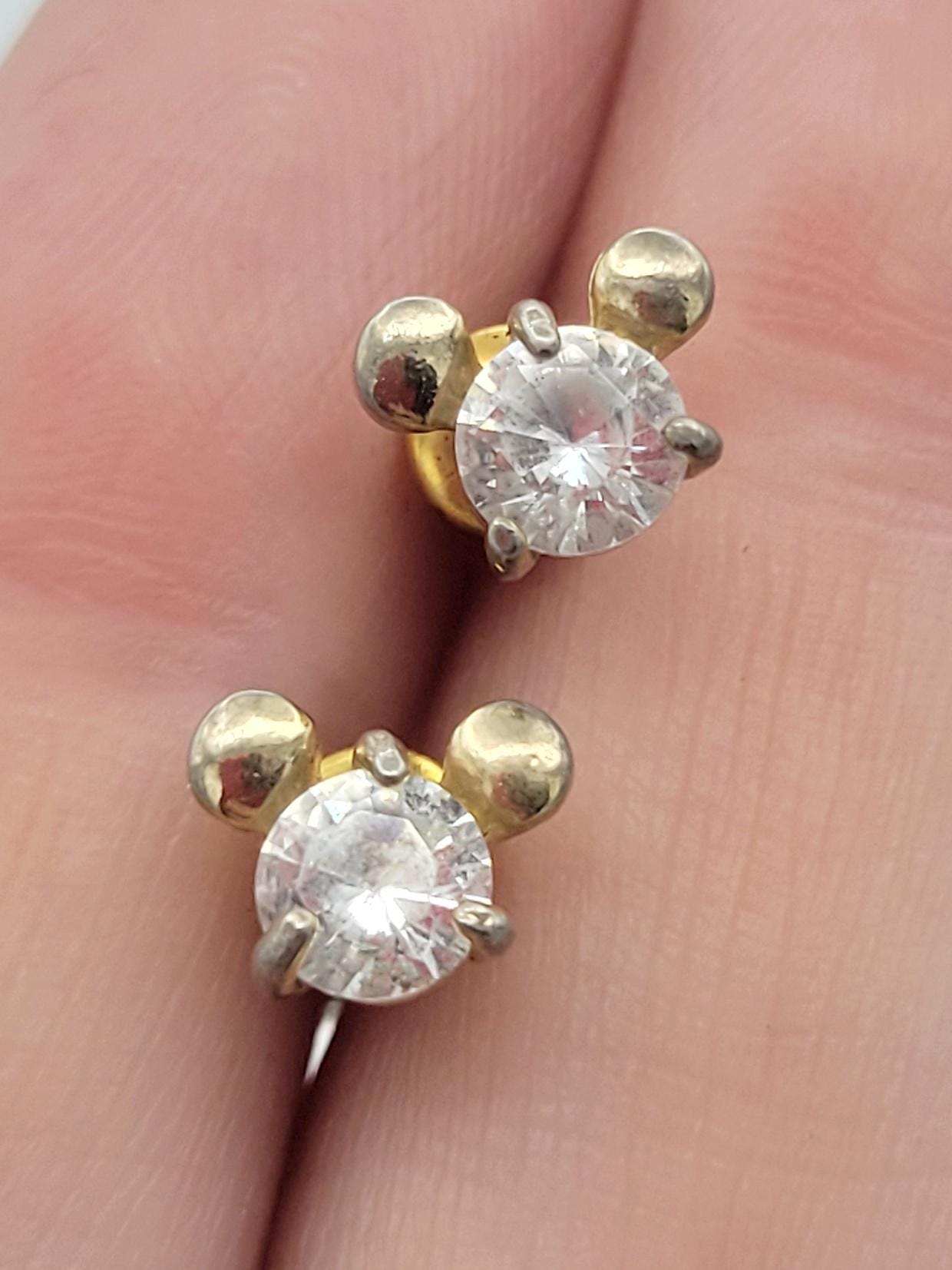 These tiny earrings are perfect for the Disney fan! The gold-tone earrings form the shape of Mickey Mouse's head & ears. The ears are gold-tone & a faceted rhinestone is prong-set as Mickey's head. These earrings are in excellent vintage condition with a small amount of wear.