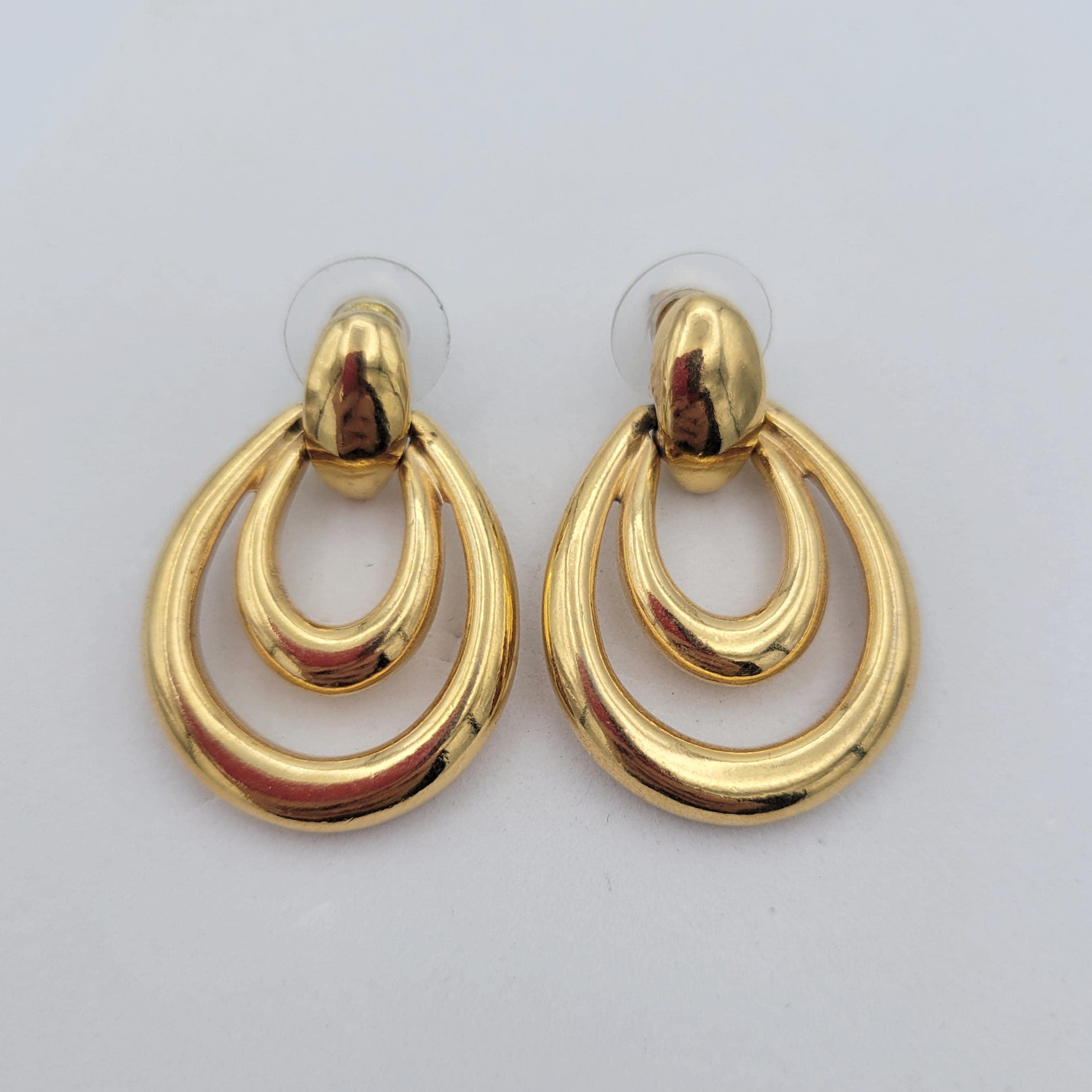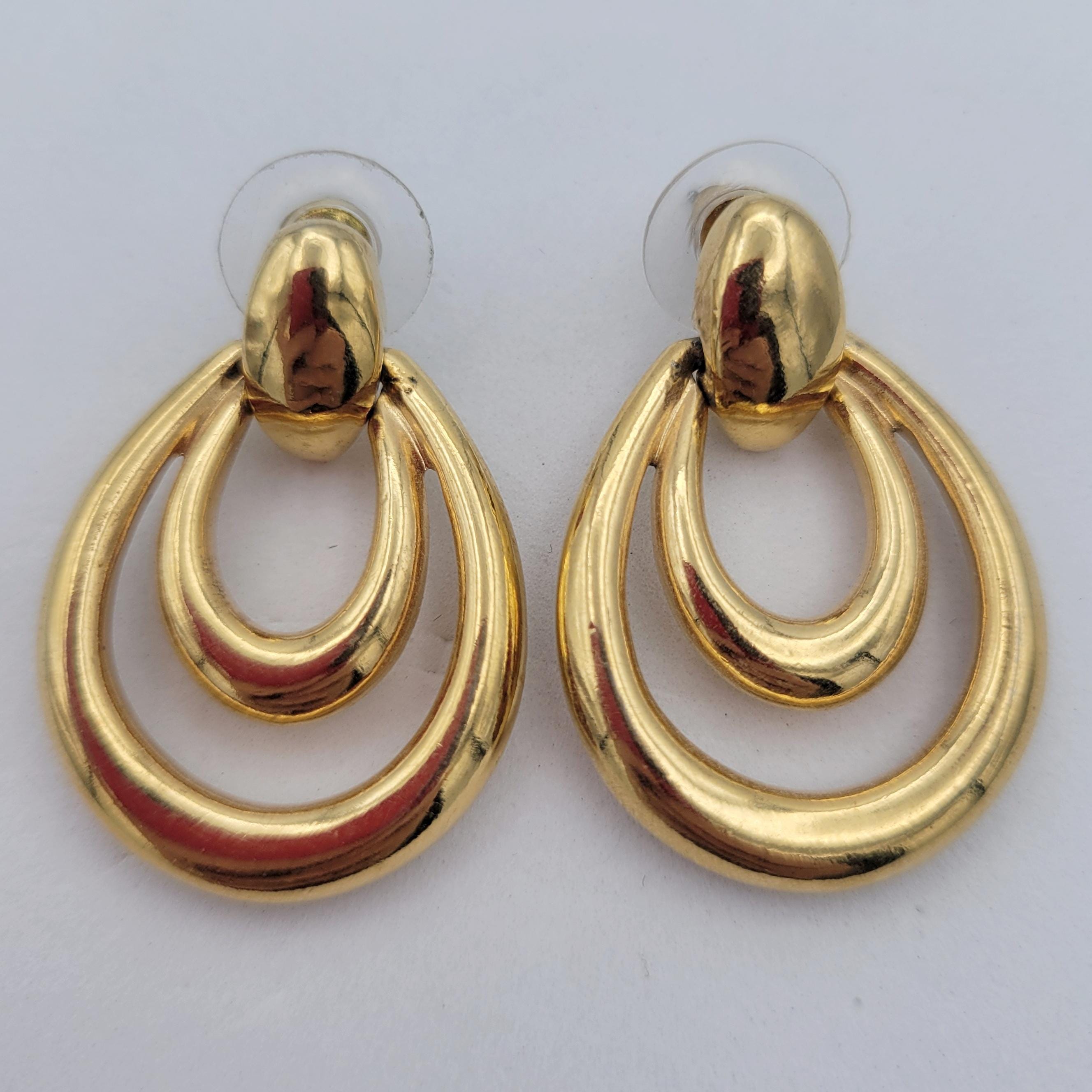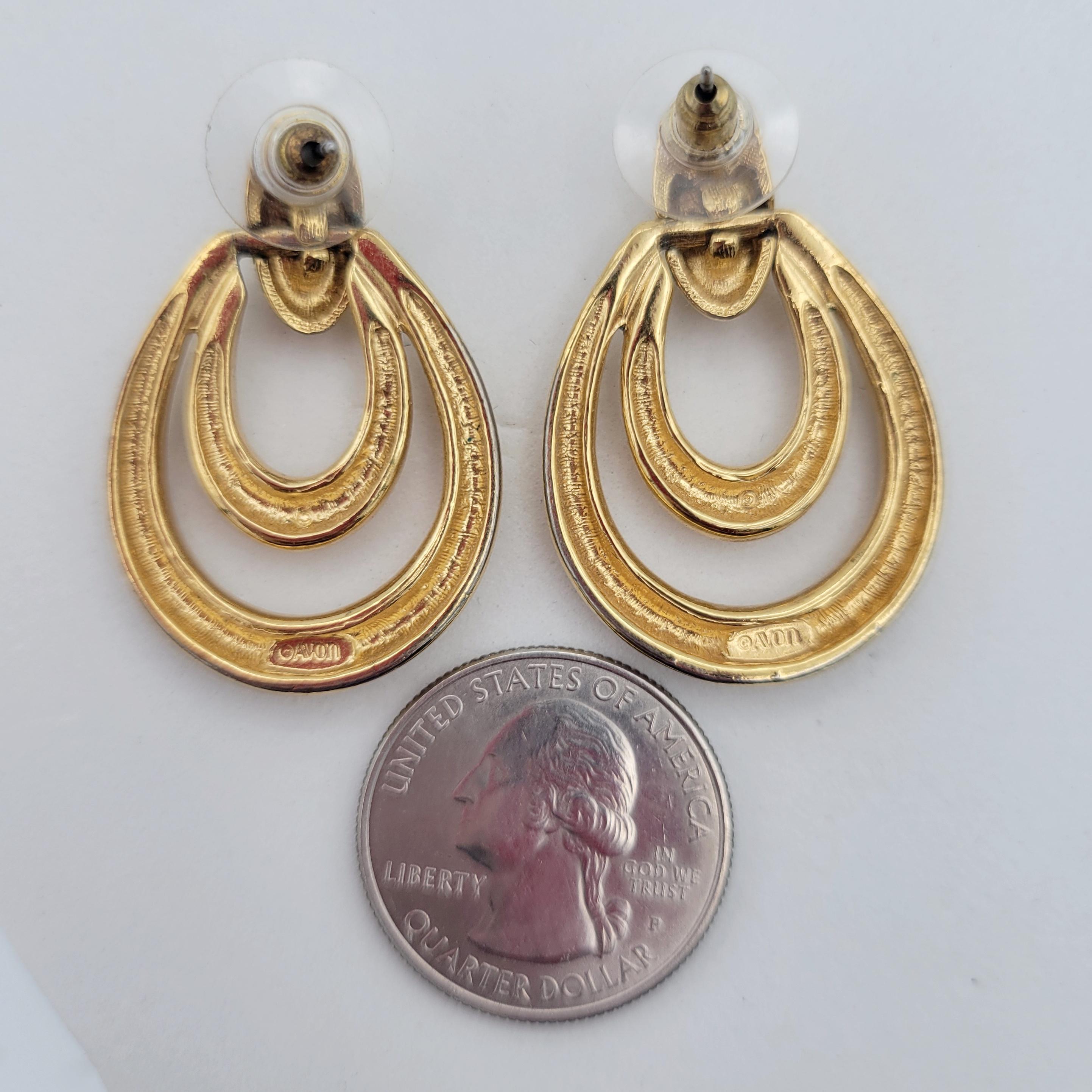 These shining earrings from Avon will be a staple in your jewelry wardrobe. The shining gold-tone earrings form an openwork double teardrop shape. The earrings have a mirrored finish. They are in excellent vintage condition with very little wear.