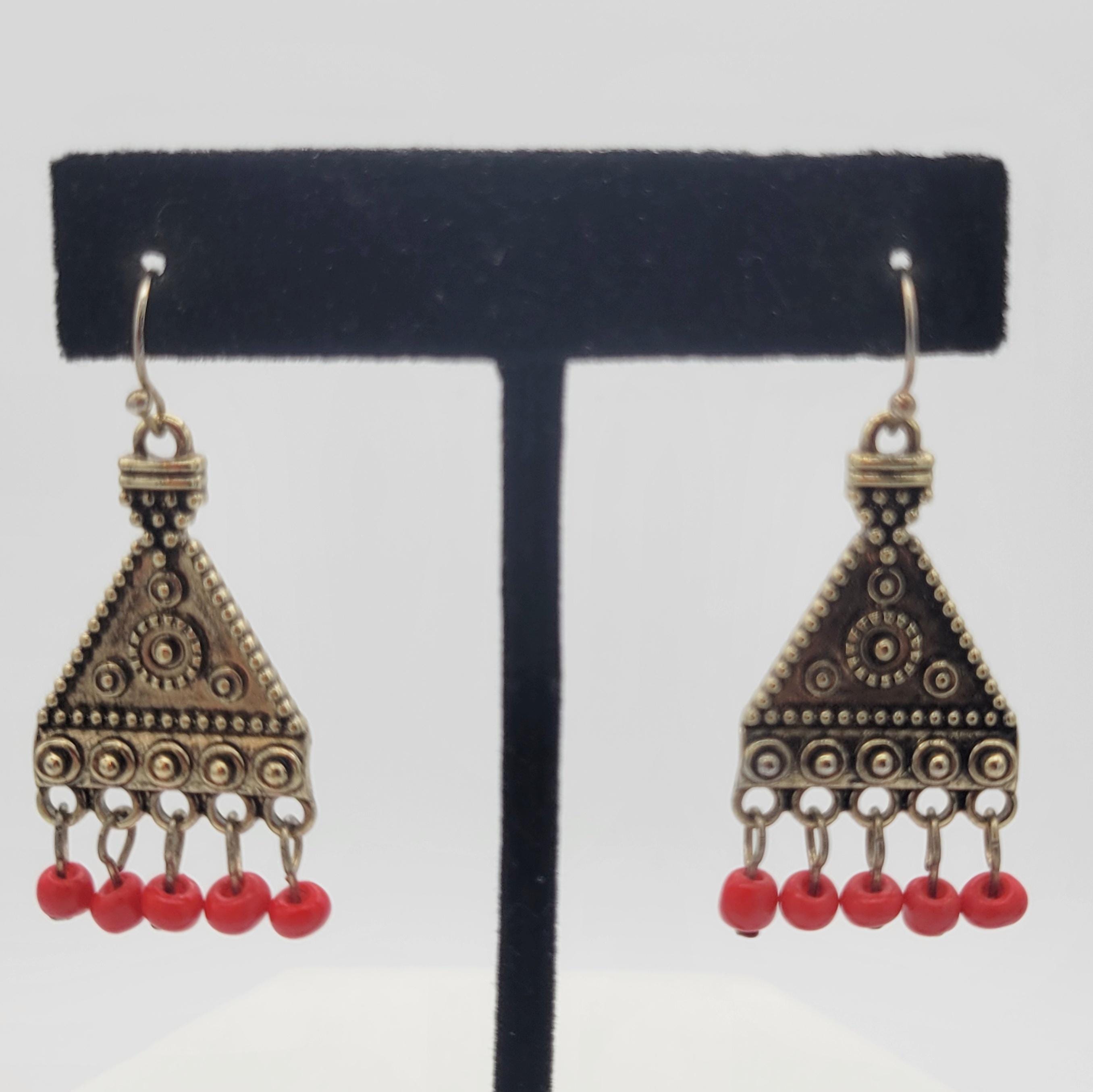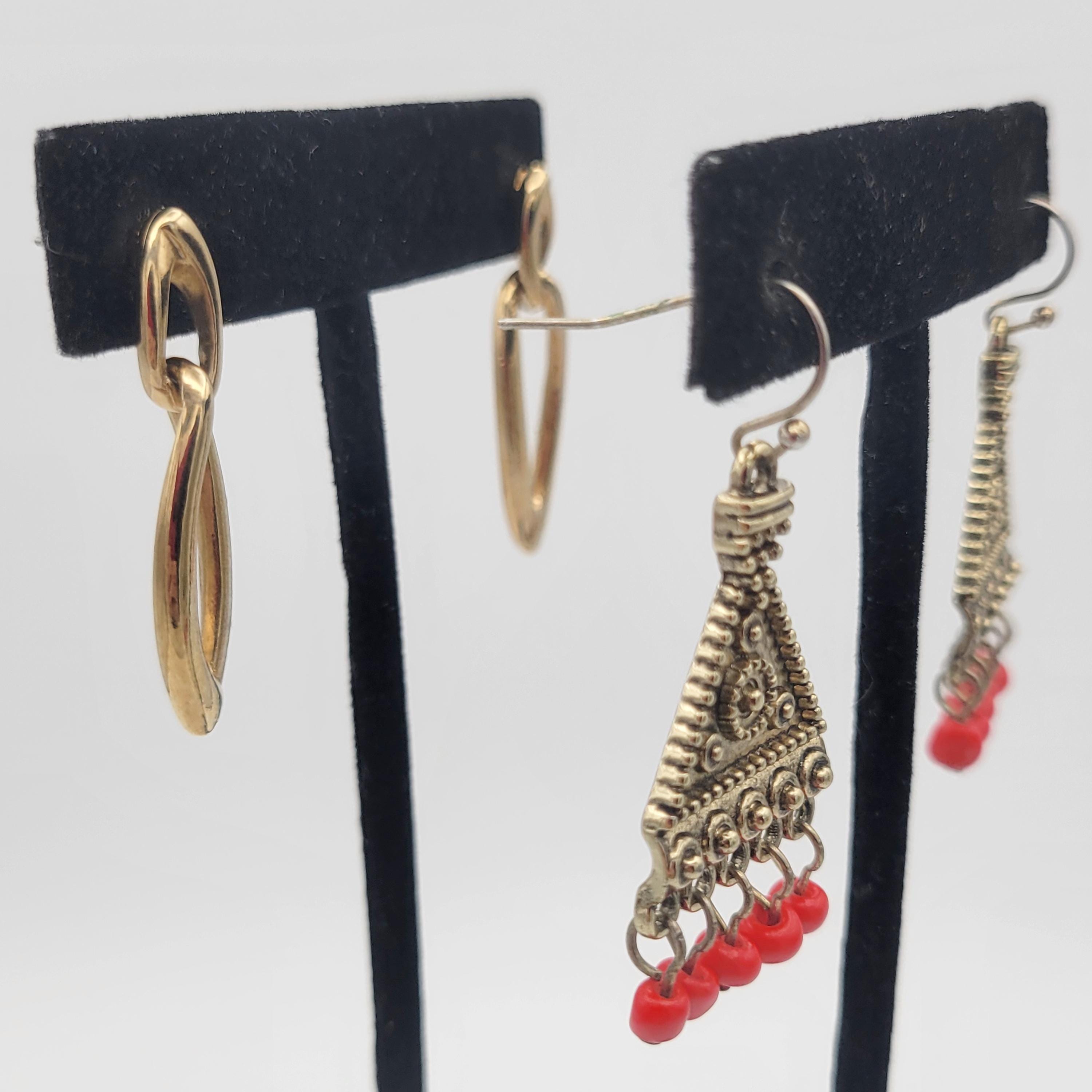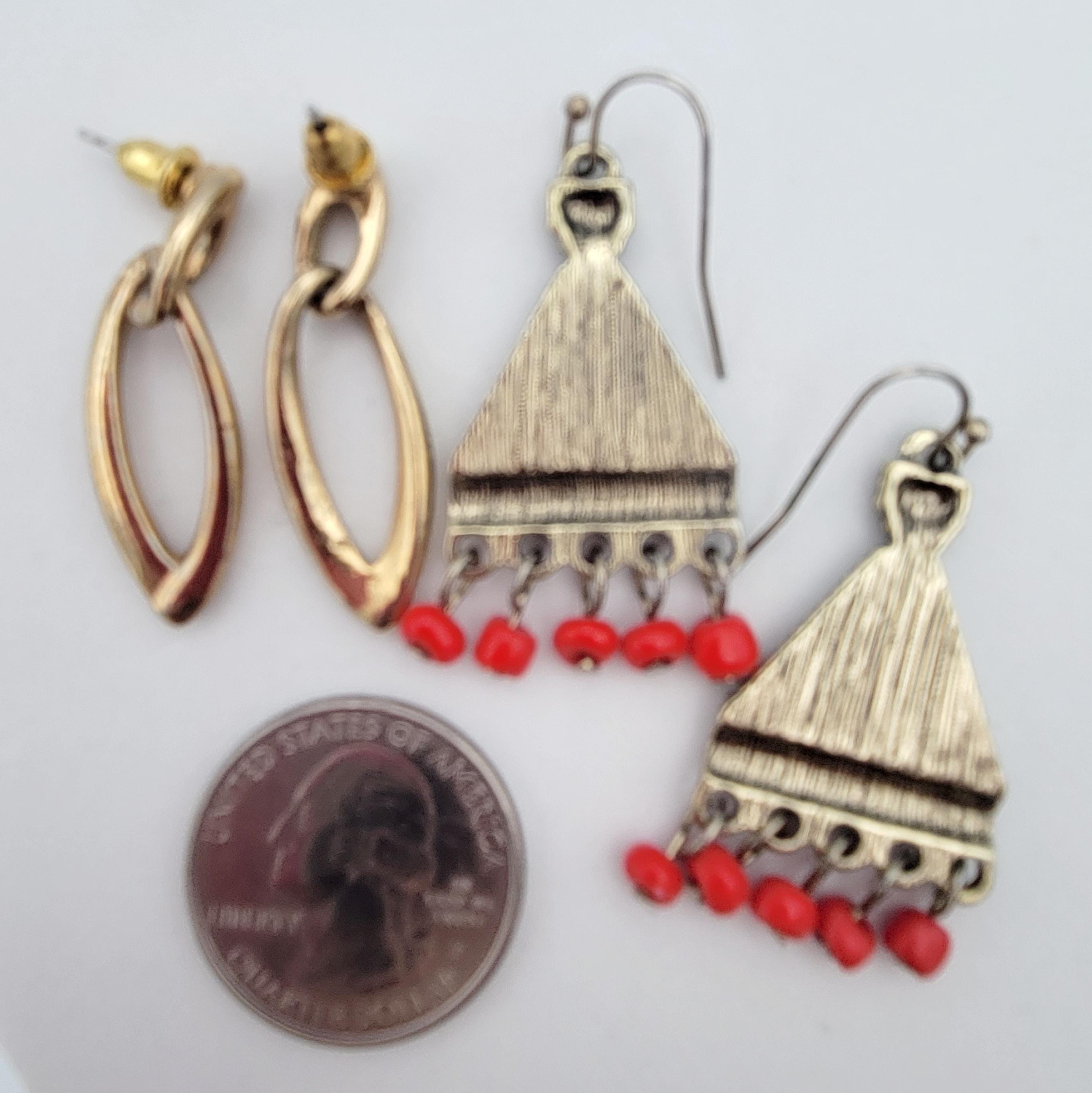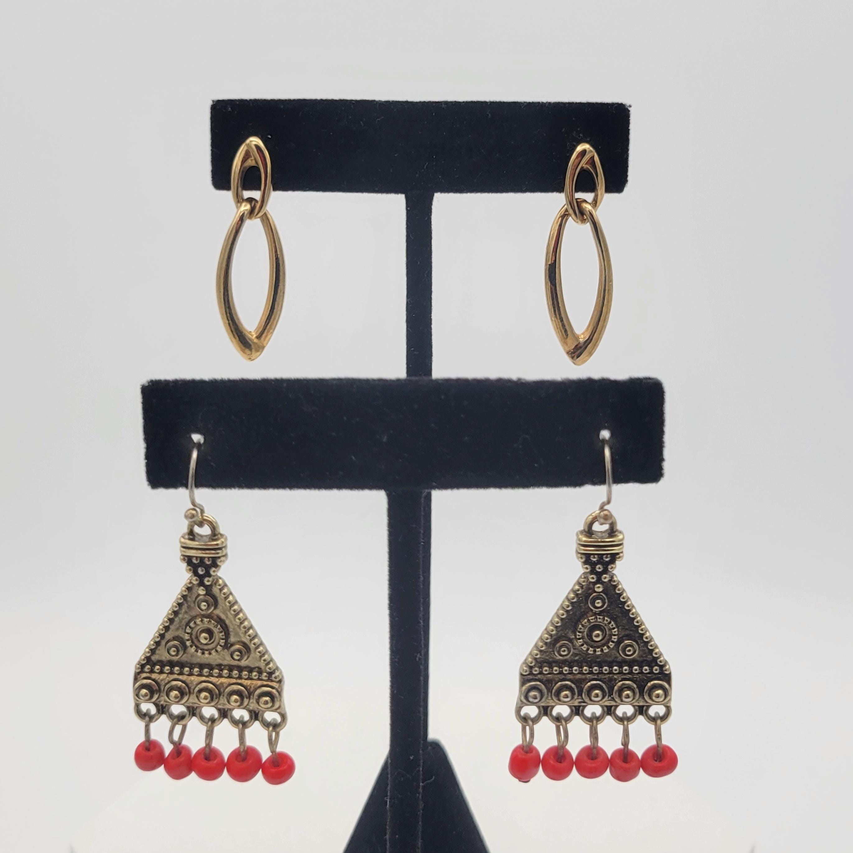 These earrings will make great accent pieces for your wardrobe. Both pairs of earrings are made from gold-tone metal. The Southwestern-style earrings have a triangular shape & red beaded dangles at the bottom. The shining openwork linked earrings have a mirrored finish & are very versatile. These earrings are in excellent vintage condition with very little wear.