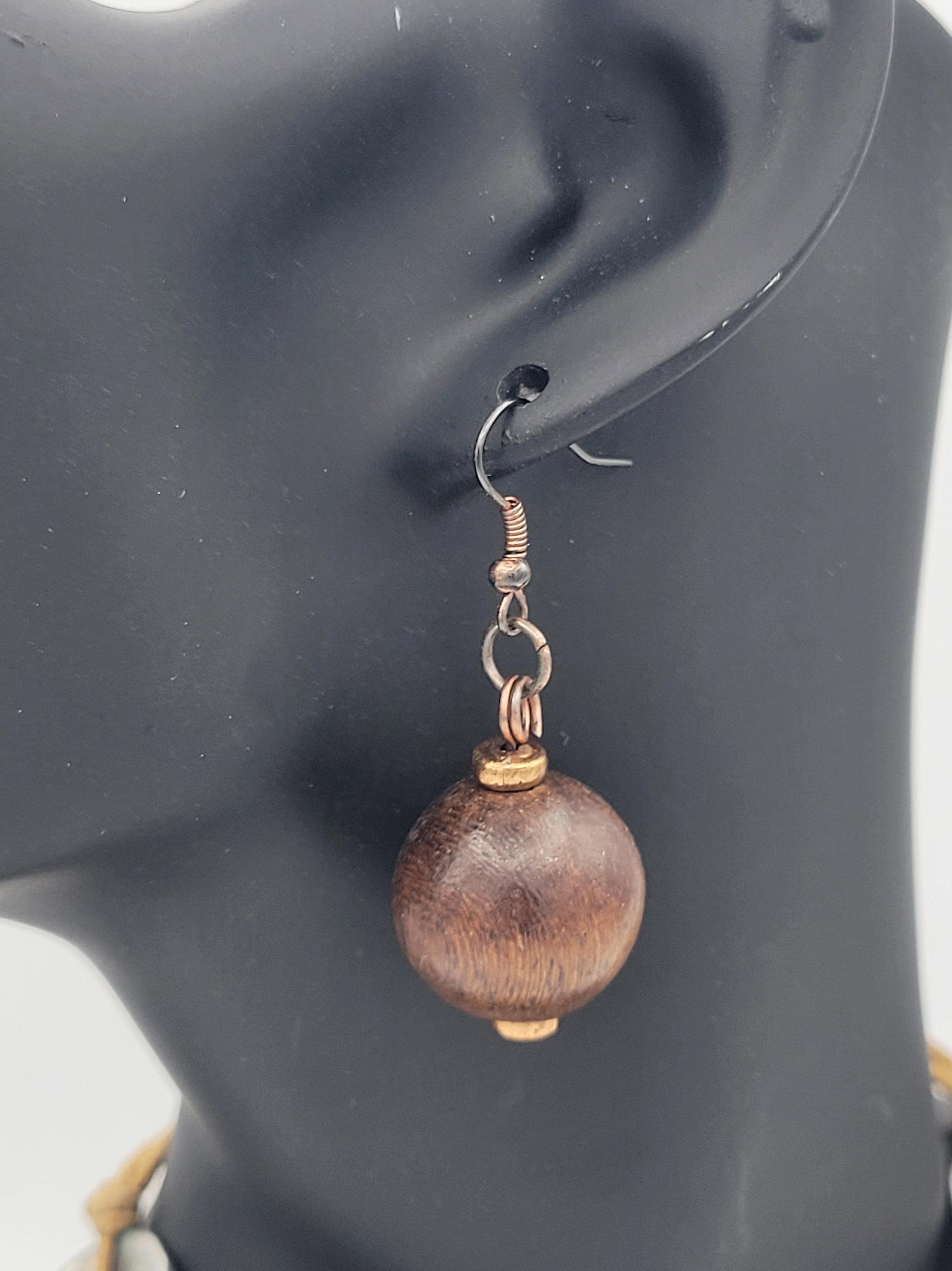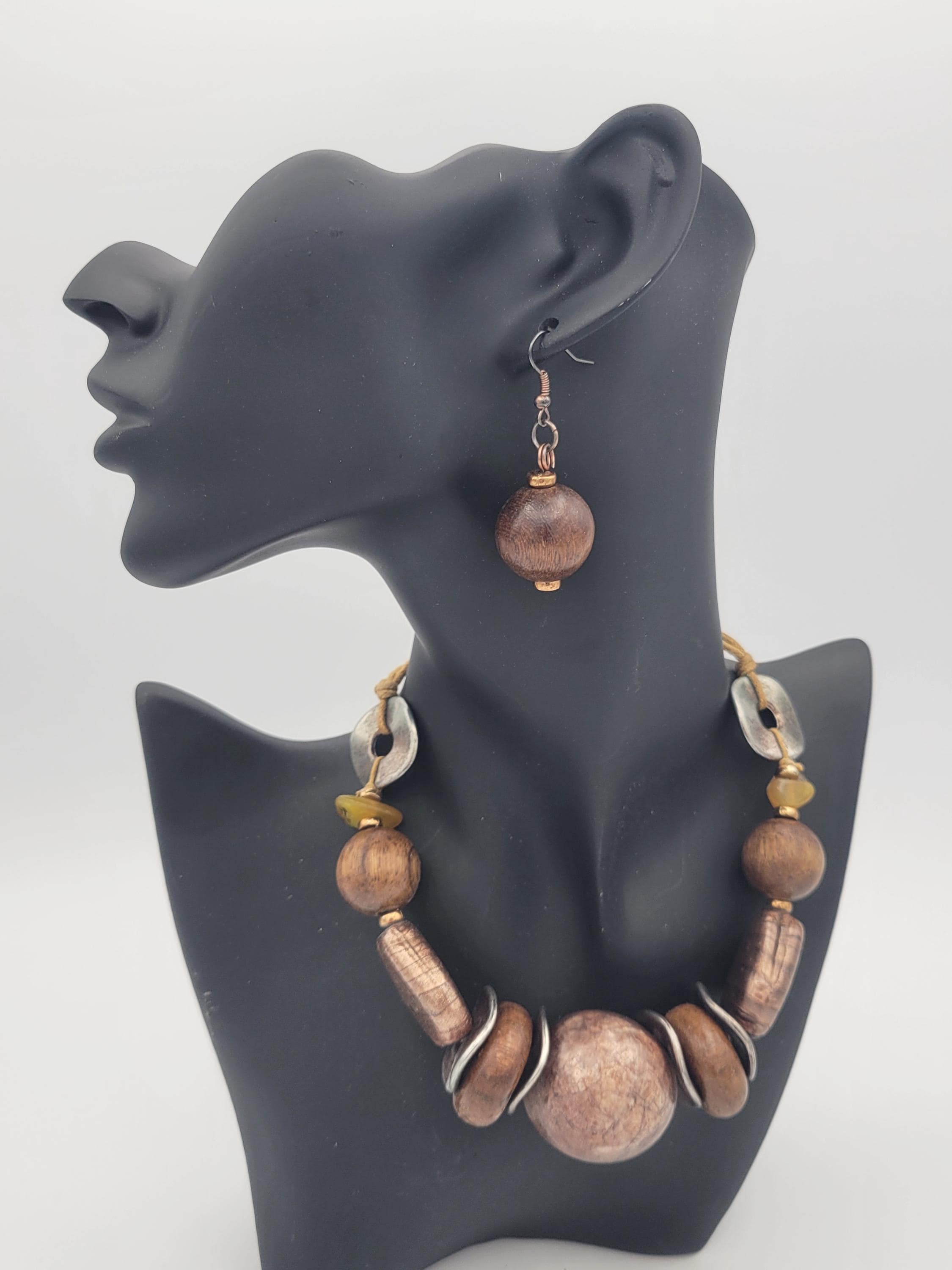 Vintage Wooden Beaded & Metal Disc Jewelry Set with Necklace and Dangle Earrings