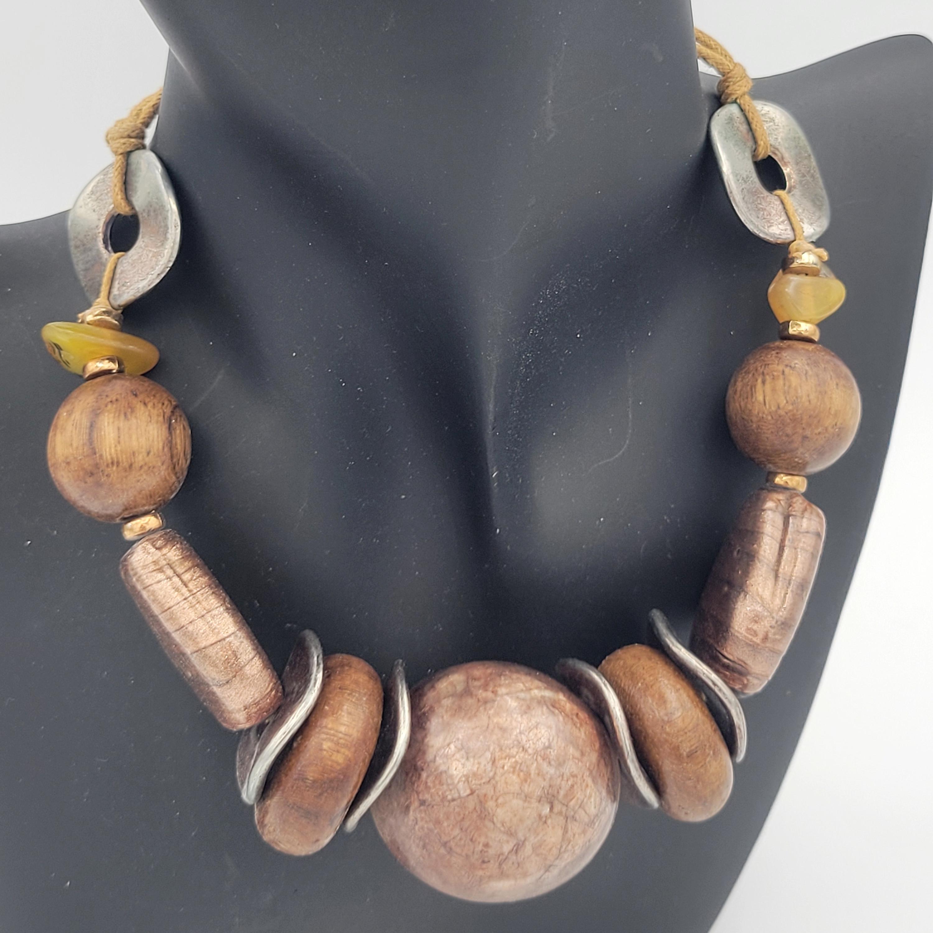 This bold jewelry set is sure to catch attention. The necklace features several wooden & plastic beads as well as metal discs that are strung on cord. The necklace secures with a lobster claw clasp & is adjustable for length. This set is in excellent vintage condition with very little wear.