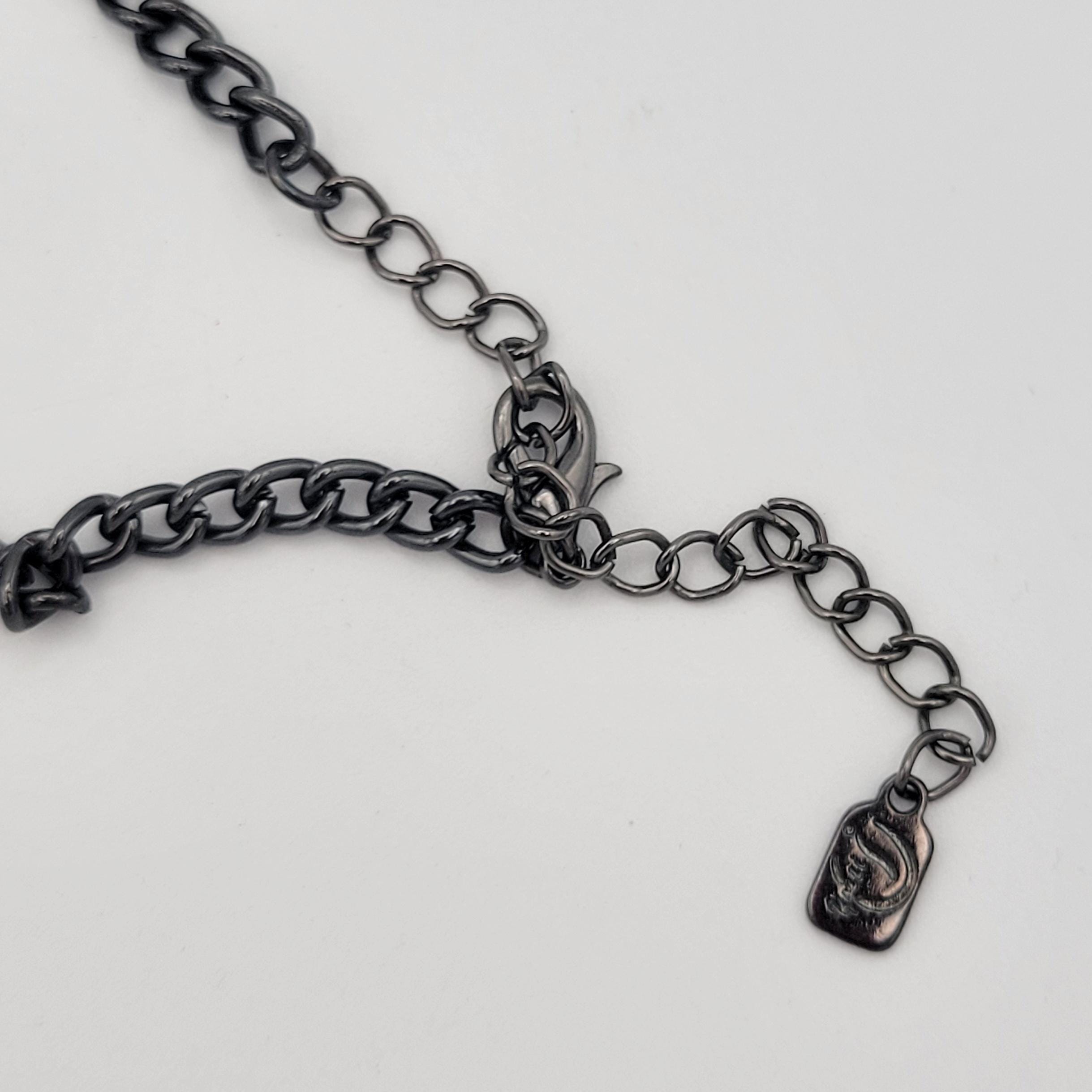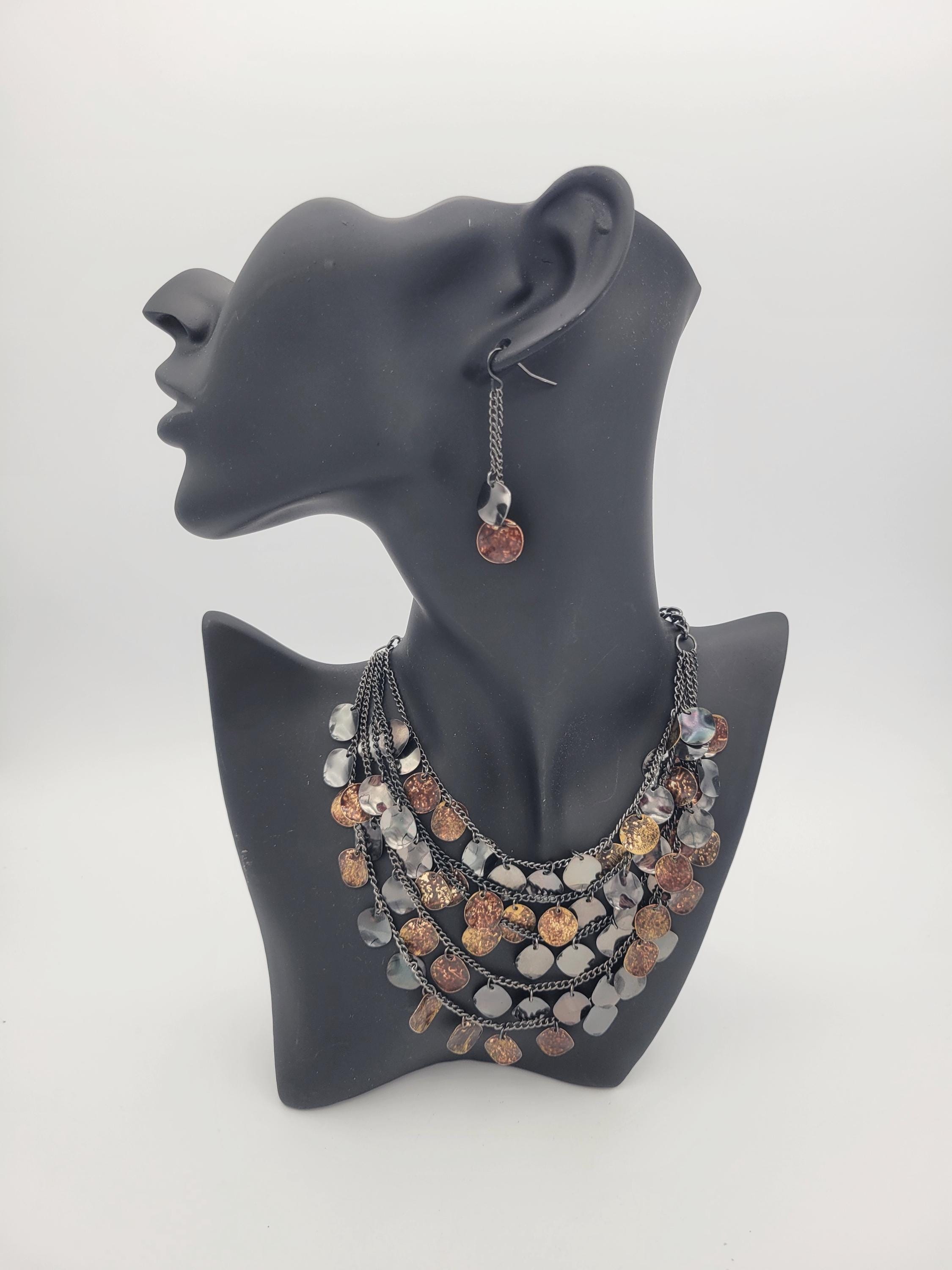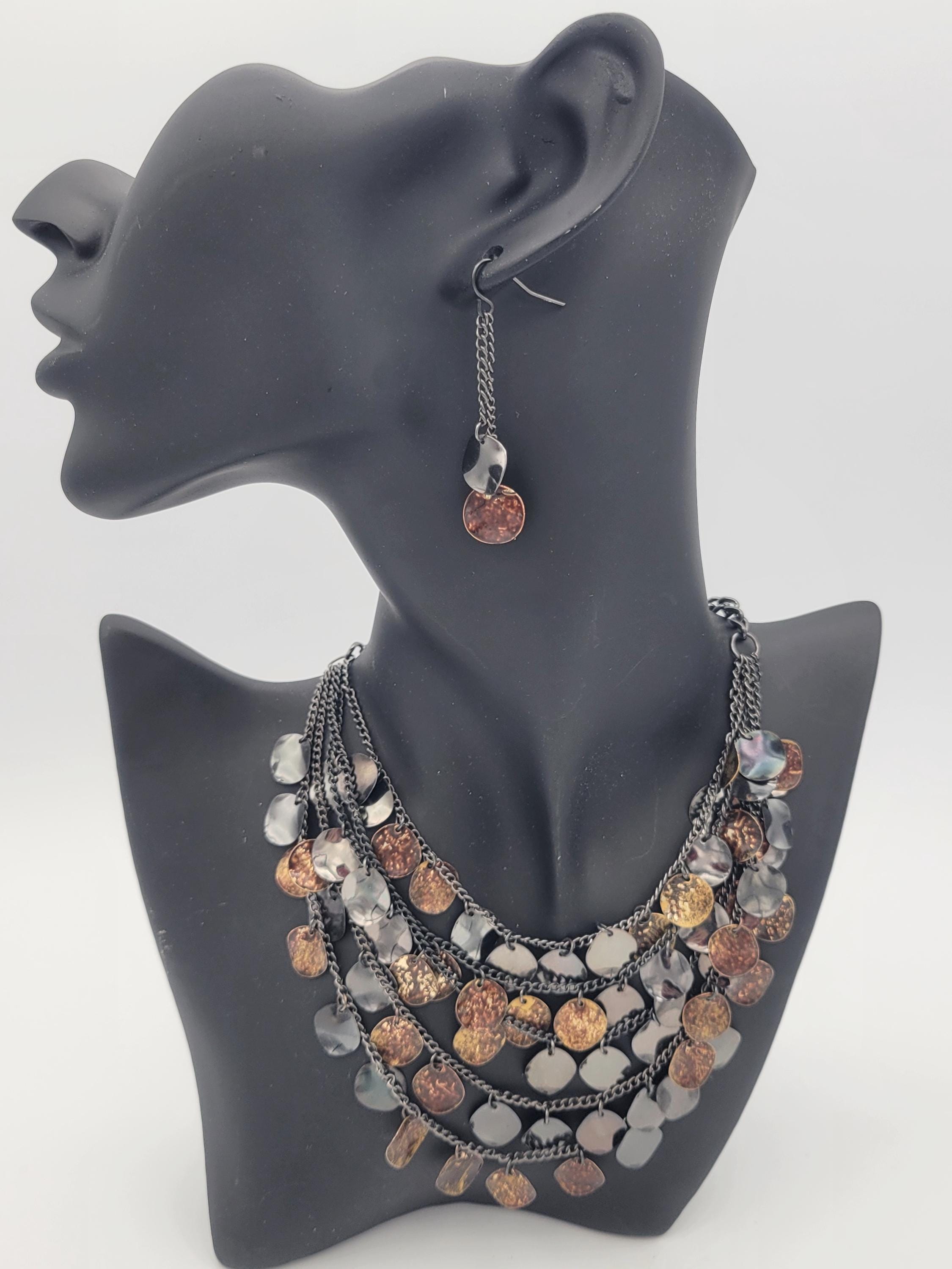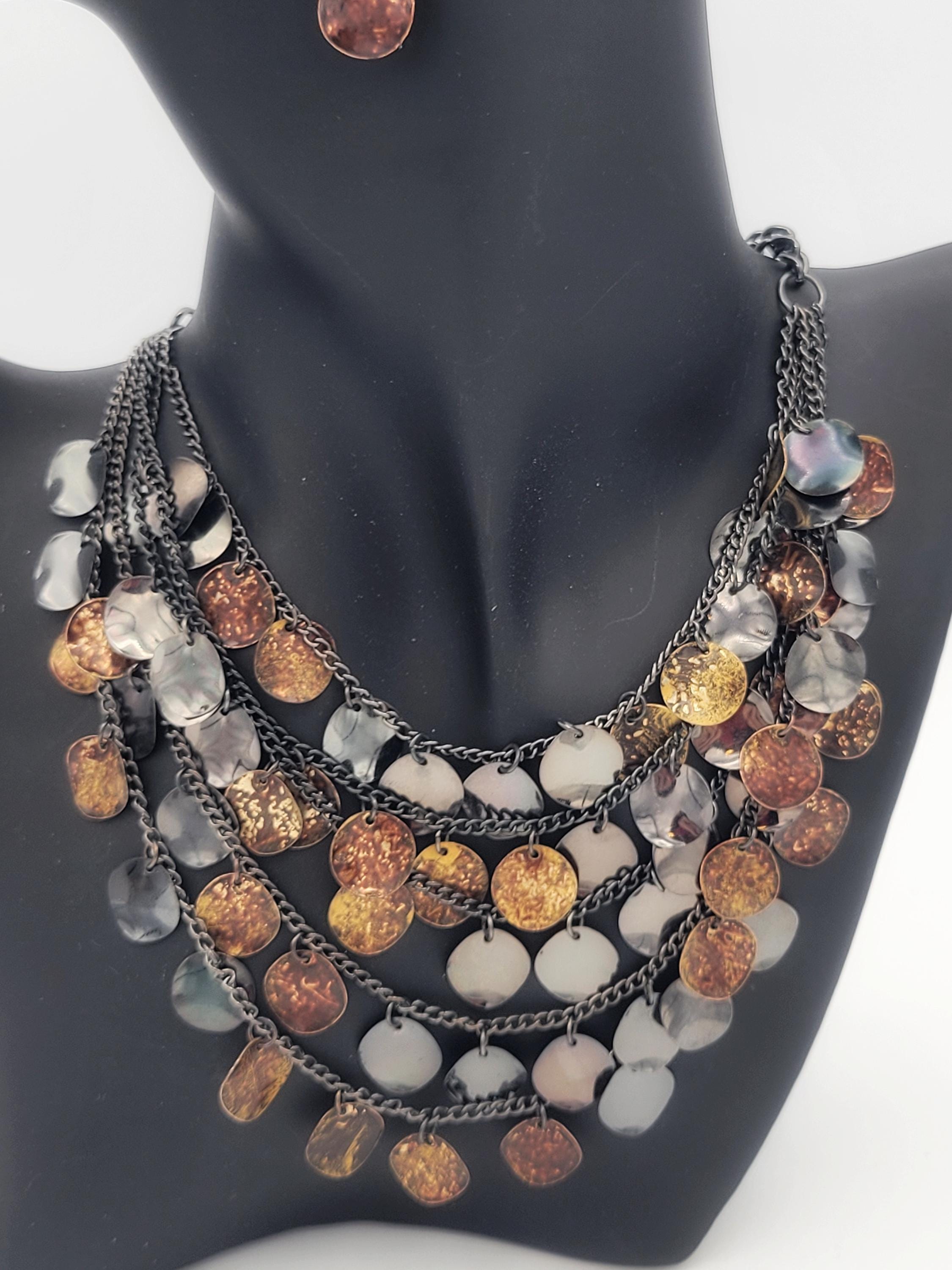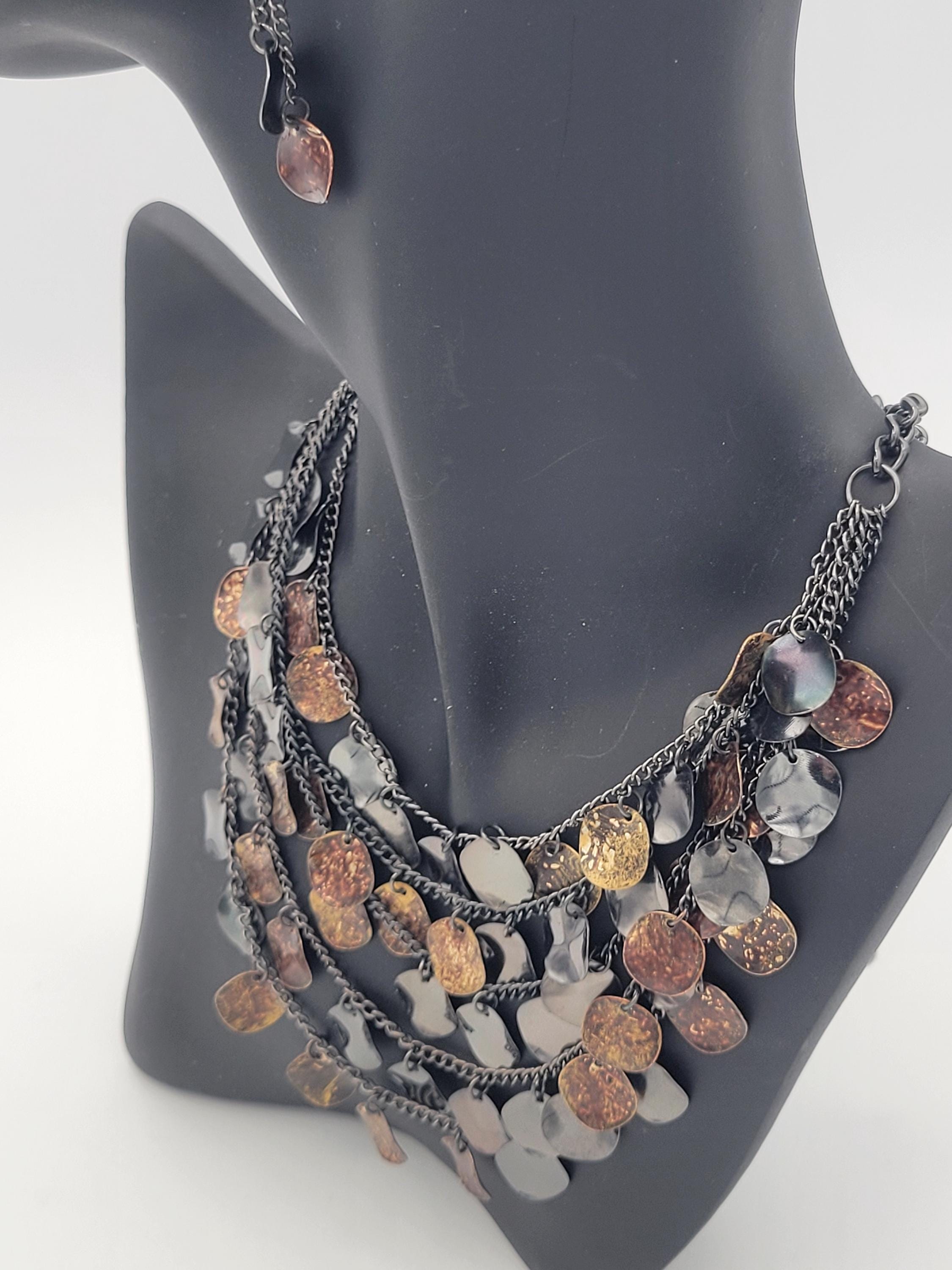 This jewelry set will add some drama to your ensemble. The necklace features a black gunmetal curb chain that secures with a lobster claw clasp & is adjustable for length. Five strands of chain form the bib of the necklace & are filled with black & brown disc-shaped charms. The dangle earrings feature smaller chains & 1 black & brown disc charm. This set is in excellent vintage condition with very little wear.