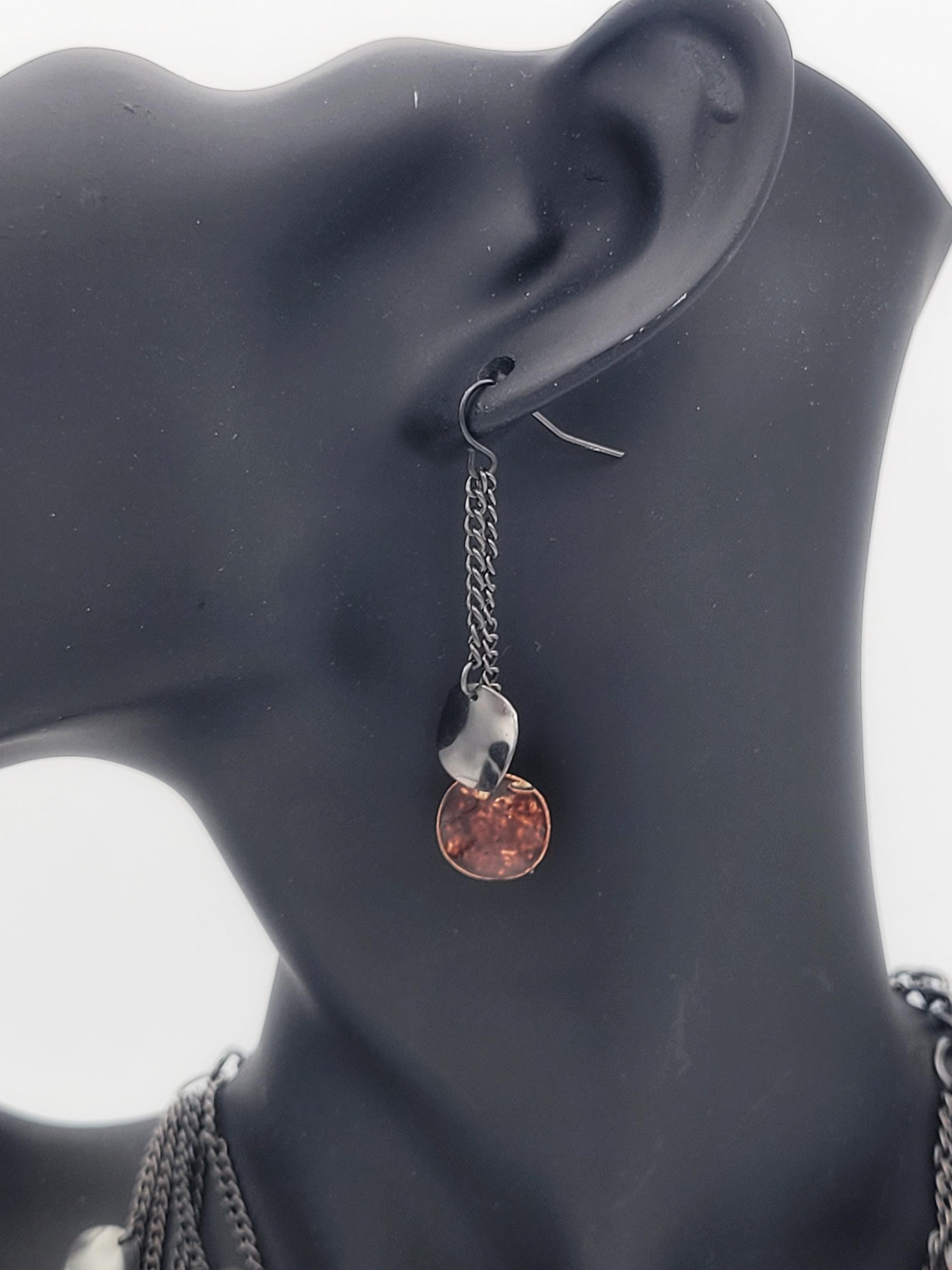 Vintage Yousi Black Gunmetal Disc Charm Jewelry Set with Necklace and Dangle Earrings