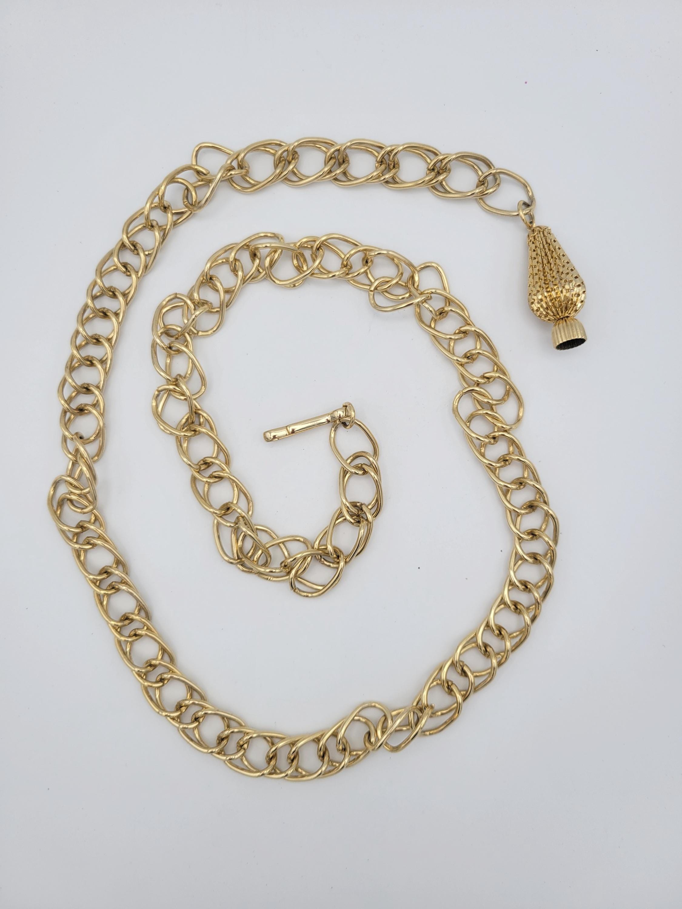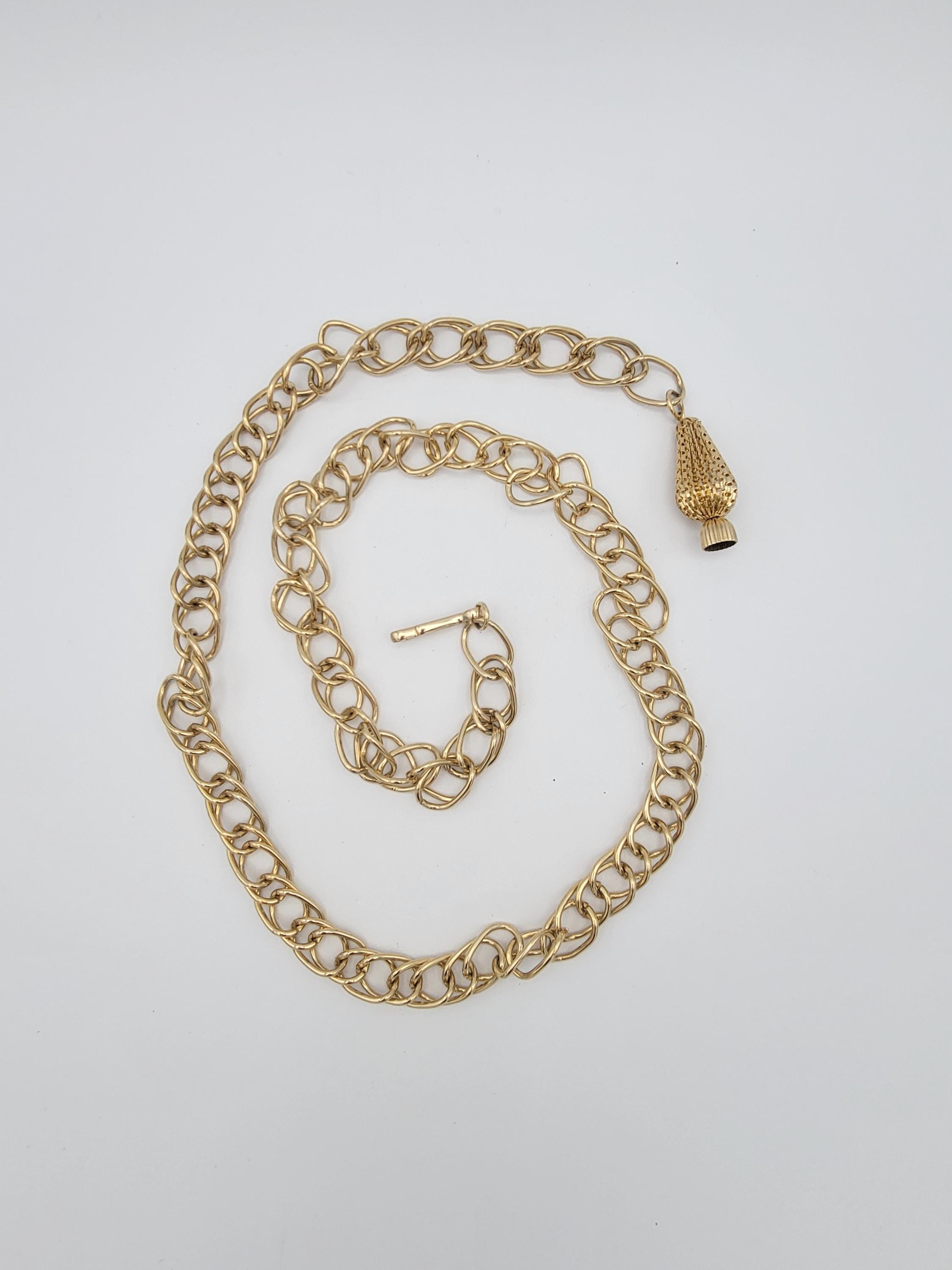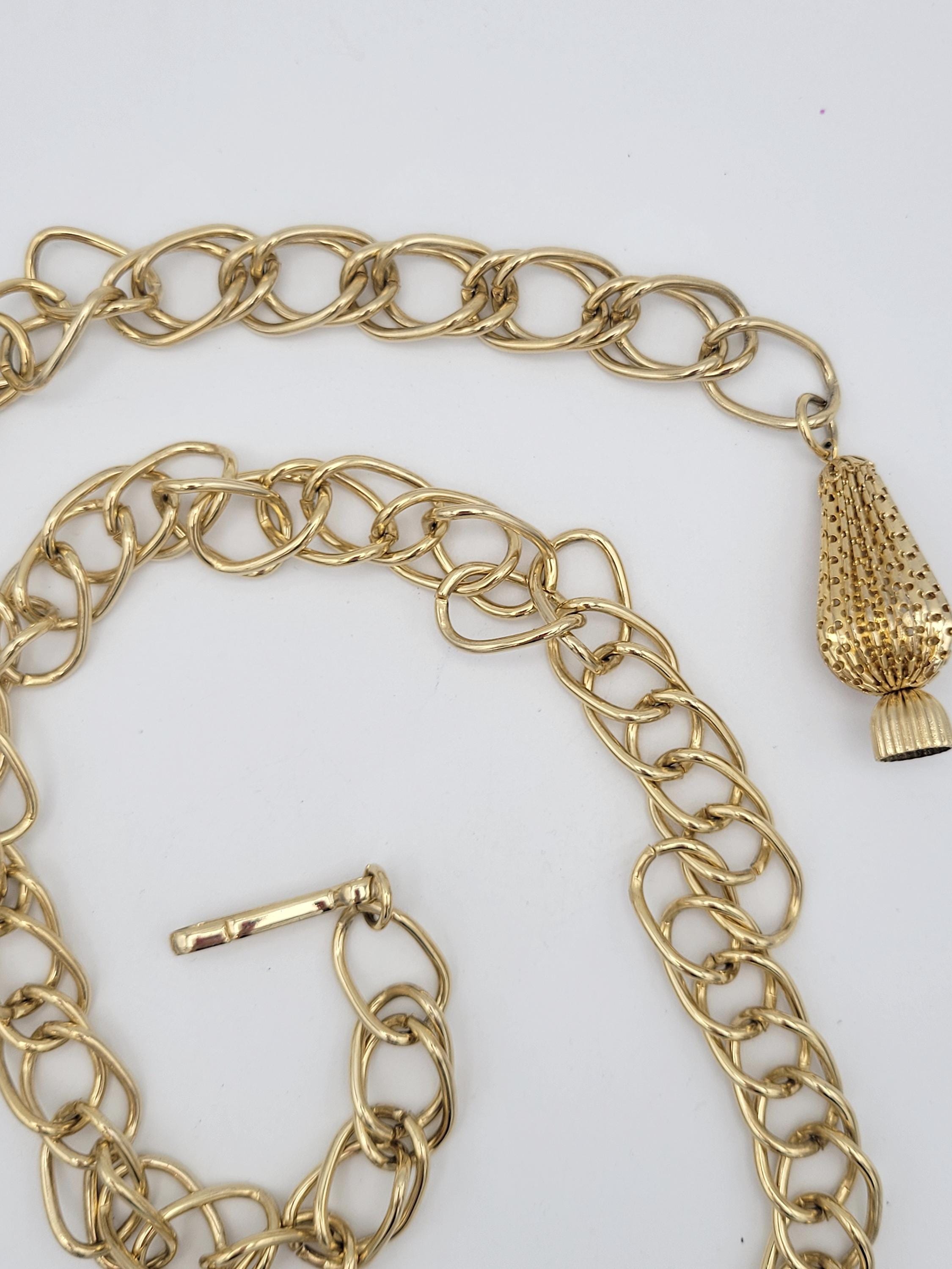 This vintage chain belt makes a great statement piece. The shining gold-tone belt is made of a large double curb chain that secures with a hook clasp. At the end of the belt is a large metallic tassel. This piece is in excellent vintage condition with a very little wear.